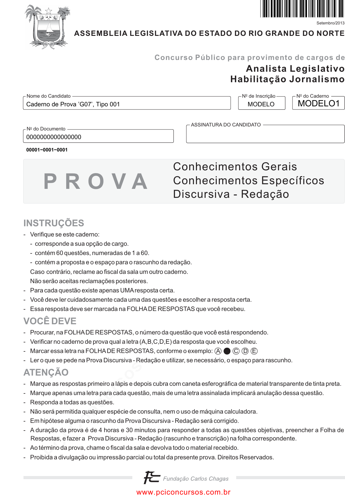 pcimarkpci MDAwMDowMDAwOjAwMDA6MDAwMDowMDAwOmZmZmY6MzZlOTpjMjU5:RnJpLCAxNyBTZXAgMjAyMSAxODoxNDozMSAtMDMwMA== N do CadernooN de Inscriçãoo ASSINATURA DO CANDIDATO N do Documentoo Nome do Candidato P R O V A A C D E ASSEMBLEIA LEGISLATIVA DO ESTADO DO RIO GRANDE DO NORTE Analista Legislativo Habilitação Jornalismo Concurso Público para provimento de cargos de Conhecimentos Gerais Conhecimentos Específicos Discursiva - Redação INSTRUÇÕES VOCÊ DEVE ATENÇÃO - Verifique se este caderno: - corresponde a sua opção de cargo. - contém 60 questões, numeradas de 1 a 60. - contém a proposta e o espaço para o rascunho da redação. Caso contrário, reclame ao fiscal da sala um outro caderno. Não serão aceitas reclamações posteriores. - Para cada questão existe apenas UMAresposta certa. - Você deve ler cuidadosamente cada uma das questões e escolher a resposta certa. - Essa resposta deve ser marcada na FOLHADE RESPOSTAS que você recebeu. - Procurar, na FOLHADE RESPOSTAS, o número da questão que você está respondendo. - Verificar no caderno de prova qual a letra (A,B,C,D,E) da resposta que você escolheu. - Marcar essa letra na FOLHADE RESPOSTAS, conforme o exemplo: - Ler o que se pede na Prova Discursiva - Redação e utilizar, se necessário, o espaço para rascunho. - Marque as respostas primeiro a lápis e depois cubra com caneta esferográfica de material transparente de tinta preta. - Marque apenas uma letra para cada questão, mais de uma letra assinalada implicará anulação dessa questão. - Responda a todas as questões. - Não será permitida qualquer espécie de consulta, nem o uso de máquina calculadora. - Em hipótese alguma o rascunho da Prova Discursiva - Redação será corrigido. - A duração da prova é de 4 horas e 30 minutos para responder a todas as questões objetivas, preencher a Folha de Respostas, e fazer a Prova Discursiva - Redação (rascunho e transcrição) na folha correspondente. - Ao término da prova, chame o fiscal da sala e devolva todo o material recebido. - Proibida a divulgação ou impressão parcial ou total da presente prova. Direitos Reservados. Setembro/2013 Caderno de Prova ’G07’, Tipo 001 MODELO 0000000000000000 MODELO1 00001−0001−0001 www.pciconcursos.com.br pcimarkpci MDAwMDowMDAwOjAwMDA6MDAwMDowMDAwOmZmZmY6MzZlOTpjMjU5:RnJpLCAxNyBTZXAgMjAyMSAxODoxNDozMSAtMDMwMA== 2 ALERN-Conhecimentos Gerais3 CONHECIMENTOS GERAIS Língua Portuguesa Atenção: O texto abaixo refere-se às questões de números 1 a 4. Código é poesia A expressão, usada como slogan pela plataforma Wordpress, é controversa. Comparar a nobre arte poética com a técnica da programação parece sacrilégio. Código é frio e calculado, precisa ser objetivo, não pode dar margem a interpretações. O que isso tem em comum com a artesania de palavras que compõe um verso? A relação entre as duas áreas tem origens medievais. Até o século 12 não se calculava com números na Europa. Para isso existiam os ábacos. Derivados do sistema romano, núme- ros eram apenas um tipo de letra usada para registrar quantias. Entre as muitas invenções estão a Álgebra e os Algorit- mos que, com equações algébricas, usam expressões para rea- lizar operações. Também sintéticas, essas frases em línguas estranhas (SQL, JavaScript, HTML) têm sintaxe, ortografia e métricas precisas. A semelhança entre código e poesia vai além de sintaxe e frases curtas. Ambas têm propósito, sentido e estrutura. Por motivos diferentes, precisam ser elegantes e concisas. Bom código, como boa poesia, não "acontece" natural- mente, nem pode ser gerado a partir de dicionários de rimas. Demanda disciplina, talento e trabalho duro. Algoritmos bem desenvolvidos, como poesias bem escritas, seguem fluxos naturais de ideias. Tudo neles parece estar no lugar correto, nada pode ser removido, cada linha emenda naturalmente na próxima. O fluxo de operações não é determinado pela estrutura gramatical, mas pela forma com que cada ideia se conecta à seguinte, complementando a anterior. Linhas de código, como versos, fazem referências cruzadas, em que cada parte ampli- fica e sintetiza o que a antecedeu. Muitos preguiçosos autointitulados poetas apenas por serem capazes de rimar as palavras no fim de duas linhas se espantam porque ninguém suporta lê-los ou ouvi-los. Dode- cassílabos, alexandrinos, heroicos ou redondilhas, poemas pre- cisam de estrutura. Como eles, os novos programas compu- tacionais e sonetos algorítmicos demandam estruturas e méto- dos para serem devidamente apreciados. Programar websites e aplicativos é complexo, mas não é impossível, nem restrito a mentes brilhantes e especiais. Da mesma forma que todos podem escrever, todos podem progra- mar. Com engenho e arte, novos talentos podem fazer o que Chico, Caetano e Gil fizeram com os versos da nossa música. Mas só se poderá cultivá-los quando o preconceito que se tem com relação aos desenvolvedores for substituído pela admiração que temos por quem garimpa a beleza oculta na última flor do Lácio. (Adaptado do texto de Luli Radfahrer, Folha de S. Paulo, Folha Tec, 29/07/2013) 1. De acordo com o texto: (A) não se deve comparar poesia e programação, por- que é uma presunção, embora ambas tenham muito em comum: dependem de conhecimentos e esforços para atingir um bom resultado. (B) é necessário que código e poesia, embora necessi- tando de conhecimentos e esforços por parte do programador e do poeta, se construam com a sim- plicidade das coisas naturais. (C) há uma estrutura gramatical, uma sintaxe que ultra- passa o uso de rimas e de receitas, que amplifica e sintetiza códigos e formas que devem ser seguidas para se atingir os objetivos. (D) devem-se considerar as peculiaridades de cada uma das atividades, mas ambas têm em comum a difi- culdade de um bom desenvolvimento de suas estru- turas, de sua sintaxe. (E) é necessário que os poemas que são construídos por mentes bril