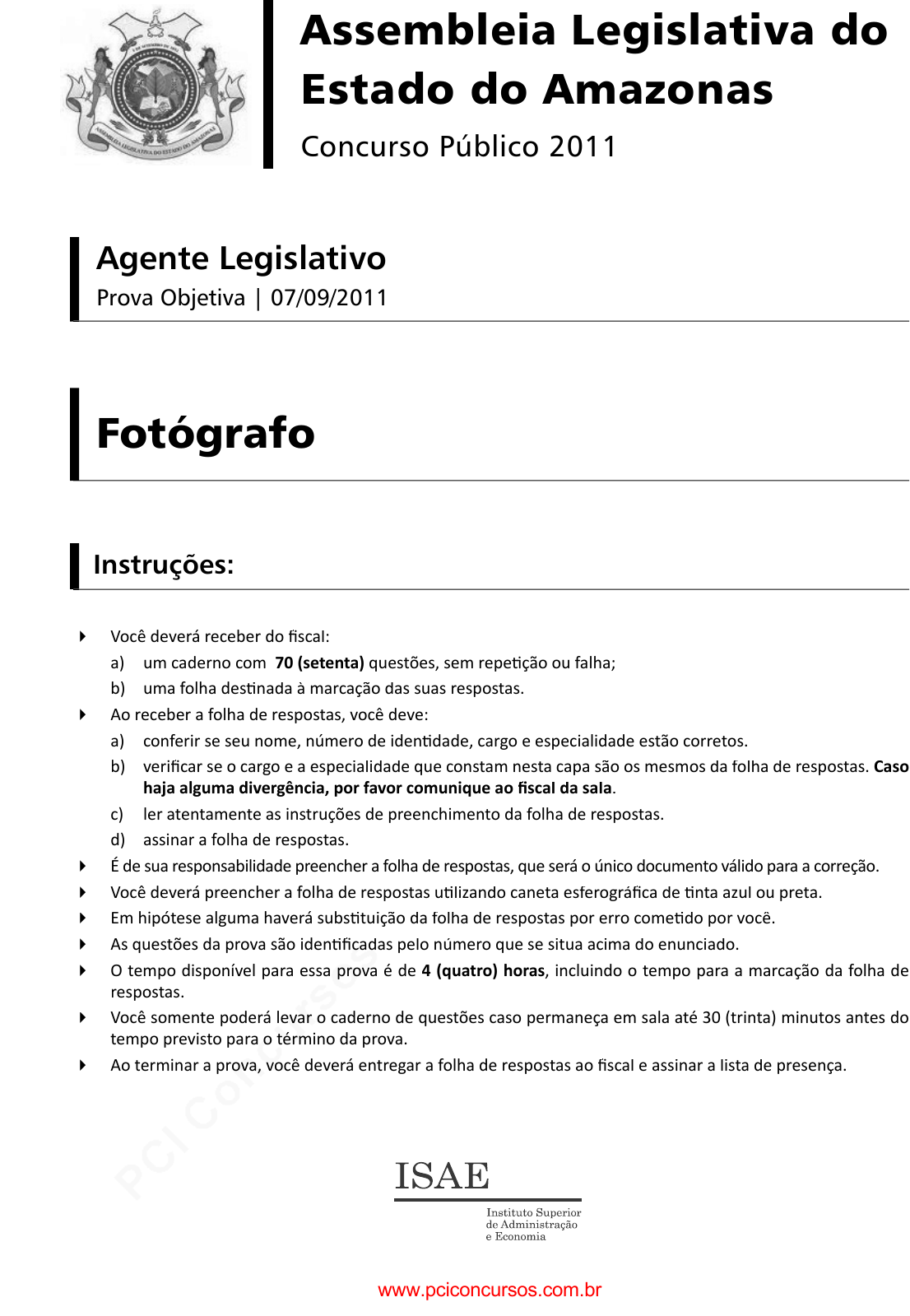 pcimarkpci MDAwMDowMDAwOjAwMDA6MDAwMDowMDAwOmZmZmY6MzZlOTpjMjU5:VGh1LCAxNiBTZXAgMjAyMSAwOTo0NzozNiAtMDMwMA== Fotógrafo Agente Legislativo Prova Objetiva | 07/09/2011 Instruções: Você deverá receber do scal: a) um caderno com 70 (setenta) questões, sem repe ção ou falha; b) uma folha des nada à marcação das suas respostas. Ao receber a folha de respostas, você deve: a) conferir se seu nome, número de iden dade, cargo e especialidade estão corretos. b) veri car se o cargo e a especialidade que constam nesta capa são os mesmos da folha de respostas. Caso haja alguma divergência, por favor comunique ao scal da sala. c) ler atentamente as instruções de preenchimento da folha de respostas. d) assinar a folha de respostas. É de sua responsabilidade preencher a folha de respostas, que será o único documento válido para a correção. Você deverá preencher a folha de respostas u lizando caneta esferográ ca de nta azul ou preta. Em hipótese alguma haverá subs tuição da folha de respostas por erro come do por você. As questões da prova são iden cadas pelo número que se situa acima do enunciado. O tempo disponível para essa prova é de 4 (quatro) horas, incluindo o tempo para a marcação da folha de respostas. Você somente poderá levar o caderno de questões caso permaneça em sala até 30 (trinta) minutos antes do tempo previsto para o término da prova. Ao terminar a prova, você deverá entregar a folha de respostas ao scal e assinar a lista de presença. Assembleia Legislativa do Estado do Amazonas Concurso Público 2011 www.pciconcursos.com.br pcimarkpci MDAwMDowMDAwOjAwMDA6MDAwMDowMDAwOmZmZmY6MzZlOTpjMjU5:VGh1LCAxNiBTZXAgMjAyMSAwOTo0NzozNiAtMDMwMA== www.pciconcursos.com.br pcimarkpci MDAwMDowMDAwOjAwMDA6MDAwMDowMDAwOmZmZmY6MzZlOTpjMjU5:VGh1LCAxNiBTZXAgMjAyMSAwOTo0NzozNiAtMDMwMA== Agente Legislativo – Fotógrafo Prova Objetiva | 3 Língua Portuguesa Texto I Banhos Para os romanos do primeiro século, estar limpo significava ter ficado de molho em água a diferentes temperaturas, por duas horas, em casas de banhos públicas, e ter tido o corpo esfregado com um ancinho em miniatura, e ao final com óleo. Para os franceses aristocratas do século XVII, era trocar a camisa uma vez por dia, usar perfume para obliterar tanto o próprio odor quanto o de qualquer outra pessoa, porém nunca imergindo – que horror! – em água. Por volta de 1900, uma ideia extraordinária surgiu nos Estados Unidos: a de que banhos frequentes, talvez até mesmo diários, eram saudáveis. Desde o Império Romano as pessoas não se mantinham tão limpas e, com a chegada do milênio, esses padrões radicalizaram-se. Hoje, vivemos num mundo desodorizado, onde germófobos cumprimentam-se com os cotovelos e as vendas de sabonetes, lenços umedecidos e perfumes crescem continuadamente. (Katherine Ashenburg. Passando a limpo) 1 A referência a romanos, franceses e americanos serve para: (A) demonstrar que a higiene nem sempre foi uma preocupação dos homens. (B) indicar modelos diferentes de preocupação com a higiene. (C) mostrar a inferioridade dos franceses em termos de higiene. (D) destacar a importância de sabonetes, desodorantes e perfumes. (E) comprovar que a higiene é importante para a saúde humana. 2 “...porém nunca imergindo – que horror! – em água”. A expressão destacada no fragmento acima: (A) mostra o espanto da autora diante da falta de higiene dos franceses. (B) refere-se à visão dos franceses diante do ato de tomar banho. (C) indica uma visão moderna sobre hábitos antigos de higiene. (D) representa a visão romana sobre futuros hábitos de higiene. (E) demonstra que a água sempre foi considerada essencial para a higiene. 3 “Para os romanos do primeiro século,...”, “Para os franceses aristocratas do século XVII,...”. Esses dois segmentos do texto indicam: (A) finalidade. (B) direção. (C) modo. (D) opinião. (E) condição. 4 A autora do texto diz que os padrões de higiene radicalizaram-se, o que é comprovado pelo fato de: (A) os romanos tomarem banhos de duas horas. (B) os franceses usarem excessivamente os perfumes. (C) os americanos terem criado o desodorante. (D) os germófobos cumprimentarem-se com os cotovelos. (E) os aristocratas trocarem de camisa continuamente. 5 “Por volta de 1900, uma ideia extraordinária surgiu nos Estados Unidos: a de que banhos frequentes, talvez até mesmo diários, eram saudáveis”. Assinale a alternativa que apresente o comentário inadequado sobre os componentes desse segmento do texto. (A) Por volta de é uma expressão que localiza no tempo de forma imprecisa. (B) uma ideia extraordinária mostra uma ideia que até então não havia sido considerada. (C) frequentes, diários e saudáveis são adjetivos que se referem ao mesmo substantivo. (D) extraordinária é uma qualificação que vai ser explicitada na progressão do texto. (E) talvez mostra simultaneamente uma ironia e uma falta de informação do autor. 6 “as vendas de sabonetes, lenços umedecidos e perfumes crescem continuadamente”. Assinale a alternativa que mostra uma maneira inadequada de reescrever-se a frase acima, alterando seu sentido original. (A) Lenços umedecidos, perfumes e as vendas de sabonetes crescem continuadamente. (B) Crescem continuadamente as vendas de sabonetes, lenços umedecidos e perfumes. (C) As vendas de perfumes, lenços umedecidos e sabonetes crescem continuadamente. (D) Crescem continuadamente as vendas de sabonetes, assim como as de lenços umedecidos e perfumes. (E) As vendas de perfumes, sabonetes e lenços umedecidos crescem de forma continuada. 7 Assinale a alternativa em que o termo sublinhado não exerce uma função adjetiva. (A) romanos do primeiro século. (B) ancinho em miniatura. (C) vendas de sabonetes. (D) aristocratas do século XVII. (E) lenços umedecidos. 8 “Desde o Império Romano as pessoas não se mantinham tão limpas...”. A partir do segmento do texto acima, podemos fazer uma série