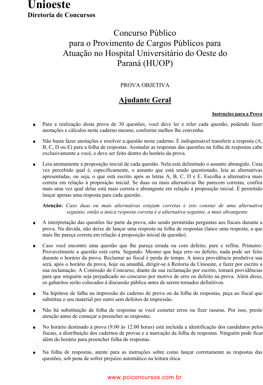 pcimarkpci MDAwMDowMDAwOjAwMDA6MDAwMDowMDAwOmZmZmY6MzZlOTpjMjU5:RnJpLCAxNyBTZXAgMjAyMSAwNzozNToyNyAtMDMwMA== Unioeste Diretoria de Concursos Concurso Público para o Provimento de Cargos Públicos para Atuação no Hospital Universitário do Oeste do Paraná (HUOP) PROVA OBJETIVA Ajudante Geral Instruções para a Prova ♦ Para a realização desta prova de 30 questões, você deve ler e reler cada questão, podendo fazer anotações e cálculos neste caderno mesmo, conforme melhor lhe convenha. ♦ Não basta fazer anotações e resolver a questão neste caderno. É indispensável transferir a resposta (A, B, C, D ou E) para a folha de respostas. Assinalar as respostas das questões na folha de respostas cabe exclusivamente a você, e deve ser feito dentro do horário da prova. ♦ Leia atentamente a proposição inicial de cada questão. Nela está delimitado o assunto abrangido. Uma vez percebido qual é, especificamente, o assunto que está sendo questionado, leia as alternativas apresentadas, ou seja, o que está escrito após as letras A, B, C, D e E. Escolha a alternativa mais correta em relação à proposição inicial. Se duas ou mais alternativas lhe parecem corretas, confira mais uma vez qual delas está mais correta e abrangente em relação à proposição inicial. É permitido lançar apenas uma resposta para cada questão. Atenção: Caso duas ou mais alternativas estejam corretas e isto constar de uma alternativa seguinte, então a única resposta correta é a alternativa seguinte, a mais abrangente. ♦ A interpretação das questões faz parte da prova, não sendo permitidas perguntas aos fiscais durante a prova. Na dúvida, não deixe de lançar uma resposta na folha de respostas (lance uma resposta, a que mais lhe pareça correta em relação à proposição inicial da questão). ♦ Caso você encontre uma questão que lhe pareça errada ou com defeito, pare e reflita. Primeiro: Provavelmente a questão está certa. Segundo: Mesmo que haja erro ou defeito, nada pode ser feito durante o horário da prova. Reclamar ao fiscal é perda de tempo. A única providência produtiva sua será, após o horário da prova, hoje ou amanhã, dirigir-se à Reitoria da Unioeste, e fazer por escrito a sua reclamação. A Comissão de Concurso, diante da sua reclamação por escrito, tomará providências para que ninguém seja prejudicado no concurso por motivo de erro ou defeito na prova. Além disso, os gabaritos serão colocados à discussão pública antes de serem tornados definitivos. ♦ Na hipótese de falha na impressão do caderno de prova ou da folha de respostas, peça ao fiscal que substitua o seu material por outro sem defeitos de impressão. ♦ Não há substituição de folha de respostas se você cometer erros ou fizer rasuras. Por isso, preste atenção antes de começar a preencher as respostas. ♦ No horário destinado à prova (9.00 às 12.00 horas) está incluída a identificação dos candidatos pelos fiscais, a distribuição dos cadernos de provas e a marcação da folha de respostas. Ninguém pode ficar além do horário para preencher folha de respostas. ♦ Na folha de respostas, atente para as instruções sobre como lançar corretamente as respostas das questões, sob pena de sofrer prejuízo automático na leitura ótica. www.pciconcursos.com.br pcimarkpci MDAwMDowMDAwOjAwMDA6MDAwMDowMDAwOmZmZmY6MzZlOTpjMjU5:RnJpLCAxNyBTZXAgMjAyMSAwNzozNToyNyAtMDMwMA== Prova de Língua Portuguesa LEIA ATENTAMENTE ESTE TEXTO E, EM SEGUIDA, RESPONDA ÀS QUESTÕES DE 01 A 10. BRILHO NA COZINHA Como a cozinha é o lugar onde todo mundo carrega comida para lá e para cá, ela se torna um dos alvos preferidos de bichos asquerosos como rato e barata. Só que para eles não têm a menor graça uma cozinha limpa, com chão brilhando, panelas e louças lavadas, lixo no lugar. Limpeza é a melhor estratégia para evitar ratos e baratas. Além de dar um "chega pra lá" nos bichos que a gente vê, é preciso também evitar que entrem em ação outros que a gente não vê, como os micróbios. Eles podem estar nos alimentos e fazer o maior estrago à nossa saúde. Que fazer? Mandar a comida tomar banho, ora! Lavar cuidadosamente as frutas na torneira antes de comê-las. E dedicar especial atenção às verduras e aos legumes, já que os bichinhos adoram montar seu acampamento neles, botar ovinhos, etc. Se os vegetais não forem bem lavados, ficamos expostos a várias doenças. Pode ser desde uma pequena e desagradável diarréia, passando pela verminose conhecida como ascaridíase (infestação por lombrigas, vermes compridos que moram no intestino da pessoa doente), até o cólera, do qual você já deve ter ouvido falar. Esta doença pode até levar a pessoa à morte. A melhor maneira de prevenir as verminoses é lavar sempre bem as mãos, beber água filtrada ou fervida e lavar muito bem os alimentos. Texto extraído de www. Canalkids.com.br/higiene/cozinha em 15/11/2005 2 www.pciconcursos.com.br pcimarkpci MDAwMDowMDAwOjAwMDA6MDAwMDowMDAwOmZmZmY6MzZlOTpjMjU5:RnJpLCAxNyBTZXAgMjAyMSAwNzozNToyNyAtMDMwMA== 01. De acordo com o texto, o que atrai ratos e baratas para a COZINHA é: (A) cozinha limpa, chão brilhando. (B) louças bem lavadas. (C) lixo no lugar. (D) restos de comida espalhados pelo chão, mesa e pia. (E) panelas lavadas. 02. Para evitar que os MICRÓBIOS entrem nos alimentos e prejudiquem nossa saúde, de acordo com o texto, é preciso: (A) lavar bem o chão. (B) lavar bem as frutas, verduras e legumes. (C) escovar bem os dentes. (D) deixar limpas as panelas e louças. (E) colocar o lixo no seu devido lugar. 03. O texto fala ainda das DOENÇAS adquiridas por meio dos alimentos. Segundo o texto, podemos adquirir algumas doenças quando: (A) não lavamos bem as louças. (B) não deixamos o lixeiro tampado. (C) não guardamos os alimentos no armário. (D) não lavamos bem o chão da cozinha. (E) não lavamos bem as frutas, verduras e legumes. 04. As DOENÇAS provocadas por