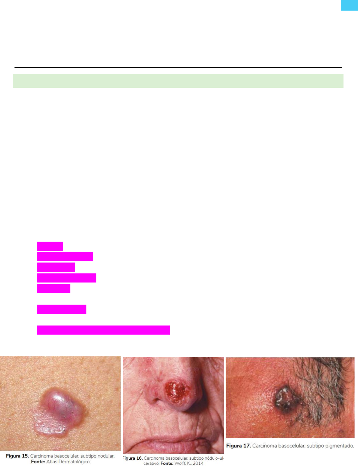 1 ISADORA RODRIGUES – 6° PERÍODO – UNIT/AL AMBULATÓRIO DE DERMATO CARCINOMA BASOCELULAR INTRODUÇÃO As células basais estão na camada mais inferior da epiderme (a camada externa da pele). Ainda que o carcinoma basocelular possa não surgir a partir de células basais, a doença tem este nome porque as células cancerígenas se parecem às basais ao microscópio. Além disso, é o câncer de pele mais comum, sendo também o câncer mais comum do mundo. Mas, felizmente, é menos agressivo que os outros cânceres de pele, já que o risco de metástase é de menos de 1%, tendo apenas invasão local na maioria das vezes. Ele é mais comum nas pessoas com pele clara e histórico de exposição solar e mais raro nas pessoas com pele escura. O carcinoma basocelular surge, geralmente, na superfície da pele que está exposta à luz solar, como a cabeça ou o pescoço. Os tumores aumentam lentamente, às vezes tão lentamente, que passam despercebidos como novos inchaços. No entanto, a taxa de crescimento varia muito de um tumor para outro, com alguns crescendo até um centímetro num ano. Recebe este nome por derivar das células da camada basal da epiderme e acomete mais homens que mulheres, na faixa etária a partir dos 40 anos, principalmente nos 2/3 superiores da face (pálpebras, orelhas, nariz) sob formas diferentes: • Nodular: nódulo eritematoso, brilhoso (perláceo) com telangiectasias; • Nódulo-ulcerativo: possui as mesmas características do anterior, entretanto com ulceração central; • Pigmentado: caracteriza-se pela hipercromia. Faz diagnóstico diferencial com o melanoma; • Esclerodermiforme: placa hipocrômica, semelhante à esclerose. É o subtipo de CBC mais agressivo; • Superficial: placa fina de coloração rosa ou vermelha que pode apresentar borda filiforme fina e telangiectasias; • Plano-cicatricial: caracteriza-se pela extensão em superfície da forma ulcerativa, com cicatrização central; • Metatípico ou carcinoma basoescamoso: caracteriza-se por ser uma lesão constituída pelos carcinomas basocelular e espinocelular. 2 ISADORA RODRIGUES – 6° PERÍODO – UNIT/AL MANIFESTAÇÕES CLLÍNICAS Os carcinomas basocelulares ocorrem com maior freqüência na face, acima de uma linha que vai das comissuras labiais aos lóbulos auriculares. Na face, afeta preferencialmente a pirâmide nasal e regiões genianas, seguindo-se as pálpebras inferiores, fronte, regiões temporais e pavilhões auriculares. Não acomete as regiões palmo-plantares, sendo as mucosas atingidas apenas por contiguidade. A pele em torno do CBC tem aparência normal, sem sinais inflamatórios. Os aspectos clínicos são bastante variados, dependentes do volume da massa tumoral, da intensidade da reação dérmica cicatricial e da tendência expansiva em superfície ou em profundidade. DIAGNÓSTICO Os médicos muitas vezes conseguem reconhecer um carcinoma basocelular bastando olhar para ele, mas uma biópsia é o procedimento padrão para confirmar o diagnóstico. Durante este procedimento, os médicos retiram um pedaço do tumor e o examinam ao microscópio. TRATAMENTO A grande maioria dos casos de CBC pode ser resolvida por técnicas cirúrgicas, crioterapia ou radioterapia, sendo importante que o diagnóstico e o tratamento se façam precocemente para a obtenção de melhores resultados terapêuticos. Grandes dificuldades podem suceder quando a sua localização é periorificial ocular, nasal, oral e auditiva, quando o tumor pode ocasionar extensiva destruição de músculos, ossos e até invadir a dura-máter. Nestes casos raros e agressivos o óbito pode resultar de hemorragia pela rotura de grandes vasos sanguíneos ou infecção (meningite). - Eletrocauterização e curetagem: podem ser indicadas para lesões papulosas de até 1 cm de diâmetro. Também podem ser usadas para carcinomas basocelulares superficiais. É contra-indicada para lesões maiores que 1 cm de diâmetro, lesões em torno dos olhos, narinas, orelhas, lesões ulceradas e nos carcinomas basocelulares esclerodermiformes. - Excisão cirúrgica convencional: podem ser abordadas pela excisão cirúrgica convencional as lesões bem definidas, não tratadas previamente, de tamanho não muito desenvolvido e que permitam um resultado estético satisfatório. São removidos de 2 a 5 mm da margem de tecido normal do perímetro visível do tumor. https://www.msdmanuals.com/pt/casa/dist%C3%BArbios-da-pele/biologia-da-pele/diagn%C3%B3stico-dos-dist%C3%BArbios-da-pele#v11719311_pt 3 ISADORA RODRIGUES – 6° PERÍODO – UNIT/AL O tecido é encaminhado para exame histológico e, caso haja envolvimento tumoral de uma das margens, indica-se uma nova excisão mais ampla. - Excisão cirúrgica com retalho ou enxerto: pode ser indicada diante da necessidade de uma excisão ampla, em formas mais graves, destrutivas e nos casos de recidivas, nas lesões em torno dos olhos, narinas e orelhas e nos carcinomas basocelulares esclerodermiformes. - Técnica cirúrgica de Mohs – a técnica cirúrgica de Mohs é uma cirurgia controlada microscopicamente, sendo indicada para carcinomas basocelulares recorrentes, sítios anatômicos difíceis (regiões periorbital, nasal, perinasal e periauricular), tumores de grandes proporções, nos carcinomas esclerodermiformes e nas formas mais destrutivas. As taxas de cura são elevadas e o sacrifício do tecido normal é mínimo. Constitui o melhor e mais seguro método terapêutico para o carcinoma basocelular (98-99% de índice de cura em 5 anos). Procede-se a remoção cirúrgica de camadas sucessivas do tecido suspeito que é fixado e examinado microscopicamente pela sua superfície inferior, até a remoção completa do tumor. - Criocirurgia: nesta técnica promove-se a destruição do tumor através de necrose tecidual por congelação com nitrogênio líquido. A cicatrização é lenta e pode haver acromia cicatricial. Representa uma técnica simples que pode ser indicada para lesões