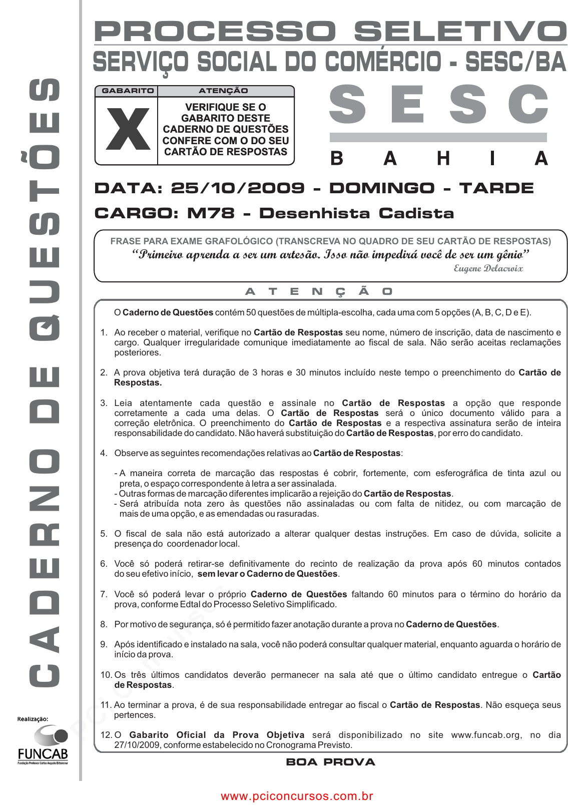 pcimarkpci MDAwMDowMDAwOjAwMDA6MDAwMDowMDAwOmZmZmY6MzZlOTpjMjU5:VGh1LCAxNiBTZXAgMjAyMSAxODozMDoyMCAtMDMwMA== BOA PROVA A T E N Ç Ã O O contém 50 questões de múltipla-escolha, cada uma com 5 opções (A, B, C, D e E). 1. Ao receber o material, verifique no seu nome, número de inscrição, data de nascimento e cargo. Qualquer irregularidade comunique imediatamente ao fiscal de sala. Não serão aceitas reclamações posteriores. 2. A prova objetiva terá duração de 3 horas e 30 minutos incluído neste tempo o preenchimento do 3. Leia atentamente cada questão e assinale no a opção que responde corretamente a cada uma delas. O será o único documento válido para a correção eletrônica. O preenchimento do e a respectiva assinatura serão de inteira responsabilidade do candidato. Não haverá substituição do , por erro do candidato. 4. Observe as seguintes recomendações relativas ao : - A maneira correta de marcação das respostas é cobrir, fortemente, com esferográfica de tinta azul ou preta, o espaço correspondente à letra a ser assinalada. - Outras formas de marcação diferentes implicarão a rejeição do . - Será atribuída nota zero às questões não assinaladas ou com falta de nitidez, ou com marcação de mais de uma opção, e as emendadas ou rasuradas. 5. O fiscal de sala não está autorizado a alterar qualquer destas instruções. Em caso de dúvida, solicite a presença do coordenador local. 6. Você só poderá retirar-se definitivamente do recinto de realização da prova após 60 minutos contados do seu efetivo início, . 7. Você só poderá levar o próprio faltando 60 minutos para o término do horário da prova, conforme Edtal do Processo Seletivo Simplificado. 8. Por motivo de segurança, só é permitido fazer anotação durante a prova no . 9. Após identificado e instalado na sala, você não poderá consultar qualquer material, enquanto aguarda o horário de início da prova. 10. Os três últimos candidatos deverão permanecer na sala até que o último candidato entregue o . 11. Ao terminar a prova, é de sua responsabilidade entregar ao fiscal o . Não esqueça seus pertences. 12. O será disponibilizado no site www.funcab.org, no dia 27/10/2009, conforme estabelecido no Cronograma Previsto. Caderno de Questões Cartão de Respostas Cartão de Respostas. Cartão de Respostas Cartão de Respostas Cartão de Respostas Cartão de Respostas Cartão de Respostas Cartão de Respostas sem levar o Caderno de Questões Caderno de Questões Caderno de Questões Cartão de Respostas Cartão de Respostas Gabarito Oficial da Prova Objetiva C A D E R N O D E Q U E S T Õ E S CARGO: M78 - Desenhista Cadista DATA: 25/10/2009 - DOMINGO - TARDE FRASE PARA EXAME GRAFOLÓGICO (TRANSCREVA NO QUADRO DE SEU CARTÃO DE RESPOSTAS) Eugene Delacroix “Primeiro aprenda a ser um artesão. Isso não impedirá você de ser um gênio” GABARITO ATENÇÃO X VERIFIQUE SE O GABARITO DESTE CADERNO DE QUESTÕES CONFERE COM O DO SEU CARTÃO DE RESPOSTAS GABARITO ATENÇÃO X VERIFIQUE SE O GABARITO DESTE CADERNO DE QUESTÕES CONFERE COM O DO SEU CARTÃO DE RESPOSTAS PROCESSO SELETIVO SERVIÇO SOCIAL DO COMÉRCIO - SESC/BA www.pciconcursos.com.br pcimarkpci MDAwMDowMDAwOjAwMDA6MDAwMDowMDAwOmZmZmY6MzZlOTpjMjU5:VGh1LCAxNiBTZXAgMjAyMSAxODozMDoyMCAtMDMwMA== 02 LÍNGUA PORTUGUESA Leia o texto abaixo e responda às questões propostas. Texto 1 Ninguém ama outra pessoa pelas qualidades que ela tem, caso contrário os honestos, simpáticos e não fumantes teriam uma fila de pretendentes batendo a porta. O amor não é chegado a fazer contas, não obedece à razão. O verdadeiro amor acontece por empatia, por magnetismo, por conjunção estelar. Ninguém ama outra pessoa porque ela é educada, veste-se bem e é fã do Caetano. Isso são só referenciais. Ama-se pelo cheiro, pelo mistério, pela paz que o outro lhe dá, ou pelo tormento que provoca. Ama-se pelo tom de voz, pela maneira que os olhos piscam, pela fragilidade que se revela quando menos se espera. Você ama aquela petulante. Você escreveu dúzias de cartas que ela não respondeu, você deu flores que ela deixou a seco. Você gosta de rock e ela de chorinho, você gosta de praia e ela tem alergia a sol, você abomina Natal e ela detesta oAno Novo, nem no ódio vocês combinam. Então? Então, que ela tem um jeito de sorrir que o deixa imobilizado, o beijo dela é mais viciante do que LSD, você adora brigar com ela e ela adora implicar com você. Isso tem nome. Você ama aquele cafajeste. Ele diz que vai e não liga, ele veste o primeiro trapo que encontra no armário. Ele não emplaca uma semana nos empregos, está sempre duro, e é meio galinha . Ele não tem a menor vocação para príncipe encantado e ainda assim você não consegue despachá-lo. Quando a mão dele toca na sua nuca, você derrete feito manteiga. Ele toca gaita na boca, adora animais e escreve poemas. Por que você ama este cara? Não pergunte pra mim; você é inteligente. Lê livros, revistas, jornais. Gosta dos filmes dos irmãos Coen e do Robert Altman, mas sabe que uma boa comédia romântica também tem seu valor. É bonita. Seu cabelo nasceu para ser sacudido num comercial de xampu e seu corpo tem todas as curvas no lugar. Independente, emprego fixo, bom saldo no banco. Gosta de viajar, de música, tem loucura por computador e seu fettucine ao pesto é imbatível. Você tem bom humor, não pega no pé de ninguém e adora sexo. Com um currículo desse, criatura, por que está sem um amor? Ah, o amor, essa raposa. Quem dera o amor não fosse um sentimento, mas uma equação matemática: eu linda + você inteligente = dois apaixonados. Não funciona assim. Amar não requer conhecimento prévio nem consulta ao SPC. Ama-se justamente pelo que o Amor tem de indefinível. Honestos existem aos milhares, generosos têm às pencas, bons motoristas e bons pais de família, tá assim, ó! Mas ninguém consegue ser do jeito que o amor da sua vida é! Pense ni