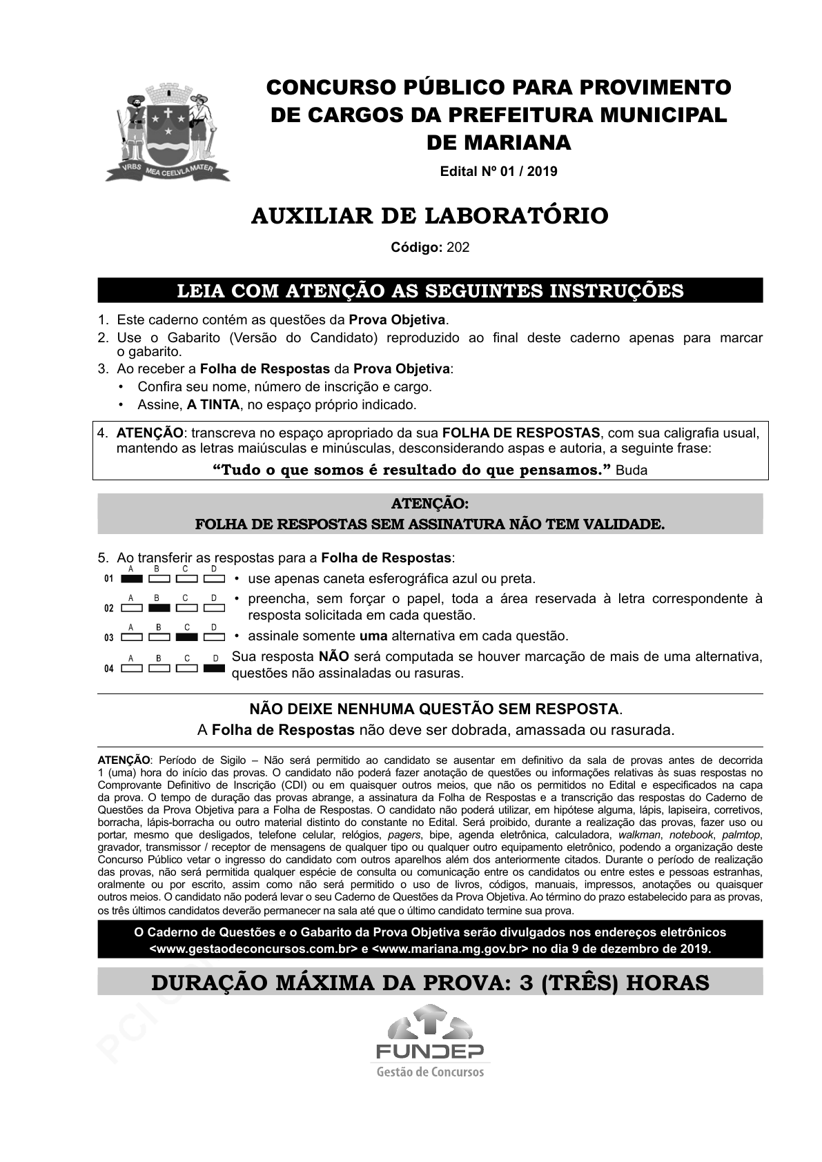 pcimarkpci MDAwMDowMDAwOjAwMDA6MDAwMDowMDAwOmZmZmY6MzZlOTpjMjU5:U2F0LCAxOCBTZXAgMjAyMSAxMToxOToxNCAtMDMwMA== CONCURSO PÚBLICO PARA PROVIMENTO DE CARGOS DA PREFEITURA MUNICIPAL DE MARIANA Edital Nº 01 / 2019 auxiliar de laboratório Código: 202 leia CoM ateNÇÃo aS SeGuiNteS iNStruÇÕeS 1. Este caderno contém as questões da Prova Objetiva. 2. Use o Gabarito (Versão do Candidato) reproduzido ao final deste caderno apenas para marcar o gabarito. 3. Ao receber a Folha de Respostas da Prova Objetiva: • Confira seu nome, número de inscrição e cargo. • Assine, A TINTA, no espaço próprio indicado. 4. ATENÇÃO: transcreva no espaço apropriado da sua FOLHA DE RESPOSTAS, com sua caligrafia usual, mantendo as letras maiúsculas e minúsculas, desconsiderando aspas e autoria, a seguinte frase: “tudo o que somos é resultado do que pensamos.” Buda ateNÇÃo: FolHa de reSPoStaS SeM aSSiNatura NÃo teM Validade. 5. Ao transferir as respostas para a Folha de Respostas: • use apenas caneta esferográfica azul ou preta. • preencha, sem forçar o papel, toda a área reservada à letra correspondente à resposta solicitada em cada questão. • assinale somente uma alternativa em cada questão. Sua resposta NÃO será computada se houver marcação de mais de uma alternativa, questões não assinaladas ou rasuras. NÃO DEIXE NENHUMA QUESTÃO SEM RESPOSTA. A Folha de Respostas não deve ser dobrada, amassada ou rasurada. ATENÇÃO: Período de Sigilo – Não será permitido ao candidato se ausentar em definitivo da sala de provas antes de decorrida 1 (uma) hora do início das provas. O candidato não poderá fazer anotação de questões ou informações relativas às suas respostas no Comprovante Definitivo de Inscrição (CDI) ou em quaisquer outros meios, que não os permitidos no Edital e especificados na capa da prova. O tempo de duração das provas abrange, a assinatura da Folha de Respostas e a transcrição das respostas do Caderno de Questões da Prova Objetiva para a Folha de Respostas. O candidato não poderá utilizar, em hipótese alguma, lápis, lapiseira, corretivos, borracha, lápis-borracha ou outro material distinto do constante no Edital. Será proibido, durante a realização das provas, fazer uso ou portar, mesmo que desligados, telefone celular, relógios, pagers, bipe, agenda eletrônica, calculadora, walkman, notebook, palmtop, gravador, transmissor / receptor de mensagens de qualquer tipo ou qualquer outro equipamento eletrônico, podendo a organização deste Concurso Público vetar o ingresso do candidato com outros aparelhos além dos anteriormente citados. Durante o período de realização das provas, não será permitida qualquer espécie de consulta ou comunicação entre os candidatos ou entre estes e pessoas estranhas, oralmente ou por escrito, assim como não será permitido o uso de livros, códigos, manuais, impressos, anotações ou quaisquer outros meios. O candidato não poderá levar o seu Caderno de Questões da Prova Objetiva. Ao término do prazo estabelecido para as provas, os três últimos candidatos deverão permanecer na sala até que o último candidato termine sua prova. O Caderno de Questões e o Gabarito da Prova Objetiva serão divulgados nos endereços eletrônicos <www.gestaodeconcursos.com.br> e <www.mariana.mg.gov.br> no dia 9 de dezembro de 2019. duraÇÃo MÁxiMa da ProVa: 3 (trÊS) HoraS pcimarkpci MDAwMDowMDAwOjAwMDA6MDAwMDowMDAwOmZmZmY6MzZlOTpjMjU5:U2F0LCAxOCBTZXAgMjAyMSAxMToxOToxNCAtMDMwMA== ATENÇÃO Sr.(a) Candidato(a), Antes de começar a fazer a prova, confira se este caderno contém, ao todo, 40 (quarenta) questões de múltipla escolha, cada uma constituída de 4 (quatro) alternativas de respostas, assim distribuídas: 10 (dez) questões de Língua Portuguesa, 5 (cinco) questões de Matemática, 5 (cinco) questões de Conhecimentos de Informática, 5 (cinco) questões de Atualidades, 5 (cinco) questões de Legislação e 10 (dez) questões de Conhecimentos Específicos, todas perfeitamente legíveis. Havendo algum problema, informe imediatamente ao aplicador de provas para que ele tome as providências necessárias. Caso não observe essa recomendação, não lhe caberá qualquer reclamação ou recursos posteriores. pcimarkpci MDAwMDowMDAwOjAwMDA6MDAwMDowMDAwOmZmZmY6MzZlOTpjMjU5:U2F0LCAxOCBTZXAgMjAyMSAxMToxOToxNCAtMDMwMA== 3 LíNGUA PORTUGUESA INSTRUÇÃO: Leia a seguir, para responder às questões de 1 a 5. Me chama Chove lá fora E aqui tá tanto frio Me dá vontade de saber... Aonde está você? Me telefona Me chama! Me chama! Me chama!... Nem sempre se vê Lágrima no escuro Lágrima no escuro Lágrima!... Tá tudo cinza sem você Tá tão vazio E a noite fica Sem porque... Aonde está você? Me telefona Me chama! Me chama! Me chama... Nem sempre se vê! Mágica no absurdo Mágica no absurdo Mágica! Disponível em: <https://www.letras.mus.br/lobao/47036/>. Acesso em: 20 out. 2019. QUESTÃO 1 Segundo o texto, é correto afirmar que A) o enunciador do texto está no ambiente referido como “lá fora”. B) o enunciador pede diretamente ao seu interlocutor para que o chame. Portanto, pode-se concluir que ambos estão participando do diálogo. C) o interlocutor a quem o enunciador se refere não quer lhe telefonar. D) de acordo com o enunciador, em algumas circunstâncias, é possível ver “lágrima no escuro”. QUESTÃO 2 Releia o trecho a seguir. “Me dá vontade de saber... Aonde está você? Me telefona Me chama! Me chama! Me chama!...” Esse trecho apresenta duas inadequações de acordo com a norma-padrão. São elas: A) I) Advérbio relacionado a verbo de movimento no lugar em que deveria ser usado um advérbio relacionado a um verbo estático, ou seja, de permanência e II) Pronome oblíquo átono no início da oração. B) I) Advérbio relacionado a verbo estático, ou seja, de permanência, no lugar em que deveria ser usado um advérbio relacionado a um verbo de movimento e II) Pronome reflexi