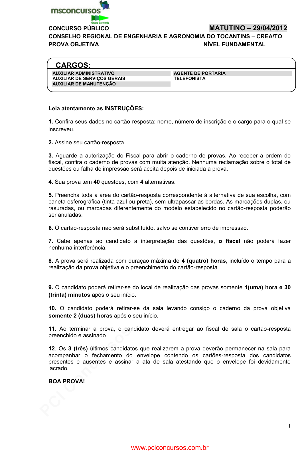 pcimarkpci MDAwMDowMDAwOjAwMDA6MDAwMDowMDAwOmZmZmY6MzZlOTpjMjU5:U2F0LCAxOCBTZXAgMjAyMSAxNDoxMDo1MCAtMDMwMA== 1 CONCURSO PÚBLICO MATUTINO – 29/04/2012 CONSELHO REGIONAL DE ENGENHARIA E AGRONOMIA DO TOCANTINS – CREA/TO PROVA OBJETIVA NÍVEL FUNDAMENTAL CARGOS:MallL AUXILIAR ADMINISTRATIVO AUXILIAR DE SERVIÇOS GERAIS AGENTE DE PORTARIA TELEFONISTA AUXILIAR DE MANUTENÇÃO Leia atentamente as INSTRUÇÕES: 1. Confira seus dados no cartão-resposta: nome, número de inscrição e o cargo para o qual se inscreveu. 2. Assine seu cartão-resposta. 3. Aguarde a autorização do Fiscal para abrir o caderno de provas. Ao receber a ordem do fiscal, confira o caderno de provas com muita atenção. Nenhuma reclamação sobre o total de questões ou falha de impressão será aceita depois de iniciada a prova. 4. Sua prova tem 40 questões, com 4 alternativas. 5. Preencha toda a área do cartão-resposta correspondente à alternativa de sua escolha, com caneta esferográfica (tinta azul ou preta), sem ultrapassar as bordas. As marcações duplas, ou rasuradas, ou marcadas diferentemente do modelo estabelecido no cartão-resposta poderão ser anuladas. 6. O cartão-resposta não será substituído, salvo se contiver erro de impressão. 7. Cabe apenas ao candidato a interpretação das questões, o fiscal não poderá fazer nenhuma interferência. 8. A prova será realizada com duração máxima de 4 (quatro) horas, incluído o tempo para a realização da prova objetiva e o preenchimento do cartão-resposta. 9. O candidato poderá retirar-se do local de realização das provas somente 1(uma) hora e 30 (trinta) minutos após o seu início. 10. O candidato poderá retirar-se da sala levando consigo o caderno da prova objetiva somente 2 (duas) horas após o seu início. 11. Ao terminar a prova, o candidato deverá entregar ao fiscal de sala o cartão-resposta preenchido e assinado. 12. Os 3 (três) últimos candidatos que realizarem a prova deverão permanecer na sala para acompanhar o fechamento do envelope contendo os cartões-resposta dos candidatos presentes e ausentes e assinar a ata de sala atestando que o envelope foi devidamente lacrado. BOA PROVA! www.pciconcursos.com.br pcimarkpci MDAwMDowMDAwOjAwMDA6MDAwMDowMDAwOmZmZmY6MzZlOTpjMjU5:U2F0LCAxOCBTZXAgMjAyMSAxNDoxMDo1MCAtMDMwMA== 2 PROVA OBJETIVA – AUXILIAR ADMINISTRATIVO/ AUXILIAR DE SERVIÇOS GERAIS/ AUXILIAR DE MANUTENÇÃO/ AGENTE DE PORTARIA/ TELEFONISTA LÍNGUA PORTUGUESA Leia o texto abaixo para responder as questões 1 e 2. Timidez pode ser resultado de falhas no cérebro, diz estudo Ficar com as bochechas vermelhas facilmente pode ajudar os tímidos a fazerem sucesso, mas a descoberta de um novo estudo indica algo menos fofo sobre a timidez. Usando imagens de ressonância magnética funcional, pesquisadores da Universidade de Vanderbilt, nos EUA, descobriram que os tímidos podem ter problemas em duas regiões cerebrais – a amígdala e o hipocampo -, o que pode causar problemas de adaptação a novos ambientes e novos estímulos. Foram analisados tanto adultos inibidos quanto os desinibidos, que foram expostos a fotos de rostos de pessoas desconhecidas repetidas vezes. Durante a exposição a rostos diferentes, o hipocampo e a amígdala geralmente apresentavam uma atividade mais intensa. Mas ela tendia a diminuir à medida que esses rostos se repetiam e iam se tornando mais familiares. Foi o que aconteceu com os mais extrovertidos – mas não com os tímidos. Para eles, a resposta cerebral era sempre intensa – ou seja, não se habituavam aos rostos mesmo que os tivessem visto várias vezes. Segundo a principal autora do estudo, Jennifer Urbano Blackford, essa falha em se familiarizar ajuda a entender o comportamento tímido e cauteloso que é característico dos indivíduos inibidos. “Aqueles que familiarizaram mais lentamente podem achar encontros com novas pessoas algo desgastante e evitar novas experiências sociais, enquanto os que se ajustam mais rapidamente podem ser mais propensos a buscar novas experiências sociais“, disse ela ao Science Daily. Isso pode, segundo o estudo, ser a causa da síndrome de ansiedade social, problema que afeta um a cada dez adultos nos Estados Unidos e se caracteriza pelo medo crônico de certas situações sociais. Disponível em: http://super.abril.com.br/blogs/como-pessoas-funcionam/timidez-pode-ser-resultado-de-falhas-em-duas-regioes-do- cerebro-diz-estudo/ Acesso em 20/03/2012 às 20:30h. 01. De acordo com o texto acima é CORRETO afirmar que: a) A timidez é característica de indivíduos desinibidos. b) A timidez pode estar relacionada a um problema cerebral. c) Novas experiências sociais agradam aos tímidos. d) A timidez pode ser a solução para a síndrome da ansiedade social. 02. No trecho retirado do texto: “Foram analisados tanto adultos inibidos quanto os desinibidos...”, o termo grifado, pode ser morfologicamente classificado como: a) Substantivo. b) Pronome. c) Adjetivo. d) Conjunção. Leia o texto abaixo para responder as questões de 3 a 7. 8 inventores (que você não conhece) que mudaram a sua vida Muitos objetos estão tão integrados ao nosso cotidiano que a gente nem se pergunta como eles surgiram. Tudo bem, é normal não questionar o surgimento da descarga, por exemplo. Mas isso tem um lado ruim também, porque inventores importantes que tiveram sacadas geniais para melhorar o nosso dia-a-dia são relegados ao limbo do anonimato. Por isso, a SUPER mostra 8 pessoas de que (provavelmente) você nunca ouviu falar, mas que criaram coisas sem as quais você não viveria. Esta dica vai especialmente para os DJs do ônibus: já inventaram os fones de ouvido. E faz muito tempo. Este objeto – que parte do pressuposto que ninguém é obrigado a conviver com o gosto musical alheio – foi inventado pelo americano John C. Koss, fundador da Koss Corporation, em 1958. Até hoje a empresa produz os fones. Justiça seja feita: naquela época, os fones já existiam, mas er
