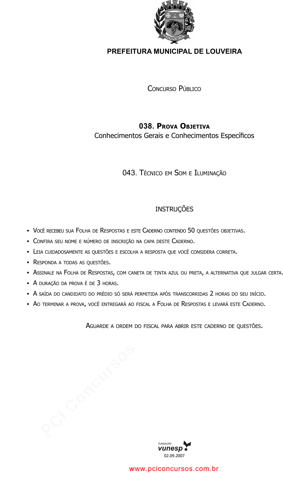 pcimarkpci MDAwMDowMDAwOjAwMDA6MDAwMDowMDAwOmZmZmY6MzZlOTpjMjU5:U2F0LCAxMSBTZXAgMjAyMSAyMDowNToxNCAtMDMwMA== PREFEITURA MUNICIPAL DE LOUVEIRA CONCURSO PÚBLICO 038. PROVA OBJETIVA Conhecimentos Gerais e Conhecimentos Específi cos 043. TÉCNICO EM SOM E ILUMINAÇÃO INSTRUÇÕES VOCÊ RECEBEU SUA FOLHA DE RESPOSTAS E ESTE CADERNO CONTENDO 50 QUESTÕES OBJETIVAS. CONFIRA SEU NOME E NÚMERO DE INSCRIÇÃO NA CAPA DESTE CADERNO. LEIA CUIDADOSAMENTE AS QUESTÕES E ESCOLHA A RESPOSTA QUE VOCÊ CONSIDERA CORRETA. RESPONDA A TODAS AS QUESTÕES. ASSINALE NA FOLHA DE RESPOSTAS, COM CANETA DE TINTA AZUL OU PRETA, A ALTERNATIVA QUE JULGAR CERTA. A DURAÇÃO DA PROVA É DE 3 HORAS. A SAÍDA DO CANDIDATO DO PRÉDIO SÓ SERÁ PERMITIDA APÓS TRANSCORRIDAS 2 HORAS DO SEU INÍCIO. AO TERMINAR A PROVA, VOCÊ ENTREGARÁ AO FISCAL A FOLHA DE RESPOSTAS E LEVARÁ ESTE CADERNO. AGUARDE A ORDEM DO FISCAL PARA ABRIR ESTE CADERNO DE QUESTÕES. 02.09.2007 www.pciconcursos.com.br www.pciconcursos.com.br pcimarkpci MDAwMDowMDAwOjAwMDA6MDAwMDowMDAwOmZmZmY6MzZlOTpjMjU5:U2F0LCAxMSBTZXAgMjAyMSAyMDowNToxNCAtMDMwMA== 2PMLV/038-TecSomIlum CONHECIMENTOS GERAIS Texto para responder às questões de números 01 a 06. Como fazíamos sem óculos? Três graus de miopia. Hoje, um diagnóstico como esse é bobagem. Afinal, você pode viver normalmente usando um par de óculos. Mas há alguns séculos um problema de visão assim era sinônimo de aposentadoria. O senador romano Marco Túlio Cícero, por exemplo, quase teve que abandonar o emprego quando a idade o impediu de ler sozinho. Como tinha dinheiro, Cícero resolveu o problema do jeito que se fazia na época: comprou escravos que pudessem ler para ele. As primeiras lentes apareceram no ano 500 a.C. na China – mas, como se acreditava que os problemas de visão eram culpa de espíritos malignos, elas serviam apenas como amuleto. Quase mil anos depois, no século 4, o grego Sêneca, autor de tragédias, conhecido por ter lido todos os livros que existiam na época, usava um pote com água para deixar as letras maiores. Foi só lá pelo ano 1000 que as lentes apareceram na Europa. As primeiras, as pedras de leitura, foram criadas pelos monges católicos, dos poucos alfabetizados na época. Cristais de quartzo, topázio ou berilo eram lapidados em forma de semicírculo e polidos. O resultado era uma lupa primitiva, usada em cima do material que se pretendia ler. Outras centenas de anos se passaram até que os homens tivessem a idéia de aproximar a pedra dos olhos. Ou melhor, do olho – os primeiros modelos de óculos, no século 14, eram feitos só para uma vista. Quando surgiu a versão para dois olhos, tinha o formato de um V invertido. Era preciso segurar as armações com as mãos ou ficar completamente imóvel para que elas permanecessem apoiadas sobre o nariz. Nessa época, óculos eram caríssimos, a ponto de aparecerem listados em testamentos e inventários. Foi só em 1752, que o inglês James Ayscough criou os óculos com duas hastes laterais. Mas, apesar de terem aberto os olhos de muita gente, os óculos não pegaram de cara. Principalmente na Europa, as pessoas tinham vergonha de aparecer em público usando o acessório. Menos na Espanha – lá, as pessoas achavam que ter um objeto de vidro as deixava com um ar mais importante. (Bárbara Soalheiro, História, junho de 2006) 01. Leia as frases. I. No ano 1000, monges criaram uma espécie de lupa feita de cristais de quartzo. II. Os primeiros arremedos de óculos eram objetos caros. III. Na Espanha, as pessoas compravam escravos que pudessem ler para os analfabetos. IV. As lentes dos primeiros óculos com hastes laterais eram feitas de berilo. De acordo com a leitura do texto, pode-se afirmar que está correto apenas o contido em (A) I e II. (B) I e III. (C) II e III. (D) II e IV. (E) III e IV. 02. Em – Nessa época, óculos eram caríssimos, a ponto de apare- cerem listados em testamentos e inventários. (3.º parágrafo) – a expressão destacada, Nessa época, refere-se (A) ao ano de 1752. (B) ao período em que os monges criaram a primeira lupa. (C) ao século XIV. (D) a quando se usavam óculos em apenas um olho. (E) ao período em que os óculos eram usados para os dois olhos. 03. Assinale a alternativa em que as afirmações entre parênteses estão corretas, de acordo com o texto. (A) Mas há alguns séculos um problema de visão assim era sinônimo de aposentadoria. (a expressão há alguns séculos indica uma ação concomitante) (B) ... com as mãos ou ficar completamente imóvel para que elas permanecessem... (a expressão completamente apresenta sentido de afirmação) (C) As primeiras, as pedras de leitura, foram criadas pelos monges católicos... (a expressão de estabelece relação de finalidade) (D) ... elas serviam apenas como amuleto. (a expressão como denota sentido de condição) (E) Foi só lá pelo ano 1000 que as lentes apareceram na Europa. (a expressão lá remete a uma idéia de conformidade) 04. Leia o trecho a seguir. As primeiras lentes apareceram no ano 500 a.C. na China – mas, como se acreditava que os problemas de visão eram culpa de espíritos malignos, ... As expressões em destaque, mas e como, podem ser substituí- das, correta e respectivamente, sem alteração de sentido, por (A) enquanto – embora (B) porém – pois (C) e – por causa que (D) contudo – porque (E) portanto – por mais que 05. Assinale a alternativa correta, quanto à pontuação, conforme a norma culta. (A) Os óculos, de duas hastes, foram criados, pelo inglês James Ayscough. (B) O senador romano Marco Túlio Cícero, comprava escravos para lerem para ele. (C) No ano 1000: apareceram as primeiras lentes feitas, de cristais de quartzo. (D) Os europeus tinham vergonha, de usar óculos. Pois achavam o adorno feio. (E) Antigamente, quem tinha problema de visão logo se aposentava. 06. Assinale a alternativa correta quanto à ocorrência ou não do acento indicativo da crase. (A) Na Europa, as pes
