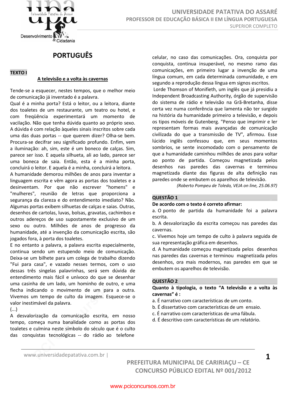 pcimarkpci MDAwMDowMDAwOjAwMDA6MDAwMDowMDAwOmZmZmY6MzZlOTpjMjU5:TW9uLCAxMyBTZXAgMjAyMSAwNDoxMDoxNyAtMDMwMA== UNIVERSIDADE PATATIVA DO ASSARÉ PROFESSOR DE EDUCAÇÃO BÁSICA II EM LÍNGUA PORTUGUESA SUPERIOR COMPLETO www.universidadepatativa.com.br | PREFEITURA MUNICIPAL DE CARIRIAÇU – CE CONCURSO PÚBLICO EDITAL Nº 001/2012 1 PORTUGUÊS TEXTO I A televisão e a volta às cavernas Tende-se a esquecer, nestes tempos, que o melhor meio de comunicação já inventado é a palavra. Qual é a minha porta? Está o leitor, ou a leitora, diante dos toaletes de um restaurante, um teatro ou hotel, e com freqüência experimentará um momento de vacilação. Não que tenha dúvida quanto ao próprio sexo. A dúvida é com relação àqueles sinais inscritos sobre cada uma das duas portas -- que querem dizer? Olha-se bem. Procura-se decifrar seu significado profundo. Enfim, vem a iluminação: ah, sim, este é um boneco de calças. Sim, parece ser isso. E aquela silhueta, ali ao lado, parece ser uma boneca de saia. Então, esta é a minha porta, concluirá o leitor. E aquela é a minha, concluirá a leitora. A humanidade demorou milhões de anos para inventar a linguagem escrita e vêm agora as portas dos toaletes e a desinventam. Por que não escrever "homens" e "mulheres", reunião de letras que proporciona a segurança da clareza e do entendimento imediato? Não. Algumas portas exibem silhuetas de calças e saias. Outras, desenhos de cartolas, luvas, bolsas, gravatas, cachimbos e outros adereços de uso supostamente exclusivo de um sexo ou outro. Milhões de anos de progresso da humanidade, até a invenção da comunicação escrita, são jogados fora, à porta dos toaletes. E no entanto a palavra, a palavra escrita especialmente, continua sendo um estupendo meio de comunicação. Deixa-se um bilhete para um colega de trabalho dizendo "Fui para casa", e vazado nesses termos, com o uso dessas três singelas palavrinhas, será sem dúvida de entendimento mais fácil e unívoco do que se desenhar uma casinha de um lado, um hominho de outro, e uma flecha indicando o movimento de um para a outra. Vivemos um tempo de culto da imagem. Esquece-se o valor inestimável da palavra. (...) A desvalorização da comunicação escrita, em nosso tempo, começa numa banalidade como as portas dos toaletes e culmina neste símbolo do século que é o culto das conquistas tecnológicas -- do rádio ao telefone celular, no caso das comunicações. Ora, conquista por conquista, continua insuperável, no mesmo ramo das comunicações, em primeiro lugar a invenção de uma língua comum, em cada determinada comunidade, e em segundo a reprodução dessa língua em signos escritos. Lorde Thomson of Monifieth, um inglês que já presidiu a Independent Broadcasting Authority, órgão de supervisão do sistema de rádio e televisão na Grã-Bretanha, disse certa vez numa conferência que lamenta não ter surgido na história da humanidade primeiro a televisão, e depois os tipos móveis de Gutenberg. "Penso que imprimir e ler representam formas mais avançadas de comunicação civilizada do que a transmissão de TV", afirmou. Esse lúcido inglês confessou que, em seus momentos sombrios, se sente incomodado com o pensamento de que a humanidade caminhou milhões de anos para voltar ao ponto de partida. Começou magnetizada pelos desenhos nas paredes das cavernas e terminou magnetizada diante das figuras de alta definição nas paredes onde se embutem os aparelhos de televisão. (Roberto Pompeu de Toledo, VEJA on line, 25.06.97) QUESTÃO 1___________________________________ __ De acordo com o texto é correto afirmar: a. O ponto de partida da humanidade foi a palavra escrita. b. A desvalorização da escrita começou nas paredes das cavernas. c. Vivemos hoje um tempo de culto à palavra seguida de sua representação gráfica em desenhos. d. A humanidade começou magnetizada pelos desenhos nas paredes das cavernas e terminou magnetizada pelos desenhos, ora mais modernos, nas paredes em que se embutem os aparelhos de televisão. QUESTÃO 2________________ _____________________ Quanto à tipologia, o texto “A televisão e a volta às cavernas” é : a. É narrativo com características de um conto. b. É dissertativo com características de um ensaio. c. É narrativo com características de uma fábula. d. É descritivo com características de um relatório. www.pciconcursos.com.br pcimarkpci MDAwMDowMDAwOjAwMDA6MDAwMDowMDAwOmZmZmY6MzZlOTpjMjU5:TW9uLCAxMyBTZXAgMjAyMSAwNDoxMDoxNyAtMDMwMA== UNIVERSIDADE PATATIVA DO ASSARÉ PROFESSOR DE EDUCAÇÃO BÁSICA II EM LÍNGUA PORTUGUESA SUPERIOR COMPLETO www.universidadepatativa.com.br | PREFEITURA MUNICIPAL DE CARIRIAÇU – CE CONCURSO PÚBLICO EDITAL Nº 001/2012 2 QUESTÃO 3_________________________ ________ __ Assinale a alternativa correta quanto aos mecanismos de coesão e coerência no texto: a. “ Que querem dizer” (linha 08) refere-se a àqueles sinais inscritos. b. “ vêm” ( linha 15) refere-se à humanidade. c. “Outras’ ( linha 19) refere-se a silhuetas. d. “conquistas tecnológicas” (linha 38) refere-se às conquistas tecnológicas, no caso das comunicações, especificamente o rádio e o telefone celular. QUESTÃO 4________ _______________________ ___ Leia as proposições: I – No fragmento “Por que não escrever "homens" e "mulheres", reunião de letras que proporciona a segurança da clareza e do entendimento imediato?”(linha 16) a palavra destacada é pronome relativo. II– No fragmento “A desvalorização da comunicação escrita, em nosso tempo, começa numa banalidade como as portas dos toaletes e culmina neste símbolo do século que é o culto das conquistas tecnológicas...”(linha 35) a palavra destacada é conjunção integrante. III - No fragmento “Lorde Thomson of Monifieth, um inglês que já presidiu a Independent Broadcasting Authority, órgão de supervisão do sistema de rádio e televisão na Grã-Bretanha,...” (linha 44