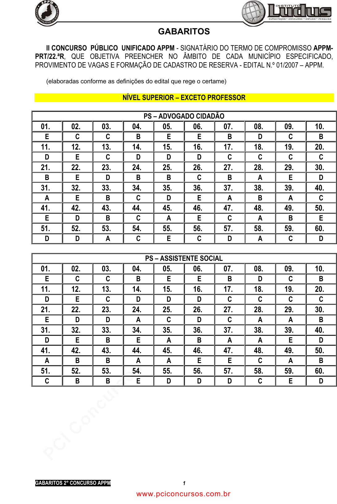 pcimarkpci MDAwMDowMDAwOjAwMDA6MDAwMDowMDAwOmZmZmY6MzZlOTpjMjU5:TW9uLCAxMyBTZXAgMjAyMSAxNDoxNjozMSAtMDMwMA== GABARITOS 2° CONCURSO APPM 1 GABARITOS II CONCURSO PÚBLICO UNIFICADO APPM - SIGNATÁRIO DO TERMO DE COMPROMISSO APPM- PRT/22.ªR, QUE OBJETIVA PREENCHER NO ÂMBITO DE CADA MUNICÍPIO ESPECIFICADO, PROVIMENTO DE VAGAS E FORMAÇÃO DE CADASTRO DE RESERVA - EDITAL N.º 01/2007 – APPM. (elaboradas conforme as definições do edital que rege o certame) NÍVEL SUPERIOR – EXCETO PROFESSOR PS – ADVOGADO CIDADÃO 01. 02. 03. 04. 05. 06. 07. 08. 09. 10. E C C B E E B D C B 11. 12. 13. 14. 15. 16. 17. 18. 19. 20. D E C D D D C C C C 21. 22. 23. 24. 25. 26. 27. 28. 29. 30. B E D B B C B A E D 31. 32. 33. 34. 35. 36. 37. 38. 39. 40. A E B C D E A B A C 41. 42. 43. 44. 45. 46. 47. 48. 49. 50. E D B C A E C A B E 51. 52. 53. 54. 55. 56. 57. 58. 59. 60. D D A C E C D A C D PS – ASSISTENTE SOCIAL 01. 02. 03. 04. 05. 06. 07. 08. 09. 10. E C C B E E B D C B 11. 12. 13. 14. 15. 16. 17. 18. 19. 20. D E C D D D C C C C 21. 22. 23. 24. 25. 26. 27. 28. 29. 30. E D D A C D C A A B 31. 32. 33. 34. 35. 36. 37. 38. 39. 40. D E B E A B A A E D 41. 42. 43. 44. 45. 46. 47. 48. 49. 50. A B B A A E E C A B 51. 52. 53. 54. 55. 56. 57. 58. 59. 60. C B B E D D D C E D www.pciconcursos.com.br pcimarkpci MDAwMDowMDAwOjAwMDA6MDAwMDowMDAwOmZmZmY6MzZlOTpjMjU5:TW9uLCAxMyBTZXAgMjAyMSAxNDoxNjozMSAtMDMwMA== GABARITOS 2° CONCURSO APPM 2 PS – BIÓLOGO 01. 02. 03. 04. 05. 06. 07. 08. 09. 10. E C C B E E B D C B 11. 12. 13. 14. 15. 16. 17. 18. 19. 20. D E C D D D C C C C 21. 22. 23. 24. 25. 26. 27. 28. 29. 30. A C C B E A B A B E 31. 32. 33. 34. 35. 36. 37. 38. 39. 40. C B D A A C D B C A 41. 42. 43. 44. 45. 46. 47. 48. 49. 50. C E E D A C A C C E 51. 52. 53. 54. 55. 56. 57. 58. 59. 60. D B A D B B C B A D PS – BIOQUÍMICO 01. 02. 03. 04. 05. 06. 07. 08. 09. 10. E C C B E E B D C B 11. 12. 13. 14. 15. 16. 17. 18. 19. 20. D E C D D D C C C C 21. 22. 23. 24. 25. 26. 27. 28. 29. 30. E A C E B B E D B C 31. 32. 33. 34. 35. 36. 37. 38. 39. 40. E B A E D E D B D C 41. 42. 43. 44. 45. 46. 47. 48. 49. 50. B D A C D B E D C E 51. 52. 53. 54. 55. 56. 57. 58. 59. 60. B D D D D D A B A E PS – CONTADOR 01. 02. 03. 04. 05. 06. 07. 08. 09. 10. E C C B E E B D C B 11. 12. 13. 14. 15. 16. 17. 18. 19. 20. D E C D D D C C C C 21. 22. 23. 24. 25. 26. 27. 28. 29. 30. D B C E B D B D D B 31. 32. 33. 34. 35. 36. 37. 38. 39. 40. C A E A C E E D E C 41. 42. 43. 44. 45. 46. 47. 48. 49. 50. D E D E B D B D D A 51. 52. 53. 54. 55. 56. 57. 58. 59. 60. A D A E E D C B B C www.pciconcursos.com.br pcimarkpci MDAwMDowMDAwOjAwMDA6MDAwMDowMDAwOmZmZmY6MzZlOTpjMjU5:TW9uLCAxMyBTZXAgMjAyMSAxNDoxNjozMSAtMDMwMA== GABARITOS 2° CONCURSO APPM 3 PS – DENTISTA 01. 02. 03. 04. 05. 06. 07. 08. 09. 10. E C C B E E B D C B 11. 12. 13. 14. 15. 16. 17. 18. 19. 20. D E C D D D C C C C 21. 22. 23. 24. 25. 26. 27. 28. 29. 30. B C C B A C B A B A 31. 32. 33. 34. 35. 36. 37. 38. 39. 40. A C B A C A A E C A 41. 42. 43. 44. 45. 46. 47. 48. 49. 50. D A E C E D B E A C 51. 52. 53. 54. 55. 56. 57. 58. 59. 60. D B C D D C B B C D PS – EDUCADOR FÍSICO 01. 02. 03. 04. 05. 06. 07. 08. 09. 10. E C C B E E B D C B 11. 12. 13. 14. 15. 16. 17. 18. 19. 20. D E C D D D C C C C 21. 22. 23. 24. 25. 26. 27. 28. 29. 30. D C C E A B B A C E 31. 32. 33. 34. 35. 36. 37. 38. 39. 40. A E D C D D D E C E 41. 42. 43. 44. 45. 46. 47. 48. 49. 50. C E B C A B E A B B 51. 52. 53. 54. 55. 56. 57. 58. 59. 60. A C E D C D C C A B PS – ENFERMEIRO 01. 02. 03. 04. 05. 06. 07. 08. 09. 10. E C C B E E B D C B 11. 12. 13. 14. 15. 16. 17. 18. 19. 20. D E C D D D C C C C 21. 22. 23. 24. 25. 26. 27. 28. 29. 30. E C B A D D A C B C 31. 32. 33. 34. 35. 36. 37. 38. 39. 40. A D B A C C E B D A 41. 42. 43. 44. 45. 46. 47. 48. 49. 50. D E C C B D E B A D 51. 52. 53. 54. 55. 56. 57. 58. 59. 60. E A E B A C E D B E www.pciconcursos.com.br pcimarkpci MDAwMDowMDAwOjAwMDA6MDAwMDowMDAwOmZmZmY6MzZlOTpjMjU5:TW9uLCAxMyBTZXAgMjAyMSAxNDoxNjozMSAtMDMwMA== GABARITOS 2° CONCURSO APPM 4 PS – FISIOTERAPEUTA 01. 02. 03. 04. 05. 06. 07. 08. 09. 10. E C C B E E B D C B 11. 12. 13. 14. 15. 16. 17. 18. 19. 20. D E C D D D C C C C 21. 22. 23. 24. 25. 26. 27. 28. 29. 30. E A A B D D B C D D 31. 32. 33. 34. 35. 36. 37. 38. 39. 40. A A E E B B B D C B 41. 42. 43. 44. 45. 46. 47. 48. 49. 50. C B B B B D C D A C 51. 52. 53. 54. 55. 56. 57. 58. 59. 60. B A D B A E A A B B PS – MÉDICO 01. 02. 03. 04. 05. 06. 07. 08. 09. 10. E C C B E E B D C B 11. 12. 13. 14. 15. 16. 17. 18. 19. 20. D E C D D D C C C C 21. 22. 23. 24. 25. 26. 27. 28. 29. 30. D D A E C D B B C A 31. 32. 33. 34. 35. 36. 37. 38. 39. 40. D C D A E B B C A D 41. 42. 43. 44. 45. 46. 47. 48. 49. 50. C B A E E B E B C B 51. 52. 53. 54. 55. 56. 57. 58. 59. 60. D D B B E B C A A D PS – NUTRICIONISTA 01. 02. 03. 04. 05. 06. 07. 08. 09. 10. E C C B E E B D C B 11. 12. 13. 14. 15. 16. 17. 18. 19. 20. D E C D D D C C C C 21. 22. 23. 24. 25. 26. 27. 28. 29. 30. C D D B A A E D D B 31. 32. 33. 34. 35. 36. 37. 38. 39. 40. D B C E E B D B E E 41. 42. 43. 44. 45. 46. 47. 48. 49. 50. A E E A C B A B E C 51. 52. 53. 54. 55. 56. 57. 58. 59. 60. E B D E A A C B E A www.pciconcursos.com.br pcimarkpci MDAwMDowMDAwOjAwMDA6MDAwMDowMDAwOmZmZmY6MzZlOTpjMjU5:TW9uLCAxMyBTZXAgMjAyMSAxNDoxNjozMSAtMDMwMA== GABARITOS 2° CONCURSO APPM 5 PS – PEDAGOGO 01. 02. 03. 04. 05. 06. 07. 08. 09. 10. E C C B E E B D C B 11. 12. 13. 14. 15. 16. 17. 18. 19. 20. D E C D D D C C C C 21. 22. 23. 24. 25. 26. 27. 28. 29. 30. C E C A C A E C C C 31. 32. 33. 34. 35. 36. 37. 38. 39. 40. D B B D D A E E B B 41. 42. 43. 44. 45. 46. 47. 48. 49. 50. B B C D E B E A B A 51. 52. 53. 54. 55. 56. 57. 58. 59. 60. C E A D B D B E B E PS – PSICÓLOGO 01. 02. 03. 04. 05. 06. 07. 08. 09. 10. E C C B E E B D C B 11. 12. 13. 14. 15. 16. 17. 18. 19. 20. D E C D D D C C C C 21. 22. 23. 24. 25. 26. 27. 28. 29. 30. D A A E B C B D E A 31. 32. 33. 34. 35. 36. 37. 38. 39. 40. E B A B E A C B C D 41. 42. 43. 44. 45. 46. 47. 48. 49. 5
