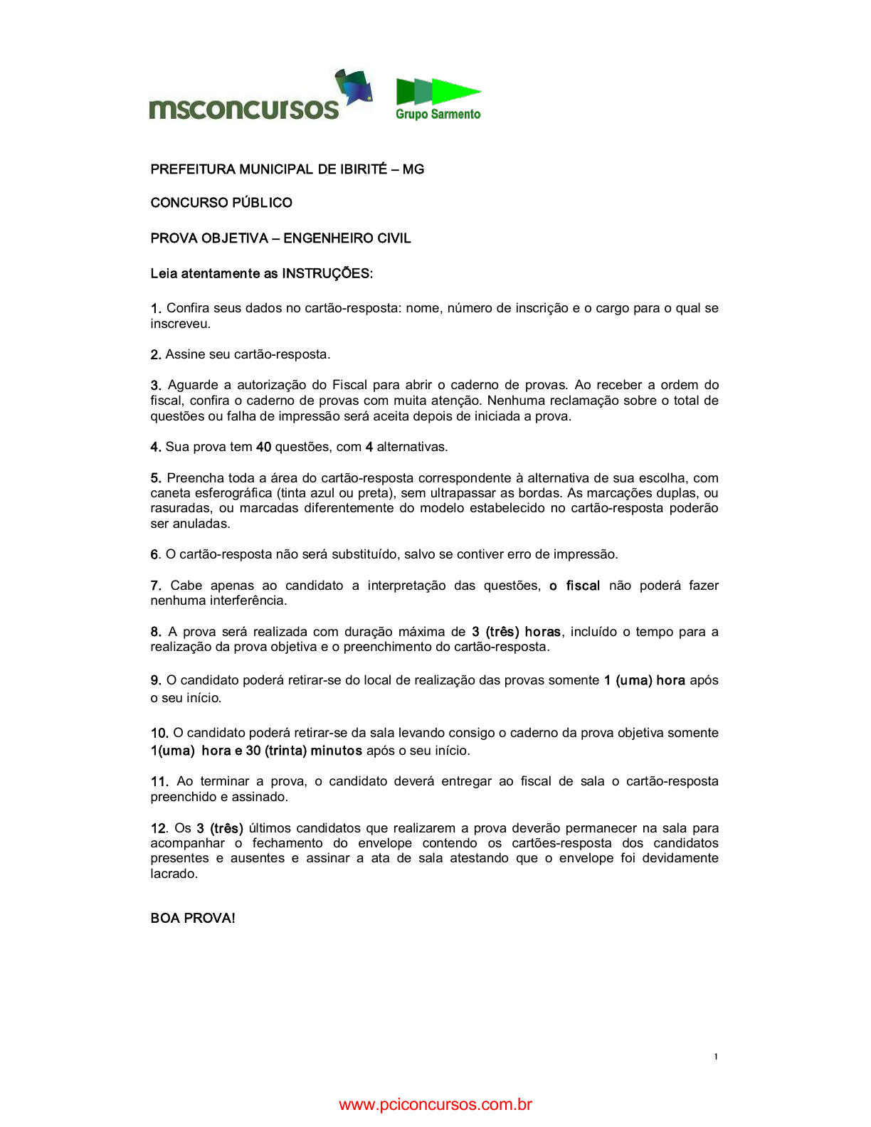 pcimarkpci MDAwMDowMDAwOjAwMDA6MDAwMDowMDAwOmZmZmY6MzZlOTpjMjU5:V2VkLCAxNSBTZXAgMjAyMSAxNzozMjoxNSAtMDMwMA== 1 PREFEITURA MUNICIPAL DE IBIRITÉ – MG CONCURSO PÚBLICO PROVA OBJETIVA – ENGENHEIRO CIVIL Leia atentamente as INSTRUÇÕES: 1. Confira seus dados no cartãoresposta: nome, número de inscrição e o cargo para o qual se inscreveu. 2. Assine seu cartãoresposta. 3. Aguarde a autorização do Fiscal para abrir o caderno de provas. Ao receber a ordem do fiscal, confira o caderno de provas com muita atenção. Nenhuma reclamação sobre o total de questões ou falha de impressão será aceita depois de iniciada a prova. 4. Sua prova tem 40 questões, com 4 alternativas. 5. Preencha toda a área do cartãoresposta correspondente à alternativa de sua escolha, com caneta esferográfica (tinta azul ou preta), sem ultrapassar as bordas. As marcações duplas, ou rasuradas, ou marcadas diferentemente do modelo estabelecido no cartãoresposta poderão ser anuladas. 6. O cartãoresposta não será substituído, salvo se contiver erro de impressão. 7. Cabe apenas ao candidato a interpretação das questões, o fiscal não poderá fazer nenhuma interferência. 8. A prova será realizada com duração máxima de 3 (três) horas, incluído o tempo para a realização da prova objetiva e o preenchimento do cartãoresposta. 9. O candidato poderá retirarse do local de realização das provas somente 1 (uma) hora após o seu início. 10. O candidato poderá retirarse da sala levando consigo o caderno da prova objetiva somente 1(uma) hora e 30 (trinta) minutos após o seu início. 11. Ao terminar a prova, o candidato deverá entregar ao fiscal de sala o cartãoresposta preenchido e assinado. 12. Os 3 (três) últimos candidatos que realizarem a prova deverão permanecer na sala para acompanhar o fechamento do envelope contendo os cartõesresposta dos candidatos presentes e ausentes e assinar a ata de sala atestando que o envelope foi devidamente lacrado. BOA PROVA! www.pciconcursos.com.br pcimarkpci MDAwMDowMDAwOjAwMDA6MDAwMDowMDAwOmZmZmY6MzZlOTpjMjU5:V2VkLCAxNSBTZXAgMjAyMSAxNzozMjoxNSAtMDMwMA== 2 PROVA OBJETIVA – ENGENHEIRO CIVIL PORTUGUÊS Leia atentamente o texto e responda as questões 01 a 06. Livro distribuído pelo MEC defende errar concordância Um livro didático para jovens e adultos distribuído pelo MEC a 4.236 escolas do país reacendeu a discussão sobre como registrar as diferenças entre o discurso oral e o escrito sem resvalar em preconceito, mas ensinando a norma culta da língua. Um capítulo do livro "Por uma Vida Melhor", da ONG Ação Educativa, uma das mais respeitadas na área, diz que, na variedade linguística popular, podese dizer "Os livro ilustrado mais interessante estão emprestado". Em sua página 15, o texto afirma, conforme revelou o site IG: "Você pode estar se perguntando: 'Mas eu posso falar os livro?'. Claro que pode. Mas fique atento porque, dependendo da situação, você corre o risco de ser vítima de preconceito linguístico". Segundo o MEC, o livro está em acordo com os PCNs (Parâmetros Curriculares Nacionais) normas a serem seguidas por todas as escolas e livros didáticos. "A escola precisa livrarse de alguns mitos: o de que existe uma única forma 'certa' de falar, a que parece com a escrita; e o de que a escrita é o espelho da fala", afirma o texto dos PCNs. "Essas duas crenças produziram uma prática de mutilação cultural que, além de desvalorizar a forma de falar do aluno, denota desconhecimento de que a escrita de uma língua não corresponde inteiramente a nenhum de seus dialetos", continua. Heloísa Ramos, uma das autoras do livro, disse que a citação polêmica está num capítulo que descreve as diferenças entre escrever e falar, mas que a coleção não ignora que "cabe à escola ensinar as convenções ortográficas e as características da variedade linguística de prestígio". O linguista Evanildo Bechara, da Academia Brasileira de Letras, critica os PCNs. "Há uma confusão entre o que se espera da pesquisa de um cientista e a tarefa de um professor. Se o professor diz que o aluno pode continuar falando 'nós vai' porque isso não está errado, então esse é o pior tipo de pedagogia, a da mesmice cultural", diz. "Se um indivíduo vai para a escola, é porque busca ascensão social. E isso demanda da escola que lhe ensine novas formas de pensar, agir e falar", continua Bechara. Pasquale Cipro Neto, colunista da Folha, alerta para o risco de exageros. "Uma coisa é manifestar preconceito contra quem quer que seja por causa da expressão que ela usa. Mas isso não quer dizer que qualquer variedade da língua é adequada a qualquer situação." Disponível em : http://www1.folha.uol.com.br/saber/915795livrodistr ibuidopelomecdefendeerrarconcordancia.shtml, acessado em 17 de maio de 2011. 01. O texto afirma que: a) Um livro didático contendo erros gramaticais foi distribuído pelo MEC para reacender a discussão sobre o preconceito envolvendo as diferenças linguísticas. b) Em um dos capítulos do livro em questão, é sugerido aos professores que ensinem aos seus alunos que podem se expressar sem levar em conta a norma padrão da língua, denunciando qualquer um que mostre preconceito quanto a isso. c) Um livro didático, contendo uma nova proposta sobre a visão de que existe apenas uma forma correta de se expressar escrita e oralmente, reacendeu a discussão sobre o modo de ensino da norma culta da Língua. d) O MEC defende o conceito de que não é preciso preocupação com uma única forma certa de falar, pois isso é preconceito linguístico e a escola precisa livarse do mito de que a norma culta deve ser ensinada obrigatoriamente. 02. Sobre o texto, é INCORRETO afirmar: a) Uma das autoras do livro argumenta que, apesar da citação polêmica, o livro reconhece que a variedade linguística de prestígio, isto é, a norma culta, deve ser ensinada. b) O MEC reitera sua posição favorável ao livro ao dizer que não va