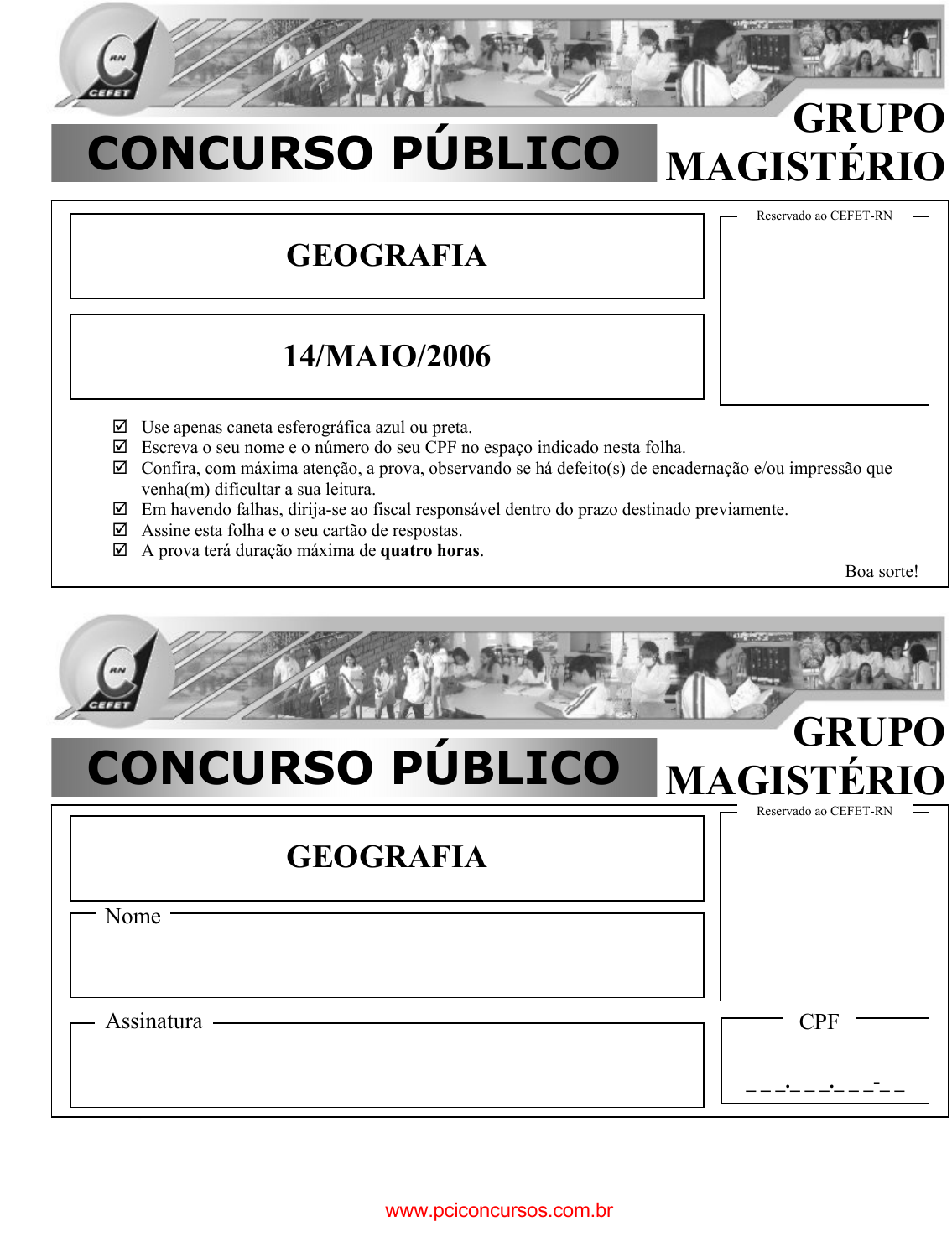 pcimarkpci MDAwMDowMDAwOjAwMDA6MDAwMDowMDAwOmZmZmY6MzZlOTpjMjU5:U3VuLCAxMiBTZXAgMjAyMSAxMDoxNzozOSAtMDMwMA== GRUPO MAGISTÉRIOCONCURSO PÚBLICO GRUPO MAGISTÉRIOCONCURSO PÚBLICO Reservado ao CEFET-RN GEOGRAFIA 14/MAIO/2006 Use apenas caneta esferográfica azul ou preta. Escreva o seu nome e o número do seu CPF no espaço indicado nesta folha. Confira, com máxima atenção, a prova, observando se há defeito(s) de encadernação e/ou impressão que venha(m) dificultar a sua leitura. Em havendo falhas, dirija-se ao fiscal responsável dentro do prazo destinado previamente. Assine esta folha e o seu cartão de respostas. A prova terá duração máxima de quatro horas. Boa sorte! Reservado ao CEFET-RN GEOGRAFIA _ _ _._ _ _._ _ _-_ _ CPF Nome Assinatura www.pciconcursos.com.br pcimarkpci MDAwMDowMDAwOjAwMDA6MDAwMDowMDAwOmZmZmY6MzZlOTpjMjU5:U3VuLCAxMiBTZXAgMjAyMSAxMDoxNzozOSAtMDMwMA== CONCURSO PÚBLICO – GEOGRAFIA CEFET/RN – 2006 GEOGRAFIA 1 1. O ensino de geografia vem sendo influenciado atualmente pelo retorno da abordagem cultural na ciência geográfica. A abordagem atual da Geografia Cultural tem procurado superar as idéias de Carl Ortwin Sauer, abrangendo a) estudos socioeconômicos e políticos da paisagem. b) estudos quantitativos e perceptivos da paisagem. c) análises dos significados da paisagem. d) análises da ecologia cultural da paisagem. 2. A geografia utiliza diversos conceitos-chave como instrumentos capazes de realizar uma análise científica do espaço. No atual período técnico-científico- informacional, o conceito de território tem retornado como uma revanche, exprimindo o conflito entre o global e o local. Na Geografia, define-se território como uma a) unidade do espaço apropriável para a vida e marcada pela identidade. b) área delimitada, monitorada e controlada por relações de poder. c) área dinâmica que se estrutura e se reestrutura em um determinado tempo. d) unidade visível do arranjo espacial que a nossa visão alcança. 3. Os Parâmetros Curriculares Nacionais de Geografia, para o ensino médio, propõem que o docente de geografia desenvolva os processos de ensino e de aprendizagem, utilizando um conjunto de conceitos, que se inicia com o espaço geográfico, passando, em seguida, por outros, como: a) território, lugar, região e regionalização,, globalização, fixos, técnicas e redes. b) paisagem, lugar, território e territorialidade, escala e globalização, técnicas e redes. c) território, escala e mundialização, conectividade, seletividade, técnicas e redes. d) paisagem, região, escalas de análise, mundialização, fluxos, técnicas e redes. 4. O ensino de geografia tende a acompanhar a trajetória do pensamento geográfico. Desde a Antigüidade até os dias atuais, várias alternativas se abrem a esse pensamento e se formam correntes que procuram encaminhar o conhecimento da Geografia em diversas direções: determinismo, possibilismo, neopositivismo, crítica radical e humanismo geográficos, dentre outras. - Com relação ao humanismo geográfico mencionado, pode-se afirmar que se trata de um novo horizonte que considera o a) espaço como resultante da relação natureza- sociedade ou como um produto socioespacial que articula economia e política. b) espaço como resultado de um processo histórico ou como uma construção simbólica que associa sentidos e idéias. c) meio geográfico como produto de duas formas espaciais não excludentes, ou seja, a planície isotrópica e a representação matricial. d) meio geográfico como locus da reprodução das relações de produção, isto é, reprodução da sociedade. 5. Um professor de Geografia do CEFET-RN disse que, nos processos de ensino e de aprendizagem de geografia, no ensino médio, é importante o uso de diferentes tipos de escala. Recentemente, a escala geográfica tem se destacado nas aulas desse professor, porque: a) contribui para a descoberta da distância real entre dois pontos de um mapa. b) proporciona a representação do espaço geográfico num mapa, de maneira geométrica. c) possibilita a representação de diferentes níveis de apreensão do fenômeno espacial. d) destaca o mapa como um dado instrumental de representação do espaço. 6. Em uma aula de Geografia no CEFET/RN, um professor, explicando sobre Escala Cartográfica para alunos do curso Técnico de Serviços, perguntou qual seria a melhor escala utilizada para visualização dos principais pontos turísticos da Cidade de Natal. A escala a que ele se referiu é a: a) 1: 2.000.000, que é uma escala pequena e utilizada para visualizar os pontos turísticos da cidade. b) 1: 2.200.000, que é uma escala grande e utilizada para visualizar pontos turísticos da cidade. c) 1: 20.000, que é uma escala grande e utilizada para mostrar riquezas de detalhes dos pontos turísticos da cidade. d) 1: 200.000, que é uma escala pequena e utilizada para representar os pontos turísticos traçados. www.pciconcursos.com.br pcimarkpci MDAwMDowMDAwOjAwMDA6MDAwMDowMDAwOmZmZmY6MzZlOTpjMjU5:U3VuLCAxMiBTZXAgMjAyMSAxMDoxNzozOSAtMDMwMA== CONCURSO PÚBLICO – GEOGRAFIA CEFET/RN – 2006 GEOGRAFIA 2 7. Dando continuidade a essa aula de Geografia, o professor apresentou, dessa vez, aos alunos alguns tipos de Projeções Cartográficas, mostrando as seguintes figuras: I- II- III- Fonte: disponível em www.isba.com.br. - Na explicação, o professor afirmou que: a) A figura III é uma projeção usada geopoliticamente, pois pode realçar o status de um país em relação aos demais da Terra. b) A figura I é uma projeção cilíndrica e apresenta deformações das superfícies de baixas latitudes, mantendo as de altas latitudes em forma e dimensão mais próximas do real. c) A figura II é a projeção azimutal, sendo mais utilizada para a representação cartográfica de áreas de baixas latitudes, como a América do Sul e a África. d) As figuras I e II são projeções a que os principais atores da globalização, como os