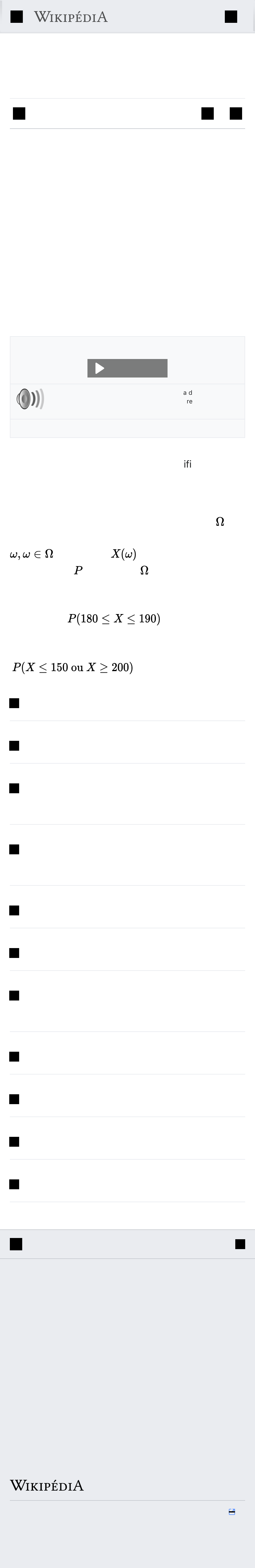 Condições de utilização • Última modificação há 24 dias por Waldyri… Conteúdo disponibilizado nos termos da CC BY-SA 3.0 , salvo indicação em contrário. Política de privacidade • Versão desktop … Pesquisar Variável aleatória variável quantitativa, cujo resultado depende de fatores aleatórios … … … Uma variável aleatória é uma variável quantitativa, cujo resultado (valor) depende de fatores aleatórios. Um exemplo de uma variável aleatória é o resultado do lançamento de um dado que pode dar qualquer número entre 1 e 6. Embora possamos conhecer os seus possíveis resultados, o resultado em si depende de fatores de sorte (álea). Uma variável aleatória pode ser uma medição de um parâmetro que pode gerar valores diferentes. O conceito de variável aleatória é essencial em estatística e em outros métodos quantitativos para a representação de fenômenos incertos.[1] As variáveis aleatórias podem ser classificadas em variáveis aleatórias discretas, contínuas e mistas. Um exemplo de uma variável aleatória é a altura de uma pessoa, em que o conjunto de pessoas é e a variável aleatória é a função que mapeia a pessoa a sua altura . Com a lei da probabilidade associada a é possível calcular a probabilidade de a altura ser em qualquer subconjunto de valores entre 180 centímetros e 190 centímetros ou a probabilidade de a altura ser menos que 150 centímetros ou mais que 200 centímetros .[2] Ouça o artigo (info) Este áudio foi criado a partir da revisão datada de 3 de janeiro de 2017 e pode não refletir mudanças posteriores ao artigo (ajuda). Mais artigos audíveis Definição informal Definição formal Classificação das variáveis aleatórias Funções associadas às variáveis aleatórias Funções de variáveis aleatórias Momentos Equivalência de variáveis aleatórias Convergência Ver também Referências Bibliografia https://foundation.wikimedia.org/wiki/Terms_of_Use/pt-br https://meta.wikimedia.org/wiki/Privacy_policy/pt-br https://pt.wikipedia.org/w/index.php?title=Vari%C3%A1vel_aleat%C3%B3ria&mobileaction=toggle_view_desktop https://pt.m.wikipedia.org/wiki/Especial:History/Vari%C3%A1vel_aleat%C3%B3ria https://creativecommons.org/licenses/by-sa/3.0/ https://pt.m.wikipedia.org/wiki/Vari%C3%A1vel_(estat%C3%ADstica) https://pt.m.wikipedia.org/wiki/Estat%C3%ADstica https://pt.m.wikipedia.org/wiki/Ficheiro:Vari%C3%A1vel_aleat%C3%B3ria.ogg https://pt.m.wikipedia.org/wiki/Ajuda:Guia_de_consulta_e_reprodu%C3%A7%C3%A3o/Reproduzindo_Ogg https://pt.m.wikipedia.org/wiki/Wikip%C3%A9dia:Projetos/Wikip%C3%A9dia_aud%C3%ADvel
