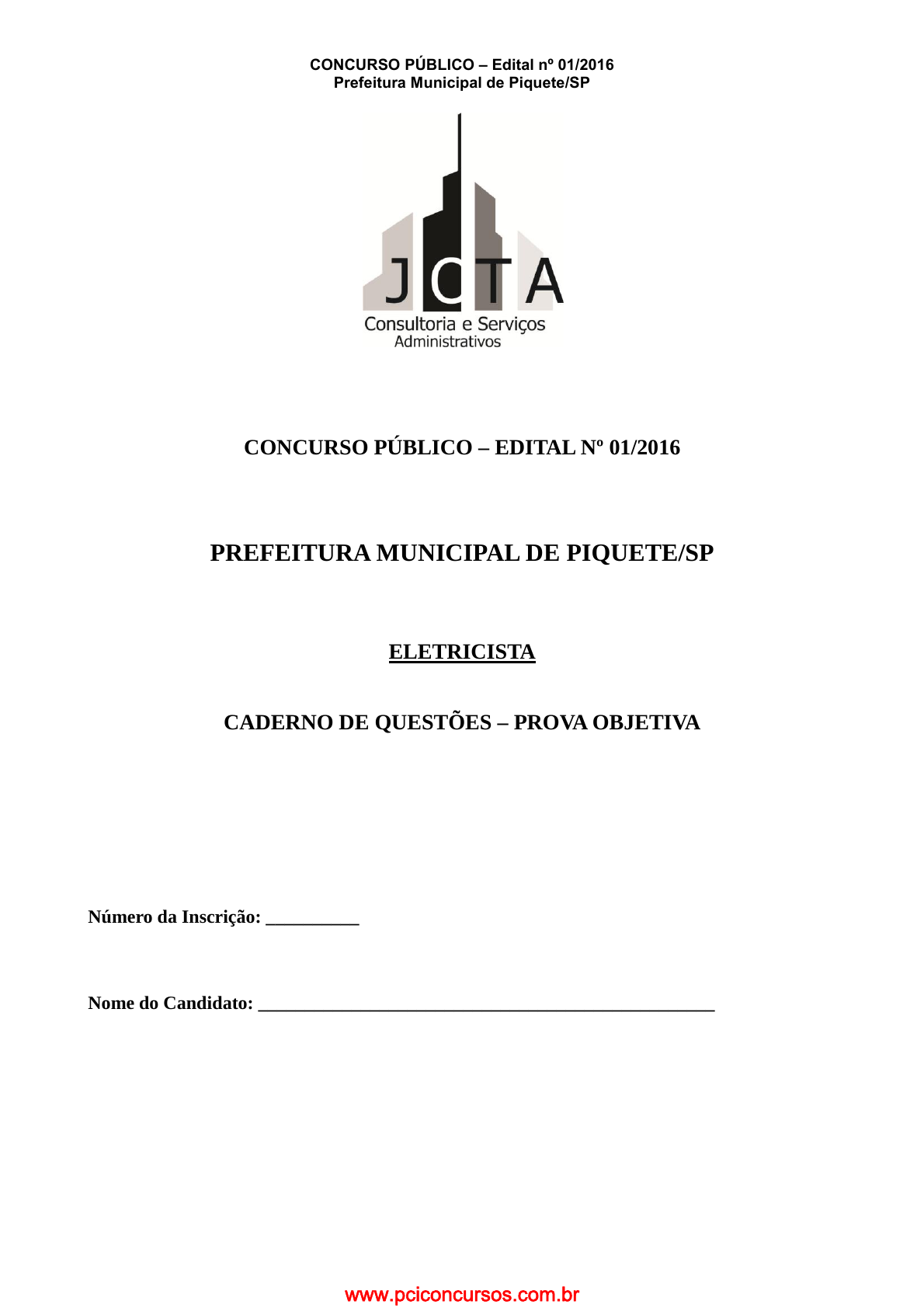 pcimarkpci MDAwMDowMDAwOjAwMDA6MDAwMDowMDAwOmZmZmY6MzZlOTpjMjU5:V2VkLCAxNSBTZXAgMjAyMSAwOToyODoyMCAtMDMwMA== CONCURSO PÚBLICO – Edital nº 01/2016 Prefeitura Municipal de Piquete/SP CONCURSO PÚBLICO – EDITAL Nº 01/2016 PREFEITURA MUNICIPAL DE PIQUETE/SP ELETRICISTA CADERNO DE QUESTÕES – PROVA OBJETIVA Número da Inscrição: __________ Nome do Candidato: _________________________________________________ www.pciconcursos.com.br pcimarkpci MDAwMDowMDAwOjAwMDA6MDAwMDowMDAwOmZmZmY6MzZlOTpjMjU5:V2VkLCAxNSBTZXAgMjAyMSAwOToyODoyMCAtMDMwMA== CONCURSO PÚBLICO – Edital nº 01/2016 Prefeitura Municipal de Piquete/SP Cargo: Eletricista Língua Portuguesa 1- Segundo a nova ortografia, está incorreto: a) Magoo. b) Zoo. c) Jiboia. d) Colmeia. e) Anti-ético. 2- A palavra cognata é: a) Casa. b) Flor. c) Florzinha. d) Livro. e) Couve-flor. 3- “Naquela noite, lembrei-me das boas horas.” O núcleo do adjunto adverbial é: a) Naquela. b) Noite. c) Lembrei-me. d) Boas. e) Horas. 4- “Transmiti-lhe o recado.” O pronome lhe tem a função sintática de: a) Adjunto adnominal. b) Sujeito. c) Objeto indireto. d) Complemento nominal. e) Objeto direto. 5- “O sol talvez continue brilhando mais um tempo.” O advérbio exprime a circunstância de: a) Lugar. b) Dúvida. c) Negação. d) Tempo. e) Afirmação. 6- “Comentaram a respeito da greve.” O sujeito é: a) Indeterminado. b) Desinencial. c) Composto. d) Inexistente. e) Oracional. 7- “Os esportistas assistiram ao jogo nervosos.” O predicativo do sujeito é: a) Os esportistas. b) Assistiram. c) Ao. d) Jogo. e) Nervosos. 8- “Lá se vai mais um político corrupto!” O “se” exerce a função de: a) Índice de indeterminação do sujeito. b) Pronome apassivador. c) Pronome reflexivo. d) Parte integrante do verbo. e) Partícula expletiva. 9- “Tenho medo de que você use calças rasgadas.” A oração é substantiva: a) Subjetiva. b) Objetiva direta. c) Objetiva indireta. d) Predicativa. e) Completiva nominal. 10- Não deve haver crase em: a) Deu presentes à dona Joana. b) Jonas vive à custa da mãe. c) Sairá pontualmente à uma hora. d) Não dei crédito àquilo. e) O barco estava à distância. 11- Há erro de ortografia em: a) Náusea, lousa. b) Caridosa, submissão. c) Cessão, permissão. d) Excursão, repulssão. e) Retenção, abstenção. 12- “Aquele jovem era terrivelmente insolente.” O sinônimo da palavra grifada é: a) Bondoso. b) Pervertido. c) Corrupto. d) Nervoso. e) Atrevido. Matemática 13- A figura abaixo, é a planificação de uma caixa plástica sem tampa. Para que a capacidade dessa caixa seja de 192 litros, o valor de x em centímetros é de: a) 30cm b) 70cm c) 50cm d) 80cm e) 60cm 14- A tabela abaixo mostra o número de Vitórias ( V ) , Empates ( E ) e Derrotas ( D ) de um time de Futebol em 40 partidas disputadas . Com base na tabela, o número de vitórias , empates e derrotas desse time, é respectivamente de : a) 18 V , 18 E , 4 D b) 14 V , 14 E , 12 D c) 16 V , 16 E , 8 D d) 15 V , 15 E , 10 D www.pciconcursos.com.br pcimarkpci MDAwMDowMDAwOjAwMDA6MDAwMDowMDAwOmZmZmY6MzZlOTpjMjU5:V2VkLCAxNSBTZXAgMjAyMSAwOToyODoyMCAtMDMwMA== CONCURSO PÚBLICO – Edital nº 01/2016 Prefeitura Municipal de Piquete/SP e) 15 V , 14 E , 11 D 15- Para vencer um jogo de dados, Fernanda deveria, ao lançar um dado, obter um número ímpar. A chance de Fernanda vencer esse jogo é de: a) 2/3 b) 1/2 c) 3/4 d) 1/3 e) Ela não tem chance de ganhar esse jogo. 16- Das afirmativas abaixo, assinale a que está incorreta: a) O conjunto dos números racionais contém os números inteiros relativos. b) Todo número natural é real . c) O conjunto dos números reais contém os números racionais e os irracionais. d) O conjunto dos números racionais está contido no conjunto dos números inteiros relativos. e) Nem todo número real é um número inteiro. 17- Uma criança resolveu confeccionar um envelope utilizando para isso dois retângulos e um triangulo retângulo. As figuras l e ll , mostram, respectivamente, esse envelope fechado e totalmente aberto. De acordo com as figuras , pode –se dizer que a quantidade de papel mínima utilizada em um envelope , em cm², será de : a) 416 cm² b) 510 cm² c) 474 cm² d) 546 cm² e) 364 cm² 18- Um copo tem 12 cm de altura e dentro dele há um canudinho. O canudinho forma com o fundo do copo um ângulo de 53°. Sabendo que 6 cm do canudinho estão fora do copo e dados : sen53° = 0,79; cós 53° = 0,60 e tg 53° = 1,32, o comprimento desse canudinho é de aproximadamente : a) 21 cm b) 24 cm c) 19 cm d) 25 cm e) 18 cm 19- Um corpo em queda livre percorreu 3m, no primeiro segundo, 12m no segundo, 21m no terceiro e, assim por diante .Após 10 segundos esse corpo terá percorrido: a) 658 metros b) 395 metros c) 282 metros d) 546 metros e) 435 metros 20- Sabe-se que o custo C para produzir X unidades de certo produto é dado por: C= x² - 80x + 3.000. Nesse caso, a quantidade de unidades para que o custo seja mínimo é de: a) 30 b) 40 c) 25 d) 50 e) 35 21- Uma classe tem 17 rapazes e 15 moças.Pretende- se fazer comissões de 3 alunos, escolhidos por acaso, para representar a classe perante a diretoria do colégio. O números de comissões que podem ser formadas é de : a) 4.960 b) 12.600 c) 3.840 d) 9.720 e) 3.870 22- O número real m, de modo que o par ordenado ( m , 2m + 1 ) seja solução da equação : 3x – 11y = 4 é igual a : a) m = 3 b) m = 7/9 c) m = - 12 d) m = - 15/19 e) m = - 9/13 23- Em uma residência a conta de luz baixou de R$54,00 para R$48,00 em um mês . A variação percentual do valor da conta é de: a) maior que 12% b) 8% c) Aproximadamente 11% d) Menor que 10% e) Nenhuma das alternativas está correta. 24- Uma fábrica funcionando 8 horas por dia, produz 75 toneladas de certo produto em 9 dias. O tempo que deve ser prorrogado o trabalho diário para que a mesma fábrica produza 65 toneladas do mesmo produto em 6 dias é de : a) 1 hora e quarenta e cinco minutos. b