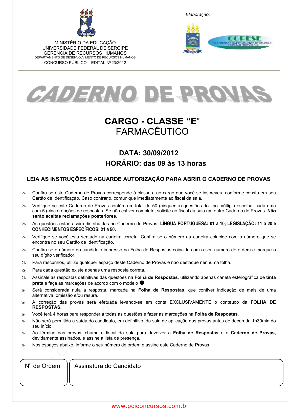 pcimarkpci MDAwMDowMDAwOjAwMDA6MDAwMDowMDAwOmZmZmY6MzZlOTpjMjU5:VGh1LCAxNiBTZXAgMjAyMSAwMTo0NTozMSAtMDMwMA== DATA: 30/09/2012 HORÁRIO: das 09 às 13 horas LEIA AS INSTRUÇÕES E AGUARDE AUTORIZAÇÃO PARA ABRIR O CADERNO DE PROVAS B Confira se este Caderno de Provas corresponde à classe e ao cargo que você se inscreveu, conforme consta em seu Cartão de Identificação. Caso contrário, comunique imediatamente ao fiscal da sala. B Verifique se este Caderno de Provas contém um total de 50 (cinquenta) questões do tipo múltipla escolha, cada uma com 5 (cinco) opções de respostas. Se não estiver completo, solicite ao fiscal da sala um outro Caderno de Provas. Não serão aceitas reclamações posteriores . B As questões estão assim distribuídas no Caderno de Provas: LÍNGUA PORTUGUESA: 01 a 10; LEGISLAÇÃO: 11 a 20 e CONHECIMENTOS ESPECÍFICOS: 21 a 50. B Verifique se você está sentado na carteira correta. Confira se o número da carteira coincide com o número que se encontra no seu Cartão de Identificação. B Confira se o número do candidato impresso na Folha de Respostas coincide com o seu número de ordem e marque o seu dígito verificador. B Para rascunhos, utilize qualquer espaço deste Caderno de Provas e não destaque nenhuma folha. B Para cada questão existe apenas uma resposta correta. B Assinale as respostas definitivas das questões na Folha de Respostas , utilizando apenas caneta esferográfica de tinta preta e faça as marcações de acordo com o modelo . B Será considerada nula a resposta, marcada na Folha de Respostas , que contiver indicação de mais de uma alternativa, omissão e/ou rasura. B A correção das provas será efetuada levando-se em conta EXCLUSIVAMENTE o conteúdo da FOLHA DE RESPOSTAS. B Você terá 4 horas para responder a todas as questões e fazer as marcações na Folha de Respostas . B Não será permitida a saída do candidato, em definitivo, da sala de aplicação das provas antes de decorrida 1h30min do seu início. B Ao término das provas, chame o fiscal da sala para devolver a Folha de Respostas e o Caderno de Provas, devidamente assinados, e assine a lista de presença. B Nos espaços abaixo, informe o seu número de ordem e assine este Caderno de Provas. Elaboração: MINISTÉRIO DA EDUCAÇÃO UNIVERSIDADE FEDERAL DE SERGIPE GERÊNCIA DE RECURSOS HUMANOS DEPARTAMENTO DE DESENVOLVIMENTO DE RECURSOS HUMANOS CONCURSO PÚBLICO – EDITAL No 23/2012 No de Ordem Assinatura do Candidato CARGO - CLASSE “E ” FARMACÊUTICO www.pciconcursos.com.br www.pciconcursos.com.br pcimarkpci MDAwMDowMDAwOjAwMDA6MDAwMDowMDAwOmZmZmY6MzZlOTpjMjU5:VGh1LCAxNiBTZXAgMjAyMSAwMTo0NTozMSAtMDMwMA== Concurso Público Téc-Administrativo – Edital 23/2012 (UFS) – Cargo: - Farmacêutico 2 | P á g i n a Com base na leitura do texto que se segue, responda às questões de 01 a 08. Nem tudo por dinheiro 01 02 03 04 05 06 07 08 09 10 11 12 13 14 15 16 17 18 19 20 21 22 23 24 25 26 27 28 29 30 31 32 33 Por que aquele casal de moradores de rua de São Paulo devolveu os R$ 20 mil que encontrou na rua? Tenho me perguntado. Até fiz rápida enquete entre aqueles com quem convivo. Se você fosse morador de rua, devolveria o dinheiro confortavelmente acondicionado num saco plástico? Na pesquisa vapt-vupt, a devolução da grana venceu por larga maioria de votos. Mas eu, além de vencida, continuei inconformada: como dois pobres moradores de um viaduto da cidade de São Paulo recusaram a sorte e procuraram a polícia para devolver o dinheiro? Achado não é roubado, oras bolas. Vinte mil reais para eles é uma pequena fortuna. É a loteria que poderia lhes assegurar um período de boa comida, boas roupas e um teto, ou até, se assim decidissem, a possibilidade de recomeçar uma vida cidadã. Tentei me colocar no lugar dos dois – exercício de alteridade que não me levará muito longe. Só sabemos do que somos capazes na hora do pega pra capar. Não adianta arrotar regras. É só quando o Titanic começa a afundar é que nos confrontamos com o heroísmo ou a covardia de nós mesmos. Mas ainda assim me arrisquei, e concluí sem nenhuma dificuldade: Eu não devolveria o dinheiro, de jeito e maneira. Mudaria de viaduto, de bairro, de cidade, mas iria desfrutar de algum conforto por dias ou meses que fosse. E, antes que um leitor mais ofendido me acuse de desonestidade, informo-lhe que me considero uma das pessoas mais honestas que conheço, dentro das regras que a lei e o convívio social me impõem. Nem precisava tanto. O que não me imuniza das tentações – cada Titanic é um Titanic. Continuei acompanhando as entrevistas de Rejaniel de Jesus Silva Santos e de sua mulher, Sandra Regina Domingues, tentando decifrar as razões que os teriam levado a devolver o dinheiro. Ouço Rejaniel dizer aos jornalistas, ao lado dos policiais, que a primeira coisa que lhe veio à cabeça foi avisar a polícia. Está aí um motivo razoável para a devolução: o medo de ser pego com a grana, espancado e levado para o fundo da cadeia. Aos olhos da polícia e de muita gente que se considera de bem, morador de rua é um arremedo de ser humano. Havia mais um motivo: Rejaniel queria que a mãe se orgulhasse de seu gesto. “A minha mãe me ensinou que não devo roubar e, se vir alguém roubando, devo avisar à polícia. Se ela me assistir pela TV lá no Maranhão vai ver que o filho dela ainda é uma das pessoas mais honestas deste mundo.” Aos poucos, fui entendendo as razões do casal. Rejaniel tem um valor supremo, que nenhuma imprevidência conseguiu lhe tirar: o amor à mãe e o desejo de que ela reconheça nele o filho que ela teve e criou. Desde que devolveram o dinheiro, o casal tem sido tratado como gente. Almoços, lugar para dormir, entrevistas. Seria a soma desses valores e vantagens, a proteção da polícia, a admiração dos cidadãos, o amor à mãe, maior do que a pequena fortuna de R$ 20 mil? Talvez seja. Mas eu não me conformo. FREITAS, Conceição. CORREIO BRA