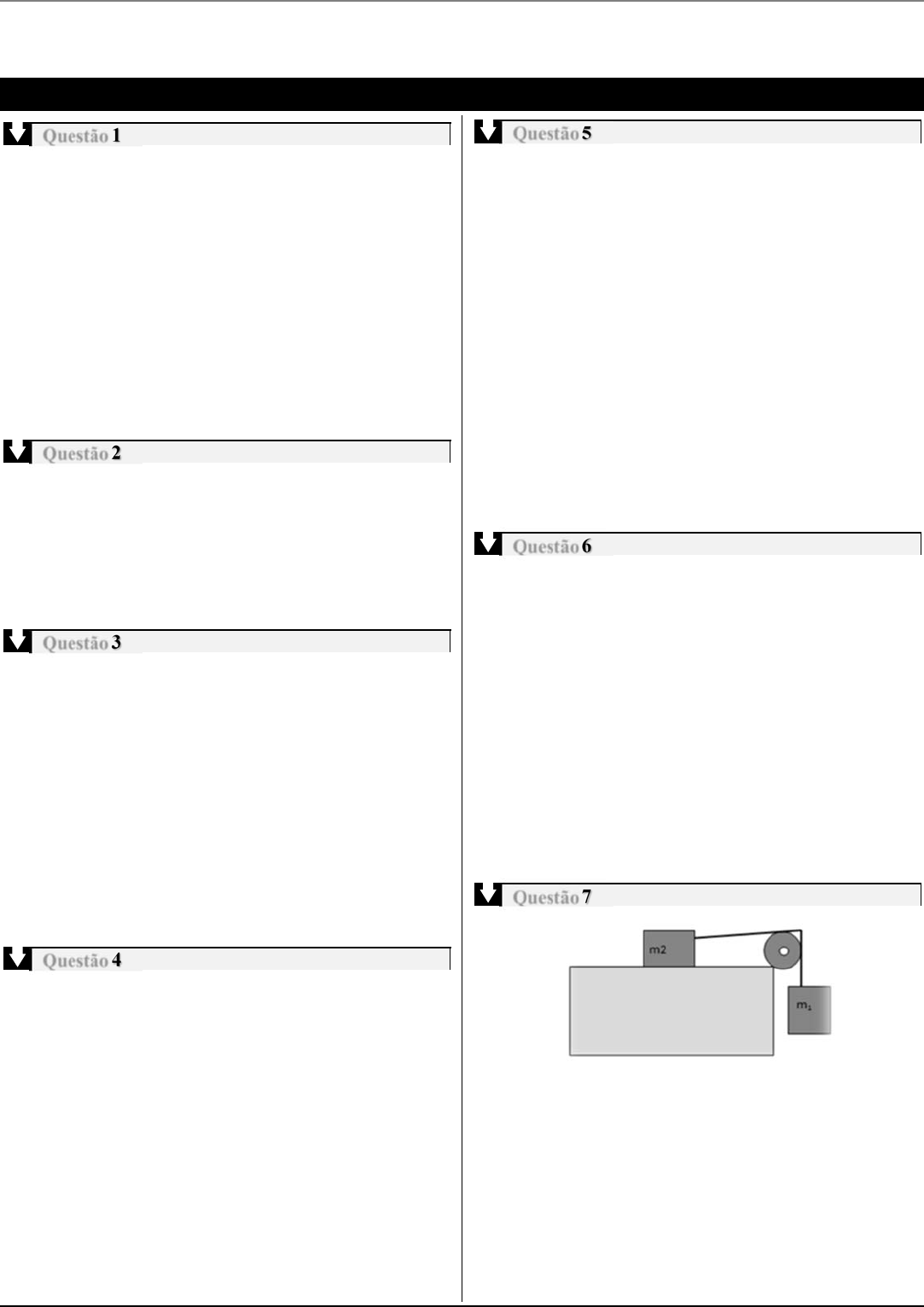 CEBRASPE – SEED/PARANÁ – Edital: 2020 FÍSICA -- CONHECIMENTOS ESPECÍFICOS -- Questão 1 No dia 5/5/2018, quando a sonda Insight, da NASA, decolou para Marte, o peso de seus instrumentos de medição era de 500 N. No pouso da sonda no planeta Marte, esses mesmos instrumentos pesavam 185 N. Com relação a essa situação, e considerando que a intensidade da gravidade na Terra seja de 10 N/kg, assinale a opção correta. A A massa dos instrumentos de medição da sonda é 50 kg na Terra e em Marte. B Em Marte, a intensidade da gravidade é de 10 N/kg. C A massa dos instrumentos de medição da sonda é 50 kg apenas na Terra. D A massa dos instrumentos de medição da sonda é 50 kg apenas em Marte. E Em Marte, a intensidade da gravidade é de 4,7 N/kg. Questão 2 O movimento de um objeto é caracterizado A somente pela sua trajetória. B pela sua trajetória e pelo valor da sua velocidade. C pela sua trajetória e pela evolução da sua velocidade ao longo do tempo. D unicamente pela evolução da sua velocidade ao longo do tempo. E somente pela sua velocidade. Questão 3 A corrida é uma excelente atividade física: ajuda a melhorar a concentração, acalma a mente e diminui o estresse, além de liberar no cérebro os hormônios endorfina e dopamina. O etíope Haile Gebrselassie, um dos maiores maratonistas da história, obteve um recorde mundial na maratona de Berlim, em 2008, com o tempo de 2 h 3 min 59 s. Considerando que, nessa situação, o percurso da maratona tenha sido de 42,195 km, assinale a opção que apresenta o valor mais próximo da velocidade média desse atleta na corrida de Berlim. A 2,7 m/s B 4,7 m/s C 5,7 m/s D 6,7 m/s E 9,7 m/s Questão 4 Um automóvel que trafegava com velocidade constante de 40 m/s aproximava-se de um cruzamento onde havia um semáforo com radar. Quando ele estava a 40 m do cruzamento, o sinal mudou de verde para amarelo. O motorista do automóvel, sabendo que o sinal permaneceria amarelo por 2 s, decidiu acelerar o carro e passar pelo cruzamento antes de o sinal mudar para vermelho. O tempo decorrido entre o momento em que o motorista viu a mudança de sinal e o momento em que ele decidiu acelerar o carro foi de 1 s. Nesse caso, a menor aceleração constante necessária para que o carro passasse pelo cruzamento sem acionar o radar era de A 2 m/s2. B 4 m/s2. C 8 m/s2. D 10 m/s2. E 12 m/s2. Questão 5 Um corpo de massa igual a 240 g está pendurado em um dinamômetro de mola. A extensão da mola é de 4 cm quando o corpo está no ar. Acerca dessa situação, julgue os seguintes itens, considerando a aceleração local da gravidade de 10 N/kg. I De acordo com a lei de Hooke, a constante da mola tem valor inferior a 50 N. II A tensão da mola é igual a 2,4 N. III O peso do corpo é de 5 N. Assinale a opção correta. A Apenas o item I está certo. B Apenas o item II está certo. C Apenas os itens I e III estão certos. D Apenas os itens II e III estão certos. E Todos os itens estão certos. Questão 6 Assinale a opção correta, segundo as leis da cinemática. A O movimento de um ponto é retilíneo, em dado referencial, se, para cada instante, o vetor velocidade tiver direção constante e a trajetória for uma reta. B Em um movimento retilíneo uniforme, o vetor posição s é representado, ao longo do tempo t, por uma função do tipo s(t) = v0 t 2 + v0t + s0, em que v0 é a velocidade inicial e s0 é uma constante. C Um movimento é denominado circular uniforme quando o módulo da velocidade e da direção são constantes. D Um móvel realiza um movimento retilíneo uniformemente variado quando se descola em linha reta com aceleração crescente. E Em um movimento circular não uniforme, a aceleração tangencial é igual a zero. Questão 7 A figura precedente ilustra dois blocos que estão conectados por um cabo sem massa. A superfície horizontal não tem atrito. Se a massa do bloco suspenso é m1 = 2 kg, então a aceleração do sistema terá um módulo de 4 m/s2 quando a massa de m2 for igual a A 5,0 kg. B 4,5 kg. C 4,0 kg. D 3,0 kg. E 2,7 kg. CEBRASPE – SEED/PARANÁ – Edital: 2020 Questão 8 O Mont Blanc e o Le Gran Paradis são as montanhas mais altas da Europa: o pico da primeira está a 4.810 km acima do nível do mar, enquanto que o da segunda está a 4.061 km acima do nível do mar. Considerando-se essas informações e a hipótese de que um alpinista com massa de 80 kg tenha escalado as duas montanhas, é correto afirmar que, quando ele esteve no cume do Le Gran Paradis e quando esteve no cume do Mont Blanc, as suas energias potenciais gravitacionais em relação ao nível do mar eram de, respectivamente, A 3,2 × 106 J e 3,8 × 106 J. B 1,6 × 106 J e 2,5 × 106J. C 4,5 × 105 J e 6 × 105 J. D 3,8 × 106 J e 3,2 × 106 J. E 6 × 105 J e 4,5 × 105 J. Questão 9 Dois objetos pontuais, A e B, estão em uma mesma altitude, interagindo com a Terra. As velocidades de A e de B estão relacionadas por vA = 2vB, e suas massas, por mB = 4mA. Considerando essa situação hipotética, assinale a opção que apresenta as relações corretas entre as energias cinética (Ec), potencial (EP) e mecânica (Em) desses objetos. A Ec (B) = Ec (A); EP(B) = EP(A); Em(B) = Em(A) B Ec (B) = Ec (A); EP(B) = 4EP(A); Em(B) > Em(A) C Ec (B) > Ec (A); EP(B) = 2EP(A); Em(B) < Em(A) D Ec (B) < Ec (A); EP(B) = 8EP(A); Em(B) = Em(A) E Ec (B) = 2Ec (A); EP(B) = 4EP(A); Em(B) > Em(A) Questão 10 Acerca dos conceitos de quantidade de movimento, impulso e colisões, assinale a opção correta. A Em um choque inelástico, nem a energia nem o momento são conservados. B Durante um choque elástico de uma bola não deformável caindo verticalmente na superfície da Terra (também assumida como não deformável), o momento total não é conservado, senão a Terra seria ligeiramente desviada. C Na colisão perfeitamente inelástica, acontece a maior perda de energia cinética e, após o choque, os corpos se separam. D O impulso pode ser calculado determinando-se 