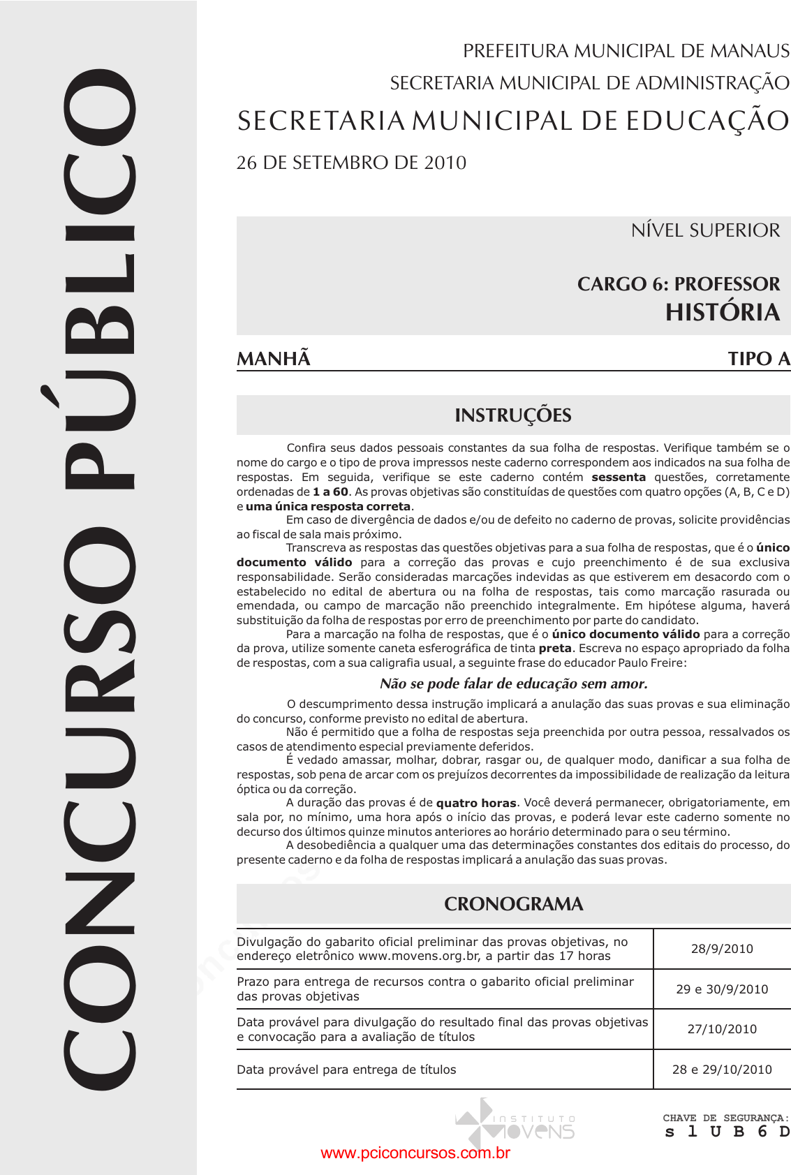pcimarkpci MDAwMDowMDAwOjAwMDA6MDAwMDowMDAwOmZmZmY6MzZlOTpjMjU5:U3VuLCAxMiBTZXAgMjAyMSAxMDoyNTo0NiAtMDMwMA== NÍVEL SUPERIOR CARGO 6: PROFESSOR HISTÓRIA CHAVE DE SEGURANÇA: s l U B 6 D www.pciconcursos.com.br pcimarkpci MDAwMDowMDAwOjAwMDA6MDAwMDowMDAwOmZmZmY6MzZlOTpjMjU5:U3VuLCAxMiBTZXAgMjAyMSAxMDoyNTo0NiAtMDMwMA== Concurso Público da Prefeitura Municipal de Manaus - PMM 2 CARGO 6: PROFESSOR – ESPECIALIDADE: HISTÓRIAs l U B 6 D U t i l i z e e s t e e s p a ç o p a r a r a s c u n h o . www.pciconcursos.com.br pcimarkpci MDAwMDowMDAwOjAwMDA6MDAwMDowMDAwOmZmZmY6MzZlOTpjMjU5:U3VuLCAxMiBTZXAgMjAyMSAxMDoyNTo0NiAtMDMwMA== Concurso Público da Prefeitura Municipal de Manaus - PMM 3 CARGO 6: PROFESSOR – ESPECIALIDADE: HISTÓRIAs l U B 6 D CONHECIMENTOS BÁSICOS Leia o texto abaixo para responder às questões 1 e 2. Educação do olhar Educar é mostrar a vida a quem ainda não a viu. O educador diz: “Veja!” – e, ao falar, aponta. O aluno olha na direção apontada e vê o que nunca viu. Seu mundo se expande. Ele fica mais rico interiormente. E, ficando mais rico interiormente, ele pode sentir mais alegria e dar mais alegria – que é a razão pela qual vivemos. Já li muitos livros sobre psicologia da educação, sociologia da educação, filosofia da educação – mas, por mais que me esforce, não consigo me lembrar de qualquer referência à educação do olhar ou à importância do olhar na educação, em qualquer deles. A primeira tarefa da educação é ensinar a ver. É através dos olhos que as crianças tomam contato com a beleza e o fascínio do mundo. Os olhos têm de ser educados para que nossa alegria aumente. Quero ensinar as crianças. Elas ainda têm olhos encantados. Seus olhos são dotados daquela qualidade que, para os gregos, era o início do pensamento: a capacidade de se assombrar diante do banal. Para as crianças, tudo é espantoso: um ovo, uma minhoca, uma concha de caramujo, o voo dos urubus, os pulos dos gafanhotos, uma pipa no céu, um pião na terra. Coisas que os eruditos não veem. Na escola eu aprendi complicadas classificações botânicas, taxonomias, nomes latinos – mas esqueci. Mas nenhum professor, jamais, chamou a minha atenção para a beleza de uma árvore ou para o curioso das simetrias das folhas. As palavras só têm sentido se nos ajudam a ver o mundo melhor. Aprendemos palavras para melhorar os olhos. Quando a gente abre os olhos, abrem-se as janelas do corpo, e o mundo aparece refletido dentro da gente. Jardins bonitos há muitos, mas só traz alegria o jardim que nascer dentro da gente. São as crianças que, sem falar, nos ensinam as razões para viver. Elas não têm saberes a transmitir. No entanto, elas sabem o essencial da vida. Quem não muda sua maneira adulta de ver e sentir e não se torna como criança jamais será sábio. Rubem Alves. Internet: www.rubemalves.com.br (com adaptações) QUESTÃO 1 De acordo com as estruturas linguísticas e gramaticais do texto, julgue os itens abaixo como Verdadeiros (V) ou Falsos (F) e, em seguida, assinale a opção correta. I – A forma verbal “traz” (linha 32) pode ser substituída por trazem, já que, neste caso, é permitida a concordância com “Jardins bonitos” (linha 32). II – As palavras “Educar” (linha 1) e “educador” (linha 2) pertencem à mesma classe de palavras, ou seja, são verbos no infinitivo. III – A palavra “saberes” (linha 34) está empregada no texto com o sentido de conhecimento. IV – Em suas duas ocorrências, o pronome “ele” (linhas 4 e 5) tem como referente “aluno” (linha 2) e, não, “mundo” (linha 3). V – A oração “abrem-se as janelas do corpo” (linhas 30 e 31) está na voz passiva sintética, justificada pela presença de um verbo transitivo direto na terceira pessoa do plural acompanhado de um pronome apassivador. A sequência correta é: (A) F, F, V, V, V. (B) V, F, F, F, F. (C) V, F, V, F, V. (D) F, V, F, V, F. QUESTÃO 2 Acerca das ideias apresentadas no texto, julgue os itens abaixo e, em seguida, assinale a opção correta. I – O autor faz reflexões a respeito de uma educação voltada para a capacidade de se enxergar sob ângulos e referenciais diferentes, enfoques sob os quais a maioria das pessoas ainda não está habituada. II – Infere-se do quarto parágrafo que as crianças possuem mais subjetividade, poesia e alegria na forma de olhar do que os adultos. III – Educar, na visão do autor, é encarar o processo de ensinar e de aprender com a desconstrução do olhar engessado sobre tudo. IV – Ao mencionar que as crianças “ainda têm olhos encantados” (linhas 16 e 17), infere-se que ela é desperta para o imaginário e o poético, viaja através das palavras e é capaz de se surpreender com coisas simples. A quantidade de itens certos é igual a (A) 1. (B) 2. (C) 3. (D) 4. ____________________________________________ Leia o texto abaixo para responder às questões de 3 a 5. A palavra “professor” deriva da palavra “professar”, que, além de lecionar, significa “declarar publicamente uma convicção ou um compromisso de conduta”. Não por acaso, as duas têm a mesma raiz. Nós, mestres, somos profissionais em vários sentidos: por ensinarmos e por nos comprometermos com condutas de trabalho – em uma atividade que exige a contínua exposição de convicções. Essa condição também envolve responsabilidades múltiplas, com conhecimentos e procedimentos, especialmente por lidarmos com muitos jovens e crianças e por um tempo longo. Precisamos nos lembrar disso, não para nos sentirmos mais importantes do que já somos, mas para termos consciência de que, no desempenho dessa função social, não dá para ignorar limitações pessoais e problemas, ou seja, nossa condição humana. As responsabilidades de educador, ainda mais complexas, são cumpridas em circunstâncias muito especiais, sob permanente exposição a dezenas de olhares daqueles que pretendemos formar. Aliás, os