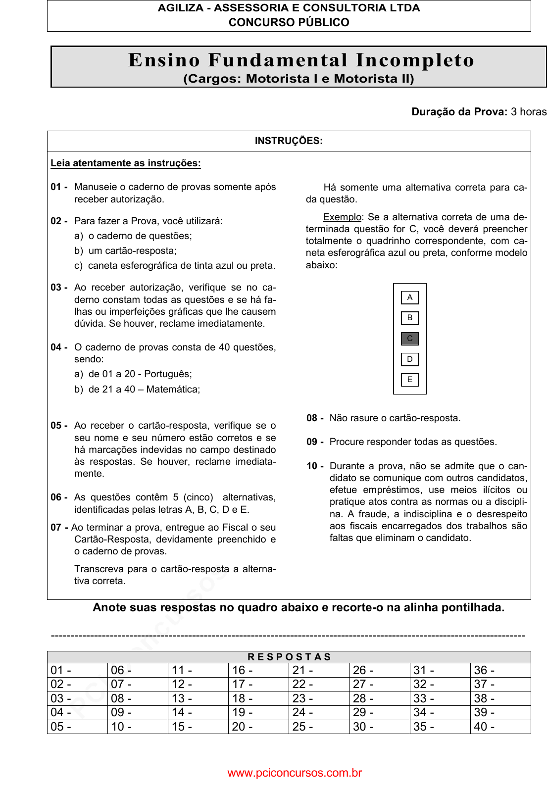 pcimarkpci MDAwMDowMDAwOjAwMDA6MDAwMDowMDAwOmZmZmY6MzZlOTpjMjU5:V2VkLCAxNSBTZXAgMjAyMSAwMTo0MTowNCAtMDMwMA== AGILIZA - ASSESSORIA E CONSULTORIA LTDA CONCURSO PÚBLICO Ensino Fundamental Incompleto (Cargos: Motorista I e Motorista II) Duração da Prova: 3 horas INSTRUÇÕES: Leia atentamente as instruções: 01 - Manuseie o caderno de provas somente após receber autorização. 02 - Para fazer a Prova, você utilizará: a) o caderno de questões; b) um cartão-resposta; c) caneta esferográfica de tinta azul ou preta. 03 - Ao receber autorização, verifique se no ca- derno constam todas as questões e se há fa- lhas ou imperfeições gráficas que lhe causem dúvida. Se houver, reclame imediatamente. 04 - O caderno de provas consta de 40 questões, sendo: a) de 01 a 20 - Português; b) de 21 a 40 – Matemática; 05 - Ao receber o cartão-resposta, verifique se o seu nome e seu número estão corretos e se há marcações indevidas no campo destinado às respostas. Se houver, reclame imediata- mente. 06 - As questões contêm 5 (cinco) alternativas, identificadas pelas letras A, B, C, D e E. 07 - Ao terminar a prova, entregue ao Fiscal o seu Cartão-Resposta, devidamente preenchido e o caderno de provas. Transcreva para o cartão-resposta a alterna- tiva correta. Há somente uma alternativa correta para ca- da questão. Exemplo: Se a alternativa correta de uma de- terminada questão for C, você deverá preencher totalmente o quadrinho correspondente, com ca- neta esferográfica azul ou preta, conforme modelo abaixo: A B C D E 08 - Não rasure o cartão-resposta. 09 - Procure responder todas as questões. 10 - Durante a prova, não se admite que o can- didato se comunique com outros candidatos, efetue empréstimos, use meios ilícitos ou pratique atos contra as normas ou a discipli- na. A fraude, a indisciplina e o desrespeito aos fiscais encarregados dos trabalhos são faltas que eliminam o candidato. Anote suas respostas no quadro abaixo e recorte-o na alinha pontilhada. ------------------------------------------------------------------------------------------------------------------------- R E S P O S T A S 01 - 06 - 11 - 16 - 21 - 26 - 31 - 36 - 02 - 07 - 12 - 17 - 22 - 27 - 32 - 37 - 03 - 08 - 13 - 18 - 23 - 28 - 33 - 38 - 04 - 09 - 14 - 19 - 24 - 29 - 34 - 39 - 05 - 10 - 15 - 20 - 25 - 30 - 35 - 40 - www.pciconcursos.com.br pcimarkpci MDAwMDowMDAwOjAwMDA6MDAwMDowMDAwOmZmZmY6MzZlOTpjMjU5:V2VkLCAxNSBTZXAgMjAyMSAwMTo0MTowNCAtMDMwMA== www.pciconcursos.com.br pcimarkpci MDAwMDowMDAwOjAwMDA6MDAwMDowMDAwOmZmZmY6MzZlOTpjMjU5:V2VkLCAxNSBTZXAgMjAyMSAwMTo0MTowNCAtMDMwMA== PROVA DE PORTUGUÊS Leia o texto abaixo, para responder as questões que o seguem: Colheita Mãos no bolso e ombros encolhidos, Carlos Teodoro, 12 anos, tosse e sobe a ladeira de terra da Vila Santa Cruz, em Tabatinga, cidade-dormitório de bóias-frias que colhem laran- ja, na região de Araraquara. O menino vai ao centro de saúde. A falta de ar não o deixou dormir. No dia anterior, trabalhou na turma do Cebola, caminhoneiro que empreita mão-de- obra. Colheu 23 caixas, ganhando o equivalente a 12 centavos de dólar em cada uma. Foi sozinho, pois os pais são velhos e doentes. Colhendo em dupla, o trabalho rende mais: um fica no ponteiro; o outro, no barrado, abaixo, com o saco de lona pendurado ao ombro por uma tira. Quando a sacola fica cheia, o colhedor solta o fundo e derrama o conteúdo na caixa para o transporte no caminhão. Sem parceiro, Carlos teve de trabalhar dobrado. “Fiquei suado e depois me molhei, por isso tô com essa tosse.” Se ele não trabalhar, não há como pagar o aluguel, equivalente a 6 dólares, pelo cô- modo de tábuas espaçadas e sem janela. O menino sustenta pai e mãe e mais um sobrinho pequeno. A família vive migrando em busca de vida melhor. “Já passamos por um punhado de cidades. Em Goio-Erê, no Paraná, colhi algodão, já fui até servente de pedreiro.” Em Tabatinga, só existem laranjais, com seu perfume pela manhã ou à noitinha, e a rotina dos colhedores indo e vindo em ônibus velhos e caminhões. Iolanda Huzak e Jô Azevedo. Crianças de fibra. Rio de Janeiro: Paz e Terra, 1994. Questão 01 Assinale a alternativa que indica corretamente, onde se passa o fato do texto que você aca- bou de ler. a) Tabatinga. b) Mato Grosso. c) Goio-Erê. d) Paraná. e) Acre. Questão 02 Assinale a alternativa que indica corretamente, quem é o personagem principal do texto aci- ma. a) Engraxate. b) Jô Azevedo. c) Carlos Teodoro. d) Menino de rua. e) Iolanda Huzak. Questão 03 Assinale a alternativa correta. Podemos afirmar que o fato apresentado no texto acima infere à: a) vida dos trabalhadores rurais, principalmente o trabalho infantil. b) vida dos trabalhadores urbanos, nas indústrias. c) preocupação com a preservação ao meio ambiente. d) excelente qualidade de vida do menino. e) mudança do tempo que, com o sol intenso, prejudicou a colheita. www.pciconcursos.com.br pcimarkpci MDAwMDowMDAwOjAwMDA6MDAwMDowMDAwOmZmZmY6MzZlOTpjMjU5:V2VkLCAxNSBTZXAgMjAyMSAwMTo0MTowNCAtMDMwMA== Questão 04 Na oração: “Fiquei suado e depois me molhei, por isso estou com essa tosse.” Assinale a alternativa que indica corretamente, a classificação dos termos em destaque, na oração acima. a) Adjetivos. b) pronomes pessoais. c) pronomes indefinidos. d) Pronomes possessivos. e) pronomes demonstrativos. Questão 05 Na frase: “O deputado enviou os documentos ao governador.” Assinale a alternativa que indica corretamente, a classificação dos termos em destaque aci- ma. a) Verbo. b) Derivado. c) Objeto Direto d) Objeto Indireto. e) Pronome Possessivo. Questão 06 Na frase; “O rio Amazonas fascina e amedronta quem o vê pela primeira vez.” Assinale a alternativa que indica corretamente, a classificação do termo em destaque acima. a) Verbo. b) Pronome. c) Aposto. d) Derivado. e) Predicado. Questão 07 Na frase: “Brilhavam no céu escuro as primeiras estrelas.” Assinale a alternativa