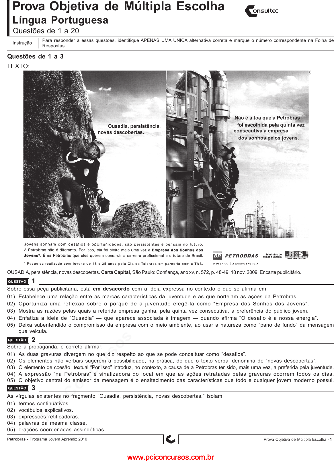 pcimarkpci MDAwMDowMDAwOjAwMDA6MDAwMDowMDAwOmZmZmY6MzZlOTpjMjU5:V2VkLCAxNSBTZXAgMjAyMSAwNDo1Mzo0OCAtMDMwMA== Petrobras - Programa Jovem Aprendiz 2010 1Prova Objetiva de Múltipla Escolha - Prova Objetiva de Múltipla Escolha Língua Portuguesa Para responder a essas questões, identifique APENAS UMA ÚNICA alternativa correta e marque o número correspondente na Folha de Respostas. Questões de 1 a 20 Instrução Questões de 1 a 3 Sobre essa peça publicitária, está em desacordo com a ideia expressa no contexto o que se afirma em 01) Estabelece uma relação entre as marcas características da juventude e as que norteiam as ações da Petrobras. 02) Oportuniza uma reflexão sobre o porquê de a juventude elegê-la como “Empresa dos Sonhos dos Jovens”. 03) Mostra as razões pelas quais a referida empresa ganha, pela quinta vez consecutiva, a preferência do público jovem. 04) Enfatiza a ideia de “Ousadia” — que aparece associada à imagem — quando afirma “O desafio é a nossa energia”. 05) Deixa subentendido o compromisso da empresa com o meio ambiente, ao usar a natureza como “pano de fundo” da mensagem que veicula. Sobre a propaganda, é correto afirmar: 01) As duas gravuras divergem no que diz respeito ao que se pode conceituar como “desafios”. 02) Os elementos não verbais sugerem a possibilidade, na prática, do que o texto verbal denomina de “novas descobertas”. 03) O elemento de coesão textual “Por isso” introduz, no contexto, a causa de a Petrobras ter sido, mais uma vez, a preferida pela juventude. 04) A expressão “na Petrobras” é sinalizadora do local em que as ações retratadas pelas gravuras ocorrem todos os dias. 05) O objetivo central do emissor da mensagem é o enaltecimento das características que todo e qualquer jovem moderno possui. As vírgulas existentes no fragmento “Ousadia, persistência, novas descobertas.” isolam 01) termos continuativos. 02) vocábulos explicativos. 03) expressões retificadoras. 04) palavras da mesma classe. 05) orações coordenadas assindéticas. OUSADIA, persistência, novas descobertas. Carta Capital, São Paulo: Confiança, ano xv, n. 572, p. 48-49, 18 nov. 2009. Encarte publicitário. QUESTÃO 2 QUESTÃO 1 QUESTÃO 3 TEXTO: www.pciconcursos.com.br pcimarkpci MDAwMDowMDAwOjAwMDA6MDAwMDowMDAwOmZmZmY6MzZlOTpjMjU5:V2VkLCAxNSBTZXAgMjAyMSAwNDo1Mzo0OCAtMDMwMA== Petrobras - Programa Jovem Aprendiz 2010 2 QUESTÃO 5 Quanto às características dos jovens citadas nesse texto, a que mantém relação com a ideia expressa por “Ousadia”, no texto anterior, é a que faz alusão ao fato de 01) se acharem originais. 02) confiarem em si mesmos. 03) quererem terminar os estudos. 04) desejarem ter sucesso na carreira. 05) serem hábeis no uso do computador. QUESTÃO 6 Esse texto se estrutura 01) a partir da caracterização física dos jovens. 02) com base no linguajar próprio da juventude atual. 03) através de uma maneira de expressão tipicamente formal. 04) por meio tão-somente do uso de palavras com significação ampla. 05) mediante uma linguagem rica em adjetivação e pontilhada de termos com sentido figurado. QUESTÃO 7 No texto, indica reforço e, por isso, pode sair do contexto, sem causar-lhe nenhuma alteração, o termo destacado no fragmento transcrito em 01) “Eles se acham engraçados e originais.” (l. 1). 02) “Confiam em si mesmos” (l. 1-2). 03) “saem muito com os amigos.” (l. 7). 04) “Usam jeans e camiseta, bem descontraídos” (l. 8-9). 05) “para os quais o comunismo não é mais nem um retrato na parede” (l. 16-17). QUESTÃO 8 A preposição “com” que, no texto, denota companhia é a que inicia o fragmento transcrito em 01) “com uma vida confortável” (l. 5). 02) “com os amigos” (l. 7). 03) “com cabeça para longas reflexões filosóficas” (l. 7-8). 04) “com boas etiquetas” (l. 9). 05) “com todas as diferenças nacionais” (l. 18-19). QUESTÃO 9 O sufixo –inho, indicador do diminutivo da palavra “russinhos” (l. 16), 01) foi usado de modo carinhoso. 02) trata-se de um diminutivo erudito. 03) está empregado com sentido figurado. 04) é uma forma diminutiva sintética irregular. 05) representa a forma analítica da palavra russos. QUESTÃO 10 “numa escala como jamais se viu antes.” (l. 20) Está empregado antes do verbo pela mesma razão que a partícula “se” em negrito, no fragmento em evidência, o pronome que aparece destacado na frase 01) Segundo nos informaram, os jovens, de modo geral, são autoconfiantes. 02) Macacos me mordam se você conseguir ouvir essa pirâmide de CD ainda hoje. 03) “Este é o jovem que a ajudou a atravessar a rua” — disse o senhor ao guarda de trânsito. 04) “Não o vejo há dias, garoto, estava doente?” — perguntou a professora a um de seus alunos. 05) “Nós lhe desobedecíamos, porque ele era bastante implicante com a sala toda — esclareceu o jovem. TEXTO: O planeta teen Eles se acham engraçados e originais. Confiam em si mesmos –– e desconfiam dos políticos até a ponta do cordão cuidadosamente desamarrado do tênis. Querem terminar os estudos, ter sucesso na carreira. O dinheiro não é tudo, 5 mas contam com uma vida confortável, uma boa casa, uma família feliz. Adoram televisão, ouvem pirâmides intermináveis de CD, saem muito com os amigos. Não estão com cabeça para longas reflexões filosóficas. Usam jeans e camiseta, bem descontraídos –– e de preferência com boas etiquetas. 10 Devoram hambúrgueres e dedilham computadores com presteza. Qualquer pessoa pode identificar nessas definições um retrato dos jovens brasileiros que inundam os shoppings e engarrafam o trânsito nas portas dos colégios de classe média –– e estará certa. Jovens brasileiros? Acrescentem-se 15 à lista americanos de todas as origens étnicas e homogêneos tailandeses, argentinos, egípcios e franceses, russinhos para os quais o comunismo não é mais nem um retrato na parede, cor