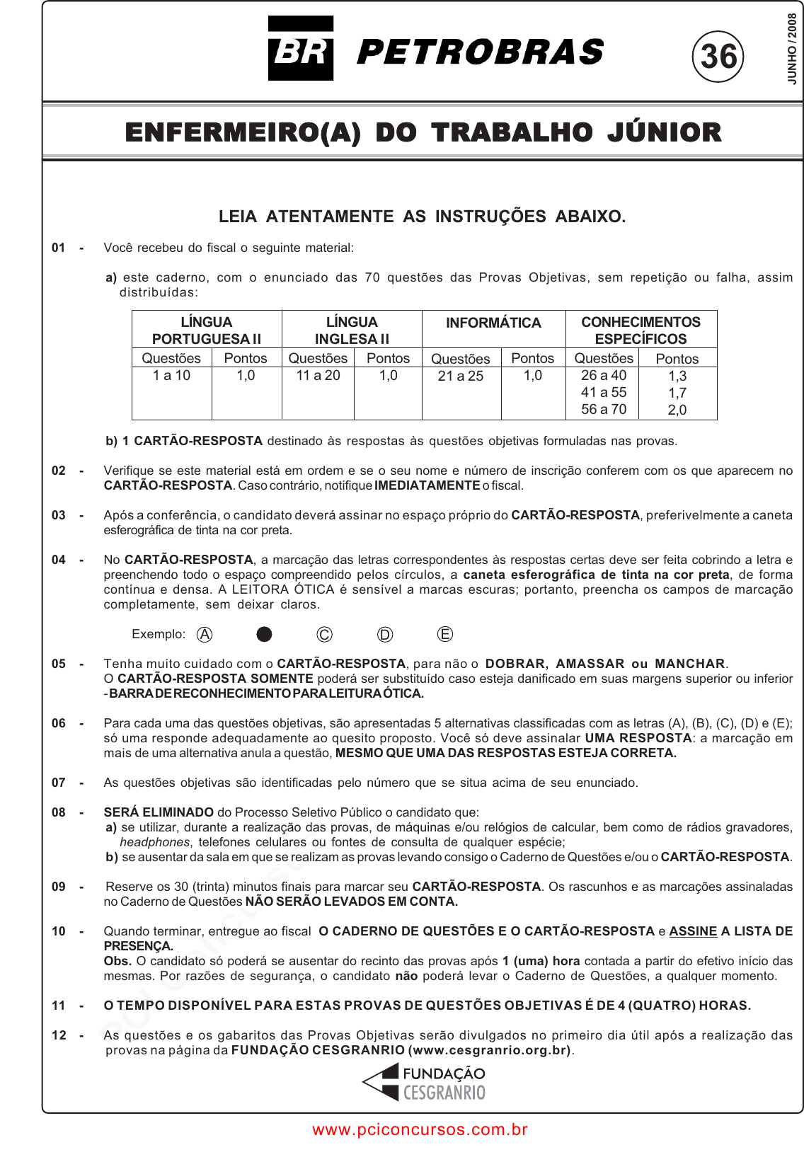 pcimarkpci MDAwMDowMDAwOjAwMDA6MDAwMDowMDAwOmZmZmY6MzZlOTpjMjU5:V2VkLCAxNSBTZXAgMjAyMSAxNDowNjo0NyAtMDMwMA== ENFERMEIRO(A) DO TRABALHO JÚNIORENFERMEIRO(A) DO TRABALHO JÚNIORENFERMEIRO(A) DO TRABALHO JÚNIORENFERMEIRO(A) DO TRABALHO JÚNIORENFERMEIRO(A) DO TRABALHO JÚNIOR JU N H O / 20 08 LEIA ATENTAMENTE AS INSTRUÇÕES ABAIXO. 01 - Você recebeu do fiscal o seguinte material: a) este caderno, com o enunciado das 70 questões das Provas Objetivas, sem repetição ou falha, assim distribuídas: b) 1 CARTÃO-RESPOSTA destinado às respostas às questões objetivas formuladas nas provas. 02 - Verifique se este material está em ordem e se o seu nome e número de inscrição conferem com os que aparecem no CARTÃO-RESPOSTA. Caso contrário, notifique IMEDIATAMENTE o fiscal. 03 - Após a conferência, o candidato deverá assinar no espaço próprio do CARTÃO-RESPOSTA, preferivelmente a caneta esferográfica de tinta na cor preta. 04 - No CARTÃO-RESPOSTA, a marcação das letras correspondentes às respostas certas deve ser feita cobrindo a letra e preenchendo todo o espaço compreendido pelos círculos, a caneta esferográfica de tinta na cor preta, de forma contínua e densa. A LEITORA ÓTICA é sensível a marcas escuras; portanto, preencha os campos de marcação completamente, sem deixar claros. Exemplo: 05 - Tenha muito cuidado com o CARTÃO-RESPOSTA, para não o DOBRAR, AMASSAR ou MANCHAR. O CARTÃO-RESPOSTA SOMENTE poderá ser substituído caso esteja danificado em suas margens superior ou inferior -BARRA DE RECONHECIMENTO PARA LEITURA ÓTICA. 06 - Para cada uma das questões objetivas, são apresentadas 5 alternativas classificadas com as letras (A), (B), (C), (D) e (E); só uma responde adequadamente ao quesito proposto. Você só deve assinalar UMA RESPOSTA: a marcação em mais de uma alternativa anula a questão, MESMO QUE UMA DAS RESPOSTAS ESTEJA CORRETA. 07 - As questões objetivas são identificadas pelo número que se situa acima de seu enunciado. 08 - SERÁ ELIMINADO do Processo Seletivo Público o candidato que: a) se utilizar, durante a realização das provas, de máquinas e/ou relógios de calcular, bem como de rádios gravadores, headphones, telefones celulares ou fontes de consulta de qualquer espécie; b) se ausentar da sala em que se realizam as provas levando consigo o Caderno de Questões e/ou o CARTÃO-RESPOSTA. 09 - Reserve os 30 (trinta) minutos finais para marcar seu CARTÃO-RESPOSTA. Os rascunhos e as marcações assinaladas no Caderno de Questões NÃO SERÃO LEVADOS EM CONTA. 10 - Quando terminar, entregue ao fiscal O CADERNO DE QUESTÕES E O CARTÃO-RESPOSTA e ASSINE A LISTA DE PRESENÇA. Obs. O candidato só poderá se ausentar do recinto das provas após 1 (uma) hora contada a partir do efetivo início das mesmas. Por razões de segurança, o candidato não poderá levar o Caderno de Questões, a qualquer momento. 11 - O TEMPO DISPONÍVEL PARA ESTAS PROVAS DE QUESTÕES OBJETIVAS É DE 4 (QUATRO) HORAS. 12 - As questões e os gabaritos das Provas Objetivas serão divulgados no primeiro dia útil após a realização das provas na página da FUNDAÇÃO CESGRANRIO (www.cesgranrio.org.br). A C D E 36 LÍNGUA PORTUGUESA II Questões 1 a 10 Pontos 1,0 Questões 11 a 20 Pontos 1,0 CONHECIMENTOS ESPECÍFICOS INFORMÁTICA Questões 21 a 25 Pontos 1,0 Questões 26 a 40 41 a 55 56 a 70 Pontos 1,3 1,7 2,0 LÍNGUA INGLESA II www.pciconcursos.com.br pcimarkpci MDAwMDowMDAwOjAwMDA6MDAwMDowMDAwOmZmZmY6MzZlOTpjMjU5:V2VkLCAxNSBTZXAgMjAyMSAxNDowNjo0NyAtMDMwMA== ENFERMEIRO(A) DO TRABALHO JÚNIOR 2 LÍNGUA PORTUGUESA II TEMPO DE ESCOLHER “Um homem não é grande pelo que faz, mas pelo que renuncia.” (Albert Schweitzer) Muitos amigos leitores têm solicitado minha opinião acerca de qual rumo dar às suas carreiras. Alguns apreciam seu trabalho, mas não a empresa onde estão. Outros admiram a estabilidade conquistada, mas não têm qualquer prazer no exercício de suas funções. Uns recebem propostas para mudar de emprego, financeiramente desfavoráveis, porém, desafiadoras. Outros têm diante de si um vasto leque de opções, muitas coisas para fazer, mas não conseguem abraçar tudo. Todas estas pessoas têm algo em comum: a necessidade premente de fazer escolhas. Lembro-me de Clarice Lispector: “Entre o ‘sim’ e o ‘não’, só existe um caminho: escolher.” Acredito que quase todas as pessoas passam ao longo de sua trajetória pelo “dilema da virada”. Um momento especial em que uma decisão clara, específica e irrevogável tem que ser tomada simplesmente porque a vida não pode continuar como está. Algumas pessoas passam por isso aos 15 anos, outras, aos 50. Algumas talvez nunca tomem esta decisão, e outras o façam várias vezes no decorrer de sua existência. Fazer escolhas implica renunciar a alguns desejos para viabilizar outros. Você troca segurança por desafio, dinheiro por satisfação, o pouco certo pelo muito duvidoso. Assim, uma companhia que oferece estabili- dade com apatia pode dar lugar a outra dotada de instabi- lidade com ousadia. Analogamente, a aventura de uma vida de solteiro pode ceder espaço ao conforto de um casamento. PRAZER E VOCAÇÃO Os anos ensinaram-me algumas lições. A primeira delas vem de Leonardo da Vinci, que dizia que “A sabe- doria da vida não está em fazer aquilo que se gosta, mas em gostar daquilo que se faz”. Sempre imaginei que fosse o contrário, porém, refletindo, passei a compreender que quando estimamos aquilo que fazemos, podemos nos sentir completos, satisfeitos e plenos, ao passo que se apenas procurarmos fazer o que gostamos, estaremos sempre numa busca insaciável, porque o que gostamos hoje não será o mesmo que prezaremos amanhã. Todavia, é indiscutivelmente importante aliar prazer às nossas aptidões; encontrar o talento que reside dentro de cada um de nós, ao que chamamos de vocação. Oriunda do latim vocatione e traduzida literalmente por “chamado”, simboliza uma espécie d