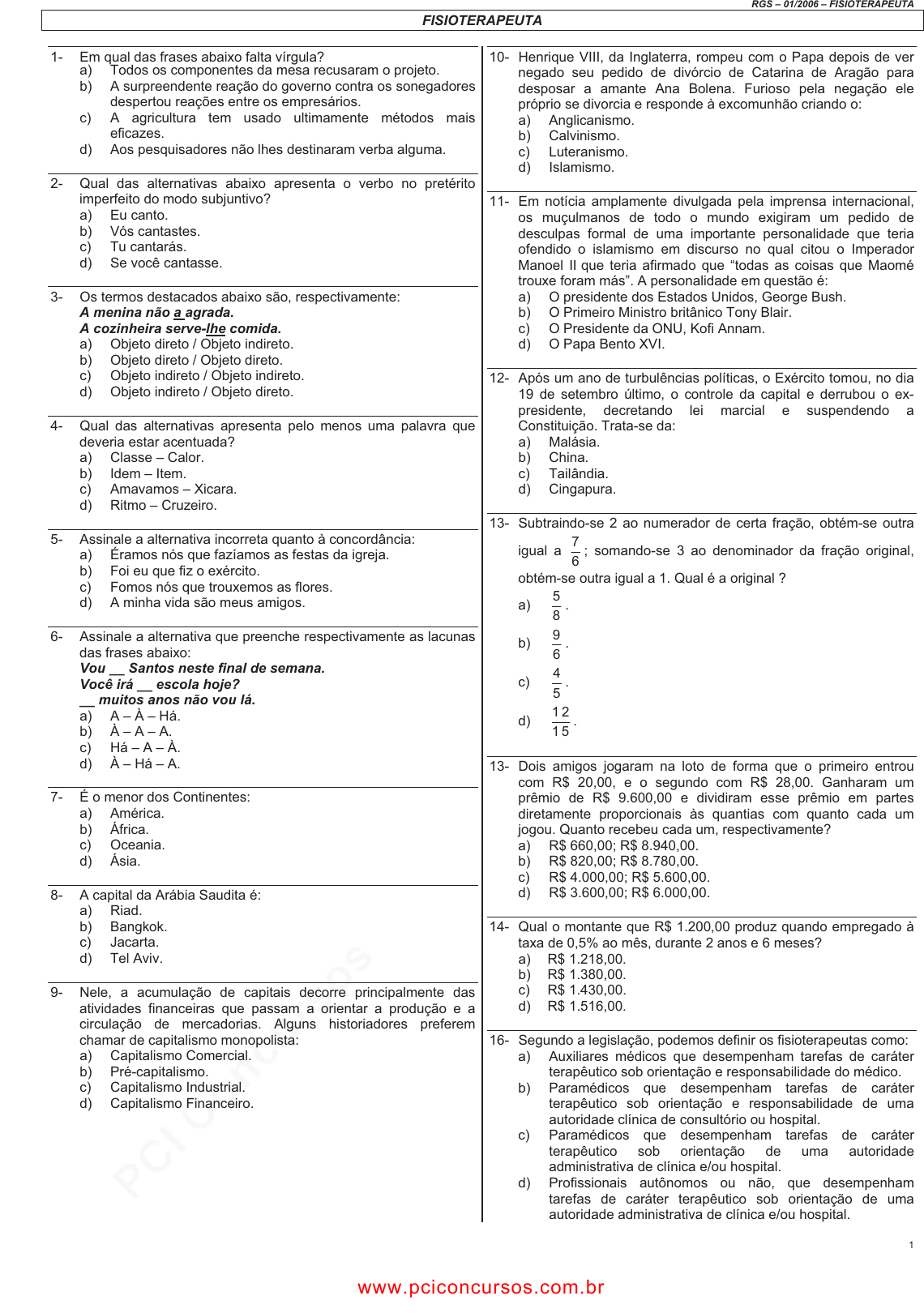 pcimarkpci MDAwMDowMDAwOjAwMDA6MDAwMDowMDAwOmZmZmY6MzZlOTpjMjU5:VGh1LCAxNiBTZXAgMjAyMSAwNzo1MTo0OSAtMDMwMA== RGS – 01/2006 – FISIOTERAPEUTA 1 FISIOTERAPEUTA 1- Em qual das frases abaixo falta vírgula? a) Todos os componentes da mesa recusaram o projeto. b) A surpreendente reação do governo contra os sonegadores despertou reações entre os empresários. c) A agricultura tem usado ultimamente métodos mais eficazes. d) Aos pesquisadores não lhes destinaram verba alguma. 2- Qual das alternativas abaixo apresenta o verbo no pretérito imperfeito do modo subjuntivo? a) Eu canto. b) Vós cantastes. c) Tu cantarás. d) Se você cantasse. 3- Os termos destacados abaixo são, respectivamente: A menina não a agrada. A cozinheira serve-lhe comida. a) Objeto direto / Objeto indireto. b) Objeto direto / Objeto direto. c) Objeto indireto / Objeto indireto. d) Objeto indireto / Objeto direto. 4- Qual das alternativas apresenta pelo menos uma palavra que deveria estar acentuada? a) Classe – Calor. b) Idem – Item. c) Amavamos – Xicara. d) Ritmo – Cruzeiro. 5- Assinale a alternativa incorreta quanto à concordância: a) Éramos nós que fazíamos as festas da igreja. b) Foi eu que fiz o exército. c) Fomos nós que trouxemos as flores. d) A minha vida são meus amigos. 6- Assinale a alternativa que preenche respectivamente as lacunas das frases abaixo: Vou __ Santos neste final de semana. Você irá __ escola hoje? __ muitos anos não vou lá. a) A – À – Há. b) À – A – A. c) Há – A – À. d) À – Há – A. 7- É o menor dos Continentes: a) América. b) África. c) Oceania. d) Ásia. 8- A capital da Arábia Saudita é: a) Riad. b) Bangkok. c) Jacarta. d) Tel Aviv. 9- Nele, a acumulação de capitais decorre principalmente das atividades financeiras que passam a orientar a produção e a circulação de mercadorias. Alguns historiadores preferem chamar de capitalismo monopolista: a) Capitalismo Comercial. b) Pré-capitalismo. c) Capitalismo Industrial. d) Capitalismo Financeiro. 10- Henrique VIII, da Inglaterra, rompeu com o Papa depois de ver negado seu pedido de divórcio de Catarina de Aragão para desposar a amante Ana Bolena. Furioso pela negação ele próprio se divorcia e responde à excomunhão criando o: a) Anglicanismo. b) Calvinismo. c) Luteranismo. d) Islamismo. 11- Em notícia amplamente divulgada pela imprensa internacional, os muçulmanos de todo o mundo exigiram um pedido de desculpas formal de uma importante personalidade que teria ofendido o islamismo em discurso no qual citou o Imperador Manoel II que teria afirmado que “todas as coisas que Maomé trouxe foram más”. A personalidade em questão é: a) O presidente dos Estados Unidos, George Bush. b) O Primeiro Ministro britânico Tony Blair. c) O Presidente da ONU, Kofi Annam. d) O Papa Bento XVI. 12- Após um ano de turbulências políticas, o Exército tomou, no dia 19 de setembro último, o controle da capital e derrubou o ex- presidente, decretando lei marcial e suspendendo a Constituição. Trata-se da: a) Malásia. b) China. c) Tailândia. d) Cingapura. 13- Subtraindo-se 2 ao numerador de certa fração, obtém-se outra igual a 7 6 ; somando-se 3 ao denominador da fração original, obtém-se outra igual a 1. Qual é a original ? a) 5 8 . b) 9 6 . c) 4 5 . d) 1 2 1 5 . 13- Dois amigos jogaram na loto de forma que o primeiro entrou com R$ 20,00, e o segundo com R$ 28,00. Ganharam um prêmio de R$ 9.600,00 e dividiram esse prêmio em partes diretamente proporcionais às quantias com quanto cada um jogou. Quanto recebeu cada um, respectivamente? a) R$ 660,00; R$ 8.940,00. b) R$ 820,00; R$ 8.780,00. c) R$ 4.000,00; R$ 5.600,00. d) R$ 3.600,00; R$ 6.000,00. 14- Qual o montante que R$ 1.200,00 produz quando empregado à taxa de 0,5% ao mês, durante 2 anos e 6 meses? a) R$ 1.218,00. b) R$ 1.380,00. c) R$ 1.430,00. d) R$ 1.516,00. 16- Segundo a legislação, podemos definir os fisioterapeutas como: a) Auxiliares médicos que desempenham tarefas de caráter terapêutico sob orientação e responsabilidade do médico. b) Paramédicos que desempenham tarefas de caráter terapêutico sob orientação e responsabilidade de uma autoridade clínica de consultório ou hospital. c) Paramédicos que desempenham tarefas de caráter terapêutico sob orientação de uma autoridade administrativa de clínica e/ou hospital. d) Profissionais autônomos ou não, que desempenham tarefas de caráter terapêutico sob orientação de uma autoridade administrativa de clínica e/ou hospital. www.pciconcursos.com.br pcimarkpci MDAwMDowMDAwOjAwMDA6MDAwMDowMDAwOmZmZmY6MzZlOTpjMjU5:VGh1LCAxNiBTZXAgMjAyMSAwNzo1MTo0OSAtMDMwMA== RGS – 01/2006 – FISIOTERAPEUTA 2 17- Leia com atenção os itens abaixo: I- Ao médico cabe dirigir, chefiar e liderar a equipe de reabilitação. II- Dentro da equipe de reabilitação são elementos básicos: o médico, o assistente social, o psicólogo, o fisioterapeuta e o terapeuta ocupacional. Dos itens acima: a) Apenas I está correto. b) Apenas II está correto. c) I e II estão corretos. d) I e II estão incorretos. 18- Segundo o Código de Ética, o fisioterapeuta presta assistência ao homem participando: a) Do tratamento, recuperação e proliferação de sua saúde, apenas. b) Apenas do tratamento e recuperação de sua saúde c) Apenas do tratamento e proliferação de sua saúde. d) Da promoção, tratamento e recuperação de sua saúde, apenas. 19- São deveres do fisioterapeuta: a) Utilizar todos os conhecimentos técnicos e científicos a seu alcance para prevenir ou minorar o sofrimento do ser humano e evitar seu extermínio. b) Utilizar todos os conhecimentos técnicos e a maior parte dos conhecimentos científicos ao seu alcance ou que possam surgir para minorar o sofrimento do ser humano e evitar seu padecimento. c) Utilizar todos os conhecimentos científicos e a maior parte dos conhecimentos técnicos ao seu alcance ou ao alcance de seus colegas de trabalho para prevenir ou m