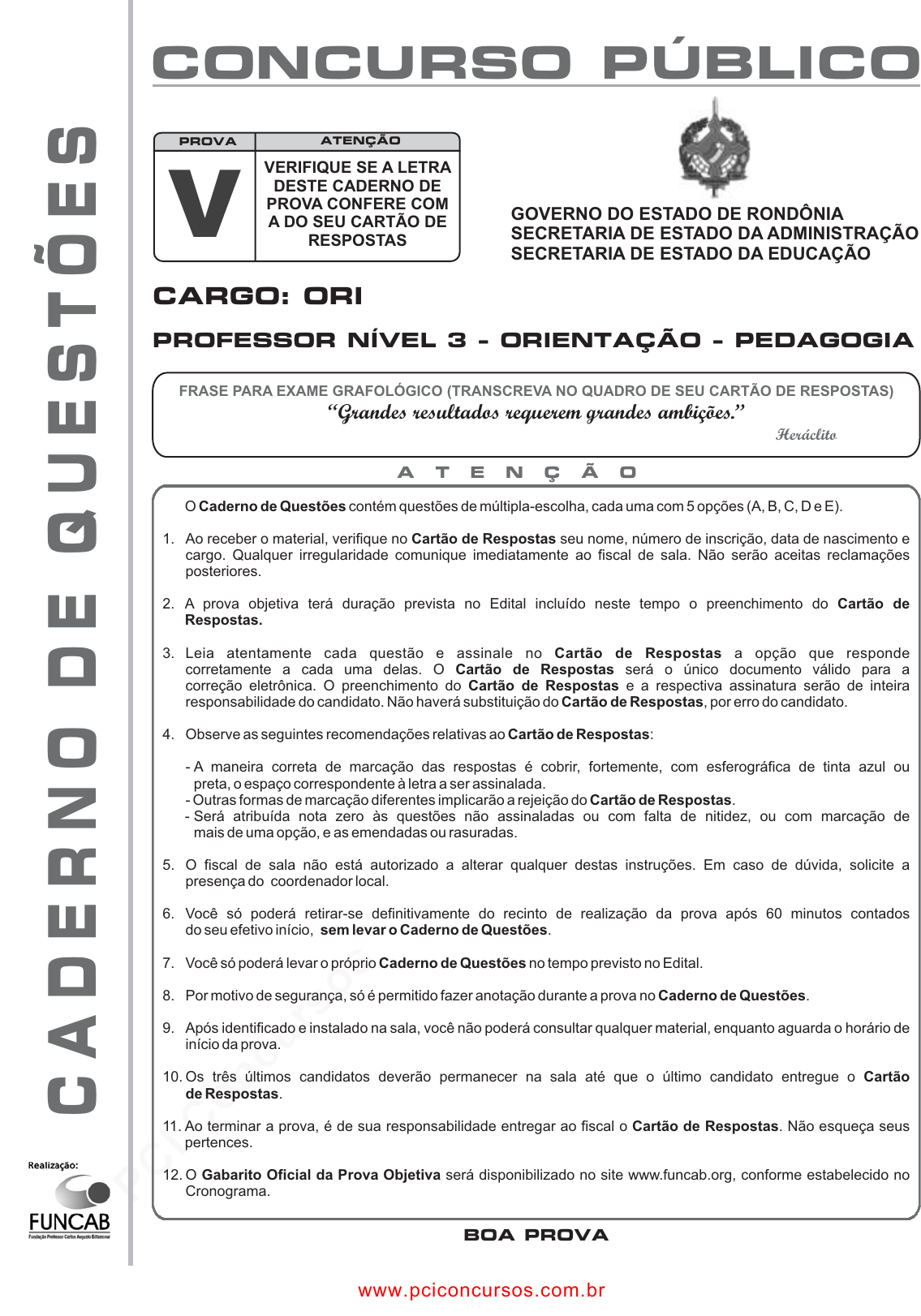 pcimarkpci MDAwMDowMDAwOjAwMDA6MDAwMDowMDAwOmZmZmY6MzZlOTpjMjU5:U3VuLCAxMiBTZXAgMjAyMSAxMToxMDo1OCAtMDMwMA== BOA PROVA A T E N Ç Ã O O contém questões de múltipla-escolha, cada uma com 5 opções (A, B, C, D e E). 1. Ao receber o material, verifique no seu nome, número de inscrição, data de nascimento e cargo. Qualquer irregularidade comunique imediatamente ao fiscal de sala. Não serão aceitas reclamações posteriores. 2. A prova objetiva terá duração prevista no Edital incluído neste tempo o preenchimento do 3. Leia atentamente cada questão e assinale no a opção que responde corretamente a cada uma delas. O será o único documento válido para a correção eletrônica. O preenchimento do e a respectiva assinatura serão de inteira responsabilidade do candidato. Não haverá substituição do , por erro do candidato. 4. Observe as seguintes recomendações relativas ao : - A maneira correta de marcação das respostas é cobrir, fortemente, com esferográfica de tinta azul ou preta, o espaço correspondente à letra a ser assinalada. - Outras formas de marcação diferentes implicarão a rejeição do . - Será atribuída nota zero às questões não assinaladas ou com falta de nitidez, ou com marcação de mais de uma opção, e as emendadas ou rasuradas. 5. O fiscal de sala não está autorizado a alterar qualquer destas instruções. Em caso de dúvida, solicite a presença do coordenador local. 6. Você só poderá retirar-se definitivamente do recinto de realização da prova após 60 minutos contados do seu efetivo início, . 7. Você só poderá levar o próprio no tempo previsto no Edital. 8. Por motivo de segurança, só é permitido fazer anotação durante a prova no . 9. Após identificado e instalado na sala, você não poderá consultar qualquer material, enquanto aguarda o horário de início da prova. 10. Os três últimos candidatos deverão permanecer na sala até que o último candidato entregue o . 11. Ao terminar a prova, é de sua responsabilidade entregar ao fiscal o . Não esqueça seus pertences. 12. O será disponibilizado no site www.funcab.org, conforme estabelecido no Cronograma. Caderno de Questões Cartão de Respostas Cartão de Respostas. Cartão de Respostas Cartão de Respostas Cartão de Respostas Cartão de Respostas Cartão de Respostas Cartão de Respostas sem levar o Caderno de Questões Caderno de Questões Caderno de Questões Cartão de Respostas Cartão de Respostas Gabarito Oficial da Prova Objetiva C A D E R N O D E Q U E S T Õ E S CARGO: ORI PROFESSOR NÍVEL 3 - ORIENTAÇÃO - PEDAGOGIA FRASE PARA EXAME GRAFOLÓGICO (TRANSCREVA NO QUADRO DE SEU CARTÃO DE RESPOSTAS) Heráclito “Grandes resultados requerem grandes ambições.” PROVA ATENÇÃO V VERIFIQUE SE A LETRA DESTE CADERNO DE PROVA CONFERE COM A DO SEU CARTÃO DE RESPOSTAS CONCURSO PÚBLICO GOVERNO DO ESTADO DE RONDÔNIA SECRETARIA DE ESTADO DA ADMINISTRAÇÃO SECRETARIA DE ESTADO DA EDUCAÇÃO www.pciconcursos.com.br pcimarkpci MDAwMDowMDAwOjAwMDA6MDAwMDowMDAwOmZmZmY6MzZlOTpjMjU5:U3VuLCAxMiBTZXAgMjAyMSAxMToxMDo1OCAtMDMwMA== 02 CONHECIMENTOS GERAIS: Leia o texto abaixo e responda às questões propostas. João Ubaldo Ribeiro, o imortal, me confessou certa feita que havia repetido uma palavra duas vezes ao longo de sua volumosa obra, , e isso o incomodara imensamente. A confissão aconteceu por causa de uma apresentação de em que a memória me falhou e eu mandei um segundo “ensandecida” em vez de alternar com “enlouquecida”. Foi uma pequena aula de português das tantas que tive por osmose com o Ubaldo, graças à nossa aproximação através do teatro. Não se deve repetir palavras impunemente. O começo de nossa amizade foi muito difícil para mim. Somos comparsas de e-mail, e cada vez que eu tinha de escrever para o venerado João minhas pernas bambeavam de insegurança gramática. Um singelo: “Caro Ubaldo, vamos jantar?” me exigia algumas horas de concentração para pôr a vírgula no lugar adequado. Aprendi imensamente com a impagável correspondência com o mestre e devo, e muito, a Ubaldo esta posição de colunista aqui em VEJA RIO. Um ano e pouco atrás, trocamos uma série de mensagens mais pessoais e, pela primeira vez, escrevi para o poeta de maneira solta. Ele, que é atento aos detalhes, percebeu a melhora e me fez um dos elogios mais valorosos que já recebi na vida. Mas a evolução de um português medíocre como o meu não é garantia de coisa nenhuma. Relendo a crônica “Gula”, da edição de 14 de outubro, dei de cara com a repetição maciça da palavra “doce” e de outras que agora não lembro. É verdade que as últimas semanas têm sido tumultuadas aqui em casa, mas isso não justifica a cegueira. Sem falar na confusão enervante de “quês”... Minha mãe me alertou para outro vício: o uso exagerado do gerúndio. Esse eu ainda controlo. Minha imunidade ao gerúndio é mais alta do que a vulnerabilidade para a infestação de “quês”. É o mal dos tempos. Fiz uma palestra outro dia na PUC sobre escolhas profissionais e a conversa recaiu sobre a questão da exigência do diploma de jornalista para exercer a profissão. É claro que eu gostaria que o cirurgião prestes a me abrir um talho na barriga fosse formado em medicina e especializado em fígado, intestino ou algo que o valha. Mas um economista pode ser de grande utilidade para um jornal, assim como um biólogo exerce respeito na seção de ciências. Uma professora do curso de comunicação se pronunciou no debate dizendo que a maior dificuldade, comum a todos os alunos, era o pífio desempenho na língua portuguesa. Por ela, as faculdades deveriam incluir cursos obrigatórios de letras para toda e qualquer profissão, já que o nível do ensino da língua de Camões no 2º grau era baixíssimo. Baseada na minha experiência, estou com ela e não abro. João Ubaldo sonhou em fazer filosofia, mas o pai severo o encaminhou para o direito. Ubaldo é formado em