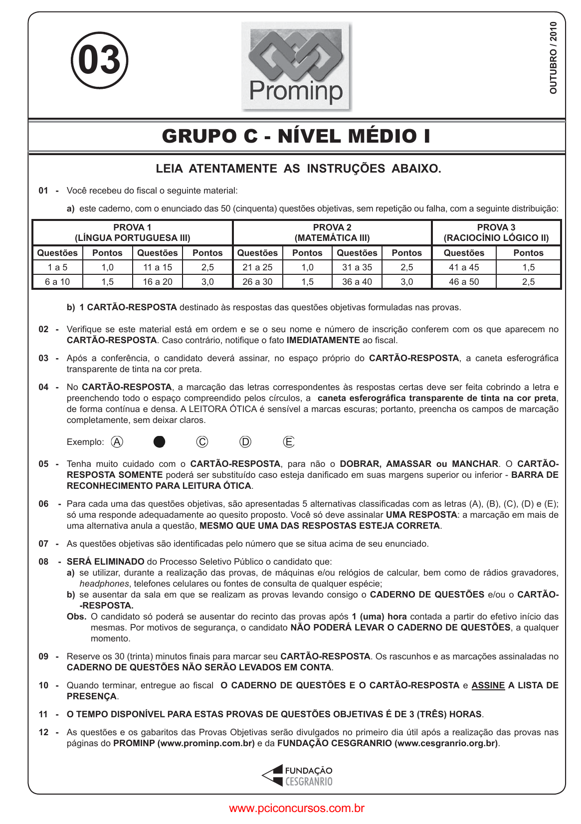 pcimarkpci MDAwMDowMDAwOjAwMDA6MDAwMDowMDAwOmZmZmY6MzZlOTpjMjU5:TW9uLCAxMyBTZXAgMjAyMSAxNjoxNDo0MyAtMDMwMA== GRUPO C - NÍVEL MÉDIO I 1 LEIA ATENTAMENTE AS INSTRUÇÕES ABAIXO. 01 - Você recebeu do fiscal o seguinte material: a) este caderno, com o enunciado das 50 (cinquenta) questões objetivas, sem repetição ou falha, com a seguinte distribuição: b) 1 CARTÃO-RESPOSTA destinado às respostas das questões objetivas formuladas nas provas. 02 - Verifique se este material está em ordem e se o seu nome e número de inscrição conferem com os que aparecem no CARTÃO-RESPOSTA. Caso contrário, notifique o fato IMEDIATAMENTE ao fiscal. 03 - Após a conferência, o candidato deverá assinar, no espaço próprio do CARTÃO-RESPOSTA, a caneta esferográfica transparente de tinta na cor preta. 04 - No CARTÃO-RESPOSTA, a marcação das letras correspondentes às respostas certas deve ser feita cobrindo a letra e preenchendo todo o espaço compreendido pelos círculos, a caneta esferográfica transparente de tinta na cor preta, de forma contínua e densa. A LEITORA ÓTICA é sensível a marcas escuras; portanto, preencha os campos de marcação completamente, sem deixar claros. Exemplo: 05 - Tenha muito cuidado com o CARTÃO-RESPOSTA, para não o DOBRAR, AMASSAR ou MANCHAR. O CARTÃO- RESPOSTA SOMENTE poderá ser substituído caso esteja danificado em suas margens superior ou inferior - BARRA DE RECONHECIMENTO PARA LEITURA ÓTICA. 06 - Para cada uma das questões objetivas, são apresentadas 5 alternativas classificadas com as letras (A), (B), (C), (D) e (E); só uma responde adequadamente ao quesito proposto. Você só deve assinalar UMA RESPOSTA: a marcação em mais de uma alternativa anula a questão, MESMO QUE UMA DAS RESPOSTAS ESTEJA CORRETA. 07 - As questões objetivas são identificadas pelo número que se situa acima de seu enunciado. 08 - SERÁ ELIMINADO do Processo Seletivo Público o candidato que: a) se utilizar, durante a realização das provas, de máquinas e/ou relógios de calcular, bem como de rádios gravadores, headphones, telefones celulares ou fontes de consulta de qualquer espécie; b) se ausentar da sala em que se realizam as provas levando consigo o CADERNO DE QUESTÕES e/ou o CARTÃO- -RESPOSTA. Obs. O candidato só poderá se ausentar do recinto das provas após 1 (uma) hora contada a partir do efetivo início das mesmas. Por motivos de segurança, o candidato NÃO PODERÁ LEVAR O CADERNO DE QUESTÕES, a qualquer momento. 09 - Reserve os 30 (trinta) minutos finais para marcar seu CARTÃO-RESPOSTA. Os rascunhos e as marcações assinaladas no CADERNO DE QUESTÕES NÃO SERÃO LEVADOS EM CONTA. 10 - Quando terminar, entregue ao fiscal O CADERNO DE QUESTÕES E O CARTÃO-RESPOSTA e ASSINE A LISTA DE PRESENÇA. 11 - O TEMPO DISPONÍVEL PARA ESTAS PROVAS DE QUESTÕES OBJETIVAS É DE 3 (TRÊS) HORAS. 12 - As questões e os gabaritos das Provas Objetivas serão divulgados no primeiro dia útil após a realização das provas nas páginas do PROMINP (www.prominp.com.br) e da FUNDAÇÃO CESGRANRIO (www.cesgranrio.org.br). 03 O U TU B R O / 20 10 GRUPO C - NÍVEL MÉDIO I PROVA 1 (LÍNGUA PORTUGUESA III) PROVA 2 (MATEMÁTICA III) PROVA 3 (RACIOCÍNIO LÓGICO II) Questões Pontos Questões Pontos Questões Pontos Questões Pontos Questões Pontos 1 a 5 1,0 11 a 15 2,5 21 a 25 1,0 31 a 35 2,5 41 a 45 1,5 6 a 10 1,5 16 a 20 3,0 26 a 30 1,5 36 a 40 3,0 46 a 50 2,5 www.pciconcursos.com.br pcimarkpci MDAwMDowMDAwOjAwMDA6MDAwMDowMDAwOmZmZmY6MzZlOTpjMjU5:TW9uLCAxMyBTZXAgMjAyMSAxNjoxNDo0MyAtMDMwMA== GRUPO C - NÍVEL MÉDIO I 2 LÍNGUA PORTUGUESA III COMO NÃO PENSEI NISSO ANTES? Para ser um inventor, basta enxergar os proble- mas como matéria-prima para a criatividade e apos- tar nas próprias ideias. “No meio do caminho tinha uma pedra/ tinha uma pedra no meio do caminho.” O poeta Carlos Drum- mond de Andrade criou um dos textos mais famosos da literatura brasileira ao buscar inspiração num obs- táculo. De forma parecida, muita gente, famosa ou anônima, no decorrer da história, tem convertido suas dificuldades em criações. Não é difícil perceber que, na origem de todos os objetos criados pelo homem, havia um problema. Foi de tanto machucar os pés ao caminhar descalço que algum remoto ancestral inventou o calçado, por exemplo. Cansado de beber água usando as próprias mãos, alguém concebeu o copo. E por aí vai. Diante de uma pedra no caminho, pode-se la- mentá-la ou tentar removê-la. A primeira opção é a mais fácil, mas não leva a nada. A segunda nos per- mite não só dar um fim ao empecilho, mas também deixar uma contribuição para a humanidade. Foi esse rumo que o motorista de caminhão aposentado José Roberto Rodrigues, de 55 anos, escolheu. Há 15 anos, em um acampamento, José viu um botijão de gás ir pelos ares. Impressionado com o acidente, pôs na cabeça que poderia fazer algo para evitá-lo. Anos depois, teve a ideia: se acondicionasse o botijão dentro de uma estrutura fechada e a conec- tasse com a área externa da casa, o problema estaria resolvido. Afinal, a explosão só acontece se há acú- mulo de gás dentro da cozinha. Estava concebida a cápsula antiexplosão. Para construir a engenhoca, ele pegou um balde grande de plástico, desses usados como lixeira, e fez dois furos: um para a mangueira do botijão e outro para permitir a conexão com o exterior da casa. Se o gás vazar, sai para o ambiente externo. “Fiz tudo sozinho”, orgulha-se José. Tempos depois, inspirado pelas filhas, que vol- ta e meia deixavam a comida queimar, aperfeiçoou o invento. Adicionou-lhe um dispositivo capaz de con- trolar o tempo pelo qual o fogão permanece aceso. Para isso, comprou um timer, aparelho encontrado em lojas de material elétrico, e o acoplou à válvula do botijão. Funciona como um relógio de corda: em quin- ze minutos, quando completa a volta, o equipamento trava a saída de gás. Se o cozimento for demorado, é só reprogramar o