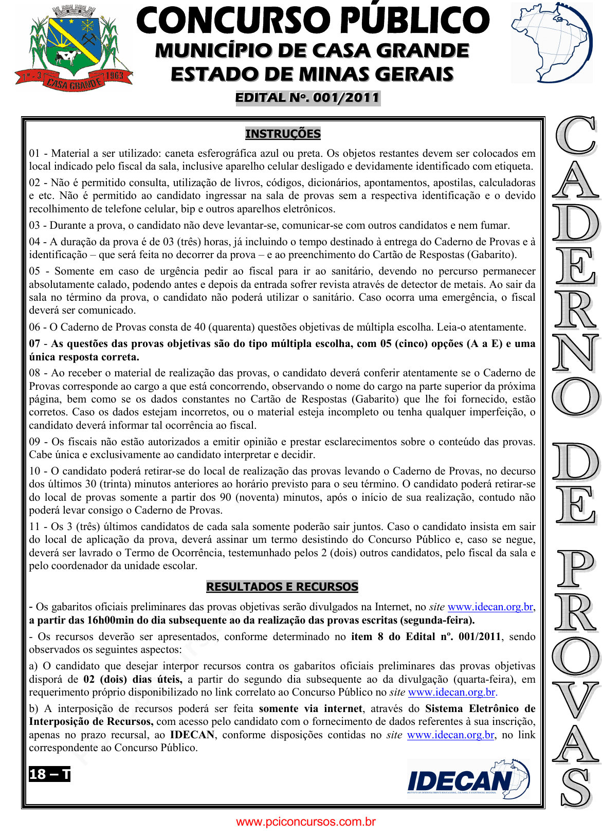 pcimarkpci MDAwMDowMDAwOjAwMDA6MDAwMDowMDAwOmZmZmY6MzZlOTpjMjU5:TW9uLCAxMyBTZXAgMjAyMSAyMTo1MjoyMSAtMDMwMA== MMMUUUNNNIIICCCÍÍÍPPPIIIOOO DDDEEE CCCAAASSSAAA GGGRRRAAANNNDDDEEE EEESSSTTTAAADDDOOO DDDEEE MMMIIINNNAAASSS GGGEEERRRAAAIIISSS EEEDDDIIITTTAAALLL NNNººº... 000000111///222000111111 INSTRUÇÕES 01 - Material a ser utilizado: caneta esferográfica azul ou preta. Os objetos restantes devem ser colocados em local indicado pelo fiscal da sala, inclusive aparelho celular desligado e devidamente identificado com etiqueta. 02 - Não é permitido consulta, utilização de livros, códigos, dicionários, apontamentos, apostilas, calculadoras e etc. Não é permitido ao candidato ingressar na sala de provas sem a respectiva identificação e o devido recolhimento de telefone celular, bip e outros aparelhos eletrônicos. 03 - Durante a prova, o candidato não deve levantar-se, comunicar-se com outros candidatos e nem fumar. 04 - A duração da prova é de 03 (três) horas, já incluindo o tempo destinado à entrega do Caderno de Provas e à identificação – que será feita no decorrer da prova – e ao preenchimento do Cartão de Respostas (Gabarito). 05 - Somente em caso de urgência pedir ao fiscal para ir ao sanitário, devendo no percurso permanecer absolutamente calado, podendo antes e depois da entrada sofrer revista através de detector de metais. Ao sair da sala no término da prova, o candidato não poderá utilizar o sanitário. Caso ocorra uma emergência, o fiscal deverá ser comunicado. 06 - O Caderno de Provas consta de 40 (quarenta) questões objetivas de múltipla escolha. Leia-o atentamente. 07 - As questões das provas objetivas são do tipo múltipla escolha, com 05 (cinco) opções (A a E) e uma única resposta correta. 08 - Ao receber o material de realização das provas, o candidato deverá conferir atentamente se o Caderno de Provas corresponde ao cargo a que está concorrendo, observando o nome do cargo na parte superior da próxima página, bem como se os dados constantes no Cartão de Respostas (Gabarito) que lhe foi fornecido, estão corretos. Caso os dados estejam incorretos, ou o material esteja incompleto ou tenha qualquer imperfeição, o candidato deverá informar tal ocorrência ao fiscal. 09 - Os fiscais não estão autorizados a emitir opinião e prestar esclarecimentos sobre o conteúdo das provas. Cabe única e exclusivamente ao candidato interpretar e decidir. 10 - O candidato poderá retirar-se do local de realização das provas levando o Caderno de Provas, no decurso dos últimos 30 (trinta) minutos anteriores ao horário previsto para o seu término. O candidato poderá retirar-se do local de provas somente a partir dos 90 (noventa) minutos, após o início de sua realização, contudo não poderá levar consigo o Caderno de Provas. 11 - Os 3 (três) últimos candidatos de cada sala somente poderão sair juntos. Caso o candidato insista em sair do local de aplicação da prova, deverá assinar um termo desistindo do Concurso Público e, caso se negue, deverá ser lavrado o Termo de Ocorrência, testemunhado pelos 2 (dois) outros candidatos, pelo fiscal da sala e pelo coordenador da unidade escolar. RESULTADOS E RECURSOS - Os gabaritos oficiais preliminares das provas objetivas serão divulgados na Internet, no site www.idecan.org.br, a partir das 16h00min do dia subsequente ao da realização das provas escritas (segunda-feira). - Os recursos deverão ser apresentados, conforme determinado no item 8 do Edital nº. 001/2011, sendo observados os seguintes aspectos: a) O candidato que desejar interpor recursos contra os gabaritos oficiais preliminares das provas objetivas disporá de 02 (dois) dias úteis, a partir do segundo dia subsequente ao da divulgação (quarta-feira), em requerimento próprio disponibilizado no link correlato ao Concurso Público no site www.idecan.org.br. b) A interposição de recursos poderá ser feita somente via internet, através do Sistema Eletrônico de Interposição de Recursos, com acesso pelo candidato com o fornecimento de dados referentes à sua inscrição, apenas no prazo recursal, ao IDECAN, conforme disposições contidas no site www.idecan.org.br, no link correspondente ao Concurso Público. 18 – T www.pciconcursos.com.br pcimarkpci MDAwMDowMDAwOjAwMDA6MDAwMDowMDAwOmZmZmY6MzZlOTpjMjU5:TW9uLCAxMyBTZXAgMjAyMSAyMTo1MjoyMSAtMDMwMA== CCCOOONNNCCCUUURRRSSSOOO PPPÚÚÚBBBLLLIIICCCOOO ––– MMMUUUNNNIIICCCÍÍÍPPPIIIOOO DDDEEE CCCAAASSSAAA GGGRRRAAANNNDDDEEE///MMMGGG OFICIAL ELETRICISTA www.idecan.org.br / atendimento@idecan.org.br - 2 - CCAARRGGOO:: OOFFIICCIIAALL EELLEETTRRIICCIISSTTAA TEXTO: Um dever amaríssimo! José Dias amava os superlativos. Era um modo de dar feição monumental às ideias; não as havendo, serviam a prolongar as frases. Levantou-se para ir buscar o gamão, que estava no interior da casa. Cosi-me muito à parede, e vi-o passar com as suas calças brancas engomadas, presilhas, rodaque e gravata de mola. Foi dos últimos que usaram presilhas no Rio de Janeiro, e talvez neste mundo. Trazia as calças curtas para que lhe ficassem bem esticadas. A gravata de cetim preto, com um aro de aço por dentro, imobilizava-lhe o pescoço; era então moda. O rodaque de chita, veste caseira e leve, parecia nele uma casaca de cerimônia. Era magro, chupado, com um princípio de calva; teria os seus cinquenta e cinco anos. Levantou-se com o passo vagaroso do costume, não aquele vagar arrastado dos preguiçosos, mas um vagar calculado e deduzido, um silogismo completo, a premissa antes da consequência, a consequência antes da conclusão. Um dever amaríssimo! (Machado de Assis. Dom Casmurro) 01) De acordo com o texto, são características de José Dias I. amava os superlativos. II. vestia calças curtas. III. era magro, chupado. IV. tinha aproximadamente cinquenta e cinco anos. Estão corretas apenas as alternativas A) I, II B) II, III C) III, IV D) I, IV E) I, II, III, IV 02) De acordo co