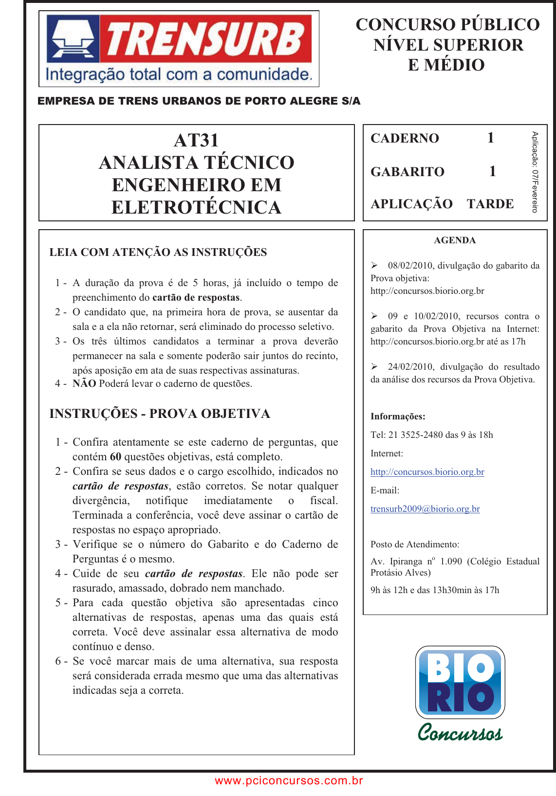 pcimarkpci MDAwMDowMDAwOjAwMDA6MDAwMDowMDAwOmZmZmY6MzZlOTpjMjU5:V2VkLCAxNSBTZXAgMjAyMSAxOTo0NzowOCAtMDMwMA== CADERNO 1 GABARITO 1 APLICAÇÃO TARDE AT31 ANALISTA TÉCNICO ENGENHEIRO EM ELETROTÉCNICA LEIA COM ATENÇÃO AS INSTRUÇÕES 1 - A duração da prova é de 5 horas, já incluído o tempo de preenchimento do cartão de respostas. 2 - O candidato que, na primeira hora de prova, se ausentar da sala e a ela não retornar, será eliminado do processo seletivo. 3 - Os três últimos candidatos a terminar a prova deverão permanecer na sala e somente poderão sair juntos do recinto, após aposição em ata de suas respectivas assinaturas. 4 - NÃO Poderá levar o caderno de questões. INSTRUÇÕES - PROVA OBJETIVA 1 - Confira atentamente se este caderno de perguntas, que contém 60 questões objetivas, está completo. 2 - Confira se seus dados e o cargo escolhido, indicados no cartão de respostas, estão corretos. Se notar qualquer divergência, notifique imediatamente o fiscal. Terminada a conferência, você deve assinar o cartão de respostas no espaço apropriado. 3 - Verifique se o número do Gabarito e do Caderno de Perguntas é o mesmo. 4 - Cuide de seu cartão de respostas. Ele não pode ser rasurado, amassado, dobrado nem manchado. 5 - Para cada questão objetiva são apresentadas cinco alternativas de respostas, apenas uma das quais está correta. Você deve assinalar essa alternativa de modo contínuo e denso. 6 - Se você marcar mais de uma alternativa, sua resposta será considerada errada mesmo que uma das alternativas indicadas seja a correta. AGENDA ��08/02/2010, divulgação do gabarito da Prova objetiva: http://concursos.biorio.org.br ��09 e 10/02/2010, recursos contra o gabarito da Prova Objetiva na Internet: http://concursos.biorio.org.br até as 17h ��24/02/2010, divulgação do resultado da análise dos recursos da Prova Objetiva. Informações: Tel: 21 3525-2480 das 9 às 18h Internet: http://concursos.biorio.org.br E-mail: trensurb2009@biorio.org.br Posto de Atendimento: Av. Ipiranga no 1.090 (Colégio Estadual Protásio Alves) 9h às 12h e das 13h30min às 17h A plicação: 07/Fevereiro CONCURSO PÚBLICO NÍVEL SUPERIOR E MÉDIO EMPRESA DE TRENS URBANOS DE PORTO ALEGRE S/A www.pciconcursos.com.br pcimarkpci MDAwMDowMDAwOjAwMDA6MDAwMDowMDAwOmZmZmY6MzZlOTpjMjU5:V2VkLCAxNSBTZXAgMjAyMSAxOTo0NzowOCAtMDMwMA== AT31 ANALISTA TÉCNICO ENGENHEIRO EM ELETROTÉCNICAEMPRESA DE TRENS URBANOS DE PORTO ALEGRE S/A 2 LÍNGUA PORTUGUESA Organização: BIORIO Concursos Jornalismo: profissão específica ou atividade geral? O que diferencia uma profissão de uma atividade geral? Esta não tem contornos nítidos ou precisos. Pode constituir-se de tarefas as mais diversas, todas relativamente simples. Para realizá-las, quase nunca é necessário um conhecimento mais aprofundado. Seu perfil impreciso permite que praticamente qualquer pessoa possa exercer uma atividade geral. Basta-lhe algum atributo físico ou mental, um pouco de prática, "um certo jeito para a coisa". Nessa constatação, não há menoscabo de sua relevância e nem diminuição da dignidade do trabalho exercido. Uma profissão é diferente. Geralmente tem raízes em antigas atividades gerais que foram se especializando, com inúmeras tarefas, algumas mais simples, outras mais complicadas. Uma profissão caracteriza-se, fundamentalmente, por constituir um sistema articulado de funções específicas, complexas e complementares entre si. Por isso, sempre exige algum tipo de formação básica, preliminar ao seu exercício. Treinamento e prática são essenciais para complementar a formação; mas esta é indispensável. Atributos pessoais podem contribuir para formar um profissional melhor; mas essas qualidades não prescindem da formação. Há exceções, mas estamos tratando da regra geral. As sociedades modernas desenvolveram sistemas formais de formação geral e específica em diversos graus e níveis, incumbidos de dar o preparo básico para o exercício de inúmeras profissões. Ao dar esse preparo, o sistema também dá um sinal, uma prova pública de que o preparo foi dado. Esse sinal é chamado de certificado ou diploma, e indica o grau e o nível da formação regular conferida. Entre as antigas atividades gerais que foram se transformando em profissões específicas está a de jornalismo. Na sua essência, o jornalismo trata da informação. É uma profissão constituída de funções que se destinam a planejar e obter informações do mundo real - físico ou social -, organizar, estruturar e hierarquizar essas informações, explicá-las, analisá-las e interpretá-las, e apresentá-las e difundi-las através de diversos processos, utilizando-se de meios impressos, auditivos, visuais, geralmente combinados entre si. Não é uma atividade geral, que qualquer um possa fazer. É um processo específico e complexo e que, por isso, exige formação especializada. A tendência histórica provável é que essa especialização aumente: cresce a complexidade tanto do mundo social e físico, que constitui o conteúdo das informações, quanto dos métodos de obtenção, registro e difusão das informações. Por isso modernamente o jornalismo necessita de formação especializada de nível superior; por isso é que surgiram, no interior dos sistemas escolares universitários, os cursos de jornalismo e seus diplomas. Não se trata de um "direito" dos formandos. Trata- se do direito de a sociedade exigir do profissional a prova da sua formação regular, escolar e superior específica. Supor que outra formação não específica seja igual à de jornalismo significa negar o jornalismo como profissão específica e entendê-lo como atividade geral. É claro que isso não tem nada a ver com o direito de ter e emitir opiniões. A essência do jornalismo é a informação. O direito de ter e difundir opiniões não é característica nem específica e nem exclusiva do jornalismo. Abarca um campo muito mais