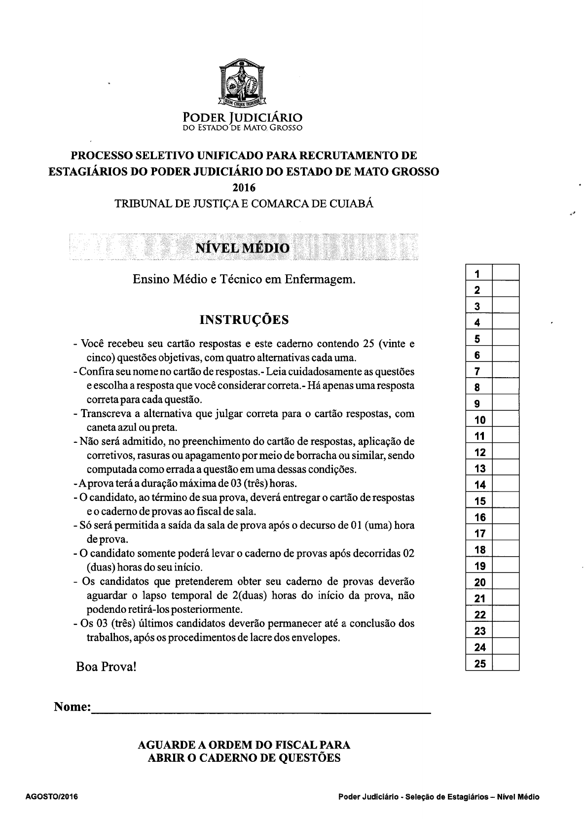 1 ESTADO DE MATO GROSSO PODER JUDICIÁRIO TRIBUNAL DE JUSTIÇA PROCESSO SELETIVO UNIFICADO PARA RECRUTAMENTO DE ESTAGIÁRIO DO PODER JUDICIÁRIO DO ESTADO DE MATO GROSSO EDITAL N. 013/2016/GSCP O Doutor JOÃO THIAGO DE FRANÇA GUERRA, Presidente da Comissão de Apoio ao Processo Seletivo Unificado, no uso de suas atribuições legais, pelo presente edital torna público, após a análise dos recursos, o Gabarito Oficial Definitivo da prova realizada no dia 07 de agosto de 2016, em conformidade com o Edital n.º 007/2016/GSCP, de 27 de junho de 2016, disponibilizado no Diário da Justiça Eletrônico – MT n.º 9.805, em 29 de junho de 2016. NÍVEL MÉDIO NÍVEL SUPERIOR CURSO DE DIREITO NÍVEL SUPERIOR – OUTROS CURSOS 1. A 1. D 1. ANULADA 2. C 2. C 2. ANULADA 3. C 3. C 3. ANULADA 4. A 4. A 4. B 5. B 5. A 5. C 6. B 6. D 6. B 7. D 7. C 7. C 8. B 8. D 8. D 9. C 9. A 9. D 10. A 10. A 10. B 11. C 11. C 11. D 12. C 12. A 12. C 13. B 13. C 13. D 14. D 14. C 14. A 2 15. C 15. A 15. A 16. B 16. D 16. C 17. C 17. B 17. A 18. B 18. A 18. C 19. D 19. A 19. C 20. B 20. C 20. A 21. C 21. C 21. D 22. A 22. C 22. B 23. D 23. B 23. C 24. B 24. B 24. A 25. A 25. C 25. D Observação: 1. As provas serão corrigidas de acordo com o Gabarito Oficial Definitivo; 2. Em relação às questões anuladas, a pontuação correspondente será creditada a todos os candidatos, independente de terem recorrido. Cuiabá, 23 de agosto de 2016. Dr. João Thiago de França Guerra Juiz Auxiliar da Presidência e Presidente da Comissão