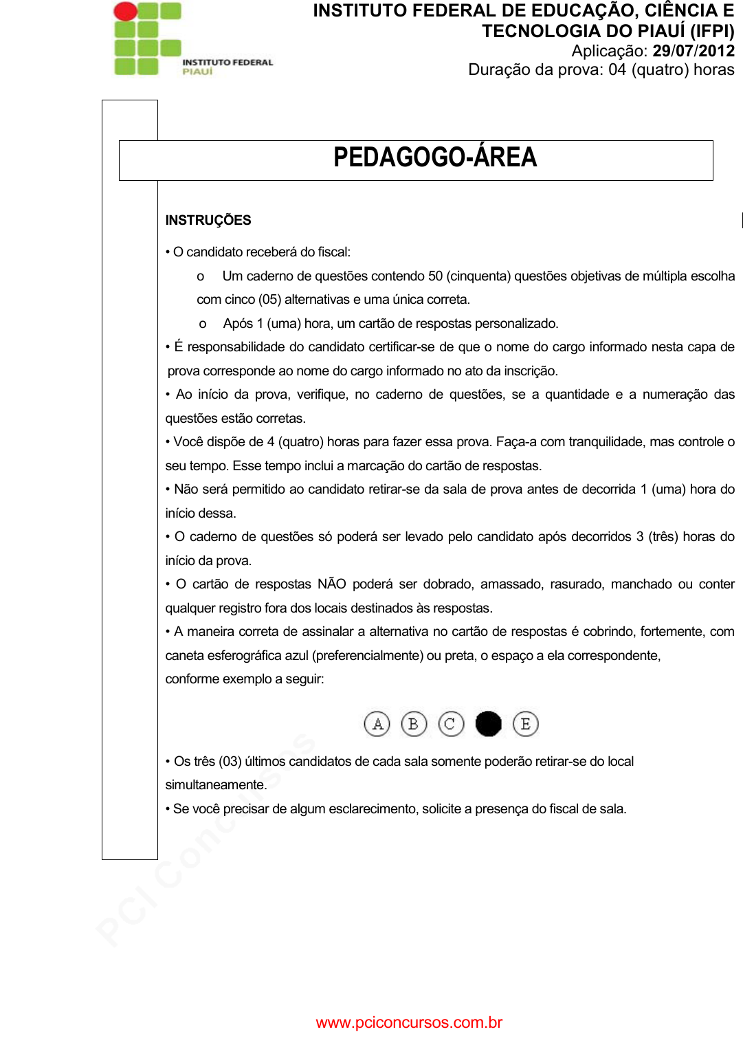 pcimarkpci MDAwMDowMDAwOjAwMDA6MDAwMDowMDAwOmZmZmY6MzZlOTpjMjU5:U3VuLCAxMiBTZXAgMjAyMSAwNDoxMjozNCAtMDMwMA== INSTITUTO FEDERAL DE EDUCAÇÃO, CIÊNCIA E TECNOLOGIA DO PIAUÍ (IFPI) Aplicação: 29/07/2012 Duração da prova: 04 (quatro) horas PEDAGOGO-ÁREA INSTRUÇÕES • O candidato receberá do fiscal: o Um caderno de questões contendo 50 (cinquenta) questões objetivas de múltipla escolha com cinco (05) alternativas e uma única correta. o Após 1 (uma) hora, um cartão de respostas personalizado. • É responsabilidade do candidato certificar-se de que o nome do cargo informado nesta capa de prova corresponde ao nome do cargo informado no ato da inscrição. • Ao início da prova, verifique, no caderno de questões, se a quantidade e a numeração das questões estão corretas. • Você dispõe de 4 (quatro) horas para fazer essa prova. Faça-a com tranquilidade, mas controle o seu tempo. Esse tempo inclui a marcação do cartão de respostas. • Não será permitido ao candidato retirar-se da sala de prova antes de decorrida 1 (uma) hora do início dessa. • O caderno de questões só poderá ser levado pelo candidato após decorridos 3 (três) horas do início da prova. • O cartão de respostas NÃO poderá ser dobrado, amassado, rasurado, manchado ou conter qualquer registro fora dos locais destinados às respostas. • A maneira correta de assinalar a alternativa no cartão de respostas é cobrindo, fortemente, com caneta esferográfica azul (preferencialmente) ou preta, o espaço a ela correspondente, conforme exemplo a seguir: • Os três (03) últimos candidatos de cada sala somente poderão retirar-se do local simultaneamente. • Se você precisar de algum esclarecimento, solicite a presença do fiscal de sala. www.pciconcursos.com.br pcimarkpci MDAwMDowMDAwOjAwMDA6MDAwMDowMDAwOmZmZmY6MzZlOTpjMjU5:U3VuLCAxMiBTZXAgMjAyMSAwNDoxMjozNCAtMDMwMA== PORTUGUÊS Leia o texto abaixo para responder às questões de 01 a 10. Governo quer proibir venda de horário na TV O governo prepara decreto que muda a legislação de concessões de rádio e TV. Batizado de novo marco regulatório da radiodifusão, o projeto prevê o fim de um "mercado paralelo" no setor, informa Julio Wiziack. Uma das mudanças de maior impacto é a proibição do aluguel de canais e de horários da programação. A lei atual não coíbe a prática de forma explícita, o que gerou a proliferação de programas religiosos e comerciais. (Folha de São Paulo, ANO 92, Nº 30.377, 03 de junho de 2012) 01 A partir da leitura do texto acima, pode-se inferir que: I A proliferação de programas religiosos e comerciais é consequência das brechas da legislação de rádio e TV. II O mercado paralelo de que trata o texto é legalizado pela lei atual, mas pratica atos considerados ilegais. III O governo prepara medidas a fim de fechar brechas da lei atual de rádio e TV. Está correto o que se afirma em: A) I, II, III. B) I e II. C) I e III. D) II e III. E) Apenas em III. 02 Em “A lei atual não coíbe a prática de forma explícita”, o verbo coibir nessa frase pode ser substituído adequadamente pelos sinônimos abaixo, EXCETO: A) Obstar. B) Reprimir. C) Punir. D) Pungir. E) Empecer. 03 O vocábulo QUE é um importante mecanismo de coesão referencial. Na organização e construção de um texto uma de suas funções é dar continuidade às ideias, evitando a repetição de referentes. No texto acima, esse elemento é um pronome relativo nas duas ocorrências, substituindo, respectivamente: A) O governo prepara decreto – forma explícita. B) Governo – prática. C) Decreto – prática. D) Decreto - forma explícita. E) Decreto – o. 04 Das assertivas abaixo, assinale a INCORRETA. A) Em “...o que gerou a proliferação...”, vocábulo o é, morfologicamente, um pronome demonstrativo. B) Em “o que gerou a proliferação...”, o verbo está flexionado na 3ª pessoa do singular para concordar com o sujeito que. C) Os adjetivos religiosos e comerciais, sintaticamente, são adjuntos adnominais especificadores do substantivo programas. D) O vocábulo e é conjunção coordenativa aditiva na duas primeiras ocorrências e conclusivo na terceira. E) Flexionando no plural a sequência em destaque “...o projeto prevê o fim de um „mercado paralelo‟”, obtém-se os projetos preveem ... www.pciconcursos.com.br pcimarkpci MDAwMDowMDAwOjAwMDA6MDAwMDowMDAwOmZmZmY6MzZlOTpjMjU5:U3VuLCAxMiBTZXAgMjAyMSAwNDoxMjozNCAtMDMwMA== 05 Uma das formas de realçar, destacar um termo que, na frase, desempenha a função de objeto direto é flexionar o verbo na voz passiva. Esse efeito pode ser conferido ao objeto destacado na frase “O governo prepara decreto...” através da seguinte estrutura sintática: A) Decreto é preparado... B) Decreto foi preparado... C) Decreto será preparado... D) Decreto tem sido preparado... E) Decreto está sendo preparado... 06 Percebe-se no texto a predominância da função da linguagem: A) Referencial. B) Metalinguística. C) Fática. D) Conativa. E) Emotiva. 07 Observe as orações: I “O governo prepara decreto que muda a legislação de concessões de rádio e TV” (início do texto). II Comprei um rádio novo para ouvir os jogos da copa. Analisando as palavras destacadas, percebe-se, especificamente, um caso de: A) Homônimos homófonos. B) Homônimos perfeitos. C) Homônimos homógrafos. D) Parônimos. E) Antônimos. 08 Com relação à linguagem empregada no texto, é INCORRETO afirmar que: A) Há predomínio da denotação. B) Não se percebe lirismo exacerbado. C) Está escrito em prosa. D) Se apresenta de forma objetiva. E) Predomina o discurso direto. 09 Analise a predicação do verbo destacado na oração “...o projeto prevê o fim de um „mercado paralelo‟ no setor...” e assinale a oração que apresenta um verbo de mesma transitividade: A) O homem que trabalha vence na vida. B) Todo mundo necessita de trabalho. C) O candidato dormiu muito e se atrasou para a prova