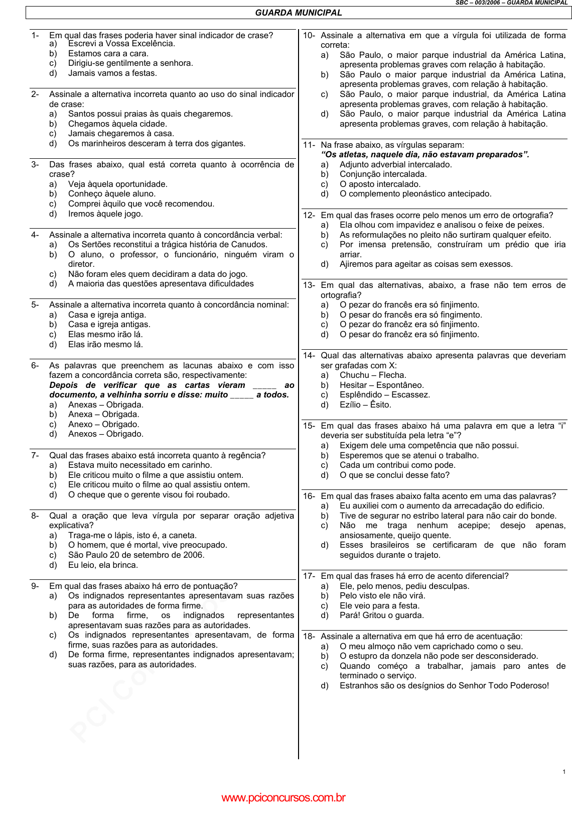 pcimarkpci MDAwMDowMDAwOjAwMDA6MDAwMDowMDAwOmZmZmY6MzZlOTpjMjU5:V2VkLCAxNSBTZXAgMjAyMSAwNzoyNToxMSAtMDMwMA== SBC – 003/2006 – GUARDA MUNICIPAL 1 GUARDA MUNICIPAL 1- Em qual das frases poderia haver sinal indicador de crase? a) Escrevi a Vossa Excelência. b) Estamos cara a cara. c) Dirigiu-se gentilmente a senhora. d) Jamais vamos a festas. 2- Assinale a alternativa incorreta quanto ao uso do sinal indicador de crase: a) Santos possui praias às quais chegaremos. b) Chegamos àquela cidade. c) Jamais chegaremos à casa. d) Os marinheiros desceram à terra dos gigantes. 3- Das frases abaixo, qual está correta quanto à ocorrência de crase? a) Veja àquela oportunidade. b) Conheço àquele aluno. c) Comprei àquilo que você recomendou. d) Iremos àquele jogo. 4- Assinale a alternativa incorreta quanto à concordância verbal: a) Os Sertões reconstitui a trágica história de Canudos. b) O aluno, o professor, o funcionário, ninguém viram o diretor. c) Não foram eles quem decidiram a data do jogo. d) A maioria das questões apresentava dificuldades 5- Assinale a alternativa incorreta quanto à concordância nominal: a) Casa e igreja antiga. b) Casa e igreja antigas. c) Elas mesmo irão lá. d) Elas irão mesmo lá. 6- As palavras que preenchem as lacunas abaixo e com isso fazem a concordância correta são, respectivamente: Depois de verificar que as cartas vieram _____ ao documento, a velhinha sorriu e disse: muito _____ a todos. a) Anexas – Obrigada. b) Anexa – Obrigada. c) Anexo – Obrigado. d) Anexos – Obrigado. 7- Qual das frases abaixo está incorreta quanto à regência? a) Estava muito necessitado em carinho. b) Ele criticou muito o filme a que assistiu ontem. c) Ele criticou muito o filme ao qual assistiu ontem. d) O cheque que o gerente visou foi roubado. 8- Qual a oração que leva vírgula por separar oração adjetiva explicativa? a) Traga-me o lápis, isto é, a caneta. b) O homem, que é mortal, vive preocupado. c) São Paulo 20 de setembro de 2006. d) Eu leio, ela brinca. 9- Em qual das frases abaixo há erro de pontuação? a) Os indignados representantes apresentavam suas razões para as autoridades de forma firme. b) De forma firme, os indignados representantes apresentavam suas razões para as autoridades. c) Os indignados representantes apresentavam, de forma firme, suas razões para as autoridades. d) De forma firme, representantes indignados apresentavam; suas razões, para as autoridades. 10- Assinale a alternativa em que a vírgula foi utilizada de forma correta: a) São Paulo, o maior parque industrial da América Latina, apresenta problemas graves com relação à habitação. b) São Paulo o maior parque industrial da América Latina, apresenta problemas graves, com relação à habitação. c) São Paulo, o maior parque industrial, da América Latina apresenta problemas graves, com relação à habitação. d) São Paulo, o maior parque industrial da América Latina apresenta problemas graves, com relação à habitação. 11- Na frase abaixo, as vírgulas separam: “Os atletas, naquele dia, não estavam preparados”. a) Adjunto adverbial intercalado. b) Conjunção intercalada. c) O aposto intercalado. d) O complemento pleonástico antecipado. 12- Em qual das frases ocorre pelo menos um erro de ortografia? a) Ela olhou com impavidez e analisou o feixe de peixes. b) As reformulações no pleito não surtiram qualquer efeito. c) Por imensa pretensão, construíram um prédio que iria arriar. d) Ajiremos para ageitar as coisas sem exessos. 13- Em qual das alternativas, abaixo, a frase não tem erros de ortografia? a) O pezar do francês era só finjimento. b) O pesar do francês era só fingimento. c) O pezar do francêz era só finjimento. d) O pesar do francêz era só finjimento. 14- Qual das alternativas abaixo apresenta palavras que deveriam ser grafadas com X: a) Chuchu – Flecha. b) Hesitar – Espontâneo. c) Esplêndido – Escassez. d) Ezílio – Êsito. 15- Em qual das frases abaixo há uma palavra em que a letra “i” deveria ser substituída pela letra “e”? a) Exigem dele uma competência que não possui. b) Esperemos que se atenui o trabalho. c) Cada um contribui como pode. d) O que se conclui desse fato? 16- Em qual das frases abaixo falta acento em uma das palavras? a) Eu auxiliei com o aumento da arrecadação do edificio. b) Tive de segurar no estribo lateral para não cair do bonde. c) Não me traga nenhum acepipe; desejo apenas, ansiosamente, queijo quente. d) Esses brasileiros se certificaram de que não foram seguidos durante o trajeto. 17- Em qual das frases há erro de acento diferencial? a) Ele, pelo menos, pediu desculpas. b) Pelo visto ele não virá. c) Ele veio para a festa. d) Pará! Gritou o guarda. 18- Assinale a alternativa em que há erro de acentuação: a) O meu almoço não vem caprichado como o seu. b) O estupro da donzela não pode ser desconsiderado. c) Quando coméço a trabalhar, jamais paro antes de terminado o serviço. d) Estranhos são os desígnios do Senhor Todo Poderoso! www.pciconcursos.com.br pcimarkpci MDAwMDowMDAwOjAwMDA6MDAwMDowMDAwOmZmZmY6MzZlOTpjMjU5:V2VkLCAxNSBTZXAgMjAyMSAwNzoyNToxMSAtMDMwMA== SBC – 003/2006 – GUARDA MUNICIPAL 2 19- Em qual dos itens abaixo a função do pronome em destaque é acompanhar o substantivo? I- Os jogadores estavam bem; o técnico convocou-os. II- Estas alunas organizaram o baile. III- Aqueles jogadores estavam machucados. a) I e II. b) Apenas I. c) I e III. d) II e III. 20- “Vossa Senhoria” é forma de tratamento que deve ser direcionada a: a) Sacerdotes em geral. b) Funcionários graduados. c) Reitores de Universidades. d) Todas as alternativas anteriores estão corretas. 21- Para cercar um sítio, foram fincados 1.380 postes de madeira com 3 m de distância entre cada um deles. Se a distância fosse de 5 m quantos postes seriam necessários? a) 1.130. b) 936. c) 2.300. d) 828. 22- A professora de matemática passou testes para os alunos fazere