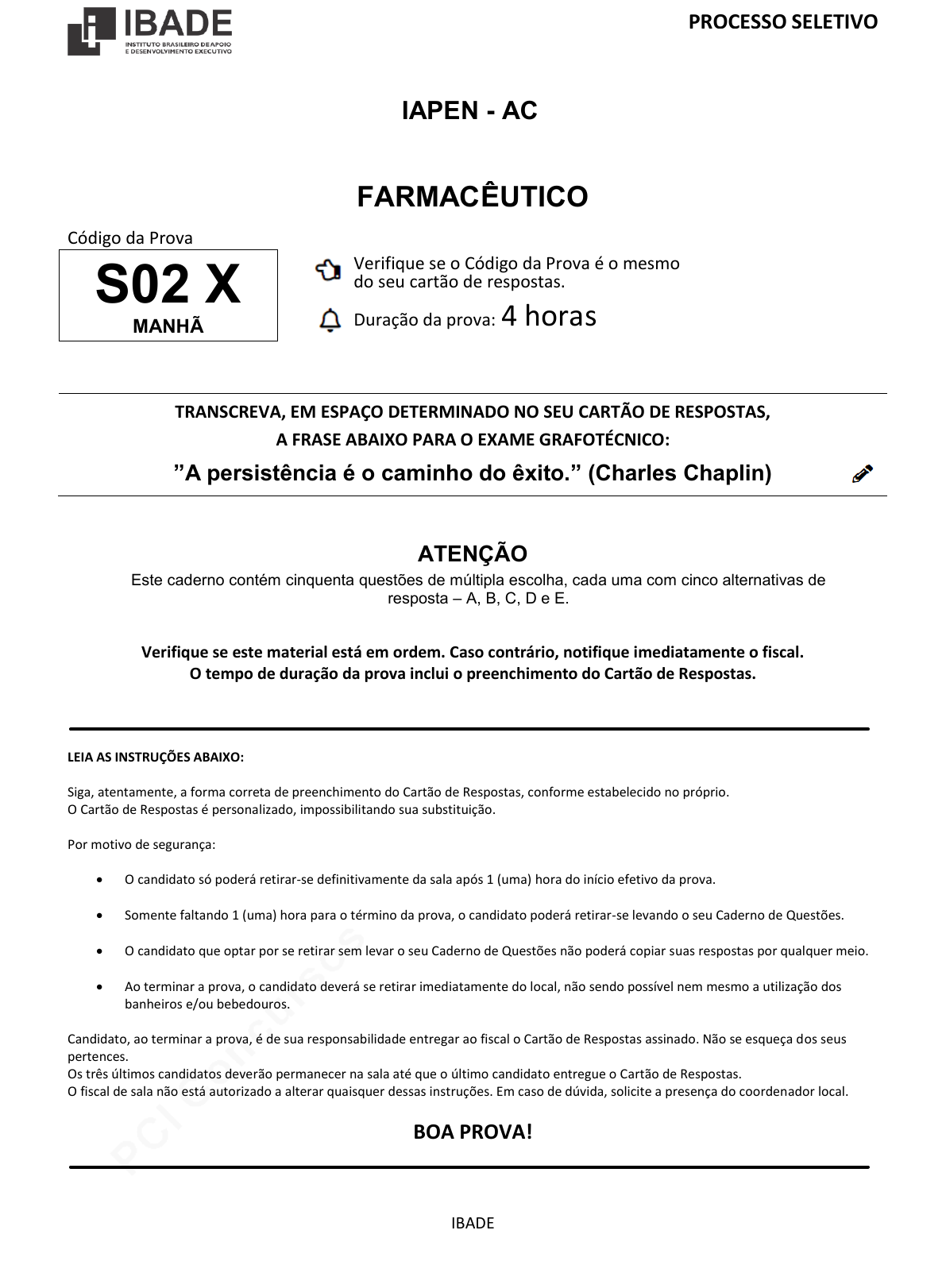 pcimarkpci MDAwMDowMDAwOjAwMDA6MDAwMDowMDAwOmZmZmY6MzZlOTpjMjU5:VGh1LCAxNiBTZXAgMjAyMSAwMDo1MjoxMyAtMDMwMA== IBADE IAPEN - AC FARMACÊUTICO Código da Prova S02 X Verifique se o Código da Prova é o mesmo do seu cartão de respostas. Duração da prova: 4 horas MANHÃ TRANSCREVA, EM ESPAÇO DETERMINADO NO SEU CARTÃO DE RESPOSTAS, A FRASE ABAIXO PARA O EXAME GRAFOTÉCNICO: ”A persistência é o caminho do êxito.” (Charles Chaplin) ATENÇÃO Este caderno contém cinquenta questões de múltipla escolha, cada uma com cinco alternativas de resposta – A, B, C, D e E. Verifique se este material está em ordem. Caso contrário, notifique imediatamente o fiscal. O tempo de duração da prova inclui o preenchimento do Cartão de Respostas. LEIA AS INSTRUÇÕES ABAIXO: Siga, atentamente, a forma correta de preenchimento do Cartão de Respostas, conforme estabelecido no próprio. O Cartão de Respostas é personalizado, impossibilitando sua substituição. Por motivo de segurança: O candidato só poderá retirar-se definitivamente da sala após 1 (uma) hora do início efetivo da prova. Somente faltando 1 (uma) hora para o término da prova, o candidato poderá retirar-se levando o seu Caderno de Questões. O candidato que optar por se retirar sem levar o seu Caderno de Questões não poderá copiar suas respostas por qualquer meio. Ao terminar a prova, o candidato deverá se retirar imediatamente do local, não sendo possível nem mesmo a utilização dos banheiros e/ou bebedouros. Candidato, ao terminar a prova, é de sua responsabilidade entregar ao fiscal o Cartão de Respostas assinado. Não se esqueça dos seus pertences. Os três últimos candidatos deverão permanecer na sala até que o último candidato entregue o Cartão de Respostas. O fiscal de sala não está autorizado a alterar quaisquer dessas instruções. Em caso de dúvida, solicite a presença do coordenador local. BOA PROVA! PROCESSO SELETIVO pcimarkpci MDAwMDowMDAwOjAwMDA6MDAwMDowMDAwOmZmZmY6MzZlOTpjMjU5:VGh1LCAxNiBTZXAgMjAyMSAwMDo1MjoxMyAtMDMwMA== IAPEN - AC IBADE FARMACÊUTICO Tipo X – Página 1 LÍNGUA PORTUGUESA Texto 1 Partilhar Rubel Se for preciso, eu pego um barco, eu remo Por seis meses, como peixe pra te ver Tão pra inventar um mar grande o bastante Que me assuste e que eu desista de você Se for preciso, eu crio alguma máquina Mais rápida que a dúvida, mais súbita que a lágrima Viajo a toda força, e num instante de saudade e dor Eu chego pra dizer que eu vim te ver Eu quero partilhar Eu quero partilhar A vida boa com você Eu quero partilhar Eu quero partilhar A vida boa com você Que amor tão grande tem que ser vivido a todo instante E a cada hora que eu tô longe, é um desperdício Eu só tenho 80 anos pela frente Por favor, me dá uma chance de viver Que amor tão grande tem que ser vivido a todo instante E a cada hora que eu tô longe, é um desperdício Eu só tenho 80 anos pela frente Por favor, me dá uma chance de viver Eu quero partilhar Eu quero partilhar A vida boa com você Eu quero partilhar Eu quero partilhar A vida boa com você Se for preciso, eu pego um barco, eu remo Por seis meses, como peixe pra te ver Tão pra inventar um mar grande o bastante Que me assuste, e que eu desista de você Se for preciso, eu crio alguma máquina Mais rápida que a dúvida, mais súbita que a lágrima Viajo a toda força, e num instante de saudade e dor Eu chego pra dizer que eu vim te ver Eu quero partilhar Eu quero partilhar A vida boa com você Eu quero partilhar Eu quero partilhar A vida boa com você Eu quero partilhar Eu quero partilhar A vida boa com você Eu quero partilhar Eu quero partilhar A vida boa com você Não tem, pra trás, nada Tudo que ficou tá aqui Se for preciso, eu giro a Terra inteira Até que o tempo se esqueça de ir pra frente e volte atrás Milhões de anos, quando todos continentes se encontravam Pra que eu possa caminhar até você Eu sei, mulher, não se vive só de peixe, nem se volta no passado As minhas palavras valem pouco e as juras não te dizem nada Mas se existe alguém que pode resgatar sua fé no mundo, existe nós Também perdi o meu rumo, até meu canto ficou mudo E eu desconfio que esse mundo já não seja tudo aquilo Mas não importa, a gente inventa a nossa vida E a vida é boa, mas é muito melhor com você Eu quero partilhar Eu quero partilhar A vida boa com você (até o final) Questão 1 São características do texto lido: (A) uso de linguagem formal a fim de convencer o leitor sobre as intenções de amor do autor. (B) emprego de linguagem denotativa de maneira que isso represente credibilidade ao leitor sobre o sentir do autor. (C) utilização de ideias sentimentais presas à realidade de futuro oferecida pelo autor. (D) despreocupação com o ritmo, seleção aleatória de palavras, o que resulta obrigatoriamente em rima. (E) presença de versos, agrupados em estrofes, os quais se apoiam em métrica (fixa ou não), em rimas regulares (ou não), mas tendo no ritmo a sua marca essencial intencionando prazer estético do leitor. Questão 2 Assinale a alternativa em que os vocábulos sejam acentuados pelas mesmas regras presentes em, respectivamente, “você”, “súbita” e “desperdício”: (A) café, rápido, índio. (B) tô, vêm, lá. (C) língua, está, convém. (D) açúcar, tórax, cajú. (E) álbum, tá, tênis. pcimarkpci MDAwMDowMDAwOjAwMDA6MDAwMDowMDAwOmZmZmY6MzZlOTpjMjU5:VGh1LCAxNiBTZXAgMjAyMSAwMDo1MjoxMyAtMDMwMA== IAPEN - AC IBADE FARMACÊUTICO Tipo X – Página 2 Questão 3 Tratando-se de uma canção, o gênero textual exibe desvios quanto ao emprego de língua portuguesa no tocante à norma-padrão, por exemplo, em: “Por favor, me dá uma chance de viver”, assinale a alternativa correta quanto ao emprego de pronome: (A) “Te amei mais que a mim, bem mais que a mim.” (B) “Deixe-me sozinho porque assim eu viverei em paz.” (C) “Me liga, me manda um telegrama.” (D) “Molha eu, seca eu, deixa que eu seja o céu.
