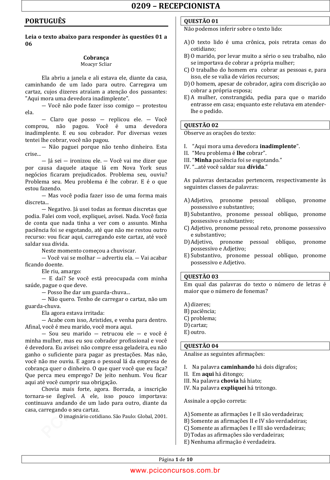 pcimarkpci MDAwMDowMDAwOjAwMDA6MDAwMDowMDAwOmZmZmY6MzZlOTpjMjU5:RnJpLCAxMCBTZXAgMjAyMSAyMDoxMDo0OSAtMDMwMA== 0209 – RECEPCIONISTA Página 1 de 10 PORTUGUÊS Leia o texto abaixo para responder às questões 01 a 06 Cobrança Moacyr Scliar Ela abriu a janela e ali estava ele, diante da casa, caminhando de um lado para outro. Carregava um cartaz, cujos dizeres atraíam a atenção dos passantes: "Aqui mora uma devedora inadimplente". ― Você não pode fazer isso comigo ― protestou ela. ― Claro que posso ― replicou ele. ― Você comprou, não pagou. Você é uma devedora inadimplente. E eu sou cobrador. Por diversas vezes tentei lhe cobrar, você não pagou. ― Não paguei porque não tenho dinheiro. Esta crise... ― Já sei ― ironizou ele. ― Você vai me dizer que por causa daquele ataque lá em Nova York seus negócios ficaram prejudicados. Problema seu, ouviu? Problema seu. Meu problema é lhe cobrar. E é o que estou fazendo. ― Mas você podia fazer isso de uma forma mais discreta... ― Negativo. Já usei todas as formas discretas que podia. Falei com você, expliquei, avisei. Nada. Você fazia de conta que nada tinha a ver com o assunto. Minha paciência foi se esgotando, até que não me restou outro recurso: vou ficar aqui, carregando este cartaz, até você saldar sua dívida. Neste momento começou a chuviscar. ― Você vai se molhar ― advertiu ela. ― Vai acabar ficando doente. Ele riu, amargo: ― E daí? Se você está preocupada com minha saúde, pague o que deve. ― Posso lhe dar um guarda-chuva... ― Não quero. Tenho de carregar o cartaz, não um guarda-chuva. Ela agora estava irritada: ― Acabe com isso, Aristides, e venha para dentro. Afinal, você é meu marido, você mora aqui. ― Sou seu marido ― retrucou ele ― e você é minha mulher, mas eu sou cobrador profissional e você é devedora. Eu avisei: não compre essa geladeira, eu não ganho o suficiente para pagar as prestações. Mas não, você não me ouviu. E agora o pessoal lá da empresa de cobrança quer o dinheiro. O que quer você que eu faça? Que perca meu emprego? De jeito nenhum. Vou ficar aqui até você cumprir sua obrigação. Chovia mais forte, agora. Borrada, a inscrição tornara-se ilegível. A ele, isso pouco importava: continuava andando de um lado para outro, diante da casa, carregando o seu cartaz. O imaginário cotidiano. São Paulo: Global, 2001. QUESTÃO 01 Não podemos inferir sobre o texto lido: A) O texto lido é uma crônica, pois retrata cenas do cotidiano; B) O marido, por levar muito a sério o seu trabalho, não se importava de cobrar a própria mulher; C) O trabalho do homem era cobrar as pessoas e, para isso, ele se valia de vários recursos; D) O homem, apesar de cobrador, agira com discrição ao cobrar a própria esposa; E) A mulher, constrangida, pedia para que o marido entrasse em casa; enquanto este relutava em atender- lhe o pedido. QUESTÃO 02 Observe as orações do texto: I. “Aqui mora uma devedora inadimplente". II. “Meu problema é lhe cobrar”. III. “Minha paciência foi se esgotando.” IV. “...até você saldar sua dívida.” As palavras destacadas pertencem, respectivamente às seguintes classes de palavras: A) Adjetivo, pronome pessoal oblíquo, pronome possessivo e substantivo; B) Substantivo, pronome pessoal oblíquo, pronome possessivo e substantivo; C) Adjetivo, pronome pessoal reto, pronome possessivo e substantivo; D) Adjetivo, pronome pessoal oblíquo, pronome possessivo e Adjetivo; E) Substantivo, pronome pessoal oblíquo, pronome possessivo e Adjetivo. QUESTÃO 03 Em qual das palavras do texto o número de letras é maior que o número de fonemas? A) dizeres; B) paciência; C) problema; D) cartaz; E) outro. QUESTÃO 04 Analise as seguintes afirmações: I. Na palavra caminhando há dois dígrafos; II. Em aqui há ditongo; III. Na palavra chovia há hiato; IV. Na palavra expliquei há tritongo. Assinale a opção correta: A) Somente as afirmações I e II são verdadeiras; B) Somente as afirmações II e IV são verdadeiras; C) Somente as afirmações I e III são verdadeiras; D) Todas as afirmações são verdadeiras; E) Nenhuma afirmação é verdadeira. www.pciconcursos.com.br www.pciconcursos.com.br pcimarkpci MDAwMDowMDAwOjAwMDA6MDAwMDowMDAwOmZmZmY6MzZlOTpjMjU5:RnJpLCAxMCBTZXAgMjAyMSAyMDoxMDo0OSAtMDMwMA== 0209 – RECEPCIONISTA Página 2 de 10 QUESTÃO 05 Qual tempo verbal predomina no texto? A) Presente; B) Pretérito perfeito; C) Pretérito imperfeito; D) Futuro do presente; E) Futuro do pretérito. QUESTÃO 06 Assinale a alternativa em que a palavra destacada das frases do texto é um artigo definido: A) “Aqui mora uma devedora inadimplente"; B) “Neste momento começou a chuviscar”; C) “A ele, isso pouco importava, ...”; D) “Carregava um cartaz, cujos dizeres atraíam a atenção dos passantes, ...”; E) “Neste momento começou a chuviscar”. QUESTÃO 07 Marque a opção em que não há erro na flexão de número dos adjetivos destacados: A) Comprou duas blusas azul-marinhos; B) As paredes eram pintadas de tintas amarelas- canário; C) Foram cumpridos vários acordos Lusos-brasileiros; D) As clínicas médicas-dentárias estavam em pleno funcionamento; E) Os rapazes surdos-mudos estavam se divertindo na festa. Observe a tirinha para responder às questões 08 e 09. QUESTÃO 08 O numeral que aparece na frase: “Bem vindo ao seu primeiro dia de dieta, Garfield” tem a seguinte classificação: A) Ordinal; B) Cardinal; C) Fracionário; D) Multiplicativo; E) Coletivo. QUESTÃO 09 Que palavra é sinônimo de abnegação no segundo quadrinho? A) Egocentrismo; B) Altruísmo; C) Comodismo; D) Inconformismo; E) Egoísmo. QUESTÃO 10 Assinale o item em que todas as palavras são grafadas corretamente: A) Sacerdotisa, puzesse, mausoléu, litígio; B) Blindagem, jirau, enxaqueca, assobiar; C) Gerimum, antiofídico, antevéspera, pajé; D) Faisão, ojeriza, quisesse, encherido; E) Encharcado, encher, giboi