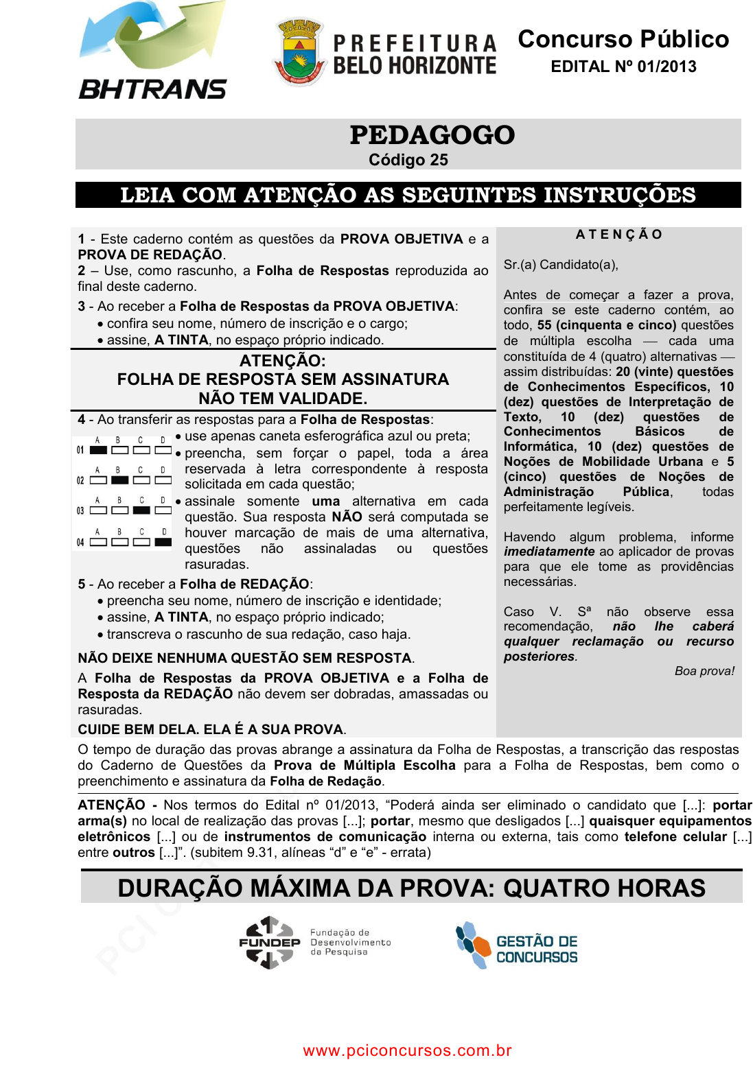pcimarkpci MDAwMDowMDAwOjAwMDA6MDAwMDowMDAwOmZmZmY6MzZlOTpjMjU5:U3VuLCAxMiBTZXAgMjAyMSAwNDoxMTozMCAtMDMwMA== Concurso Público EDITAL Nº 01/2013 PEDAGOGO Código 25 LEIA COM ATENÇÃO AS SEGUINTES INSTRUÇÕES 1 - Este caderno contém as questões da PROVA OBJETIVA e a PROVA DE REDAÇÃO. 2 – Use, como rascunho, a Folha de Respostas reproduzida ao final deste caderno. 3 - Ao receber a Folha de Respostas da PROVA OBJETIVA: confira seu nome, número de inscrição e o cargo; assine, A TINTA, no espaço próprio indicado. ATENÇÃO: FOLHA DE RESPOSTA SEM ASSINATURA NÃO TEM VALIDADE. 4 - Ao transferir as respostas para a Folha de Respostas: use apenas caneta esferográfica azul ou preta; preencha, sem forçar o papel, toda a área reservada à letra correspondente à resposta solicitada em cada questão; assinale somente uma alternativa em cada questão. Sua resposta NÃO será computada se houver marcação de mais de uma alternativa, questões não assinaladas ou questões rasuradas. 5 - Ao receber a Folha de REDAÇÃO: preencha seu nome, número de inscrição e identidade; assine, A TINTA, no espaço próprio indicado; transcreva o rascunho de sua redação, caso haja. NÃO DEIXE NENHUMA QUESTÃO SEM RESPOSTA. A Folha de Respostas da PROVA OBJETIVA e a Folha de Resposta da REDAÇÃO não devem ser dobradas, amassadas ou rasuradas. CUIDE BEM DELA. ELA É A SUA PROVA. A T E N Ç Ã O Sr.(a) Candidato(a), Antes de começar a fazer a prova, confira se este caderno contém, ao todo, 55 (cinquenta e cinco) questões de múltipla escolha cada uma constituída de 4 (quatro) alternativas assim distribuídas: 20 (vinte) questões de Conhecimentos Específicos, 10 (dez) questões de Interpretação de Texto, 10 (dez) questões de Conhecimentos Básicos de Informática, 10 (dez) questões de Noções de Mobilidade Urbana e 5 (cinco) questões de Noções de Administração Pública, todas perfeitamente legíveis. Havendo algum problema, informe imediatamente ao aplicador de provas para que ele tome as providências necessárias. Caso V. Sª não observe essa recomendação, não lhe caberá qualquer reclamação ou recurso posteriores. Boa prova! O tempo de duração das provas abrange a assinatura da Folha de Respostas, a transcrição das respostas do Caderno de Questões da Prova de Múltipla Escolha para a Folha de Respostas, bem como o preenchimento e assinatura da Folha de Redação. ATENÇÃO - Nos termos do Edital nº 01/2013, “Poderá ainda ser eliminado o candidato que [...]: portar arma(s) no local de realização das provas [...]; portar, mesmo que desligados [...] quaisquer equipamentos eletrônicos [...] ou de instrumentos de comunicação interna ou externa, tais como telefone celular [...] entre outros [...]”. (subitem 9.31, alíneas “d” e “e” - errata) DURAÇÃO MÁXIMA DA PROVA: QUATRO HORAS www.pciconcursos.com.br pcimarkpci MDAwMDowMDAwOjAwMDA6MDAwMDowMDAwOmZmZmY6MzZlOTpjMjU5:U3VuLCAxMiBTZXAgMjAyMSAwNDoxMTozMCAtMDMwMA== 2 25 – Pedagogo www.pciconcursos.com.br pcimarkpci MDAwMDowMDAwOjAwMDA6MDAwMDowMDAwOmZmZmY6MzZlOTpjMjU5:U3VuLCAxMiBTZXAgMjAyMSAwNDoxMTozMCAtMDMwMA== 3 25 – Pedagogo Conhecimentos Específicos Questão 1 Zabala (1998) considera que a educação deve contemplar conteúdos de natureza variada: factuais, conceituais, procedimentais e atitudinais. Numere a COLUNA II de acordo com a COLUNA I associando as tipologias de conteúdos com a forma de aprendizagem correspondente. COLUNA I COLUNA II 1. Conteúdos factuais. 2. Conteúdos conceituais. 3. Conteúdos procedimentais. 4. Conteúdos atitudinais. ( ) Considera-se que o indivíduo aprendeu tal conteúdo quando se apropria dele levando a uma revisão e avaliação da própria conduta. ( ) Considera-se que o indivíduo aprendeu tal conteúdo quando é capaz de reproduzi-lo de forma literal ou o mais próximo possível do original. ( ) Considera-se que o indivíduo aprendeu tal conteúdo quando é capaz de realizá-lo e aplicá-lo em contextos diferenciados. ( ) Considera-se que o indivíduo aprendeu tal conteúdo quando compreende o seu significado e sua funcionalidade. Assinale a alternativa que representa a sequência CORRETA. A) 4 1 3 2. B) 3 4 1 2. C) 2 3 4 1. D) 1 3 2 4. www.pciconcursos.com.br pcimarkpci MDAwMDowMDAwOjAwMDA6MDAwMDowMDAwOmZmZmY6MzZlOTpjMjU5:U3VuLCAxMiBTZXAgMjAyMSAwNDoxMTozMCAtMDMwMA== 4 25 – Pedagogo Questão 2 Leia este trecho. “Do conjunto de relações interativas necessárias para facilitar a aprendizagem se deduz uma série de funções dos professores, que tem como ponto de partida o próprio planejamento” (ZABALA, 1998, p. 92). Caracterizam corretamente essas funções, EXCETO: A) Ter um plano de ação detalhado que possa definir previamente as diferentes situações do processo de ensino e aprendizagem. B) Contar com as contribuições e os conhecimentos dos alunos, tanto no início das atividades, quanto durante sua realização. C) Estabelecer metas ao alcance dos alunos para que possam ser superadas com o esforço e a ajuda necessários. D) Promover canais de comunicação que regulem os processos de negociação, participação e construção. Questão 3 Sobre as fases do processo de avaliação apresentado por Zabala (1988), é CORRETO afirmar que A) a avaliação inicial consiste em conhecer o que cada aluno sabe, favorecendo um trabalho de nivelamento antes de se iniciar o conteúdo pretendido. B) a avaliação reguladora consiste em conhecer como cada aluno aprende ao longo do processo de ensino e aprendizagem, favorecendo a sua adaptação à metodologia. C) a avaliação integradora consiste em conhecer todo o percurso do aluno sendo uma compreensão e valoração sobre o processo seguido. D) a avaliação global consiste em conhecer os resultados obtidos e os conhecimentos adquiridos ao final do processo. www.pciconcursos.com.br pcimarkpci MDAwMDowMDAwOjAwMDA6MDAwMDowMDAwOmZmZmY6MzZlOTpjMjU5:U3VuLCAxMiBTZXAgMjAyMSAwNDoxMTozMCAtMDMwMA== 5 25 – Pedagogo Q