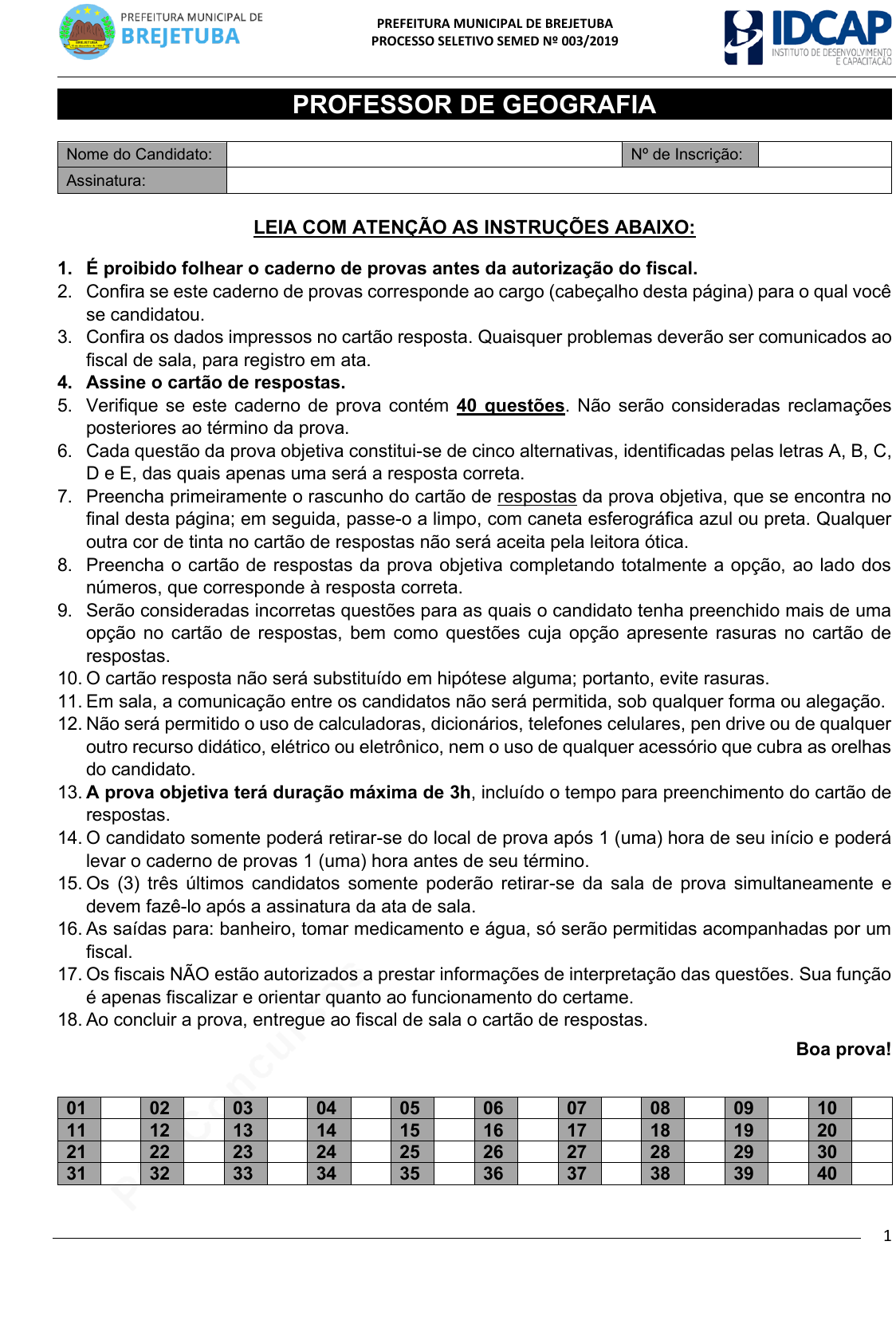 pcimarkpci MDAwMDowMDAwOjAwMDA6MDAwMDowMDAwOmZmZmY6MzZlOTpjMjU5:U3VuLCAxMiBTZXAgMjAyMSAyMjowOTowMSAtMDMwMA== PREFEITURA MUNICIPAL DE BREJETUBA PROCESSO SELETIVO SEMED Nº 003/2019 1 PROFESSOR DE GEOGRAFIA Nome do Candidato: Nº de Inscrição: Assinatura: LEIA COM ATENÇÃO AS INSTRUÇÕES ABAIXO: 1. É proibido folhear o caderno de provas antes da autorização do fiscal. 2. Confira se este caderno de provas corresponde ao cargo (cabeçalho desta página) para o qual você se candidatou. 3. Confira os dados impressos no cartão resposta. Quaisquer problemas deverão ser comunicados ao fiscal de sala, para registro em ata. 4. Assine o cartão de respostas. 5. Verifique se este caderno de prova contém 40 questões. Não serão consideradas reclamações posteriores ao término da prova. 6. Cada questão da prova objetiva constitui-se de cinco alternativas, identificadas pelas letras A, B, C, D e E, das quais apenas uma será a resposta correta. 7. Preencha primeiramente o rascunho do cartão de respostas da prova objetiva, que se encontra no final desta página; em seguida, passe-o a limpo, com caneta esferográfica azul ou preta. Qualquer outra cor de tinta no cartão de respostas não será aceita pela leitora ótica. 8. Preencha o cartão de respostas da prova objetiva completando totalmente a opção, ao lado dos números, que corresponde à resposta correta. 9. Serão consideradas incorretas questões para as quais o candidato tenha preenchido mais de uma opção no cartão de respostas, bem como questões cuja opção apresente rasuras no cartão de respostas. 10. O cartão resposta não será substituído em hipótese alguma; portanto, evite rasuras. 11. Em sala, a comunicação entre os candidatos não será permitida, sob qualquer forma ou alegação. 12. Não será permitido o uso de calculadoras, dicionários, telefones celulares, pen drive ou de qualquer outro recurso didático, elétrico ou eletrônico, nem o uso de qualquer acessório que cubra as orelhas do candidato. 13. A prova objetiva terá duração máxima de 3h, incluído o tempo para preenchimento do cartão de respostas. 14. O candidato somente poderá retirar-se do local de prova após 1 (uma) hora de seu início e poderá levar o caderno de provas 1 (uma) hora antes de seu término. 15. Os (3) três últimos candidatos somente poderão retirar-se da sala de prova simultaneamente e devem fazê-lo após a assinatura da ata de sala. 16. As saídas para: banheiro, tomar medicamento e água, só serão permitidas acompanhadas por um fiscal. 17. Os fiscais NÃO estão autorizados a prestar informações de interpretação das questões. Sua função é apenas fiscalizar e orientar quanto ao funcionamento do certame. 18. Ao concluir a prova, entregue ao fiscal de sala o cartão de respostas. Boa prova! 01 02 03 04 05 06 07 08 09 10 11 12 13 14 15 16 17 18 19 20 21 22 23 24 25 26 27 28 29 30 31 32 33 34 35 36 37 38 39 40 pcimarkpci MDAwMDowMDAwOjAwMDA6MDAwMDowMDAwOmZmZmY6MzZlOTpjMjU5:U3VuLCAxMiBTZXAgMjAyMSAyMjowOTowMSAtMDMwMA== PREFEITURA MUNICIPAL DE BREJETUBA PROCESSO SELETIVO SEMED Nº 003/2019 2 RASCUNHO pcimarkpci MDAwMDowMDAwOjAwMDA6MDAwMDowMDAwOmZmZmY6MzZlOTpjMjU5:U3VuLCAxMiBTZXAgMjAyMSAyMjowOTowMSAtMDMwMA== PREFEITURA MUNICIPAL DE BREJETUBA PROCESSO SELETIVO SEMED Nº 003/2019 3 LÍNGUA PORTUGUESA Os três pássaros do rei Herodes (lenda) Pela triste estrada de Belém, a Virgem Maria, tendo o Menino Jesus ao colo, fugia do rei Herodes. Aflita e triste ia em meio do caminho quando encontrou um pombo, que lhe perguntou: – Para onde vais, Maria? – Fugimos da maldade do rei Herodes, – respondeu ela. Mas como naquele momento se ouvisse o tropel dos soldados que a perseguiam, o pombo voou assustado. Continuou Maria a desassossegada viagem e, pouco adiante, encontrou uma codorniz que lhe fez a mesma pergunta que o pombo e, tal qual este, inteirada do perigo, tratou de fugir. Finalmente, encontrou-se com uma cotovia, que, assim que soube do perigo que assustava a Virgem, escondeu-a e ao menino, atrás de cerrado grupo de árvores que ali existia. Os soldados de Herodes encontraram o pombo e dele souberam o caminho seguido pelos fugitivos. Mais para a frente a codorniz não hesitou em seguir o exemplo do pombo. Ao fim de algum tempo de marcha, surgiram à frente da cotovia. – Viste passar por aqui uma moça com uma criança no regaço? – Vi, sim – respondeu o pequenino pássaro – Foram por ali. E indicou aos soldados um caminho que se via ao longe. E assim afastou da Virgem e de Jesus os seus malvados perseguidores. Deus castigou o pombo e a codorniz. O primeiro, que tinha uma linda voz, passou a emitir, desde então, um eterno queixume. A segunda passou a voar tão baixo, tão baixo, que se tornou presa fácil de qualquer caçador inexperiente. E a cotovia recebeu o prêmio de ser a esplêndida anunciadora do sol a cada dia que desponta. Fonte (adaptada): https://armazemdetexto.blogspot.com/2017/11/lend a-os-tres-passaros-do-rei-herodes.html. 01. A estrutura do texto acima indica que: a) Temos presença da descrição como tipologia preponderante. b) O discurso direto livre indica que temos uma notícia. c) A presença de seres inanimados em diálogo com humanos indica um apólogo. d) Baseia-se em um fato verídico, que realmente ocorreu. e) Caracteriza-se como narrativa, uma vez que apresenta conflito. 02. Com relação à expressão: “Fugimos da maldade do rei Herodes”, podemos afirmar que: a) O sujeito da frase é indeterminado. b) O sujeito da frase (nós) é composto. c) Temos a presença de um sujeito desinencial (nós). d) A oração não possui sujeito. e) O sujeito da oração é simples. 03. O sentido das palavras equivale, no texto, aos seus respectivos sinônimos, exceto: a) Tropel – animais movendo-se em desordem. b) Cerrado – bioma do tipo savana. c) Regaço – na posição sentada; colo. d) Queixume – alarido. e) Aflita – amargurada. 04. No período “Finalmente, encontrou-se c