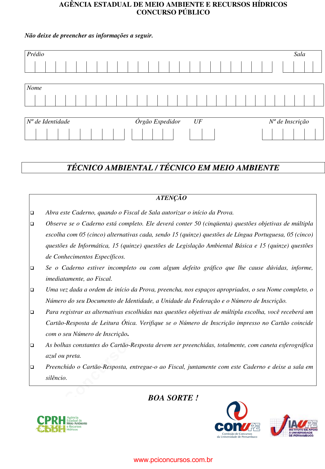 pcimarkpci MDAwMDowMDAwOjAwMDA6MDAwMDowMDAwOmZmZmY6MzZlOTpjMjU5:U2F0LCAxMSBTZXAgMjAyMSAwMjowNzoxOSAtMDMwMA== AGÊNCIA ESTADUAL DE MEIO AMBIENTE E RECURSOS HÍDRICOS CONCURSO PÚBLICO Não deixe de preencher as informações a seguir. Prédio Sala Nome Nº de Identidade Órgão Expedidor UF Nº de Inscrição TTÉÉCCNNIICCOO AAMMBBIIEENNTTAALL // TTÉÉCCNNIICCOO EEMM MMEEIIOO AAMMBBIIEENNTTEE ATENÇÃO �� Abra este Caderno, quando o Fiscal de Sala autorizar o início da Prova. �� Observe se o Caderno está completo. Ele deverá conter 50 (cinqüenta) questões objetivas de múltipla escolha com 05 (cinco) alternativas cada, sendo 15 (quinze) questões de Língua Portuguesa, 05 (cinco) questões de Informática, 15 (quinze) questões de Legislação Ambiental Básica e 15 (quinze) questões de Conhecimentos Específicos. �� Se o Caderno estiver incompleto ou com algum defeito gráfico que lhe cause dúvidas, informe, imediatamente, ao Fiscal. �� Uma vez dada a ordem de início da Prova, preencha, nos espaços apropriados, o seu Nome completo, o Número do seu Documento de Identidade, a Unidade da Federação e o Número de Inscrição. �� Para registrar as alternativas escolhidas nas questões objetivas de múltipla escolha, você receberá um Cartão-Resposta de Leitura Ótica. Verifique se o Número de Inscrição impresso no Cartão coincide com o seu Número de Inscrição. �� As bolhas constantes do Cartão-Resposta devem ser preenchidas, totalmente, com caneta esferográfica azul ou preta. �� Preenchido o Cartão-Resposta, entregue-o ao Fiscal, juntamente com este Caderno e deixe a sala em silêncio. BOA SORTE ! www.pciconcursos.com.br pcimarkpci MDAwMDowMDAwOjAwMDA6MDAwMDowMDAwOmZmZmY6MzZlOTpjMjU5:U2F0LCAxMSBTZXAgMjAyMSAwMjowNzoxOSAtMDMwMA== 2 LÍNGUA PORTUGUESA TEXTO 01 para as questões de 01 a 08. ESTADO MAPEIA IMPACTO DO AQUECIMENTO EM 9 CULTURAS Os pesquisadores já sabiam que o aquecimento global trará impactos à agricultura, com redução de áreas propícias ao plantio, principalmente no Semi-Árido. Agora, eles mediram de quanto será essa perda em nove espécies de interesse econômico e chegaram a números desanimadores. Em 2020, a redução das terras favoráveis à mandioca, por exemplo, vai variar de 2,5% a 3,1%, dependendo do aumento da temperatura. O Sertão e o Agreste serão as áreas onde o cultivo da raiz sofrerá mais prejuízos em todo o Brasil. No sul, ao contrário, as mudanças climáticas serão favoráveis. “Isso é um dado preocupante, levando-se em conta que a planta está na base da alimentação da população nordestina”, afirma um dos autores do estudo. O algodão é outra planta de importância econômica para a região que a pesquisa aponta como suscetível ao aquecimento. Ao contrário, a cana-de-açúcar será favorecida pelo aumento da temperatura global. Os resultados obtidos neste estudo permitem concluir que o sistema agrícola de lavouras anuais não deverá crescer até 2020 da mesma maneira como cresceu na última década. Uma das alternativas apontadas para enfrentar mudanças climáticas na região é o desenvolvimento de outras culturas, como a palma e o umbuzeiro. “São plantas que fornecem não só o alimento como também renda”, diz o engenheiro agrícola. JORNAL DO COMMERCIO. Ciência/Meio Ambiente. Caderno Cidades. Recife, 12 de agosto de 2008. p. 4. 01. Interpretando o trecho “...trará impactos à agricultura, com redução de áreas propícias ao plantio, principalmente no Semi-Árido.” é CORRETO afirmar que A) todas as áreas sofrerão redução no plantio, com exceção daquelas que congregam a região semi-árida. B) em diversas áreas, o plantio será beneficiado com algumas reduções. C) o plantio será reduzido em algumas áreas, sobretudo no Semi-Árido. D) exclusivamente as áreas que pertencem ao Semi-Árido sofrerão impactos na agricultura. E) áreas impróprias ao plantio, situadas no Semi-Árido se sentirão prejudicadas na agricultura. 02. Analise o trecho abaixo. “O Sertão e o Agreste serão as áreas onde o cultivo da raiz sofrerá mais prejuízos em todo o Brasil.” Sobre ele, conclui-se que A) somente o Sertão e o Agreste serão os únicos prejudicados na parte agrícola. B) no âmbito nacional, em relação ao cultivo da raiz, os maiores prejudicados serão o Sertão e o Agreste. C) em todo o Brasil, a raiz sofrerá aumento em sua produção. D) toda área que cultiva a raiz apresentará mudanças benéficas para o Brasil. E) o Brasil será isento de todo o prejuízo em termos de cultivo de raiz. 03. Em qual das alternativas abaixo existe uma idéia que NÃO está declarada no texto 01? A) Em relação ao aquecimento global, o cultivo do algodão não sofrerá qualquer mudança. B) A cana-de-açúcar será beneficiada com a elevação da temperatura. C) Até 2020, o crescimento em relação ao sistema agrícola de lavouras anuais não deverá ser o mesmo, se comparado ao da última década. D) O cultivo da palma e do umbuzeiro surge como alternativa para enfrentar mudanças climáticas. E) A pesquisa se deteve em nove espécies de interesse econômico cujos resultados não se revelaram satisfatórios. 04. Observe o termo sublinhado do trecho abaixo. “O algodão é outra planta de importância econômica para a região que a pesquisa aponta como suscetível ao aquecimento.” Sobre ele, é CORRETO afirmar que A) exprime que, num futuro próximo, o aquecimento atingirá o plantio do algodão. B) com certeza, o algodão será atingido com o aquecimento. C) o algodão corre o risco de sofrer ameaças com o aquecimento. D) todo aquecimento é favorável ao plantio do algodão. E) o plantio do algodão é apontado como uma região que será favorecida com o aquecimento. www.pciconcursos.com.br pcimarkpci MDAwMDowMDAwOjAwMDA6MDAwMDowMDAwOmZmZmY6MzZlOTpjMjU5:U2F0LCAxMSBTZXAgMjAyMSAwMjowNzoxOSAtMDMwMA== 3 05. Sobre CONCORDÂNCIA NOMINAL e VERBAL, analise os itens aba