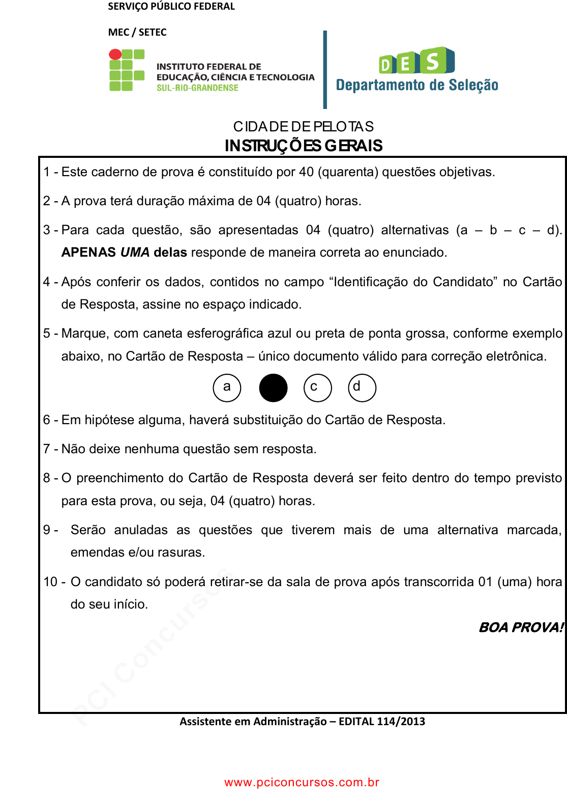 pcimarkpci MDAwMDowMDAwOjAwMDA6MDAwMDowMDAwOmZmZmY6MzZlOTpjMjU5:U2F0LCAxOCBTZXAgMjAyMSAwMDo1MTowMSAtMDMwMA== SERVIÇO PÚBLICO FEDERAL MEC / SETEC CIDADE DE PELOTAS INSTRUÇÕES GERAIS 1 - Este caderno de prova é constituído por 40 (quarenta) questões objetivas. 2 - A prova terá duração máxima de 04 (quatro) horas. 3 - Para cada questão, são apresentadas 04 (quatro) alternativas (a – b – c – d). APENAS UMA delas responde de maneira correta ao enunciado. 4 - Após conferir os dados, contidos no campo “Identificação do Candidato” no Cartão de Resposta, assine no espaço indicado. 5 - Marque, com caneta esferográfica azul ou preta de ponta grossa, conforme exemplo abaixo, no Cartão de Resposta – único documento válido para correção eletrônica. a c d 6 - Em hipótese alguma, haverá substituição do Cartão de Resposta. 7 - Não deixe nenhuma questão sem resposta. 8 - O preenchimento do Cartão de Resposta deverá ser feito dentro do tempo previsto para esta prova, ou seja, 04 (quatro) horas. 9 - Serão anuladas as questões que tiverem mais de uma alternativa marcada, emendas e/ou rasuras. 10 - O candidato só poderá retirar-se da sala de prova após transcorrida 01 (uma) hora do seu início. BOA PROVA! Assistente em Administração – EDITAL 114/2013 www.pciconcursos.com.br pcimarkpci MDAwMDowMDAwOjAwMDA6MDAwMDowMDAwOmZmZmY6MzZlOTpjMjU5:U2F0LCAxOCBTZXAgMjAyMSAwMDo1MTowMSAtMDMwMA== www.pciconcursos.com.br pcimarkpci MDAwMDowMDAwOjAwMDA6MDAwMDowMDAwOmZmZmY6MzZlOTpjMjU5:U2F0LCAxOCBTZXAgMjAyMSAwMDo1MTowMSAtMDMwMA== IFSul – Concurso Público 2013 1 Assistente em Administração - Edital 114/2013 LÍNGUA PORTUGUESA Falência Múltipla Por Lya Luft Um jornalista comentou recentemente num programa de televisão que pediu a um médico 1 seu amigo um diagnóstico do que está ocorrendo no Brasil: infecção, virose? A resposta foi perfeita: 2 “Falência múltipla dos órgãos”. Nada mais acertado. Há quase dez anos realizo aqui na coluna 3 minhas passeatas: estas páginas são minha avenida, as palavras são cartazes. Falo em relações 4 humanas e seus dramas, porém mais frequentemente nas coisas inaceitáveis na nossa vida pública. 5 Esgotei a paciência dos leitores reclamando da péssima educação – milhares de alunos sem escola 6 ou abrigados em galpões e salinhas de fundo de igrejas, para chegarem aos 9, 10 anos sem saber 7 ler nem escrever. Professores desesperados tentando ensinar sem material básico, sem estrutura, 8 salários vergonhosos, estímulo nenhum. Universidades cujo nível é seguidamente baixado: em lugar 9 de darem boas escolas a todas as crianças e jovens para que possam entrar em excelentes 10 universidades por mérito e esforço, oferecem-lhes favorecimentos prejudiciais. 11 Tenho clamado contra o horror da saúde pública, mulheres parindo e velhos morrendo em 12 colchonetes no corredor, consultas para doenças graves marcadas para vários meses depois, 13 médicos exaustos trabalhando além dos seus limites, tentando salvar vidas e confortar os pacientes, 14 sem condições mínimas de higiene, sem aparelhamento e com salário humilhante. Em lugar de 15 importarmos não sei quantos mil médicos estrangeiros, quem sabe vamos ser sensatos e oferecer 16 condições e salários decentes aos médicos brasileiros que querem cuidar de nós? 17 Tenho reclamado das condições de transporte, como no recente artigo “Três senhoras 18 sentadas”: transporte caro para o calamitoso serviço oferecido. “Nos tratam como animais”, 19 reclamou um usuário já idoso. A segurança inexiste, somos mortos ao acaso em nossas ruas, e se 20 procuramos não sair de casa à noite somos fuzilados por um bando na frente de casa às 10 da 21 manhã. 22 E, quando nossa tolerância ou resignação chegou ao limite, brota essa onda humana de 23 busca de dignidade para todos. Não se trata apenas de centavos em passagens, mas de respeito. 24 As vozes dizem NÃO: não aos ônibus sujos e estragados, impontuais, motoristas 25 sobrecarregados; não às escolas fechadas ou em ruínas; não aos professores e médicos impotentes, 26 estradas intransitáveis, medo dentro e fora de casa. Não a um ensino em que a palavra “excelência” 27 chega a parecer abuso ou ironia. Não ao mercado persa de favores e cargos em que transformam 28 nossa política, não aos corruptos às vezes condenados ocupando altos cargos, não ao absurdo 29 número de partidos confusos. 30 As reclamações da multidão nas ruas são tão variadas quanto nossas mazelas: por onde 31 começar? Talvez pelo prático, e imediato, sem planos mirabolantes. Algo há de se poder fazer: não 32 creio que políticos e governo tenham sido apanhados desprevenidos, por mais que estivessem 33 alienados em torres de marfim. 34 Infelizmente todo movimento de massas provoca e abriga sem querer grupos violentos e 35 anárquicos: que isso não nos prejudique nem invalide nossas reivindicações. 36 Não sei como isso vai acabar: espero que transformando o Brasil num lugar melhor para 37 viver. Quase com atraso, a voz das ruas quer lisura, ética, ações, cumprimento de deveres, 38 realização dos mais básicos conceitos de decência e responsabilidade cívica, que andavam trocados 39 por ganância monetária ou ânsia eleitoreira. Que sobrevenham ordem e paz. 40 Que depois desse chamado à consciência de quem lidera e governa não se absolvam os 41 mensaleiros, não se deixem pessoas medíocres ou de ética duvidosa em altos cargos, acabem as 42 gigantescas negociatas meio secretas, e se apliquem decentemente somas que poderão salvar 43 vidas, educar jovens, abrir horizontes. 44 Sou totalmente contrária a qualquer violência, mas este povo chegou ao extremo de sua 45 tolerância, percebeu que tem poder, não quer mais ser enganado e explorado: que não se destrua 46 nada, mas se abram horizontes reais de melhoria e contentamento. 47 Fonte: Revista Veja, 3 de julho de 2013. www.pciconcursos.com.br 