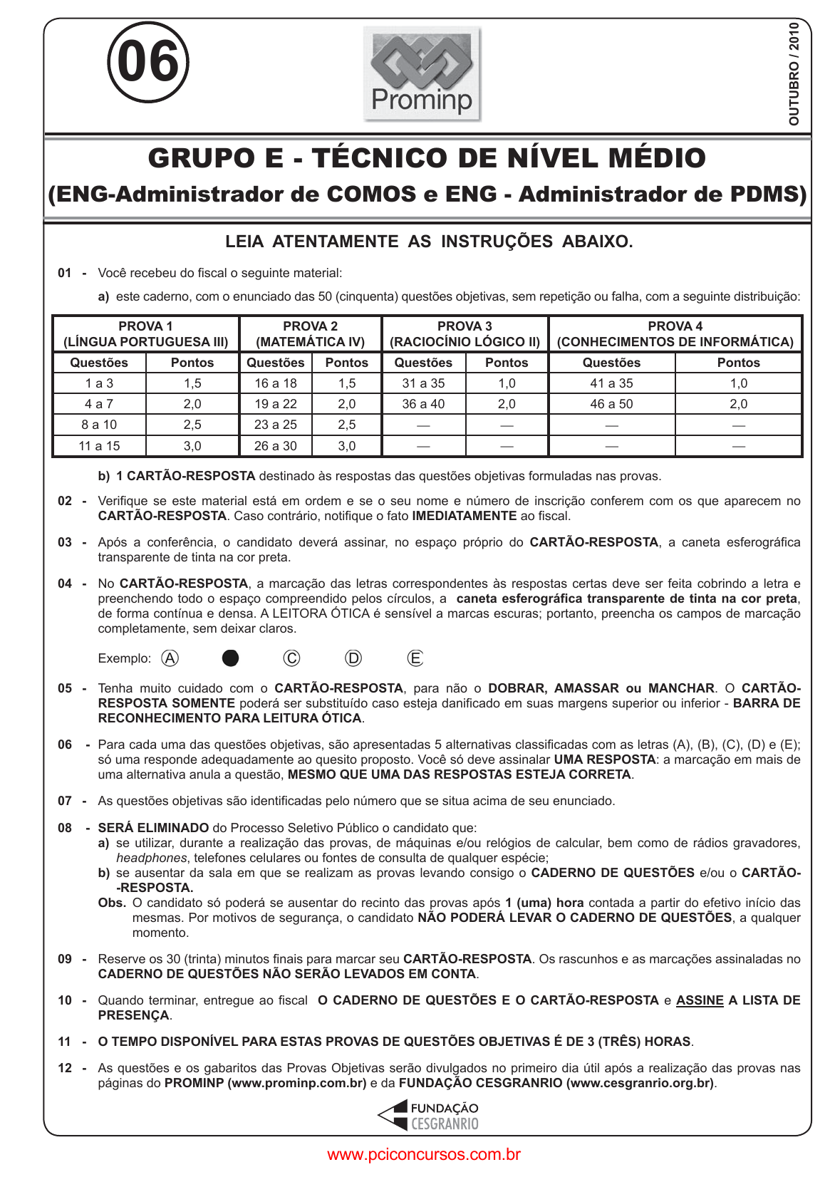pcimarkpci MDAwMDowMDAwOjAwMDA6MDAwMDowMDAwOmZmZmY6MzZlOTpjMjU5:VGh1LCAxNiBTZXAgMjAyMSAyMDo0MzozMCAtMDMwMA== 1 GRUPO E - TÉCNICO DE NÍVEL MÉDIO (ENG-Administrador de COMOS e ENG - Administrador de PDMS) PROVA 1 (LÍNGUA PORTUGUESA III) PROVA 2 (MATEMÁTICA IV) PROVA 3 (RACIOCÍNIO LÓGICO II) PROVA 4 (CONHECIMENTOS DE INFORMÁTICA) Questões Pontos Questões Pontos Questões Pontos Questões Pontos 1 a 3 1,5 16 a 18 1,5 31 a 35 1,0 41 a 35 1,0 4 a 7 2,0 19 a 22 2,0 36 a 40 2,0 46 a 50 2,0 8 a 10 2,5 23 a 25 2,5 − − − − 11 a 15 3,0 26 a 30 3,0 − − − − 06 O U TU B R O / 20 10 GRUPO E - TÉCNICO DE NÍVEL MÉDIO (ENG-Administrador de COMOS e ENG - Administrador de PDMS) LEIA ATENTAMENTE AS INSTRUÇÕES ABAIXO. 01 - Você recebeu do fiscal o seguinte material: a) este caderno, com o enunciado das 50 (cinquenta) questões objetivas, sem repetição ou falha, com a seguinte distribuição: b) 1 CARTÃO-RESPOSTA destinado às respostas das questões objetivas formuladas nas provas. 02 - Verifique se este material está em ordem e se o seu nome e número de inscrição conferem com os que aparecem no CARTÃO-RESPOSTA. Caso contrário, notifique o fato IMEDIATAMENTE ao fiscal. 03 - Após a conferência, o candidato deverá assinar, no espaço próprio do CARTÃO-RESPOSTA, a caneta esferográfica transparente de tinta na cor preta. 04 - No CARTÃO-RESPOSTA, a marcação das letras correspondentes às respostas certas deve ser feita cobrindo a letra e preenchendo todo o espaço compreendido pelos círculos, a caneta esferográfica transparente de tinta na cor preta, de forma contínua e densa. A LEITORA ÓTICA é sensível a marcas escuras; portanto, preencha os campos de marcação completamente, sem deixar claros. Exemplo: 05 - Tenha muito cuidado com o CARTÃO-RESPOSTA, para não o DOBRAR, AMASSAR ou MANCHAR. O CARTÃO- RESPOSTA SOMENTE poderá ser substituído caso esteja danificado em suas margens superior ou inferior - BARRA DE RECONHECIMENTO PARA LEITURA ÓTICA. 06 - Para cada uma das questões objetivas, são apresentadas 5 alternativas classificadas com as letras (A), (B), (C), (D) e (E); só uma responde adequadamente ao quesito proposto. Você só deve assinalar UMA RESPOSTA: a marcação em mais de uma alternativa anula a questão, MESMO QUE UMA DAS RESPOSTAS ESTEJA CORRETA. 07 - As questões objetivas são identificadas pelo número que se situa acima de seu enunciado. 08 - SERÁ ELIMINADO do Processo Seletivo Público o candidato que: a) se utilizar, durante a realização das provas, de máquinas e/ou relógios de calcular, bem como de rádios gravadores, headphones, telefones celulares ou fontes de consulta de qualquer espécie; b) se ausentar da sala em que se realizam as provas levando consigo o CADERNO DE QUESTÕES e/ou o CARTÃO- -RESPOSTA. Obs. O candidato só poderá se ausentar do recinto das provas após 1 (uma) hora contada a partir do efetivo início das mesmas. Por motivos de segurança, o candidato NÃO PODERÁ LEVAR O CADERNO DE QUESTÕES, a qualquer momento. 09 - Reserve os 30 (trinta) minutos finais para marcar seu CARTÃO-RESPOSTA. Os rascunhos e as marcações assinaladas no CADERNO DE QUESTÕES NÃO SERÃO LEVADOS EM CONTA. 10 - Quando terminar, entregue ao fiscal O CADERNO DE QUESTÕES E O CARTÃO-RESPOSTA e ASSINE A LISTA DE PRESENÇA. 11 - O TEMPO DISPONÍVEL PARA ESTAS PROVAS DE QUESTÕES OBJETIVAS É DE 3 (TRÊS) HORAS. 12 - As questões e os gabaritos das Provas Objetivas serão divulgados no primeiro dia útil após a realização das provas nas páginas do PROMINP (www.prominp.com.br) e da FUNDAÇÃO CESGRANRIO (www.cesgranrio.org.br). www.pciconcursos.com.br pcimarkpci MDAwMDowMDAwOjAwMDA6MDAwMDowMDAwOmZmZmY6MzZlOTpjMjU5:VGh1LCAxNiBTZXAgMjAyMSAyMDo0MzozMCAtMDMwMA== GRUPO E - TÉCNICO DE NÍVEL MÉDIO (ENG-Administrador de COMOS e ENG - Administrador de PDMS) 2 LÍNGUA PORTUGUESA III COMO NÃO PENSEI NISSO ANTES? Para ser um inventor, basta enxergar os proble- mas como matéria-prima para a criatividade e apos- tar nas próprias ideias. “No meio do caminho tinha uma pedra/ tinha uma pedra no meio do caminho.” O poeta Carlos Drum- mond de Andrade criou um dos textos mais famosos da literatura brasileira ao buscar inspiração num obs- táculo. De forma parecida, muita gente, famosa ou anônima, no decorrer da história, tem convertido suas dificuldades em criações. Não é difícil perceber que, na origem de todos os objetos criados pelo homem, havia um problema. Foi de tanto machucar os pés ao caminhar descalço que algum remoto ancestral inventou o calçado, por exemplo. Cansado de beber água usando as próprias mãos, alguém concebeu o copo. E por aí vai. Diante de uma pedra no caminho, pode-se la- mentá-la ou tentar removê-la. A primeira opção é a mais fácil, mas não leva a nada. A segunda nos per- mite não só dar um fim ao empecilho, mas também deixar uma contribuição para a humanidade. Foi esse rumo que o motorista de caminhão aposentado José Roberto Rodrigues, de 55 anos, escolheu. Há 15 anos, em um acampamento, José viu um botijão de gás ir pelos ares. Impressionado com o acidente, pôs na cabeça que poderia fazer algo para evitá-lo. Anos depois, teve a ideia: se acondicionasse o botijão dentro de uma estrutura fechada e a conec- tasse com a área externa da casa, o problema estaria resolvido. Afinal, a explosão só acontece se há acú- mulo de gás dentro da cozinha. Estava concebida a cápsula antiexplosão. Para construir a engenhoca, ele pegou um balde grande de plástico, desses usados como lixeira, e fez dois furos: um para a mangueira do botijão e outro para permitir a conexão com o exterior da casa. Se o gás vazar, sai para o ambiente externo. “Fiz tudo sozinho”, orgulha-se José. Tempos depois, inspirado pelas filhas, que vol- ta e meia deixavam a comida queimar, aperfeiçoou o invento. Adicionou-lhe um dispositivo capaz de con- trolar o tempo pelo qual o fogão permanece aceso. Para