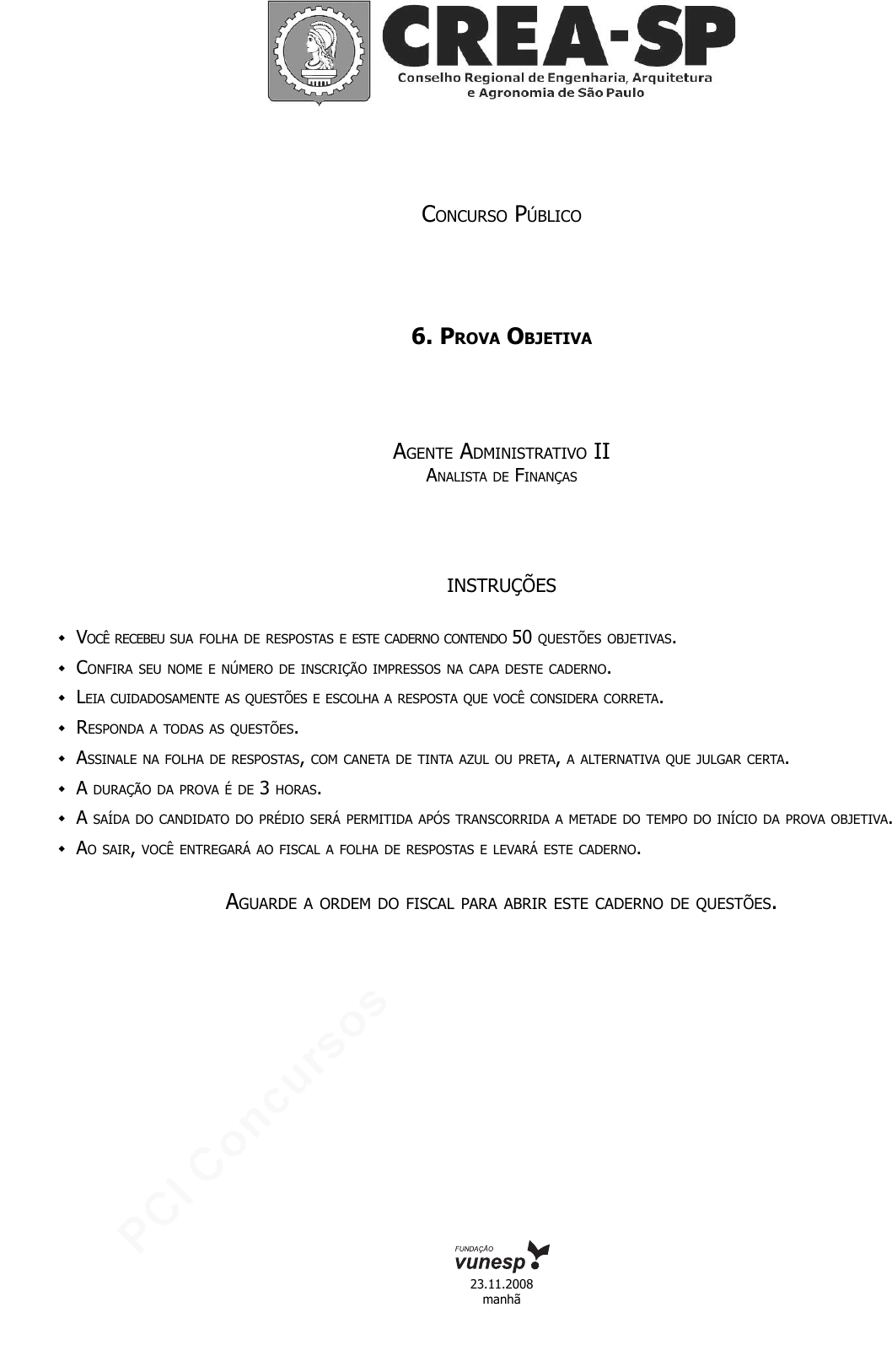 pcimarkpci MDAwMDowMDAwOjAwMDA6MDAwMDowMDAwOmZmZmY6MzZlOTpjMjU5:RnJpLCAxNyBTZXAgMjAyMSAxMDo0MDowOCAtMDMwMA== CONCURSO PÚBLICO 6. PROVA OBJETIVA AGENTE ADMINISTRATIVO II ANALISTA DE FINANÇAS INSTRUÇÕES VOCÊ RECEBEU SUA FOLHA DE RESPOSTAS E ESTE CADERNO CONTENDO 50 QUESTÕES OBJETIVAS. CONFIRA SEU NOME E NÚMERO DE INSCRIÇÃO IMPRESSOS NA CAPA DESTE CADERNO. LEIA CUIDADOSAMENTE AS QUESTÕES E ESCOLHA A RESPOSTA QUE VOCÊ CONSIDERA CORRETA. RESPONDA A TODAS AS QUESTÕES. ASSINALE NA FOLHA DE RESPOSTAS, COM CANETA DE TINTA AZUL OU PRETA, A ALTERNATIVA QUE JULGAR CERTA. A DURAÇÃO DA PROVA É DE 3 HORAS. A SAÍDA DO CANDIDATO DO PRÉDIO SERÁ PERMITIDA APÓS TRANSCORRIDA A METADE DO TEMPO DO INÍCIO DA PROVA OBJETIVA. AO SAIR, VOCÊ ENTREGARÁ AO FISCAL A FOLHA DE RESPOSTAS E LEVARÁ ESTE CADERNO. AGUARDE A ORDEM DO FISCAL PARA ABRIR ESTE CADERNO DE QUESTÕES. 23.11.2008 manhã pcimarkpci MDAwMDowMDAwOjAwMDA6MDAwMDowMDAwOmZmZmY6MzZlOTpjMjU5:RnJpLCAxNyBTZXAgMjAyMSAxMDo0MDowOCAtMDMwMA== 2CREA0801/06-AgAdmII-AnFinan pcimarkpci MDAwMDowMDAwOjAwMDA6MDAwMDowMDAwOmZmZmY6MzZlOTpjMjU5:RnJpLCAxNyBTZXAgMjAyMSAxMDo0MDowOCAtMDMwMA== 3 CREA0801/06-AgAdmII-AnFinan LÍNGUA PORTUGUESA Leia o texto, para responder às questões de números 01 a 07. Com persistência rara, para o Brasil, 68 ainda povoa o nosso imaginário coletivo, mas não como objeto de reflexão. É uma vaga lembrança que se apresenta, ora como totem, ora como tabu: ou é a mitológica viagem de uma geração de heróis, ou a proeza irres- ponsável de um “bando de porralocas”, como se dizia então. Na verdade, a aventura dessa geração não é um folhetim de capa-e-espada, mas um romance sem ficção. O melhor do seu legado não está no gesto – muitas vezes desesperado; outras, au- toritário –, mas na paixão com que foi à luta, dando a impressão de que estava disposta a entregar a vida para não morrer de tédio. Poucas – certamente uma depois dela – lutaram tão radicalmente por seu projeto, ou por sua utopia. Ela experimentou os limites de todos os horizontes: políticos, sexuais, comportamentais, existenciais, sonhando em aproximá-los todos. Sem dúvida, há muito o que rejeitar dessa romântica geração de Aquário – o messianismo revolucionário, a onipotência, o maniqueísmo – , mas também há muito o que recuperar de sua experiência. [...] Uma simples arqueologia dos fatos pode dar a impressão de que esta é uma geração falida, pois ambicionou uma revolução total e não conseguiu mais do que uma revolução cultural. Arris- cando a vida pela política, ela não sabia, porém, que estava sendo salva historicamente pela ética. O conteúdo moral é a melhor herança que a geração de 68 poderia deixar para um país cada vez mais governado pela falta de memória e pela ausência de ética. (Zuenir Ventura, 1968, o ano que não terminou. Adaptado) 01. A expressão “messianismo revolucionário” deve ser entendi- da, no contexto, como (A) expectativa da vinda de um herói que resgatasse a dig- nidade do povo. (B) crença em que a revolução representava a salvação do país. (C) crítica ao conteúdo moral da revolução que estava em curso. (D) esperança de que o país pudesse conquistar sua soberania no mundo. (E) desconfiança dos ideais revolucionários pregados por aquela geração. 02. Assinale a alternativa em que a substituição das palavras desta- cadas no trecho mostra-se adequada ao sentido do original. Uma simples arqueologia dos fatos pode dar a impressão de que esta é uma geração falida, pois ambicionou uma revolução total e não conseguiu mais do que uma revolução cultural. (A) portanto; também. (B) por que; nem. (C) porém; no entanto. (D) porque; mas. (E) já que; contanto que. 03. Assinale a alternativa em que está corretamente identificado o sentido da circunstância expressa pelos trechos em destaque. I. Com persistência rara, para o Brasil, 68 ainda povoa o nosso imaginário. II. Estava disposta a entregar a vida para não morrer de tédio. III. Poucas lutaram tão radicalmente por seu projeto, por sua utopia. (A) I – Modo; II – causa; III – modo. (B) I – Companhia; II – modo; III – meio. (C) I – Comparação; II – meio; III – modo. (D) I – Modo; II – meio; III – causa. (E) I – Comparação; II – causa; III – meio. 04. O emprego da palavra mas, em destaque nos dois primeiros parágrafos do texto, tem a função de (A) reforçar a crítica aos ideais revolucionários, para ques- tionar sua importância histórica. (B) expor idéias conflitantes, criticando os fatos negativos e valorizando os positivos. (C) conferir novos atributos às frases, defendendo pontos de vista compatíveis com as verdades que elas veiculam. (D) explicitar os pontos de vista circulantes na cultura oficial, distinguindo-os das versões românticas dos revolucioná- rios de 68. (E) contrapor idéias expressas em frases que contêm afirma- ção/negação e negação/afirmação. 05. Assinale a alternativa que preenche, correta e respectivamente, as lacunas do texto. que, 68 o imaginário coleti- vo não como uma utopia realizada, existiria mais em nossa visão da história. (A) Diria-se ... se caso ... povoasse ... lucidez (B) Dir-se-ia ... se ... povoasse ... lucidez (C) Diria-se ... caso ... povoe ... lucidez (D) Se diria ... se ... povoaria ... lucidês (E) Dir-se-ia ... se caso ... povoava ... lucidês pcimarkpci MDAwMDowMDAwOjAwMDA6MDAwMDowMDAwOmZmZmY6MzZlOTpjMjU5:RnJpLCAxNyBTZXAgMjAyMSAxMDo0MDowOCAtMDMwMA== 4CREA0801/06-AgAdmII-AnFinan 06. Assinale a alternativa em que a palavra então está emprega- da com o sentido que possui na frase – ... ou é a mitológica viagem de uma geração de heróis, ou a proeza irresponsável de um “bando de porralocas”, como se dizia então. (A) Se a geração atual compreender o legado daqueles revo- lucionários, então lhe dará valor. (B) Essa geração acreditava cegamente em seus ideais; então ia à luta des