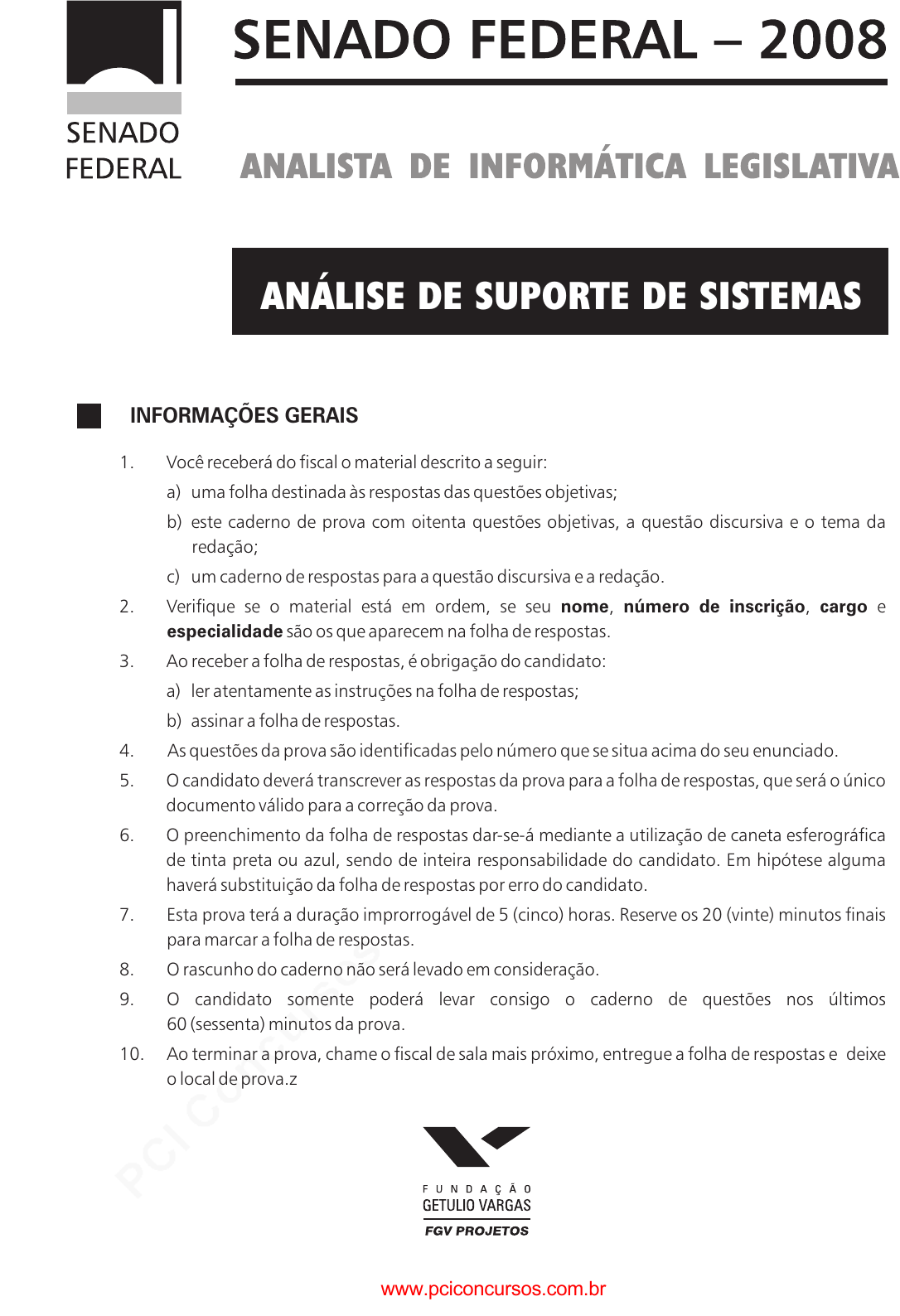 pcimarkpci MDAwMDowMDAwOjAwMDA6MDAwMDowMDAwOmZmZmY6MzZlOTpjMjU5:RnJpLCAxNyBTZXAgMjAyMSAxMToyMzo1MCAtMDMwMA== 1. Você receberá do fiscal o material descrito a seguir: a) uma folha destinada às respostas das questões objetivas; b) este caderno de prova com oitenta questões objetivas, a questão discursiva e o tema da redação; c) um caderno de respostas para a questão discursiva e a redação. a) ler atentamente as instruções na folha de respostas; b) assinar a folha de respostas. 2. Verifique se o material está em ordem, se seu , , e são os que aparecem na folha de respostas. 3. Ao receber a folha de respostas, é obrigação do candidato: 4. As questões da prova são identificadas pelo número que se situa acima do seu enunciado. 5. O candidato deverá transcrever as respostas da prova para a folha de respostas, que será o único documento válido para a correção da prova. 6. O preenchimento da folha de respostas dar-se-á mediante a utilização de caneta esferográfica de tinta preta ou azul, sendo de inteira responsabilidade do candidato. Em hipótese alguma haverá substituição da folha de respostas por erro do candidato. 7. Esta prova terá a duração improrrogável de 5 (cinco) horas. Reserve os 20 (vinte) minutos finais para marcar a folha de respostas. 8. O rascunho do caderno não será levado em consideração. 9. O candidato somente poderá levar consigo o caderno de questões nos últimos 60 (sessenta) minutos da prova. 10. Ao terminar a prova, chame o fiscal de sala mais próximo, entregue a folha de respostas e deixe o local de prova.z nome número de inscrição cargo especialidade INFORMAÇÕES GERAIS ANÁLISE DE SUPORTE DE SISTEMAS www.pciconcursos.com.br pcimarkpci MDAwMDowMDAwOjAwMDA6MDAwMDowMDAwOmZmZmY6MzZlOTpjMjU5:RnJpLCAxNyBTZXAgMjAyMSAxMToyMzo1MCAtMDMwMA== www.pciconcursos.com.br pcimarkpci MDAwMDowMDAwOjAwMDA6MDAwMDowMDAwOmZmZmY6MzZlOTpjMjU5:RnJpLCAxNyBTZXAgMjAyMSAxMToyMzo1MCAtMDMwMA== ANALISTA DE INFORMÁTICA LEGISLATIVA – ANÁLISE DE SUPORTE DE SISTEMAS 3 SENADO FEDERAL – 2008 LÍNGUA PORTUGUESA Desafios do crescimento econômico A crise do sistema financeiro internacional, que ameaça lançar o mundo numa profunda recessão, revela a importância do papel do governo no funcionamento da economia em diferentes dimensões, sobretudo na promoção de uma melhor operação dos mercados, da estabilidade e do crescimento econômico. Entretanto, após algumas décadas de excessivo crescimento dos gastos governamentais e da crise financeira que se abateu sobre inúmeros governos, particularmente em países da América Latina, a eficiência da ação pública começou a ser questionada. Novamente vigoravam idéias de que as economias deveriam ser liberalizadas da ação governamental, de que, quanto menos governo, melhor e de que o setor privado por si só resolveria todos os problemas. Na realidade, o que se notou foi uma grande confusão. Em vez de defendermos um governo eficiente, comprometido com o crescimento econômico, acabamos por tentar excluir o governo das funções econômicas, esquecendo seu importante papel. Era muito comum a idéia de que a privatização e a liberalização dos mercados seriam condições eficientes para que os países entrassem numa rota de crescimento econômico. Entretanto, a realidade mostrou que essa bandeira não tem sustentação. A crise financeira que estamos atravessando – e não sabemos ainda suas reais conseqüências sobre a economia mundial – realça um fato inconteste: faltou a presença do governo, mediante uma regulação mais ativa do mercado financeiro. Recente estudo promovido pela Comissão para o Crescimento Econômico, cujo objetivo primordial é entender o fenômeno do desenvolvimento com base na experiência mais exitosa dos países durante as décadas de 1950 a 1980, transmite informações relevantes para o entendimento do momento que vivemos, ainda que seu objetivo seja totalmente distinto. Em primeiro lugar, não estão em xeque as inegáveis e insubstituíveis virtudes que os mercados possuem quando funcionam de maneira mais livre, sem interferências externas, na alocação dos recursos. Entretanto, não podemos esquecer que as ações tomadas pelos diversos agentes econômicos se baseiam em perspectivas de retornos privados e, portanto, na ânsia de obter tais retornos, mercados como o financeiro podem gerar instabilidades. O papel da regulação, tarefa que deve ser executada por autoridades governamentais, não pode ser esquecido. Por outro lado, apesar da virtude dos mercados, não se pode esquecer que eles não são garantia para a promoção de desenvolvimento econômico ou a melhor distribuição de renda. O relatório da comissão enfatiza o papel do governo no processo de desenvolvimento econômico, mostrando inicialmente que o processo de desenvolvimento é um fenômeno complexo e difícil de ser entendido. “Não damos aos formuladores de políticas públicas uma receita ou uma estratégia de crescimento. Isso porque não existe uma única receita a seguir.” Mais adiante, afirma: “Não conhecemos as condições suficientes para o crescimento. Podemos caracterizar as economias bem-sucedidas do pós-guerra, mas não podemos apontar com segurança os fatores que selaram seu êxito nem os fatores sem os quais elas poderiam ter sido exitosas.” Certamente essas frases devem nos deixar algo perplexos, especialmente quando ouvimos as certezas que dominam a maioria dos analistas econômicos espalhados pelo mundo, em especial quando tratam de fornecer fórmulas prontas para o crescimento dos países. A comissão reconhece que a dificuldade do entendimento sobre o fenômeno do crescimento dificulta a ação governamental na definição das estratégias a serem seguidas. A recomendação dada é a de que o governo “não deve ficar inerte, por temor de malograr; os governos devem testar diversos programas e devem ser rápidos em aprender quando dão errado. Se dão um passo e