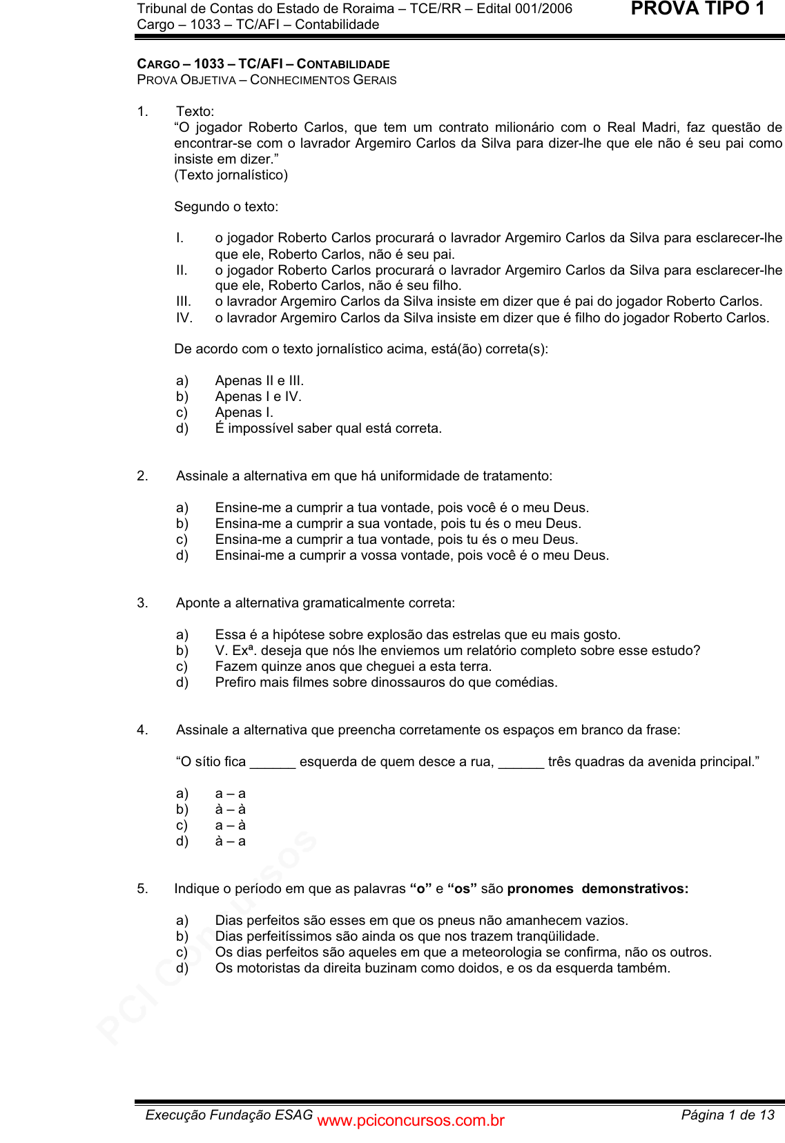 pcimarkpci MDAwMDowMDAwOjAwMDA6MDAwMDowMDAwOmZmZmY6MzZlOTpjMjU5:RnJpLCAxNyBTZXAgMjAyMSAxNTozOTowNSAtMDMwMA== Tribunal de Contas do Estado de Roraima – TCE/RR – Edital 001/2006 Cargo – 1033 – TC/AFI – Contabilidade Execução Fundação ESAG Página 1 de 13 PROVA TIPO 1 CARGO – 1033 – TC/AFI – CONTABILIDADE PROVA OBJETIVA – CONHECIMENTOS GERAIS 1. Texto: “O jogador Roberto Carlos, que tem um contrato milionário com o Real Madri, faz questão de encontrar-se com o lavrador Argemiro Carlos da Silva para dizer-lhe que ele não é seu pai como insiste em dizer.” (Texto jornalístico) Segundo o texto: I. o jogador Roberto Carlos procurará o lavrador Argemiro Carlos da Silva para esclarecer-lhe que ele, Roberto Carlos, não é seu pai. II. o jogador Roberto Carlos procurará o lavrador Argemiro Carlos da Silva para esclarecer-lhe que ele, Roberto Carlos, não é seu filho. III. o lavrador Argemiro Carlos da Silva insiste em dizer que é pai do jogador Roberto Carlos. IV. o lavrador Argemiro Carlos da Silva insiste em dizer que é filho do jogador Roberto Carlos. De acordo com o texto jornalístico acima, está(ão) correta(s): a) Apenas II e III. b) Apenas I e IV. c) Apenas I. d) É impossível saber qual está correta. 2. Assinale a alternativa em que há uniformidade de tratamento: a) Ensine-me a cumprir a tua vontade, pois você é o meu Deus. b) Ensina-me a cumprir a sua vontade, pois tu és o meu Deus. c) Ensina-me a cumprir a tua vontade, pois tu és o meu Deus. d) Ensinai-me a cumprir a vossa vontade, pois você é o meu Deus. 3. Aponte a alternativa gramaticalmente correta: a) Essa é a hipótese sobre explosão das estrelas que eu mais gosto. b) V. Exª. deseja que nós lhe enviemos um relatório completo sobre esse estudo? c) Fazem quinze anos que cheguei a esta terra. d) Prefiro mais filmes sobre dinossauros do que comédias. 4. Assinale a alternativa que preencha corretamente os espaços em branco da frase: “O sítio fica ______ esquerda de quem desce a rua, ______ três quadras da avenida principal.” a) a – a b) à – à c) a – à d) à – a 5. Indique o período em que as palavras “o” e “os” são pronomes demonstrativos: a) Dias perfeitos são esses em que os pneus não amanhecem vazios. b) Dias perfeitíssimos são ainda os que nos trazem tranqüilidade. c) Os dias perfeitos são aqueles em que a meteorologia se confirma, não os outros. d) Os motoristas da direita buzinam como doidos, e os da esquerda também. www.pciconcursos.com.br pcimarkpci MDAwMDowMDAwOjAwMDA6MDAwMDowMDAwOmZmZmY6MzZlOTpjMjU5:RnJpLCAxNyBTZXAgMjAyMSAxNTozOTowNSAtMDMwMA== Tribunal de Contas do Estado de Roraima – TCE/RR – Edital 001/2006 Cargo – 1033 – TC/AFI – Contabilidade Execução Fundação ESAG Página 2 de 13 PROVA TIPO 1 6. “Nós levamos 500 anos produzindo fome e miséria. Portanto acho que nós temos o direito de gastar alguns anos para fazer o contramovimento.” (Betinho) Que outra palavra pode substituir aquela em destaque no texto acima sem alterar o sentido da frase? a) Logo b) Porém c) No entanto d) Apesar disso 7. Qual dos trechos abaixo não permite dupla interpretação? a) Foi observado o acidente da ponte. b) O juiz declarou ter julgado erradamente o réu. c) A professora deixou a turma entusiasmada. d) Deixou a sala vazia. 8. Observe a frase: “ A moça gorda entrava a criança na banheira.” A propósito da frase acima, só terá sentido se: a) “entrava” for do verbo entravar. b) Não há como consertar a frase. c) “a criança” ficar antes do verbo e ligar-se “a moça gorda” por e. d) houver acento grave, indicador de crase, em “à criança”. 9. Assinale a alternativa correta: a) O servidor que deva ter exercício em outro município em razão de ter sido removido, requisitado, cedido ou posto em exercício provisório terá dez dias de prazo, contados da publicação do ato, para a retomada do efetivo desempenho das atribuições do cargo, incluído nesse prazo o tempo necessário para o deslocamento para a nova sede. b) Remoção é o deslocamento do servidor, de ofício, no âmbito do mesmo quadro, com ou sem mudança de sede. c) Ressalvada a concordância expressa do servidor, não poderá a Administração Pública alterar unilateralmente as atribuições, os deveres, as responsabilidades e os direitos inerentes ao cargo ocupado. d) O servidor empossado terá trinta dias para entrar em exercício, contados da data da posse. 10. Assinale a alternativa INCORRETA: a) Será concedida ajuda de custo àquele que, não sendo servidor do Estado, for nomeado para cargo em comissão, com mudança de domicílio. b) Em nenhuma hipótese o vencimento, a remuneração e o provento serão objeto de arresto, seqüestro ou penhora. c) O servidor público da administração direta, autárquica e fundacional investido no mandato de vereador, cujo exercício seja incompatível com o horário da Administração Pública, será afastado do cargo, sendo-lhe facultado optar pela sua remuneração. d) As férias poderão ser parceladas em até três etapas, desde que assim requeridas pelo servidor, e no interesse da administração pública. www.pciconcursos.com.br pcimarkpci MDAwMDowMDAwOjAwMDA6MDAwMDowMDAwOmZmZmY6MzZlOTpjMjU5:RnJpLCAxNyBTZXAgMjAyMSAxNTozOTowNSAtMDMwMA== Tribunal de Contas do Estado de Roraima – TCE/RR – Edital 001/2006 Cargo – 1033 – TC/AFI – Contabilidade Execução Fundação ESAG Página 3 de 13 PROVA TIPO 1 11. Assinale a alternativa correta: a) A responsabilidade administrativa do servidor será afastada no caso de absolvição criminal que, por falta de provas, tenha aplicado o princípio do in dubio pro reo. b) A pensão por morte será devida ao dependente do participante que falecer, ainda que tenha sido condenado pela prática de crime doloso do qual tenha resultado morte daquele. c) O servidor não poderá ausentar-se do País para estudo ou missão oficial, sem autorização do Governador do Es