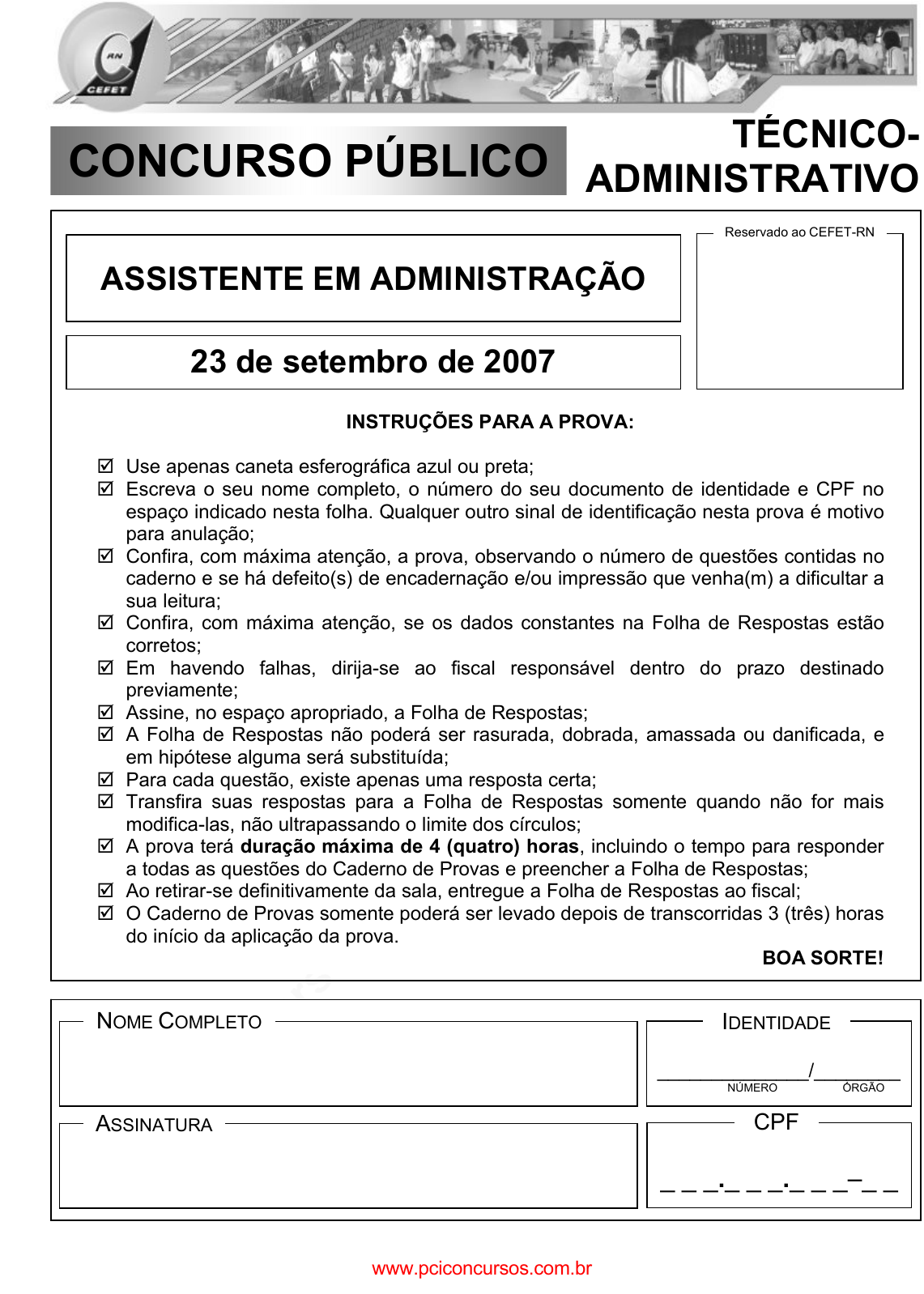 pcimarkpci MDAwMDowMDAwOjAwMDA6MDAwMDowMDAwOmZmZmY6MzZlOTpjMjU5:RnJpLCAxNyBTZXAgMjAyMSAyMjo1MDoyNiAtMDMwMA== INSTRUÇÕES PARA A PROVA: Use apenas caneta esferográfica azul ou preta; Escreva o seu nome completo, o número do seu documento de identidade e CPF no espaço indicado nesta folha. Qualquer outro sinal de identificação nesta prova é motivo para anulação; Confira, com máxima atenção, a prova, observando o número de questões contidas no caderno e se há defeito(s) de encadernação e/ou impressão que venha(m) a dificultar a sua leitura; Confira, com máxima atenção, se os dados constantes na Folha de Respostas estão corretos; Em havendo falhas, dirija-se ao fiscal responsável dentro do prazo destinado previamente; Assine, no espaço apropriado, a Folha de Respostas; A Folha de Respostas não poderá ser rasurada, dobrada, amassada ou danificada, e em hipótese alguma será substituída; Para cada questão, existe apenas uma resposta certa; Transfira suas respostas para a Folha de Respostas somente quando não for mais modifica-las, não ultrapassando o limite dos círculos; A prova terá duração máxima de 4 (quatro) horas, incluindo o tempo para responder a todas as questões do Caderno de Provas e preencher a Folha de Respostas; Ao retirar-se definitivamente da sala, entregue a Folha de Respostas ao fiscal; O Caderno de Provas somente poderá ser levado depois de transcorridas 3 (três) horas do início da aplicação da prova. BOA SORTE! TÉCNICO- ADMINISTRATIVO CONCURSO PÚBLICO Reservado ao CEFET-RN ASSISTENTE EM ADMINISTRAÇÃO 23 de setembro de 2007 ______________/________ NÚMERO ÓRGÃO IDENTIDADE NOME COMPLETO _ _ _._ _ _._ _ _–_ _ CPF ASSINATURA www.pciconcursos.com.br pcimarkpci MDAwMDowMDAwOjAwMDA6MDAwMDowMDAwOmZmZmY6MzZlOTpjMjU5:RnJpLCAxNyBTZXAgMjAyMSAyMjo1MDoyNiAtMDMwMA== CONCURSO PÚBLICO – TÉCNICO-ADMINISTRATIVO EDITAL Nº. 09/2007-DRH/CEFET-RN ASSISTENTE EM ADMINISTRAÇÃO 1/7 As questões de 1 a 6 referem-se ao TEXTO 1 reproduzido a seguir. TEXTO 1 Portaria N°. 873, DE 7 DE ABRIL DE 2006 O Ministro de Estado da Educação, Interino, no uso de suas atribuições e considerando o disposto nos artigos 80 e 81 da Lei nº 9.394, de 20 de dezembro de 1996; no Decreto no 5.622, de 19 de dezembro de fevereiro de 2005; na Portaria nº 2.201, de 22 de junho de 2005; no Parecer CES/CNE nº 301/2003; considerando a política ministerial de indução da oferta pública de cursos superiores a distância nas Instituições Federais de Ensino Superior, no âmbito dos programas “Universidade Aberta do Brasil” e “Pró- Licenciatura”, orquestrados pela Secretaria de Educação a Distância - SEED e pela Secretaria de Educação Básica - SEB, com participação da Secretaria de Educação Superior - SESu e da Secretaria de Educação Profissional e Tecnológica - SETEC; e considerando a necessidade de autorização dos cursos superiores a distância a serem ofertados pelas Instituições Federais de Ensino Superior para atender aos prazos dos editais dos programas de educação a distância do Ministério da Educação, resolve: Art. 1o Autorizar, em caráter experimental, com base no art.81 da Lei n. 9.394, de 20 de dezembro de 1996, a oferta de cursos superiores a distância nas Instituições Federais de Ensino Superior, no âmbito dos programas de indução da oferta pública de cursos superiores a distância fomentados pelo MEC. Parágrafo Único. A autorização experimental definida no caput não substitui o ato de credenciamento definitivo para a oferta de cursos superiores a distância, e tem prazo de vigência de 2 (dois) anos. Art. 2o As Instituições Federais de Ensino Superior que até a data desta Portaria não protocolizaram processo de credenciamento para oferta de cursos superiores a distância junto ao MEC, deverão fazer o protocolo do processo, no prazo de 90 (noventa) dias, no Sistema SAPIEnS, e estarão submetidas aos procedimentos definidos pela Secretaria de Educação Superior. Art. 3o Esta portaria entra em vigor na data de sua publicação. JOSÉ HENRIQUE PAIM FERNANDES (texto adaptado para uso exclusivo nesta avaliação) 1. Em “... deverão fazer o protocolo do processo...” (l. 18-19), para tornar o texto mais coeso, o trecho em destaque poderá ser substituído pela forma a) fazer-lhe. b) fazer-lo. c) fazê-lhe. d) fazê-lo. 2. Sobre a pontuação do trecho “As Instituições Federais de Ensino Superior que até a data desta Portaria não protocolizaram processo de credenciamento para oferta de cursos superiores a distância junto ao MEC, deverão ...”, é correto afirmar, considerando-se a sintaxe do português, que a) a colocação de uma vírgula após a palavra superior é inaceitável. b) a colocação de uma vírgula após a palavra superior altera o sentido da informação. c) a supressão da vírgula após a sigla MEC é inaceitável. d) a supressão da vírgula após a sigla MEC altera o sentido da informação. 3. No período “A autorização experimental definida no caput não substitui o ato de credenciamento definitivo para a oferta de cursos superiores a distância, e tem seu prazo de vigência de 2(dois) anos.”, o verbo em destaque será flexionado no plural se flexionarmos, também no plural, a) A oferta, e a forma do verbo será têm. b) A autorização experimental, e a forma do verbo será têm. c) A autorização experimental, e a forma do verbo será têem. d) A oferta, e a forma do verbo será têem. 4. A palavra “orquestrados” (l. 6) é um exemplo da linguagem a) denotativa, mas está inadequada à situação. b) conotativa e está adequada à situação. c) conotativa, mas está inadequada à situação. d) denotativa e está adequada à situação. 5. Dos usos apresentados nas opções abaixo, o que se aplica à portaria é a) comunicar internamente assuntos rotineiros. b) solicitar algo sob o amparo da lei. c) comunicar qualquer assunto de ordem administrativa. d) nomear, demit