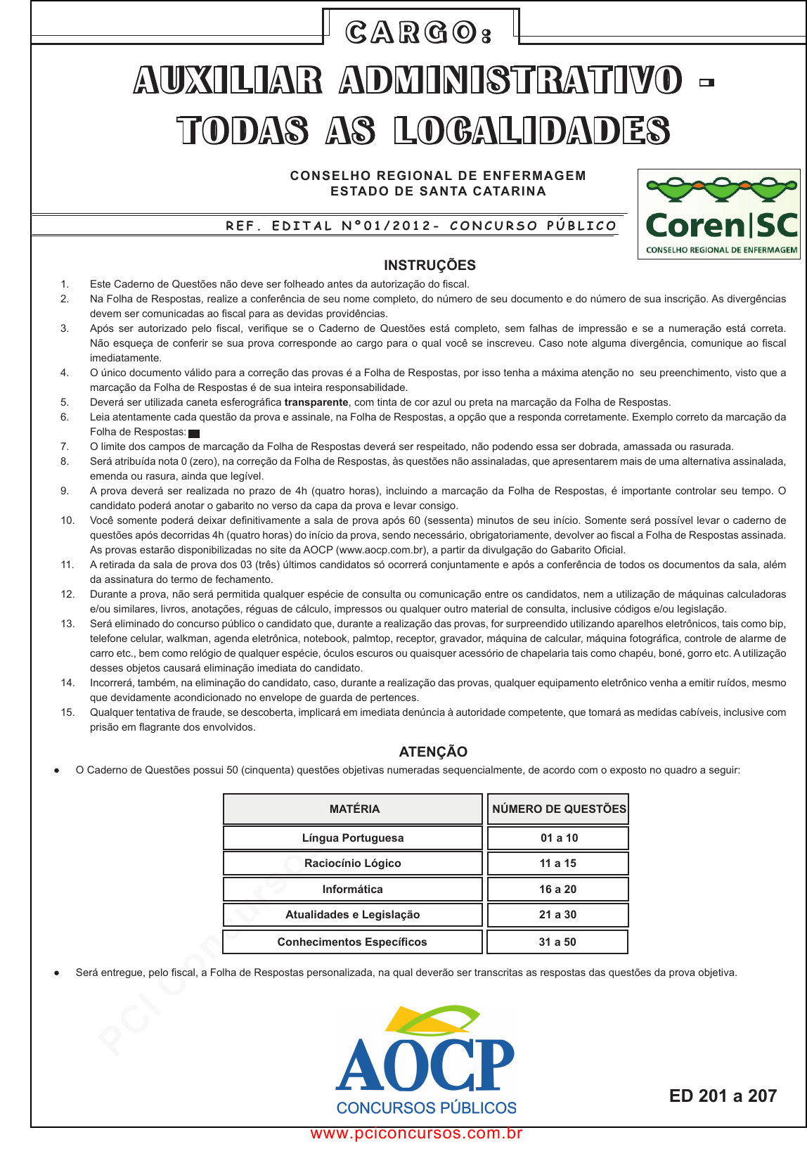pcimarkpci MDAwMDowMDAwOjAwMDA6MDAwMDowMDAwOmZmZmY6MzZlOTpjMjU5:U2F0LCAxOCBTZXAgMjAyMSAwNzo0NToyMyAtMDMwMA== C A R G O : CONSELHO REGIONAL DE ENFERMAGEM ESTADO DE SANTA CATARINA R E F . E D I T A L N º 0 1 / 2 0 1 2 - C O N C U R S O P Ú B L I C O INSTRUÇÕES 1. Este Caderno de Questões não deve ser folheado antes da autorização do fiscal. 2. Na Folha de Respostas, realize a conferência de seu nome completo, do número de seu documento e do número de sua inscrição. As divergências devem ser comunicadas ao fiscal para as devidas providências. 3. Após ser autorizado pelo fiscal, verifique se o Caderno de Questões está completo, sem falhas de impressão e se a numeração está correta. Não esqueça de conferir se sua prova corresponde ao cargo para o qual você se inscreveu. Caso note alguma divergência, comunique ao fiscal imediatamente. 4. O único documento válido para a correção das provas é a Folha de Respostas, por isso tenha a máxima atenção no seu preenchimento, visto que a marcação da Folha de Respostas é de sua inteira responsabilidade. 5. Deverá ser utilizada caneta esferográfica transparente, com tinta de cor azul ou preta na marcação da Folha de Respostas. 6. Leia atentamente cada questão da prova e assinale, na Folha de Respostas, a opção que a responda corretamente. Exemplo correto da marcação da Folha de Respostas: 7. O limite dos campos de marcação da Folha de Respostas deverá ser respeitado, não podendo essa ser dobrada, amassada ou rasurada. 8. Será atribuída nota 0 (zero), na correção da Folha de Respostas, às questões não assinaladas, que apresentarem mais de uma alternativa assinalada, emenda ou rasura, ainda que legível. 9. A prova deverá ser realizada no prazo de 4h (quatro horas), incluindo a marcação da Folha de Respostas, é importante controlar seu tempo. O candidato poderá anotar o gabarito no verso da capa da prova e levar consigo. 10. Você somente poderá deixar definitivamente a sala de prova após 60 (sessenta) minutos de seu início. Somente será possível levar o caderno de questões após decorridas 4h (quatro horas) do início da prova, sendo necessário, obrigatoriamente, devolver ao fiscal a Folha de Respostas assinada. As provas estarão disponibilizadas no site da AOCP (www.aocp.com.br), a partir da divulgação do Gabarito Oficial. 11. A retirada da sala de prova dos 03 (três) últimos candidatos só ocorrerá conjuntamente e após a conferência de todos os documentos da sala, além da assinatura do termo de fechamento. 12. Durante a prova, não será permitida qualquer espécie de consulta ou comunicação entre os candidatos, nem a utilização de máquinas calculadoras e/ou similares, livros, anotações, réguas de cálculo, impressos ou qualquer outro material de consulta, inclusive códigos e/ou legislação. 13. Será eliminado do concurso público o candidato que, durante a realização das provas, for surpreendido utilizando aparelhos eletrônicos, tais como bip, telefone celular, walkman, agenda eletrônica, notebook, palmtop, receptor, gravador, máquina de calcular, máquina fotográfica, controle de alarme de carro etc., bem como relógio de qualquer espécie, óculos escuros ou quaisquer acessório de chapelaria tais como chapéu, boné, gorro etc. A utilização desses objetos causará eliminação imediata do candidato. 14. Incorrerá, também, na eliminação do candidato, caso, durante a realização das provas, qualquer equipamento eletrônico venha a emitir ruídos, mesmo que devidamente acondicionado no envelope de guarda de pertences. 15. Qualquer tentativa de fraude, se descoberta, implicará em imediata denúncia à autoridade competente, que tomará as medidas cabíveis, inclusive com prisão em flagrante dos envolvidos. ATENÇÃO ● O Caderno de Questões possui 50 (cinquenta) questões objetivas numeradas sequencialmente, de acordo com o exposto no quadro a seguir: ED 201 a 207 ● Será entregue, pelo fiscal, a Folha de Respostas personalizada, na qual deverão ser transcritas as respostas das questões da prova objetiva. C A R G O : A U X I L I A R A D M I N I S T R A T I V O - T O D A S A S L O C A L I D A D E S A U X I L I A R A D M I N I S T R A T I V O - T O D A S A S L O C A L I D A D E S NÚMERO DE QUESTÕES MATÉRIA Língua Portuguesa Raciocínio Lógico Informática 01 a 10 11 a 15 16 a 20 Atualidades e Legislação 21 a 30 Conhecimentos Específicos 31 a 50 www.pciconcursos.com.br pcimarkpci MDAwMDowMDAwOjAwMDA6MDAwMDowMDAwOmZmZmY6MzZlOTpjMjU5:U2F0LCAxOCBTZXAgMjAyMSAwNzo0NToyMyAtMDMwMA== Gabarito Preliminar disponível em www.aocp.com.br ------------------------------------------------------------------------------------(destaque aqui)------------------------------------------------------------------------------- FOLHA PARA ANOTAÇÃO DAS RESPOSTAS DO CANDIDATO Questão Resp. 01 02 03 04 05 06 07 08 09 10 11 12 13 14 15 16 17 18 19 20 21 22 23 24 25 Questão Resp. 26 27 28 29 30 31 32 33 34 35 36 37 38 39 40 41 42 43 44 45 46 47 48 49 50 www.pciconcursos.com.br pcimarkpci MDAwMDowMDAwOjAwMDA6MDAwMDowMDAwOmZmZmY6MzZlOTpjMjU5:U2F0LCAxOCBTZXAgMjAyMSAwNzo0NToyMyAtMDMwMA== 3 Cargo: Auxiliar Administrativo - Todas as Localidades L Í N G U A P O R T U G U E S A QUESTÃO 01 “NYT” destaca crescimento populacional na Amazônia e preocupação ambientalista 1.§ Reportagem do jornal americano “New York Times” publicada neste domingo revela o surgimento e o crescimento de diversas cidades em meio à Amazônia, dizendo que os cientistas estão alarmados com a chegada de projetos industriais na região. 2.§ O jornal diz que a expansão dessas cidades é evidente em locais como Parauapebas, que, em uma geração, evoluiu de uma pequena colônia marcada por conflitos de mineiros para uma cidade com shopping e concessionária da Chevrolet. 3.§ Embora a ditadura militar tenha construído estradas no intuito de ocupar a Amazônia e defendê-la dos estrangeiros, 
