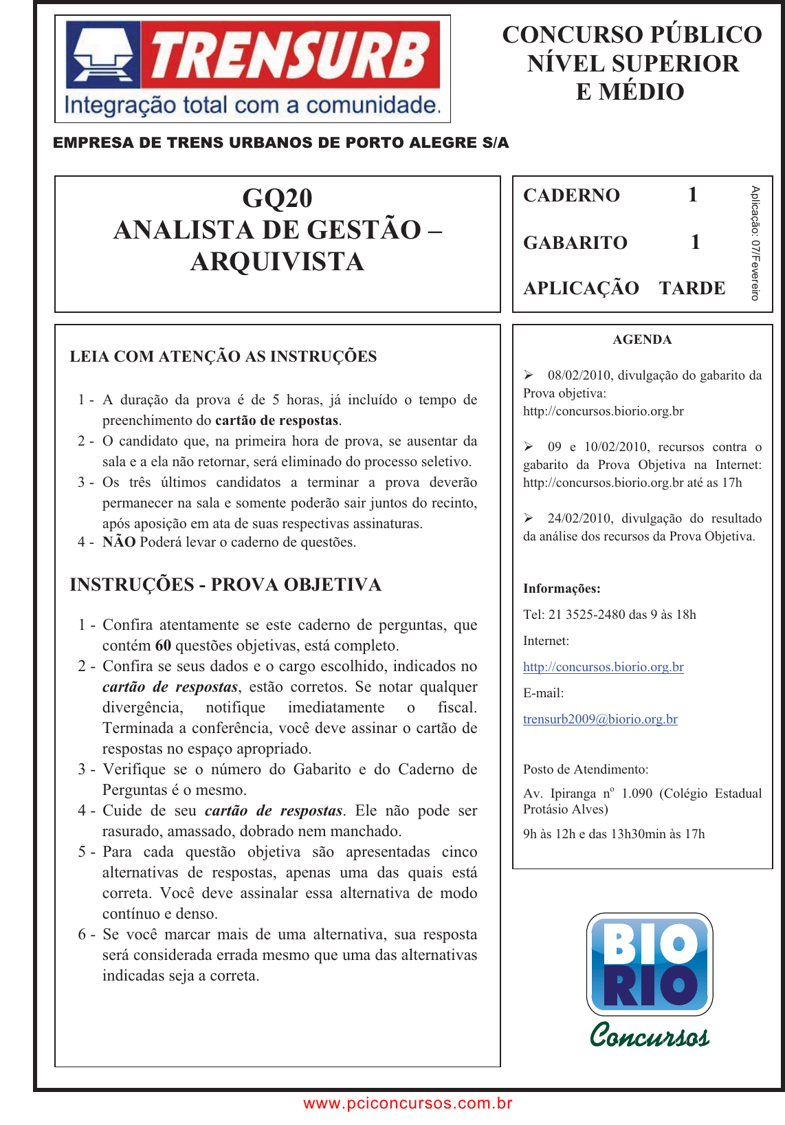 pcimarkpci MDAwMDowMDAwOjAwMDA6MDAwMDowMDAwOmZmZmY6MzZlOTpjMjU5:RnJpLCAxNyBTZXAgMjAyMSAyMTowMTowMyAtMDMwMA== CADERNO 1 GABARITO 1 APLICAÇÃO TARDE GQ20 ANALISTA DE GESTÃO – ARQUIVISTA LEIA COM ATENÇÃO AS INSTRUÇÕES 1 - A duração da prova é de 5 horas, já incluído o tempo de preenchimento do cartão de respostas. 2 - O candidato que, na primeira hora de prova, se ausentar da sala e a ela não retornar, será eliminado do processo seletivo. 3 - Os três últimos candidatos a terminar a prova deverão permanecer na sala e somente poderão sair juntos do recinto, após aposição em ata de suas respectivas assinaturas. 4 - NÃO Poderá levar o caderno de questões. INSTRUÇÕES - PROVA OBJETIVA 1 - Confira atentamente se este caderno de perguntas, que contém 60 questões objetivas, está completo. 2 - Confira se seus dados e o cargo escolhido, indicados no cartão de respostas, estão corretos. Se notar qualquer divergência, notifique imediatamente o fiscal. Terminada a conferência, você deve assinar o cartão de respostas no espaço apropriado. 3 - Verifique se o número do Gabarito e do Caderno de Perguntas é o mesmo. 4 - Cuide de seu cartão de respostas. Ele não pode ser rasurado, amassado, dobrado nem manchado. 5 - Para cada questão objetiva são apresentadas cinco alternativas de respostas, apenas uma das quais está correta. Você deve assinalar essa alternativa de modo contínuo e denso. 6 - Se você marcar mais de uma alternativa, sua resposta será considerada errada mesmo que uma das alternativas indicadas seja a correta. AGENDA ��08/02/2010, divulgação do gabarito da Prova objetiva: http://concursos.biorio.org.br ��09 e 10/02/2010, recursos contra o gabarito da Prova Objetiva na Internet: http://concursos.biorio.org.br até as 17h ��24/02/2010, divulgação do resultado da análise dos recursos da Prova Objetiva. Informações: Tel: 21 3525-2480 das 9 às 18h Internet: http://concursos.biorio.org.br E-mail: trensurb2009@biorio.org.br Posto de Atendimento: Av. Ipiranga no 1.090 (Colégio Estadual Protásio Alves) 9h às 12h e das 13h30min às 17h A plicação: 07/Fevereiro CONCURSO PÚBLICO NÍVEL SUPERIOR E MÉDIO EMPRESA DE TRENS URBANOS DE PORTO ALEGRE S/A www.pciconcursos.com.br pcimarkpci MDAwMDowMDAwOjAwMDA6MDAwMDowMDAwOmZmZmY6MzZlOTpjMjU5:RnJpLCAxNyBTZXAgMjAyMSAyMTowMTowMyAtMDMwMA== GQ20 ANALISTA DE GESTÃO ARQUIVISTAEMPRESA DE TRENS URBANOS DE PORTO ALEGRE S/A 2 LÍNGUA PORTUGUESA Organização: BIORIO Concursos Jornalismo: profissão específica ou atividade geral? O que diferencia uma profissão de uma atividade geral? Esta não tem contornos nítidos ou precisos. Pode constituir-se de tarefas as mais diversas, todas relativamente simples. Para realizá-las, quase nunca é necessário um conhecimento mais aprofundado. Seu perfil impreciso permite que praticamente qualquer pessoa possa exercer uma atividade geral. Basta-lhe algum atributo físico ou mental, um pouco de prática, "um certo jeito para a coisa". Nessa constatação, não há menoscabo de sua relevância e nem diminuição da dignidade do trabalho exercido. Uma profissão é diferente. Geralmente tem raízes em antigas atividades gerais que foram se especializando, com inúmeras tarefas, algumas mais simples, outras mais complicadas. Uma profissão caracteriza-se, fundamentalmente, por constituir um sistema articulado de funções específicas, complexas e complementares entre si. Por isso, sempre exige algum tipo de formação básica, preliminar ao seu exercício. Treinamento e prática são essenciais para complementar a formação; mas esta é indispensável. Atributos pessoais podem contribuir para formar um profissional melhor; mas essas qualidades não prescindem da formação. Há exceções, mas estamos tratando da regra geral. As sociedades modernas desenvolveram sistemas formais de formação geral e específica em diversos graus e níveis, incumbidos de dar o preparo básico para o exercício de inúmeras profissões. Ao dar esse preparo, o sistema também dá um sinal, uma prova pública de que o preparo foi dado. Esse sinal é chamado de certificado ou diploma, e indica o grau e o nível da formação regular conferida. Entre as antigas atividades gerais que foram se transformando em profissões específicas está a de jornalismo. Na sua essência, o jornalismo trata da informação. É uma profissão constituída de funções que se destinam a planejar e obter informações do mundo real - físico ou social -, organizar, estruturar e hierarquizar essas informações, explicá-las, analisá-las e interpretá-las, e apresentá-las e difundi-las através de diversos processos, utilizando-se de meios impressos, auditivos, visuais, geralmente combinados entre si. Não é uma atividade geral, que qualquer um possa fazer. É um processo específico e complexo e que, por isso, exige formação especializada. A tendência histórica provável é que essa especialização aumente: cresce a complexidade tanto do mundo social e físico, que constitui o conteúdo das informações, quanto dos métodos de obtenção, registro e difusão das informações. Por isso modernamente o jornalismo necessita de formação especializada de nível superior; por isso é que surgiram, no interior dos sistemas escolares universitários, os cursos de jornalismo e seus diplomas. Não se trata de um "direito" dos formandos. Trata- se do direito de a sociedade exigir do profissional a prova da sua formação regular, escolar e superior específica. Supor que outra formação não específica seja igual à de jornalismo significa negar o jornalismo como profissão específica e entendê-lo como atividade geral. É claro que isso não tem nada a ver com o direito de ter e emitir opiniões. A essência do jornalismo é a informação. O direito de ter e difundir opiniões não é característica nem específica e nem exclusiva do jornalismo. Abarca um campo muito mais vasto, que é o da própria