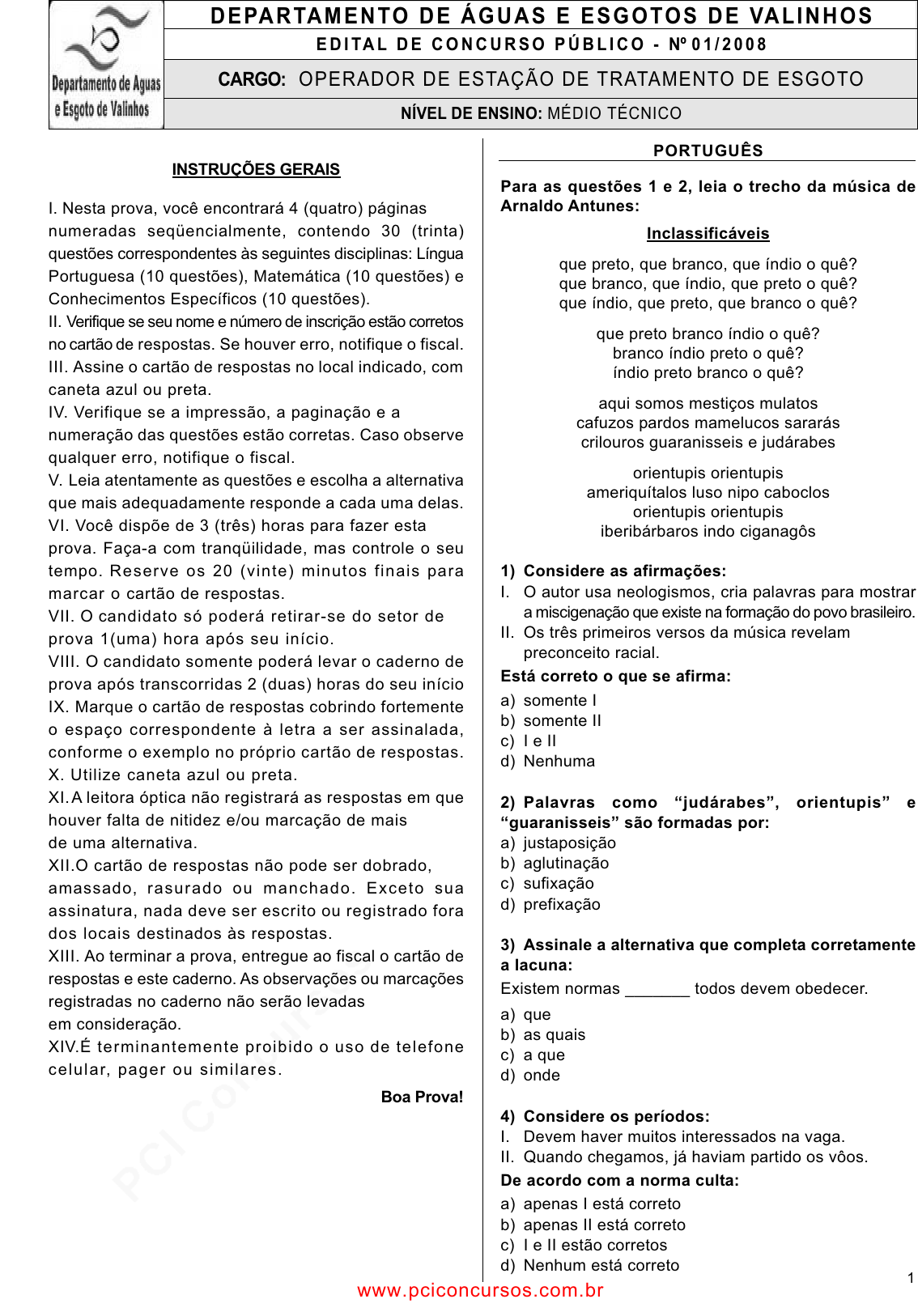 pcimarkpci MDAwMDowMDAwOjAwMDA6MDAwMDowMDAwOmZmZmY6MzZlOTpjMjU5:U2F0LCAxOCBTZXAgMjAyMSAyMDoyNzowNiAtMDMwMA== INSTRUÇÕES GERAIS I. Nesta prova, você encontrará 4 (quatro) páginas numeradas seqüencialmente, contendo 30 (trinta) questões correspondentes às seguintes disciplinas: Língua Portuguesa (10 questões), Matemática (10 questões) e Conhecimentos Específicos (10 questões). II. Verifique se seu nome e número de inscrição estão corretos no cartão de respostas. Se houver erro, notifique o fiscal. III. Assine o cartão de respostas no local indicado, com caneta azul ou preta. IV. Verifique se a impressão, a paginação e a numeração das questões estão corretas. Caso observe qualquer erro, notifique o fiscal. V. Leia atentamente as questões e escolha a alternativa que mais adequadamente responde a cada uma delas. VI. Você dispõe de 3 (três) horas para fazer esta prova. Faça-a com tranqüilidade, mas controle o seu tempo. Reserve os 20 (vinte) minutos f inais para marcar o cartão de respostas. VII. O candidato só poderá retirar-se do setor de prova 1(uma) hora após seu início. VIII. O candidato somente poderá levar o caderno de prova após transcorridas 2 (duas) horas do seu início IX. Marque o cartão de respostas cobrindo fortemente o espaço correspondente à letra a ser assinalada, conforme o exemplo no próprio cartão de respostas. X. Utilize caneta azul ou preta. XI.A leitora óptica não registrará as respostas em que houver falta de nitidez e/ou marcação de mais de uma alternativa. XII.O cartão de respostas não pode ser dobrado, amassado, rasurado ou manchado. Exceto sua assinatura, nada deve ser escrito ou registrado fora dos locais destinados às respostas. XIII. Ao terminar a prova, entregue ao fiscal o cartão de respostas e este caderno. As observações ou marcações registradas no caderno não serão levadas em consideração. XIV.É terminantemente proibido o uso de telefone celular, pager ou simi lares. Boa Prova! PORTUGUÊS Para as questões 1 e 2, leia o trecho da música de Arnaldo Antunes: Inclassificáveis que preto, que branco, que índio o quê? que branco, que índio, que preto o quê? que índio, que preto, que branco o quê? que preto branco índio o quê? branco índio preto o quê? índio preto branco o quê? aqui somos mestiços mulatos cafuzos pardos mamelucos sararás crilouros guaranisseis e judárabes orientupis orientupis ameriquítalos luso nipo caboclos orientupis orientupis iberibárbaros indo ciganagôs 1) Considere as afirmações: I. O autor usa neologismos, cria palavras para mostrar a miscigenação que existe na formação do povo brasileiro. II. Os três primeiros versos da música revelam preconceito racial. Está correto o que se afirma: a) somente I b) somente II c) I e II d) Nenhuma 2) Palavras como “judárabes”, orientupis” e “guaranisseis” são formadas por: a) justaposição b) aglutinação c) sufixação d) prefixação 3) Assinale a alternativa que completa corretamente a lacuna: Existem normas _______ todos devem obedecer. a) que b) as quais c) a que d) onde 4) Considere os períodos: I. Devem haver muitos interessados na vaga. II. Quando chegamos, já haviam partido os vôos. De acordo com a norma culta: a) apenas I está correto b) apenas II está correto c) I e II estão corretos d) Nenhum está correto 1 DEPARTAMENTO DE ÁGUAS E ESGOTOS DE VALINHOS E D I TA L D E C O N C U R S O P Ú B L I C O - Nº 0 1 / 2 0 0 8 NÍVEL DE ENSINO: MÉDIO TÉCNICO CARGO: OPERADOR DE ESTAÇÃO DE TRATAMENTO DE ESGOTO www.pciconcursos.com.br pcimarkpci MDAwMDowMDAwOjAwMDA6MDAwMDowMDAwOmZmZmY6MzZlOTpjMjU5:U2F0LCAxOCBTZXAgMjAyMSAyMDoyNzowNiAtMDMwMA== 2 5) Assinale a alternativa que completa correta e respectivamente as lacunas: I. __________ logo seus pais. II. Não ________ teus problemas para mim. a) Avisa – traz b) Avisa – tragas c) Avise – traz d) Avise – tragas 6) Assinale a alternativa em que aparece uma locução adverbial de causa: a) O menino chorou de dor. b) Aquele rapaz trabalha à noite. c) Ela chegou de repente. d) O bom aluno fez a prova com calma. 7) Indique a alternativa que contém a figura de linguagem presente nos versos abaixo: “Quero ser a cicatriz Risonha e corrosiva Marcada a frio Ferro e fogo Em carne viva...” a) eufemismo b) ironia c) metáfora d) personificação 8) Assinale a alternativa em que o sujeito é inexistente: a) Assassinaram um rapaz ontem na favela. b) Houve um tumulto durante a manifestação. c) Vive-se bem em Paris. d) Comentou-se muito aquele crime. 9) Considere o período e as afirmações que se seguem: O governo decidiu que será investigado o caso. I. O período é composto apenas por subordinação. II. O sujeito da segunda oração é simples. Está correto o que se afirma em: a) somente I b) somente II c) I e II d) nenhuma 10) Considere as duas orações abaixo: I. Verificou-se as instalações do prédio. II. A maioria dos alunos estuda pouco. De acordo com a norma culta: a) somente I está correta b) somente II está correta c) I e II estão corretas d) Nenhuma está correta MATEMÁTICA 11) O resultado de é: a) 0 b) 1 c) 2 d) 3 12) Uma torneira enche um tanque em 20 minutos, com uma vazão de 15 litros por minuto. Se a torneira diminuir a vazão para 5 litros por minuto, o tempo que levará para encher o tanque é: a) 25 min b) 30 min c) 45 min d) 60 min 13) O resultado de é: 14) As raízes da equação são: a) 0 e 1 b) 2 e 3 c) 6 e 7 d) 7 e 9 15) 16) O termo geral da P.A.( 4 , 7 ,…) é: a) 3n b) 3n +1 c) 2n – 1 d) 2n 17) O número de anagramas que a palavra BODE tem é: a) 20 b) 24 c) 64 d) 120 18) Um capital de R$ 3.000,00, aplicado a juros simples durante 5 meses, a uma taxa de 2% ao mês, produziu: a) R$ 300,00 b) R$ 350,00 c) R$ 400,00 d) R$ 500,00 19) A base de uma pirâmide é um quadrado de lado 3 cm. Sabendo-se que a pirâmide tem altura de 10 cm, o volume dessa pirâmide é: a) 10 cm2 b) 20 cm3 c) 30 cm3 d) 40 cm2 ( )2222