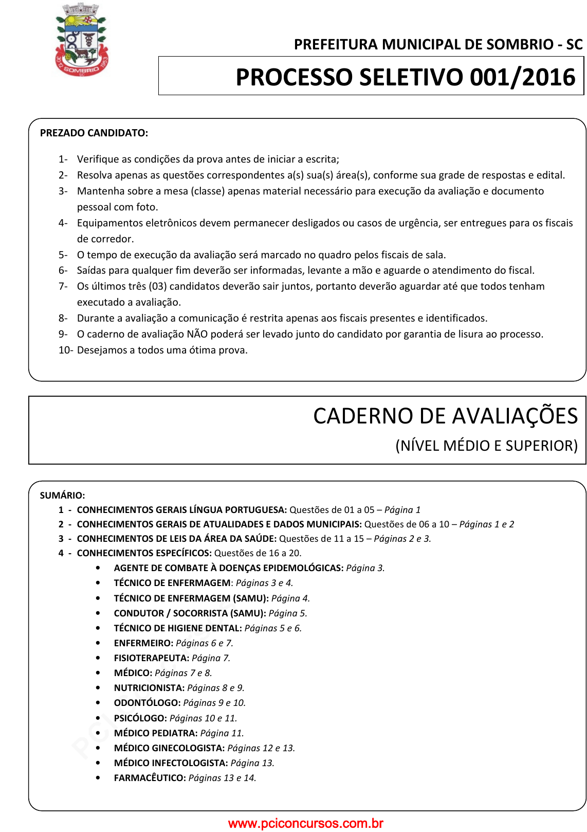 pcimarkpci MDAwMDowMDAwOjAwMDA6MDAwMDowMDAwOmZmZmY6MzZlOTpjMjU5:VGh1LCAxNiBTZXAgMjAyMSAxMzowNjo1MiAtMDMwMA== PREFEITURA MUNICIPAL DE SOMBRIO - SC PREZADO CANDIDATO: 1- Verifique as condições da prova antes de iniciar a escrita; 2- Resolva apenas as questões correspondentes a(s) sua(s) área(s), conforme sua grade de respostas e edital. 3- Mantenha sobre a mesa (classe) apenas material necessário para execução da avaliação e documento pessoal com foto. 4- Equipamentos eletrônicos devem permanecer desligados ou casos de urgência, ser entregues para os fiscais de corredor. 5- O tempo de execução da avaliação será marcado no quadro pelos fiscais de sala. 6- Saídas para qualquer fim deverão ser informadas, levante a mão e aguarde o atendimento do fiscal. 7- Os últimos três (03) candidatos deverão sair juntos, portanto deverão aguardar até que todos tenham executado a avaliação. 8- Durante a avaliação a comunicação é restrita apenas aos fiscais presentes e identificados. 9- O caderno de avaliação NÃO poderá ser levado junto do candidato por garantia de lisura ao processo. 10- Desejamos a todos uma ótima prova. SUMÁRIO: 1 - CONHECIMENTOS GERAIS LÍNGUA PORTUGUESA: Questões de 01 a 05 – Página 1 2 - CONHECIMENTOS GERAIS DE ATUALIDADES E DADOS MUNICIPAIS: Questões de 06 a 10 – Páginas 1 e 2 3 - CONHECIMENTOS DE LEIS DA ÁREA DA SAÚDE: Questões de 11 a 15 – Páginas 2 e 3. 4 - CONHECIMENTOS ESPECÍFICOS: Questões de 16 a 20. • AGENTE DE COMBATE À DOENÇAS EPIDEMOLÓGICAS: Página 3. • TÉCNICO DE ENFERMAGEM: Páginas 3 e 4. • TÉCNICO DE ENFERMAGEM (SAMU): Página 4. • CONDUTOR / SOCORRISTA (SAMU): Página 5. • TÉCNICO DE HIGIENE DENTAL: Páginas 5 e 6. • ENFERMEIRO: Páginas 6 e 7. • FISIOTERAPEUTA: Página 7. • MÉDICO: Páginas 7 e 8. • NUTRICIONISTA: Páginas 8 e 9. • ODONTÓLOGO: Páginas 9 e 10. • PSICÓLOGO: Páginas 10 e 11. • MÉDICO PEDIATRA: Página 11. • MÉDICO GINECOLOGISTA: Páginas 12 e 13. • MÉDICO INFECTOLOGISTA: Página 13. • FARMACÊUTICO: Páginas 13 e 14. PROCESSO SELETIVO 001/2016 CADERNO DE AVALIAÇÕES (NÍVEL MÉDIO E SUPERIOR) www.pciconcursos.com.br pcimarkpci MDAwMDowMDAwOjAwMDA6MDAwMDowMDAwOmZmZmY6MzZlOTpjMjU5:VGh1LCAxNiBTZXAgMjAyMSAxMzowNjo1MiAtMDMwMA== GerACT 2.0 | www.processosseletivos.com.br PROCESSO SELETIVO 001/2016 – SOMBRIO/SC. Página 1 CONHECIMENTOS GERAIS LÍNGUA PORTUGUESA 01 - Assinale a alternativa onde o uso do vocábulo “Porque” (e suas variações) fora usado como um substantivo e uma conjunção respectivamente: A) Ana Bella gostaria de compreender o porquê da confusão. / Ele não compareceu no dia da prova porque houve um grande imprevisto. B) Ele não compareceu no dia da prova porque houve um grande imprevisto. / Ana Bella gostaria de compreender o porquê da confusão. C) Por que as autoridades não fizeram nada no caso das barragens? / Ainda não se sabe o por que de tamanha tragédia. D) Ainda não se sabe o por que de tamanha tragédia. / Por que as autoridades não fizeram nada no caso das barragens? E) Os donos da empresa mostraram se tranquilos, por quê? / Por que as autoridades não fizeram nada no caso das barragens? 02 - Ao chegar naquela sala fria, o psicólogo logo a sentou no divã e diretamente lhe infere: __________ o que pensas, e quando chegar em casa __________ as coisas que te remontam o passado [...]. As palavras faltantes de acordo com o sentido do texto são: A) Dizes / Pegues B) Diz / Pegue C) Digas / Pegues D) Diga / Pega E) Diga / Pegues 03 - Classifique as definições dadas respectivamente: I. Forma de escrita poética onde o trovador demonstra toda a sua amargura ao tentar alcançar a sua musa. II. Forma poética caracterizada pelo maldizer, onde o sofrimento agora é da mulher, geralmente camponesas ou pastoras. A) Canção de amigo / Canção de amor B) Canção de amor / Canção de amigo C) Canção de amigo / Prosa romântica D) Prosa romântica / Crônica ideal E) Prosa do sofrimento / Prosa feminista 04 - Considere as assertivas dadas: I. O Quinhentismo é considerado como sendo a primeira fase da literatura brasileira, pois ocorreu na colonização. II. O barroco é marcado pela racionalização do homem livre do pensamento religioso. III. O Neoclassismo é conhecido pela ascensão da burguesia e as obras deste período são marcadas pelo linguajar rebuscado e formal. Está coerente o contido em: A) I apenas B) II apenas C) III apenas D) I e III E) I e II 05 - Acerca da acentuação de palavras de acordo com a ortografia vigente no país, considere V para as afirmações verdadeiras e F para as falsas: ( ) Ditongos abertos éi(s), ói(s), éu(s) não são acentuados nas palavras paroxítonas; ( ) Não utilizamos acentos no i e no u quando, nas palavras paroxítonas, estas letras vierem depois de um ditongo. ( ) Os ditongos monossilábicos abertos éi(s), éu(s), ói(s) não são acentuados após a reforma gramatical de 2009. A sequência CORRETA está em: A) F, V, V B) V, V, V C) F, F, F D) F, V, F E) V, V, F CONHECIMENTOS GERAIS ATUALIDADES E DADOS MUNICIPAIS 06 - Segundo o site BBC Brasil, os cidadãos da Nova Zelândia começaram a votar no dia 03 de março de 2016 em um plebiscito para dizer se concordam ou não com a mudança da bandeira do país. Eles terão até 24 de março para escolher, em voto pelo correio, se preferem o estandarte atual ou o alternativo, chamado de Silver Fern (samambaia prateada, em inglês). Em uma primeira votação, realizada em dezembro, o novo modelo, criado pelo arquiteto Kyle Lockwood e escolhido por um comitê entre cinco finalistas, saiu-se vencedor. No entanto, o desenho tem sido alvo de críticas por quem o considera pouco inspirado. O premiê neozelandês, John Key, é a favor da mudança pois: A) A bandeira atual foi escolhida em meio à pompa e patriotismo da Guerra Sul-Africana, e portanto, esta bandeira significa que a Grã-Bretanha reconheceu a Nova Zelândia como nação ind