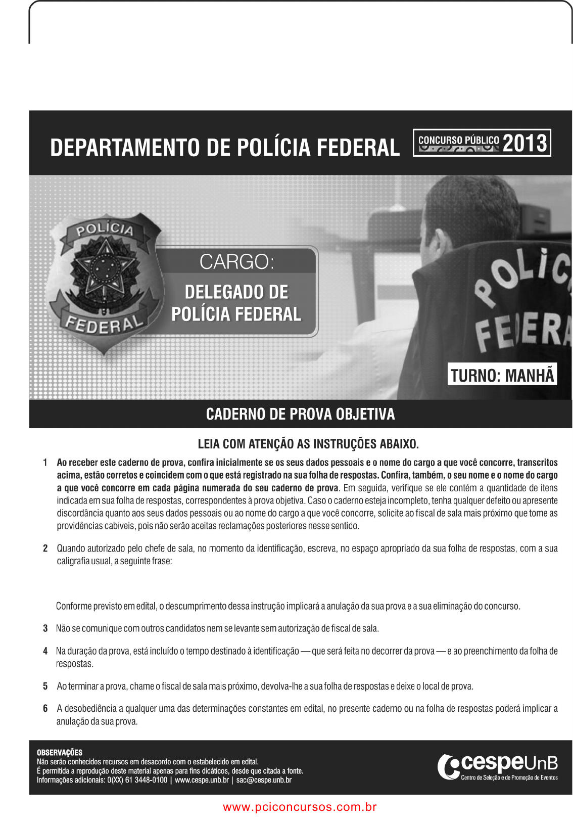 pcimarkpci MDAwMDowMDAwOjAwMDA6MDAwMDowMDAwOmZmZmY6MzZlOTpjMjU5:VGh1LCAxNiBTZXAgMjAyMSAxNzozOToxOSAtMDMwMA== www.pciconcursos.com.br pcimarkpci MDAwMDowMDAwOjAwMDA6MDAwMDowMDAwOmZmZmY6MzZlOTpjMjU5:VGh1LCAxNiBTZXAgMjAyMSAxNzozOToxOSAtMDMwMA== ||DPF13DEL_001_01N203450|| CESPE/UnB – MJ/DPF/2013 • De acordo com o comando a que cada um dos itens a seguir se refira, marque, na folha de respostas, para cada item: o campo designado com o código C, caso julgue o item CERTO; ou o campo designado com o código E, caso julgue o item ERRADO. A ausência de marcação ou a marcação de ambos os campos não serão apenadas, ou seja, não receberão pontuação negativa. Para as devidas marcações, use a folha de respostas, único documento válido para a correção da sua prova objetiva. • Sempre que utilizadas, as siglas subsequentes devem ser interpretadas com a significação associada a cada uma delas, da seguinte forma: CF = Constituição Federal de 1988; CP = Código Penal; MP = Ministério Público; RGPS = regime geral de previdência social; STF = Supremo Tribunal Federal; STJ = Superior Tribunal de Justiça. PROVA OBJETIVA No que se refere à CF e ao poder constituinte originário, julgue os itens subsequentes. 1 A CF contempla hipótese configuradora do denominado fenômeno da recepção material das normas constitucionais, que consiste na possiblidade de a norma de uma constituição anterior ser recepcionada pela nova constituição, com status de norma constitucional. 2 No sentido sociológico, a CF reflete a somatória dos fatores reais do poder em uma sociedade. Considerando o controle de constitucionalidade no ordenamento jurídico pátrio, julgue os itens subsecutivos. 3 Na ação direta de inconstitucionalidade ajuizada perante o STF, apesar de lhe ser aplicável o princípio da congruência ou da adstrição ao pedido, admite-se a declaração de inconstitucionalidade de uma norma que não tenha sido objeto do pedido, na hipótese configuradora da denominada inconstitucionalidade por arrastamento. 4 De acordo com entendimento do STF, no controle difuso de constitucionalidade, os tribunais não podem aplicar a denominada interpretação conforme a CF sem a observância da cláusula de reserva de plenário. No que diz respeito aos direitos fundamentais, julgue os itens que se seguem. 5 Segundo o STF, caso o interessado alegue que a sentença condenatória tenha sido prolatada exclusivamente com fundamento em prova emprestada, é possível a arguição de nulidade dessa decisão em sede de habeas corpus. 6 O exercício do direito de associação e a incidência da tutela constitucional relativa à liberdade de associação estão condicionados à prévia existência de associação dotada de personalidade jurídica. Acerca das atribuições da Polícia Federal, julgue os itens a seguir. 7 A Polícia Federal dispõe de competência para proceder à investigação de infrações penais cuja prática tenha repercussão interestadual ou internacional, exigindo-se repressão uniforme. 8 De acordo com a norma constitucional, cabe exclusivamente à Polícia Federal prevenir e reprimir o tráfico ilícito de entorpecentes e drogas afins, portanto a atuação da polícia militar de determinado estado da Federação no flagrante e apreensão de drogas implica a ilicitude da prova e a nulidade do auto de prisão. Considerando o disposto na CF acerca na ordem social, julgue os itens subsequentes. 9 A floresta amazônica brasileira, assim como a mata atlântica, é considerada bem da União, devendo sua utilização ocorrer na forma da lei, em condições que assegurem a preservação do meio ambiente, inclusive no que concerne ao uso dos recursos naturais. 10 As terras tradicionalmente ocupadas pelos índios, incluídas no domínio constitucional da União Federal, são inalienáveis, indisponíveis e insuscetíveis de prescrição aquisitiva. Em relação ao processo legislativo e ao sistema de governo adotado no Brasil, julgue o seguinte item. 11 A iniciativa das leis ordinárias cabe a qualquer membro ou comissão da Câmara dos Deputados, do Senado Federal ou do Congresso Nacional, bem como ao presidente da República, ao STF, aos tribunais superiores, ao procurador-geral da República e aos cidadãos. No que tange às leis complementares, a CF não autoriza a iniciativa popular de lei. Com base nas disposições da CF acerca das competências dos juízes federais, julgue o item a seguir. 12 Aos juízes federais compete processar e julgar, entre outros crimes, os que atentem contra a organização do trabalho e os de ingresso ou permanência irregular de estrangeiro no território nacional, bem como as disputas sobre direitos indígenas. No que se refere à classificação do órgão público e à atuação do servidor, julgue os itens seguintes. 13 O dispositivo constitucional que admite o afastamento do servidor do cargo, do emprego ou da função para o exercício de mandato é aplicável ao servidor contratado para atender a necessidade temporária de excepcional interesse público, já que exerce função pública. 14 Os ministérios e as secretarias de Estado são considerados, quanto à estrutura, órgãos públicos compostos. Julgue o item que se segue, relativo à administração indireta e aos serviços sociais autônomos. 15 A sociedade de economia mista é pessoa jurídica de direito privado que pode tanto executar atividade econômica própria da iniciativa privada quanto prestar serviço público. CARGO: DELEGADO DE POLÍCIA FEDERAL – 1 – www.pciconcursos.com.br pcimarkpci MDAwMDowMDAwOjAwMDA6MDAwMDowMDAwOmZmZmY6MzZlOTpjMjU5:VGh1LCAxNiBTZXAgMjAyMSAxNzozOToxOSAtMDMwMA== ||DPF13DEL_001_01N203450|| CESPE/UnB – MJ/DPF/2013 Com relação a atos administrativos, serviços públicos e procedimentos licitatórios, julgue os itens subsequentes. 16 O pregão, modalidade de licitação para aquisição de bens e serviços comuns, independentemente do valor estimado da contrat