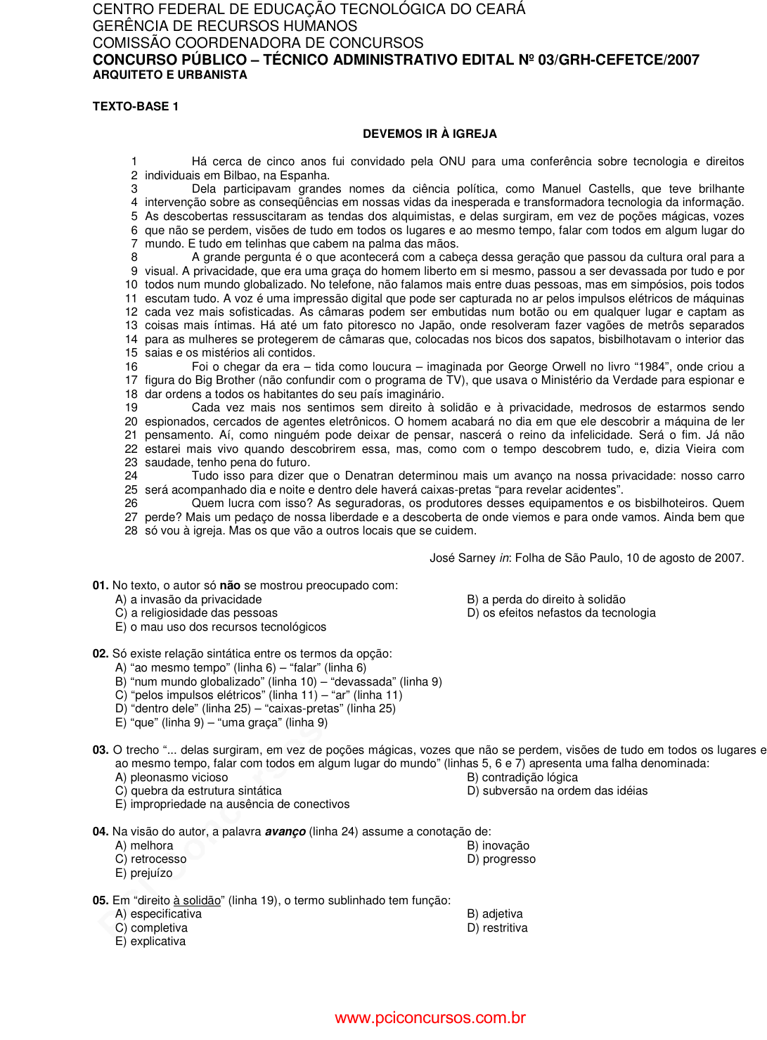 pcimarkpci MDAwMDowMDAwOjAwMDA6MDAwMDowMDAwOmZmZmY6MzZlOTpjMjU5:RnJpLCAxNyBTZXAgMjAyMSAyMDo0NTowMSAtMDMwMA== CENTRO FEDERAL DE EDUCAÇÃO TECNOLÓGICA DO CEARÁ GERÊNCIA DE RECURSOS HUMANOS COMISSÃO COORDENADORA DE CONCURSOS CONCURSO PÚBLICO – TÉCNICO ADMINISTRATIVO EDITAL Nº 03/GRH-CEFETCE/2007 ARQUITETO E URBANISTA TEXTO-BASE 1 DEVEMOS IR À IGREJA 1 2 3 4 5 6 7 8 9 10 11 12 13 14 15 16 17 18 19 20 21 22 23 24 25 26 27 28 Há cerca de cinco anos fui convidado pela ONU para uma conferência sobre tecnologia e direitos individuais em Bilbao, na Espanha. Dela participavam grandes nomes da ciência política, como Manuel Castells, que teve brilhante intervenção sobre as conseqüências em nossas vidas da inesperada e transformadora tecnologia da informação. As descobertas ressuscitaram as tendas dos alquimistas, e delas surgiram, em vez de poções mágicas, vozes que não se perdem, visões de tudo em todos os lugares e ao mesmo tempo, falar com todos em algum lugar do mundo. E tudo em telinhas que cabem na palma das mãos. A grande pergunta é o que acontecerá com a cabeça dessa geração que passou da cultura oral para a visual. A privacidade, que era uma graça do homem liberto em si mesmo, passou a ser devassada por tudo e por todos num mundo globalizado. No telefone, não falamos mais entre duas pessoas, mas em simpósios, pois todos escutam tudo. A voz é uma impressão digital que pode ser capturada no ar pelos impulsos elétricos de máquinas cada vez mais sofisticadas. As câmaras podem ser embutidas num botão ou em qualquer lugar e captam as coisas mais íntimas. Há até um fato pitoresco no Japão, onde resolveram fazer vagões de metrôs separados para as mulheres se protegerem de câmaras que, colocadas nos bicos dos sapatos, bisbilhotavam o interior das saias e os mistérios ali contidos. Foi o chegar da era – tida como loucura – imaginada por George Orwell no livro “1984”, onde criou a figura do Big Brother (não confundir com o programa de TV), que usava o Ministério da Verdade para espionar e dar ordens a todos os habitantes do seu país imaginário. Cada vez mais nos sentimos sem direito à solidão e à privacidade, medrosos de estarmos sendo espionados, cercados de agentes eletrônicos. O homem acabará no dia em que ele descobrir a máquina de ler pensamento. Aí, como ninguém pode deixar de pensar, nascerá o reino da infelicidade. Será o fim. Já não estarei mais vivo quando descobrirem essa, mas, como com o tempo descobrem tudo, e, dizia Vieira com saudade, tenho pena do futuro. Tudo isso para dizer que o Denatran determinou mais um avanço na nossa privacidade: nosso carro será acompanhado dia e noite e dentro dele haverá caixas-pretas “para revelar acidentes”. Quem lucra com isso? As seguradoras, os produtores desses equipamentos e os bisbilhoteiros. Quem perde? Mais um pedaço de nossa liberdade e a descoberta de onde viemos e para onde vamos. Ainda bem que só vou à igreja. Mas os que vão a outros locais que se cuidem. José Sarney in: Folha de São Paulo, 10 de agosto de 2007. 01. No texto, o autor só não se mostrou preocupado com: A) a invasão da privacidade B) a perda do direito à solidão C) a religiosidade das pessoas D) os efeitos nefastos da tecnologia E) o mau uso dos recursos tecnológicos 02. Só existe relação sintática entre os termos da opção: A) “ao mesmo tempo” (linha 6) – “falar” (linha 6) B) “num mundo globalizado” (linha 10) – “devassada” (linha 9) C) “pelos impulsos elétricos” (linha 11) – “ar” (linha 11) D) “dentro dele” (linha 25) – “caixas-pretas” (linha 25) E) “que” (linha 9) – “uma graça” (linha 9) 03. O trecho “... delas surgiram, em vez de poções mágicas, vozes que não se perdem, visões de tudo em todos os lugares e ao mesmo tempo, falar com todos em algum lugar do mundo” (linhas 5, 6 e 7) apresenta uma falha denominada: A) pleonasmo vicioso B) contradição lógica C) quebra da estrutura sintática D) subversão na ordem das idéias E) impropriedade na ausência de conectivos 04. Na visão do autor, a palavra avanço (linha 24) assume a conotação de: A) melhora B) inovação C) retrocesso D) progresso E) prejuízo 05. Em “direito à solidão” (linha 19), o termo sublinhado tem função: A) especificativa B) adjetiva C) completiva D) restritiva E) explicativa www.pciconcursos.com.br pcimarkpci MDAwMDowMDAwOjAwMDA6MDAwMDowMDAwOmZmZmY6MzZlOTpjMjU5:RnJpLCAxNyBTZXAgMjAyMSAyMDo0NTowMSAtMDMwMA== 06. Em “... haverá caixas-pretas... “ (linha 25), a forma verbal grifada pode ser substituída por: A) hão de haver B) devem haver C) podem haver D) poderão haver E) há de haver 07. No trecho “A privacidade [...] globalizado” (linhas 9 e 10), há: A) um pronome demonstrativo de valor reforçativo. B) um pronome relativo sem antecedente. C) dois pronomes indefinidos variáveis. D) um pronome pessoal oblíquo átono. E) três pronomes substantivos e dois pronomes adjetivos. 08. Trocando-se a expressão outros locais (linha 28) por outras localidades, o a que a antecede: A) deve receber acento indicativo de crase. B) terá, obrigatoriamente, que se fundir com o artigo a, flexionar-se no plural e receber acento indicativo de crase. C) continua simples preposição, portanto não deve receber acento indicativo de crase. D) receberá acento indicativo de crase facultativamente. E) receberá acento indicativo de crase por motivo de clareza. 09. No trecho “Dela participaram grandes nomes da ciência política” (linha 3), os termos da oração (sujeito, verbo e complemento) aparecem fora da ordem natural, o que caracteriza um recurso estilístico denominado: A) anáfora B) anástrofe C) anacoluto D) assíndeto E) pleonasmo 10. Está errado quanto à regência (nominal ou verbal): A) No passado, os recursos tecnológicos que dispúnhamos não representavam riscos a nossa individualidade. B) Estamos cercados com abusos tecnológicos que