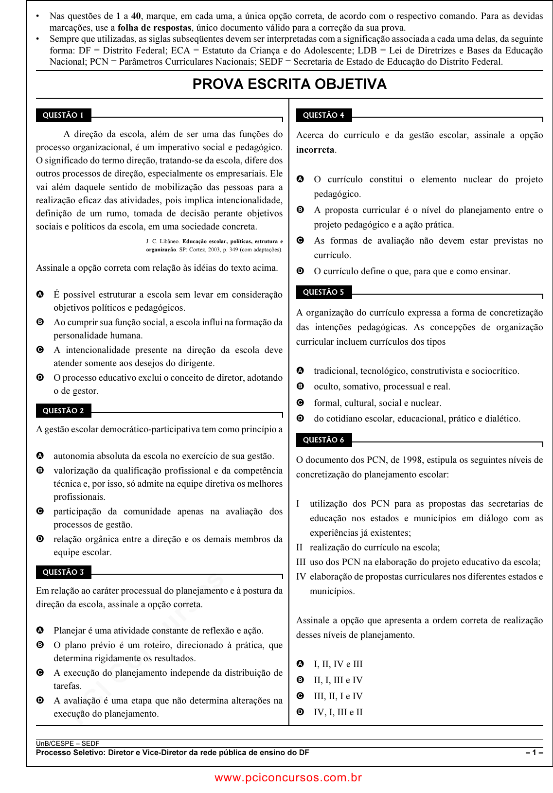pcimarkpci MDAwMDowMDAwOjAwMDA6MDAwMDowMDAwOmZmZmY6MzZlOTpjMjU5:VGh1LCAxNiBTZXAgMjAyMSAxOToxMTo1NSAtMDMwMA== UnB/CESPE – SEDF Processo Seletivo: Diretor e Vice-Diretor da rede pública de ensino do DF – 1 – • Nas questões de 1 a 40, marque, em cada uma, a única opção correta, de acordo com o respectivo comando. Para as devidas marcações, use a folha de respostas, único documento válido para a correção da sua prova. • Sempre que utilizadas, as siglas subseqüentes devem ser interpretadas com a significação associada a cada uma delas, da seguinte forma: DF = Distrito Federal; ECA = Estatuto da Criança e do Adolescente; LDB = Lei de Diretrizes e Bases da Educação Nacional; PCN = Parâmetros Curriculares Nacionais; SEDF = Secretaria de Estado de Educação do Distrito Federal. PROVA ESCRITA OBJETIVA �������� A direção da escola, além de ser uma das funções do processo organizacional, é um imperativo social e pedagógico. O significado do termo direção, tratando-se da escola, difere dos outros processos de direção, especialmente os empresariais. Ele vai além daquele sentido de mobilização das pessoas para a realização eficaz das atividades, pois implica intencionalidade, definição de um rumo, tomada de decisão perante objetivos sociais e políticos da escola, em uma sociedade concreta. J. C. Libâneo. Educação escolar, políticas, estrutura e organização. SP: Cortez, 2003, p. 349 (com adaptações). Assinale a opção correta com relação às idéias do texto acima. A É possível estruturar a escola sem levar em consideração objetivos políticos e pedagógicos. B Ao cumprir sua função social, a escola influi na formação da personalidade humana. C A intencionalidade presente na direção da escola deve atender somente aos desejos do dirigente. D O processo educativo exclui o conceito de diretor, adotando o de gestor. �������� A gestão escolar democrático-participativa tem como princípio a A autonomia absoluta da escola no exercício de sua gestão. B valorização da qualificação profissional e da competência técnica e, por isso, só admite na equipe diretiva os melhores profissionais. C participação da comunidade apenas na avaliação dos processos de gestão. D relação orgânica entre a direção e os demais membros da equipe escolar. ��������� Em relação ao caráter processual do planejamento e à postura da direção da escola, assinale a opção correta. A Planejar é uma atividade constante de reflexão e ação. B O plano prévio é um roteiro, direcionado à prática, que determina rigidamente os resultados. C A execução do planejamento independe da distribuição de tarefas. D A avaliação é uma etapa que não determina alterações na execução do planejamento. ��������� Acerca do currículo e da gestão escolar, assinale a opção incorreta. A O currículo constitui o elemento nuclear do projeto pedagógico. B A proposta curricular é o nível do planejamento entre o projeto pedagógico e a ação prática. C As formas de avaliação não devem estar previstas no currículo. D O currículo define o que, para que e como ensinar. �������� A organização do currículo expressa a forma de concretização das intenções pedagógicas. As concepções de organização curricular incluem currículos dos tipos A tradicional, tecnológico, construtivista e sociocrítico. B oculto, somativo, processual e real. C formal, cultural, social e nuclear. D do cotidiano escolar, educacional, prático e dialético. ��������� O documento dos PCN, de 1998, estipula os seguintes níveis de concretização do planejamento escolar: I utilização dos PCN para as propostas das secretarias de educação nos estados e municípios em diálogo com as experiências já existentes; II realização do currículo na escola; III uso dos PCN na elaboração do projeto educativo da escola; IV elaboração de propostas curriculares nos diferentes estados e municípios. Assinale a opção que apresenta a ordem correta de realização desses níveis de planejamento. A I, II, IV e III B II, I, III e IV C III, II, I e IV D IV, I, III e II www.pciconcursos.com.br pcimarkpci MDAwMDowMDAwOjAwMDA6MDAwMDowMDAwOmZmZmY6MzZlOTpjMjU5:VGh1LCAxNiBTZXAgMjAyMSAxOToxMTo1NSAtMDMwMA== UnB/CESPE – SEDF Processo Seletivo: Diretor e Vice-Diretor da rede pública de ensino do DF – 2 – ��������� Nas várias áreas do currículo escolar, existem, implícita ou explicitamente, ensinamentos a respeito dos temas transversais, isto é, todas essas áreas educam em relação a questões sociais por meio de suas concepções e dos valores que veiculam nos conteúdos. Os temas transversais A devem ser integrados nos currículos escolares por meio da instauração de disciplinas específicas. B têm a finalidade de favorecer a compreensão da realidade e a participação social. C foram pensados dentro de uma concepção de neutralidade. D devem ser trabalhados visando apenas os aspectos e problemas internos da escola. ��������� Em virtude de mudanças recentes, tornou-se evidente a necessidade de revisão das Diretrizes Curriculares Nacionais para a Educação Básica como um todo. A principal causa para a reformulação dessas diretrizes foi a A inclusão da educação infantil na educação básica. B proposta de ampliação da carga horária de tempo parcial para integral. C disposição normativa que ampliou o período do ensino fundamental para nove anos. D readequação das disciplinas de língua estrangeira moderna e artes de acordo com novas orientações. ��������� São muitos os desafios atuais da educação brasileira, entre eles a realização da cidadania, a oferta de educação de qualidade e a superação das desigualdades. Nesse sentido, as responsabilidades da educação escolar contemporânea incluem A