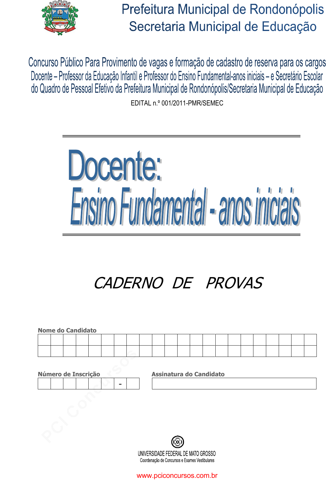 pcimarkpci MDAwMDowMDAwOjAwMDA6MDAwMDowMDAwOmZmZmY6MzZlOTpjMjU5:VGh1LCAxNiBTZXAgMjAyMSAxOToyODo1NCAtMDMwMA== EDITAL n.º 001/2011-PMR/SEMEC CADERNO DE PROVAS Nome do Candidato Número de Inscrição Assinatura do Candidato - www.pciconcursos.com.br pcimarkpci MDAwMDowMDAwOjAwMDA6MDAwMDowMDAwOmZmZmY6MzZlOTpjMjU5:VGh1LCAxNiBTZXAgMjAyMSAxOToyODo1NCAtMDMwMA== Instruções LEIA COM ATENÇÃO 1. Este Caderno de Provas, com páginas numeradas de 1 a 17, é constituído de uma Prova de Redação e de uma Prova Objetiva com 40 (quarenta) questões de múltipla escolha, cada uma com quatro alternativas, assim distribuídas: 01 a 10 – Língua Portuguesa 11 a 20 – Fundamentos de Educação e Legislação 21 a 40 – Conhecimentos Específicos 2. Caso o Caderno de Provas esteja incompleto ou tenha qualquer defeito de impressão, solicite ao fiscal que o substitua. 3. Sobre a Marcação da Folha de Respostas As respostas das questões da Prova Objetiva devem ser, obrigatoriamente, transcritas com caneta esferográfica de tinta preta não porosa para a Folha de Respostas, que será o único documento válido para correção. Não haverá substituição da Folha de Respostas por erro do candidato. 3.1. Para cada questão existe apenas uma alternativa que a responde acertadamente. Para a marcação da alternativa escolhida na FOLHA DE RESPOSTAS, pinte completamente o círculo correspondente. Exemplo: Suponha que para determinada questão a alternativa C seja a escolhida. N.º da Questão A B C D 3.2. Será invalidada a questão em que houver mais de uma marcação, marcação rasurada ou emendada, ou não houver marcação. 3.3. Não rasure nem amasse a FOLHA DE RESPOSTAS. 4. Na elaboração da Redação, poderá ser usada para rascunho a página 2 deste Caderno, mas o texto definitivo deverá ser transcrito na Folha de Redação. Use caneta esferográfica de tinta preta não porosa. 5. Na Folha de Redação, NÃO faça qualquer marca que o identifique fora do espaço destinado para tal fim. 6. Todos os espaços em branco, neste caderno, podem ser utilizados para rascunho. 7. A duração das provas é 5 (cinco) horas, já incluído o tempo destinado ao preenchimento da FOLHA DE RESPOSTAS e à transcrição da Redação para a Folha de Redação. 8. Será permitida a saída de candidatos da sala de prova somente após decorridas 2:30 h (duas horas e trinta minutos) do início das provas. 9. O candidato que insistir em sair da sala de prova antes de transcorridas 2:30 h (duas horas e trinta minutos) do início das provas deverá assinar Termo de Ocorrência declarando desistência do Concurso. 10. Antes de se retirar da sala de prova, o candidato deverá, obrigatoriamente, entregar ao fiscal este Caderno, a Folha de Respostas e a Folha de Redação. Este Caderno de Provas poderá ser levado pelo candidato somente na última meia hora de prova. 11. É vedado ao candidato copiar as marcações feitas na Folha de Respostas. www.pciconcursos.com.br pcimarkpci MDAwMDowMDAwOjAwMDA6MDAwMDowMDAwOmZmZmY6MzZlOTpjMjU5:VGh1LCAxNiBTZXAgMjAyMSAxOToyODo1NCAtMDMwMA== 1/17 – Docente: Professor do Ensino Fundamental – anos iniciais Prova de Redação Instrução: Leia atentamente o texto de apoio abaixo, escrito por Lya Luft, uma das mais consagradas escritoras da atualidade. O sentido da educação Um povo desinformado não sabe o que acontece, assina o que não leu, submete-se ao que não compreendeu, barateia sua vida e sua força de trabalho, não tem horizontes e não se integra em seu próprio país, quanto mais no grande mundo globalizado ─ mas não para ele. Porém educar não é apenas instruir, ensinar a ler, escrever, calcular. Não é nem mesmo instruir em todos os anos dos Ensinos Fundamental e Médio. Educar é, deveria ser, antes de mais nada, ensinar a pensar. Ensinar a questionar. Abrir cabeças e preparar para enfrentar a vida não apenas ganhando um ou dois ou mil salários, mas sentindo-se capaz, e consciente, para fazer suas escolhas e viver sua vida. Educar deve ser estimular para que desabrochem todas as capacidades de uma criança, e depois, de um jovem. [...] Sou a favor de uma escola amorosa e alegre, mas onde haja autoridade e hierarquia, e também para os pequenos a professora não seja uma tia, mas uma professora, pois a escola não é, nem deve ser, a família. Pode ser um complemento magnífico, mas jamais retirar da família a responsabilidade inicial da decência, da compostura, do respeito: ao contrário, prosseguir e incutir isso ainda mais. [...] PROPOSTA Segundo Lya Luft, prestigiada autora da literatura contemporânea, a escola e a família compõem o universo da criança. A partir de sua reflexão, suscitada pelo texto acima, produza um texto dissertativo-argumentativo discutindo o papel da família numa ação conjunta com a escola. Não se esqueça de que seu texto deve ter um título, ser coeso e coerente e ser escrito segundo as normas da escrita padrão. (Observação: Não assine seu texto.) www.pciconcursos.com.br pcimarkpci MDAwMDowMDAwOjAwMDA6MDAwMDowMDAwOmZmZmY6MzZlOTpjMjU5:VGh1LCAxNiBTZXAgMjAyMSAxOToyODo1NCAtMDMwMA== 2/17 – Docente: Professor do Ensino Fundamental – anos iniciais Página de Rascunho 01 02 03 04 05 06 07 08 09 10 11 12 13 14 15 16 17 18 19 20 21 22 23 24 25 26 27 28 29 30 www.pciconcursos.com.br pcimarkpci MDAwMDowMDAwOjAwMDA6MDAwMDowMDAwOmZmZmY6MzZlOTpjMjU5:VGh1LCAxNiBTZXAgMjAyMSAxOToyODo1NCAtMDMwMA== 3/17 – Docente: Professor do Ensino Fundamental – anos iniciais Prova Objetiva Língua Portuguesa Instrução: Leia atentamente o anúncio abaixo e responda às questões de 01 a 03. (CEREJA, W. R. Gramática Reflexiva. 3.ed. reform. São Paulo: Atual, 2009.) Questão 01 Sobre os sentidos do texto, marque V para as afirmativas verdadeiras e F para as falsas. ( ) No início, o sonho de toda mulher parece ser encontrar o homem ideal com as características anunciadas. ( ) Um novo sentido ocorre com o acréscimo da imagem: saborear um sorvete com