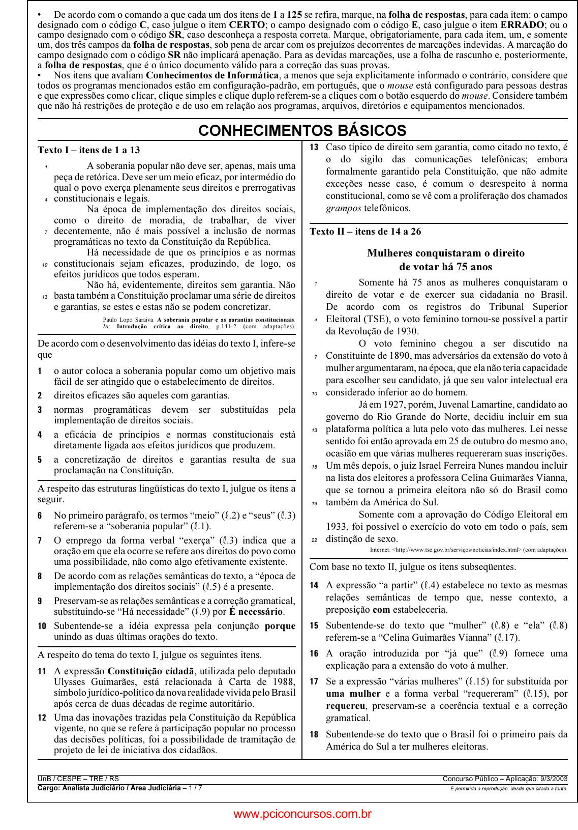 pcimarkpci MDAwMDowMDAwOjAwMDA6MDAwMDowMDAwOmZmZmY6MzZlOTpjMjU5:RnJpLCAxNyBTZXAgMjAyMSAxNzoxNzozNyAtMDMwMA== UnB / CESPE – TRE / RS Concurso Público – Aplicação: 9/3/2003 Cargo: Analista Judiciário / Área Judiciária – 1 / 7 É permitida a reprodução, desde que citada a fonte. • De acordo com o comando a que cada um dos itens de 1 a 125 se refira, marque, na folha de respostas, para cada item: o campo designado com o código C, caso julgue o item CERTO; o campo designado com o código E, caso julgue o item ERRADO; ou o campo designado com o código SR, caso desconheça a resposta correta. Marque, obrigatoriamente, para cada item, um, e somente um, dos três campos da folha de respostas, sob pena de arcar com os prejuízos decorrentes de marcações indevidas. A marcação do campo designado com o código SR não implicará apenação. Para as devidas marcações, use a folha de rascunho e, posteriormente, a folha de respostas, que é o único documento válido para a correção das suas provas. • Nos itens que avaliam Conhecimentos de Informática, a menos que seja explicitamente informado o contrário, considere que todos os programas mencionados estão em configuração-padrão, em português, que o mouse está configurado para pessoas destras e que expressões como clicar, clique simples e clique duplo referem-se a cliques com o botão esquerdo do mouse. Considere também que não há restrições de proteção e de uso em relação aos programas, arquivos, diretórios e equipamentos mencionados. CONHECIMENTOS BÁSICOS Texto I – itens de 1 a 13 A soberania popular não deve ser, apenas, mais uma1 peça de retórica. Deve ser um meio eficaz, por intermédio do qual o povo exerça plenamente seus direitos e prerrogativas constitucionais e legais.4 Na época de implementação dos direitos sociais, como o direito de moradia, de trabalhar, de viver decentemente, não é mais possível a inclusão de normas7 programáticas no texto da Constituição da República. Há necessidade de que os princípios e as normas constitucionais sejam eficazes, produzindo, de logo, os10 efeitos jurídicos que todos esperam. Não há, evidentemente, direitos sem garantia. Não basta também a Constituição proclamar uma série de direitos13 e garantias, se estes e estas não se podem concretizar. Paulo Lopo Saraiva. A soberania popular e as garantias constitucionais. In: Introdução crítica ao direito, p.141-2 (com adaptações). De acordo com o desenvolvimento das idéias do texto I, infere-se que � o autor coloca a soberania popular como um objetivo mais fácil de ser atingido que o estabelecimento de direitos. � direitos eficazes são aqueles com garantias. � normas programáticas devem ser substituídas pela implementação de direitos sociais. � a eficácia de princípios e normas constitucionais está diretamente ligada aos efeitos jurídicos que produzem. � a concretização de direitos e garantias resulta de sua proclamação na Constituição. A respeito das estruturas lingüísticas do texto I, julgue os itens a seguir. � No primeiro parágrafo, os termos “meio” (R.2) e “seus” (R.3) referem-se a “soberania popular” (R.1). � O emprego da forma verbal “exerça” (R.3) indica que a oração em que ela ocorre se refere aos direitos do povo como uma possibilidade, não como algo efetivamente existente. � De acordo com as relações semânticas do texto, a “época de implementação dos direitos sociais” (R.5) é a presente. Preservam-se as relações semânticas e a correção gramatical, substituindo-se “Há necessidade” (R.9) por É necessário. � Subentende-se a idéia expressa pela conjunção porque unindo as duas últimas orações do texto. A respeito do tema do texto I, julgue os seguintes itens. �� A expressão Constituição cidadã, utilizada pelo deputado Ulysses Guimarães, está relacionada à Carta de 1988, símbolo jurídico-político da nova realidade vivida pelo Brasil após cerca de duas décadas de regime autoritário. �� Uma das inovações trazidas pela Constituição da República vigente, no que se refere à participação popular no processo das decisões políticas, foi a possibilidade de tramitação de projeto de lei de iniciativa dos cidadãos. �� Caso típico de direito sem garantia, como citado no texto, é o do sigilo das comunicações telefônicas; embora formalmente garantido pela Constituição, que não admite exceções nesse caso, é comum o desrespeito à norma constitucional, como se vê com a proliferação dos chamados grampos telefônicos. Texto II – itens de 14 a 26 Mulheres conquistaram o direito de votar há 75 anos Somente há 75 anos as mulheres conquistaram o1 direito de votar e de exercer sua cidadania no Brasil. De acordo com os registros do Tribunal Superior Eleitoral (TSE), o voto feminino tornou-se possível a partir4 da Revolução de 1930. O voto feminino chegou a ser discutido na Constituinte de 1890, mas adversários da extensão do voto à7 mulher argumentaram, na época, que ela não teria capacidade para escolher seu candidato, já que seu valor intelectual era considerado inferior ao do homem. 10 Já em 1927, porém, Juvenal Lamartine, candidato ao governo do Rio Grande do Norte, decidiu incluir em sua plataforma política a luta pelo voto das mulheres. Lei nesse13 sentido foi então aprovada em 25 de outubro do mesmo ano, ocasião em que várias mulheres requereram suas inscrições. Um mês depois, o juiz Israel Ferreira Nunes mandou incluir16 na lista dos eleitores a professora Celina Guimarães Vianna, que se tornou a primeira eleitora não só do Brasil como também da América do Sul. 19 Somente com a aprovação do Código Eleitoral em 1933, foi possível o exercício do voto em todo o país, sem distinção de sexo. 22 Internet: <http://www.tse.gov.br/serviços/notícias/index.html> (com adaptações). Com base no texto II, julgue os itens subseqüentes. 