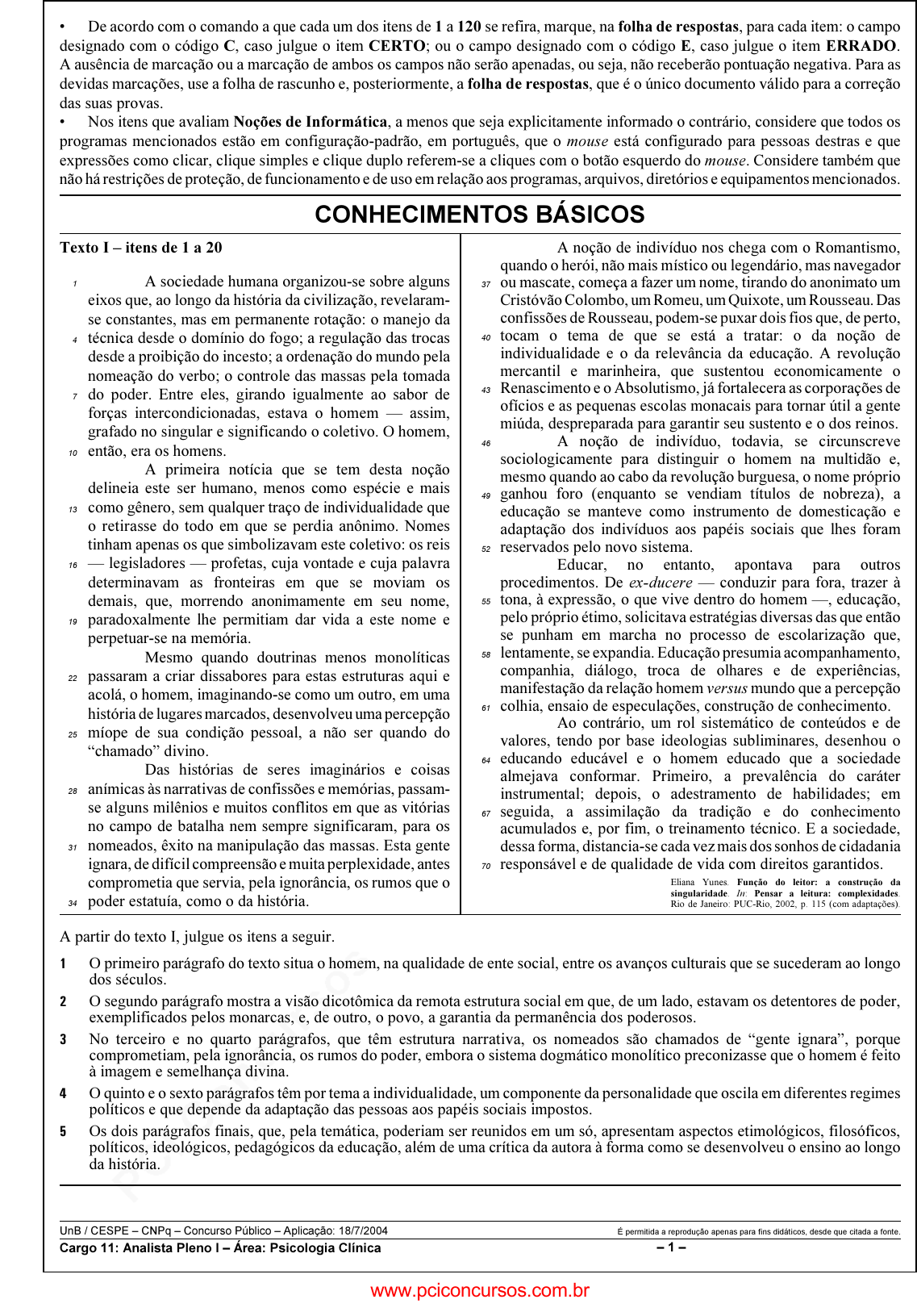 pcimarkpci MDAwMDowMDAwOjAwMDA6MDAwMDowMDAwOmZmZmY6MzZlOTpjMjU5:RnJpLCAxNyBTZXAgMjAyMSAxODo0NjozMiAtMDMwMA== UnB / CESPE – CNPq – Concurso Público – Aplicação: 18/7/2004 É permitida a reprodução apenas para fins didáticos, desde que citada a fonte. Cargo 11: Analista Pleno I – Área: Psicologia Clínica – 1 – • De acordo com o comando a que cada um dos itens de 1 a 120 se refira, marque, na folha de respostas, para cada item: o campo designado com o código C, caso julgue o item CERTO; ou o campo designado com o código E, caso julgue o item ERRADO. A ausência de marcação ou a marcação de ambos os campos não serão apenadas, ou seja, não receberão pontuação negativa. Para as devidas marcações, use a folha de rascunho e, posteriormente, a folha de respostas, que é o único documento válido para a correção das suas provas. • Nos itens que avaliam Noções de Informática, a menos que seja explicitamente informado o contrário, considere que todos os programas mencionados estão em configuração-padrão, em português, que o mouse está configurado para pessoas destras e que expressões como clicar, clique simples e clique duplo referem-se a cliques com o botão esquerdo do mouse. Considere também que não há restrições de proteção, de funcionamento e de uso em relação aos programas, arquivos, diretórios e equipamentos mencionados. CONHECIMENTOS BÁSICOS Texto I – itens de 1 a 20 A sociedade humana organizou-se sobre alguns1 eixos que, ao longo da história da civilização, revelaram- se constantes, mas em permanente rotação: o manejo da técnica desde o domínio do fogo; a regulação das trocas4 desde a proibição do incesto; a ordenação do mundo pela nomeação do verbo; o controle das massas pela tomada do poder. Entre eles, girando igualmente ao sabor de7 forças intercondicionadas, estava o homem — assim, grafado no singular e significando o coletivo. O homem, então, era os homens.10 A primeira notícia que se tem desta noção delineia este ser humano, menos como espécie e mais como gênero, sem qualquer traço de individualidade que13 o retirasse do todo em que se perdia anônimo. Nomes tinham apenas os que simbolizavam este coletivo: os reis — legisladores — profetas, cuja vontade e cuja palavra16 determinavam as fronteiras em que se moviam os demais, que, morrendo anonimamente em seu nome, paradoxalmente lhe permitiam dar vida a este nome e19 perpetuar-se na memória. Mesmo quando doutrinas menos monolíticas passaram a criar dissabores para estas estruturas aqui e22 acolá, o homem, imaginando-se como um outro, em uma história de lugares marcados, desenvolveu uma percepção míope de sua condição pessoal, a não ser quando do25 “chamado” divino. Das histórias de seres imaginários e coisas anímicas às narrativas de confissões e memórias, passam-28 se alguns milênios e muitos conflitos em que as vitórias no campo de batalha nem sempre significaram, para os nomeados, êxito na manipulação das massas. Esta gente31 ignara, de difícil compreensão e muita perplexidade, antes comprometia que servia, pela ignorância, os rumos que o poder estatuía, como o da história.34 A noção de indivíduo nos chega com o Romantismo, quando o herói, não mais místico ou legendário, mas navegador ou mascate, começa a fazer um nome, tirando do anonimato um37 Cristóvão Colombo, um Romeu, um Quixote, um Rousseau. Das confissões de Rousseau, podem-se puxar dois fios que, de perto, tocam o tema de que se está a tratar: o da noção de40 individualidade e o da relevância da educação. A revolução mercantil e marinheira, que sustentou economicamente o Renascimento e o Absolutismo, já fortalecera as corporações de43 ofícios e as pequenas escolas monacais para tornar útil a gente miúda, despreparada para garantir seu sustento e o dos reinos. A noção de indivíduo, todavia, se circunscreve46 sociologicamente para distinguir o homem na multidão e, mesmo quando ao cabo da revolução burguesa, o nome próprio ganhou foro (enquanto se vendiam títulos de nobreza), a49 educação se manteve como instrumento de domesticação e adaptação dos indivíduos aos papéis sociais que lhes foram reservados pelo novo sistema.52 Educar, no entanto, apontava para outros procedimentos. De ex-ducere — conduzir para fora, trazer à tona, à expressão, o que vive dentro do homem —, educação,55 pelo próprio étimo, solicitava estratégias diversas das que então se punham em marcha no processo de escolarização que, lentamente, se expandia. Educação presumia acompanhamento,58 companhia, diálogo, troca de olhares e de experiências, manifestação da relação homem versus mundo que a percepção colhia, ensaio de especulações, construção de conhecimento.61 Ao contrário, um rol sistemático de conteúdos e de valores, tendo por base ideologias subliminares, desenhou o educando educável e o homem educado que a sociedade64 almejava conformar. Primeiro, a prevalência do caráter instrumental; depois, o adestramento de habilidades; em seguida, a assimilação da tradição e do conhecimento67 acumulados e, por fim, o treinamento técnico. E a sociedade, dessa forma, distancia-se cada vez mais dos sonhos de cidadania responsável e de qualidade de vida com direitos garantidos.70 Eliana Yunes. Função do leitor: a construção da singularidade. In: Pensar a leitura: complexidades. Rio de Janeiro: PUC-Rio, 2002, p. 115 (com adaptações). A partir do texto I, julgue os itens a seguir. � O primeiro parágrafo do texto situa o homem, na qualidade de ente social, entre os avanços culturais que se sucederam ao longo dos séculos. � O segundo parágrafo mostra a visão dicotômica da remota estrutura social em que, de um lado, estavam os detentores de poder, exemplificados pelos monarcas, e, de outro, o povo, a garantia da permanência dos poderosos. � No terceiro e no quarto parágrafos, que têm estrutura nar