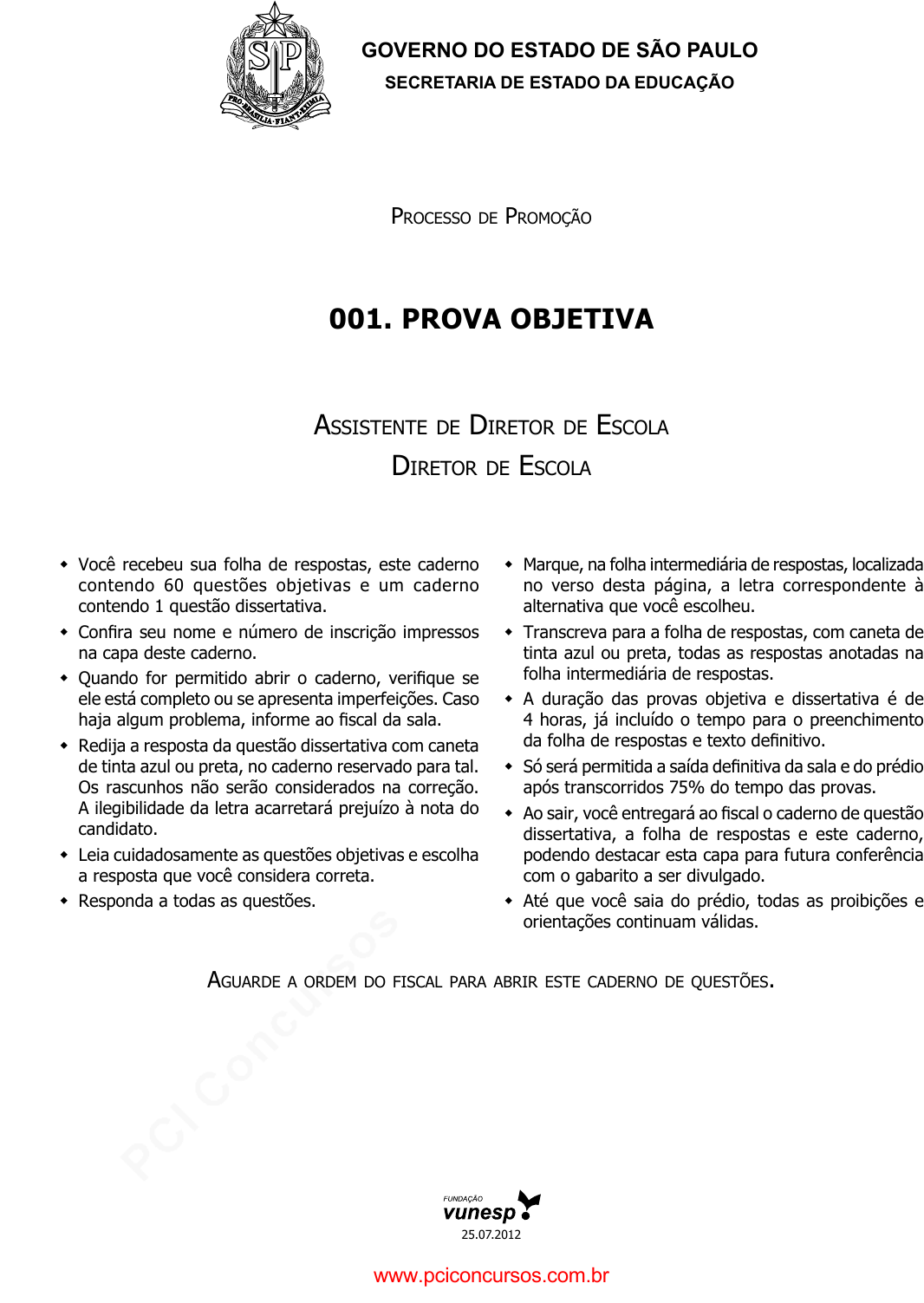 pcimarkpci MDAwMDowMDAwOjAwMDA6MDAwMDowMDAwOmZmZmY6MzZlOTpjMjU5:RnJpLCAxNyBTZXAgMjAyMSAyMzo0MToyNyAtMDMwMA== GOVERNO DO ESTADO DE SÃO PAULO SECRETARIA DE ESTADO DA EDUCAÇÃO Processo de Promoção 001. Prova objetiva Assistente de diretor de escolA diretor de escolA Você recebeu sua folha de respostas, este caderno contendo 60 questões objetivas e um caderno contendo 1 questão dissertativa. Confira seu nome e número de inscrição impressos na capa deste caderno. Quando for permitido abrir o caderno, verifique se ele está completo ou se apresenta imperfeições. Caso haja algum problema, informe ao fiscal da sala. Redija a resposta da questão dissertativa com caneta de tinta azul ou preta, no caderno reservado para tal. Os rascunhos não serão considerados na correção. A ilegibilidade da letra acarretará prejuízo à nota do candidato. Leia cuidadosamente as questões objetivas e escolha a resposta que você considera correta. Responda a todas as questões. Marque, na folha intermediária de respostas, localizada no verso desta página, a letra correspondente à alternativa que você escolheu. Transcreva para a folha de respostas, com caneta de tinta azul ou preta, todas as respostas anotadas na folha intermediária de respostas. A duração das provas objetiva e dissertativa é de 4 horas, já incluído o tempo para o preenchimento da folha de respostas e texto definitivo. Só será permitida a saída definitiva da sala e do prédio após transcorridos 75% do tempo das provas. Ao sair, você entregará ao fiscal o caderno de questão dissertativa, a folha de respostas e este caderno, podendo destacar esta capa para futura conferência com o gabarito a ser divulgado. Até que você saia do prédio, todas as proibições e orientações continuam válidas. AguArde A ordem do fiscAl PArA Abrir este cAderno de questões. 25.07.2012 www.pciconcursos.com.br pcimarkpci MDAwMDowMDAwOjAwMDA6MDAwMDowMDAwOmZmZmY6MzZlOTpjMjU5:RnJpLCAxNyBTZXAgMjAyMSAyMzo0MToyNyAtMDMwMA== Folha IntermedIárIa de respostas www.pciconcursos.com.br pcimarkpci MDAwMDowMDAwOjAwMDA6MDAwMDowMDAwOmZmZmY6MzZlOTpjMjU5:RnJpLCAxNyBTZXAgMjAyMSAyMzo0MToyNyAtMDMwMA== 3 SEED1202/001-AssistDirEscola-DirEscola FORMAÇÃO ESPECÍFICA 01. De acordo com Abranches (2003), a Conferência Mundial sobre Educação para todos, em 1990, em Jontiem, na Tailândia, com a participação de 155 países, deixou como compromisso (A) a elaboração de um documento em 2010, caracte- rizando as propostas educacionais e as diretrizes governamentais. (B) o plano decenal de educação para todos, que definiu novas modalidades educativas e governamentais. (C) a garantia da educação básica a todas crianças, jovens e adultos e a promoção da equidade. (D) o direcionamento de novos padrões de gestão, pos- sibilitando a organização de um trabalho didático pedagógico de qualidade. (E) promover um ensino de qualidade, priorizando uma ampla interação com a comunidade. 02. Segundo estudos e análises dos registros em atas de reu- niões de colegiado, em escolas públicas, Abranches (2003) declara: “[...] percebe-se que, na maioria das vezes, essas deman- das partem da escola. A pauta apresentada pela diretora e presidente do colegiado vem pronta para a reunião e sem questões trazidas pela comunidade [...] a direção já apresenta uma planilha de gastos e de um valor predefi- nido para a contribuição dos pais, submetendo apenas a aprovação”. Nesse texto, a autora denuncia que (A) o Colegiado constitui um espaço de implantação democrática, pois todos os segmentos participam igualmente dos encontros. (B) a transição do processo de centralização de decisões para um movimento descentralizado ainda não ocor- reu e os professores apresentam descrença diante do poder dos pais na deliberação de decisões. (C) a descentralização do poder na escola vem indicando a participação mais ativa de pais, professores, equipe gestora e representação de alunos. (D) apesar da burocracia, as resoluções tomadas nos colegiados se referem à opinião fornecida pelos pais e responsáveis comunitários. (E) com a ampliação do interesse dos pais em participação dos Colegiados, verifica-se a divisão de responsabi- lidade igualitária entre todos os envolvidos. 03. Sobre experiências colegiadas, Abranches afirma: “É indispensável apontar que, para alcançar esse estágio na participação da comunidade, muito trabalho foi realizado, tanto no sentido de incentivar os pais a superar seus medos e suas próprias limitações, quanto para romper as resis- tências das pessoas que não acreditavam ou não queriam a inclusão dos pais nas decisões da escola.” Essa experiência revela que (A) os indivíduos entram em contato com as estruturas burocráticas do poder público, incluindo a correlação de forças, e se tornam integrados a esta dinâmica. (B) a construção do espírito de grupo surge quando os pais reconhecem o trabalho como uma tarefa coletiva, sentem o compromisso e a representação sobre as decisões tomadas e passam a solicitar dos colegiados informações necessárias. (C) a inserção dos indivíduos em estruturas colegiadas propicia um aprendizado, possuindo principalmente direitos deliberativos. (D) cada participante, por meio de uma metodologia adequada, pode objetivar o início do processo parti- cipativo e de inserção. (E) a formação da participação coletiva, nos colegiados, pode garantir opiniões formadas pelo próprio membro da instância escolar como único porta voz do grupo. 04. No desenvolvimento de suas ideias a respeito da sociedade da informação, Alarcão se apoia em afirmações de vários estudiosos, como Perrenoud, Morin, Raposo, entre outros. Estabeleça a relação entre os autores e suas ideias. 1. Perrenoud a) valorização do conhecimento X alie- nação, manipulação, injustiça. 2. Morin b) só o pensamento organiza o conhe- cimento. 3. Raposo c) competência é a capacidade de ut
